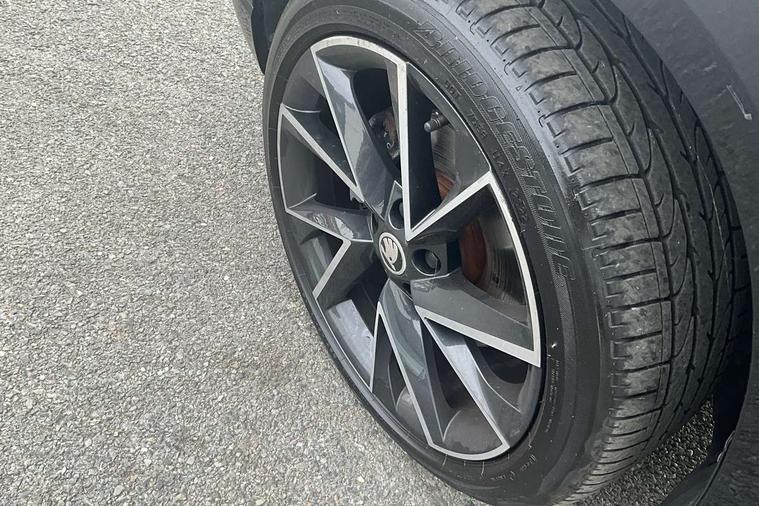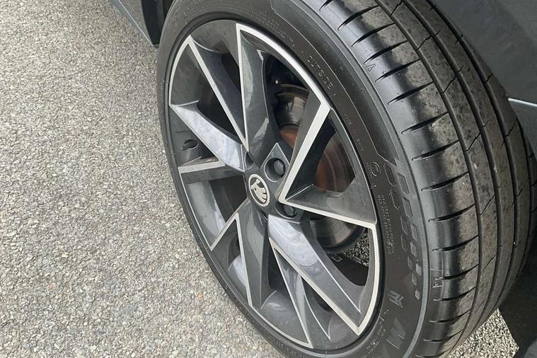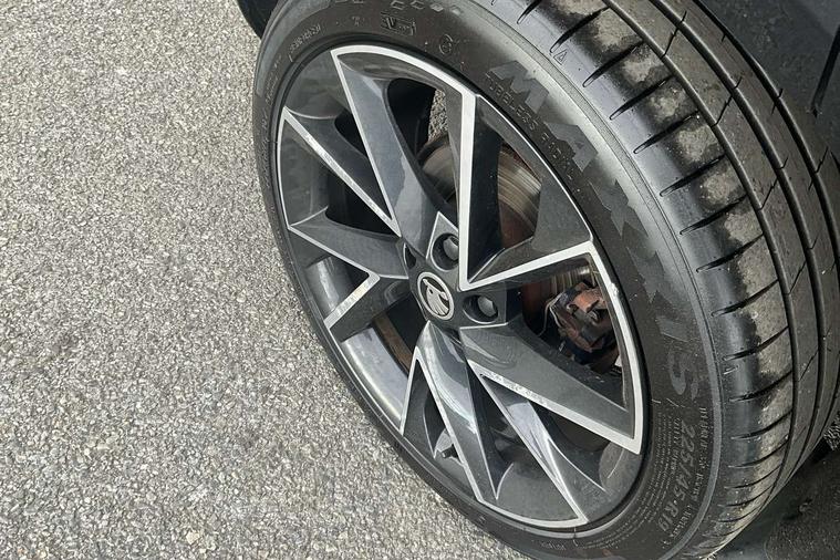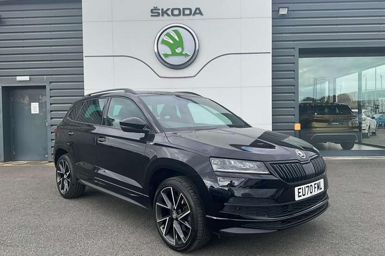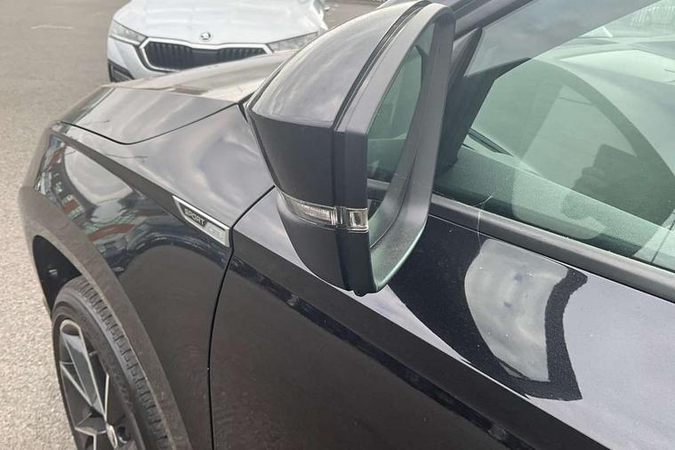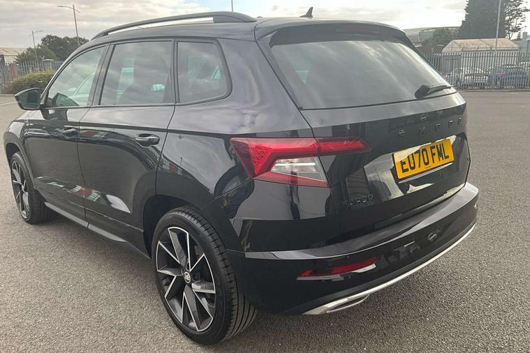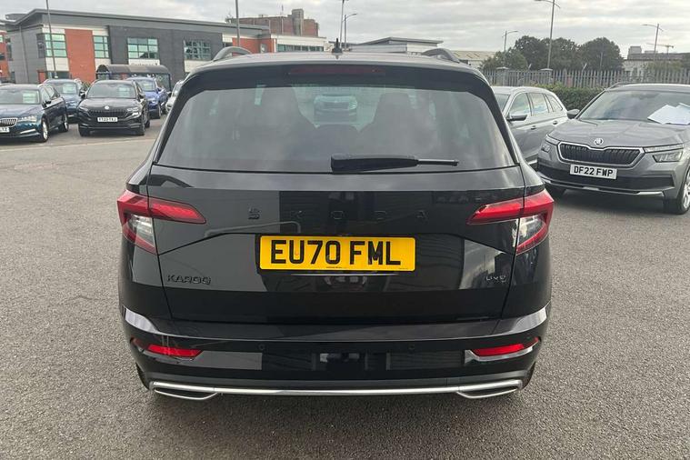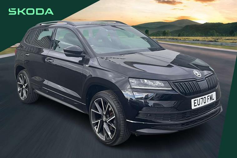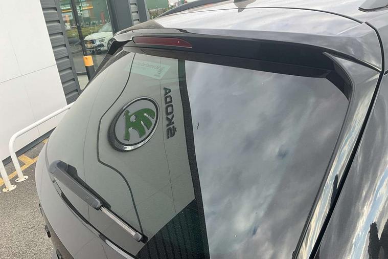 Care connect, Drive mode selection with off road, Driver alert system, Driver fatigue sensor, Driver profile selection, Multifunction colour trip computer, Outside temperature gauge, Rear view camera, Service interval indicator, SmartLink + wireless for Apple and wired for Android, Start/stop system with regenerative braking, USB C Port x 2 in front centre console, DAB radio with Bluetooth, SD card slot, USB connection, Wireless charging without wireless aerial connection, Acoustic glass, Aero front windscreen wipers with intermittent function, Automatic headlight control system, Black electric window control buttons, Black roof rails and door mirrors with radiator grille, Body colour door handles, Electric front and rear windows with child proof lock, Front door steps with SportLine logo, Full LED headlights + adaptive front light system + LED daytime running lights and front cornering fog lights, Headlight washers, Heated rear windscreen, LED rear lights with high functionality, Light assistant (coming/leaving home/tunnel light), Panoramic sliding sunroof, Privacy glass, Protective door side sills in body colour, Rear diffuser, Safety reflectors on front doors, Skoda lettering on tailgate in black, Sportline badge on front fender, Sportline decorative inserts with badging, Sports front and rear bumpers, Third brake light, 1.5 litre bottle holders in driver and front passenger door panels, 12V socket in boot, 12v socket in front centre armrest with storage compartment and rear air vents, 2 Folding hooks and nets in boot, 2 Front readings lights for driver and passenger, 3 rear height adjustable headrests, 3 spoke leather sports heated multifunction steering wheel with hands off detection and silver stitching with gear shift paddles, 4 foldable roof handles with rear coat hooks, 4 lashing points on luggage floor, Aluminium pedals, Backrest release, Black roof headlining, Cargo elements in boot, Chrome inner door handles, Door sill scuff plates, Driver and passenger seats height adjust, Front head restraints, Front seat and rear pockets, Height adjustable front three point seats belts with tensioners, Height/reach adjust steering wheel, Ice scraper, Illuminated and cooled glovebox, Illuminated luggage compartment, Isofix child seat preparation outer rear, Manual lumbar support for front seats, Net programme in boot, Pen holder, Pollen filter, Rear boot cover, Rear reading lights, Rear seats fixed folding and divided 60:40, Retractable parcel shelf attachable to tailgate, Safety vest holder, Storage box in upper central dashboard closed, Storage compartment below the passenger seat, Sunvisors with illuminated vanity mirrors, Textile floor mats, Umbrella under passenger seat, LED Interior lighting pack with Skoda welcome logo - Karoq, Airbags - Front side, head, knee and curtain, Automatic door unlocking in case of crash, Automatic fuel cut off in case of crash, Driver airbag, Electronic parking brake with auto hold function, Emergency rear braking signal, ESC including ABS, MSR, ASR, EDS, HBA, DSR, RBS, MKB and traction control, Front assist radar scanning of the space in front of the car with automatic braking, Hill hold control, Passenger airbag with switch-off function, Pedestrian monitor, Seatbelt reminder signalisation and pretensioner for all seats, Three point seatbelts rear, Two tone horn, Tyre pressure display, Tyre pressure monitor, Alarm with interior monitoring, back up horn and tilt sensor with safe function, Electronic engine immobiliser, Keyless entry and keyless start with safe system, Remote central locking with 2 remote folding keys, Black air vent surround, 19" Vega anthracite alloy wheels, Anti-theft wheel bolts protection, Storage on wheel cover,