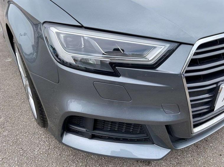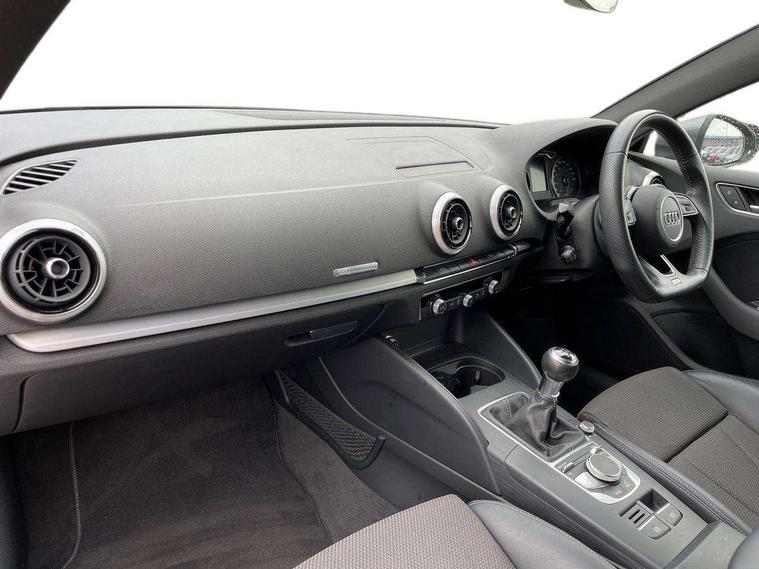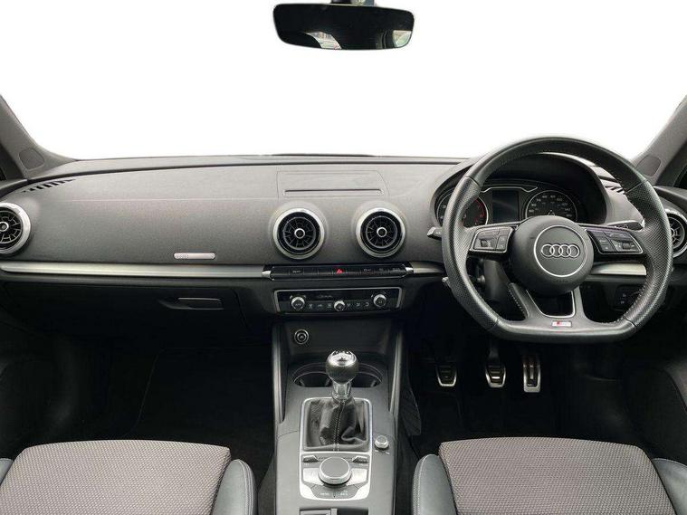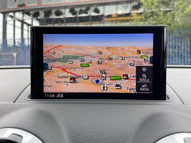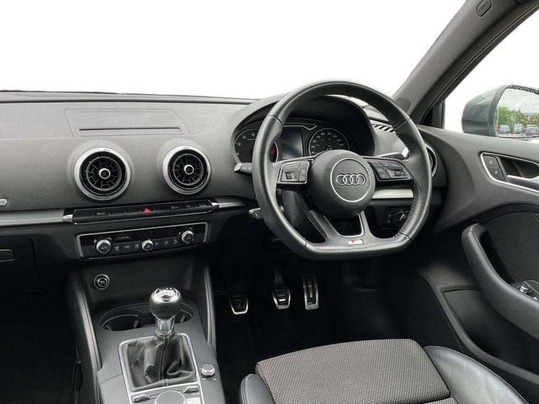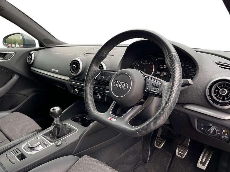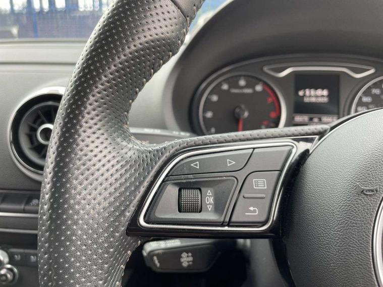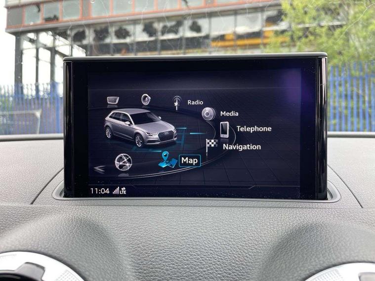 Audi connect, Audi drive select, Audi smartphone interface, Colour driver's information system display, Electro-mechanical PAS, HDD satellite navigation system radio single CD/DVD player MMI control system, Mobile telephone preparation - bluetooth interface, Service interval indicator, Speed limit display, Voice control system, 2 USB ports, Audi music interface, Auxiliary input socket, CD player, DAB Digital radio, MMI radio plus with 7" colour MMI screen and MMI controller, Aluminium window trim, Auto dimming rear view mirror with light and rain sensors, Body colour bumpers, Body colour door mirrors with integral indicators, Body colour roof spoiler, Chrome exhaust tailpipes, Electric front windows, Electric operated/heated door mirrors, Electric rear windows, Heated windscreen washer jets, LED daytime running lights, Matt black radiator grille, Rear wiper, S Line body styling, Sport specific side air inlet grille and diffuser insert, 3 adjustable rear headrests, 3 spoke flat bottomed multi-function leather steering wheel, 4 lashing points to secure luggage, Adjustable front armrest, Black cloth headlining, Dual zone electronic climate control, Front and rear interior lights with delay, Front passenger seat isofix location point, Front sports seats, Front/rear floor mats, Height/depth adjustable steering column, Illuminated glovebox, ISOFIX child seat preparation+airbag deactivation, Jack and tool kit, Stainless steel pedals, Storage compartment in centre console, Storage compartment under front seats, Storage compartments in doors, LED interior light pack - A3/RS3, Non smoking pack - A3, Storage and luggage pack - A3/RS3, 3 point seatbelts on all seats, ABS/EBD, Active bonnet, Active front headrests, ASR, Curtain airbags, Driver and passenger side airbags, Driver/Front Passenger airbags, Drivers knee airbag, EDL, Electromechanical parking brake, ESC - Electronic Stability Control + traction control, Front passenger airbag deactivation, Manual rear child locks, Multi-Collision braking, Seatbelt warning, Tyre pressure warning, Warning triangle and first aid kit, Anti theft alarm, Anti-theft wheel bolts, Remote control central locking, Thatcham category 1 alarm + immobiliser, Aluminium air vent surrounds, Aluminium trim elements, Matt brushed aluminium inlays, Space saver spare wheel,
