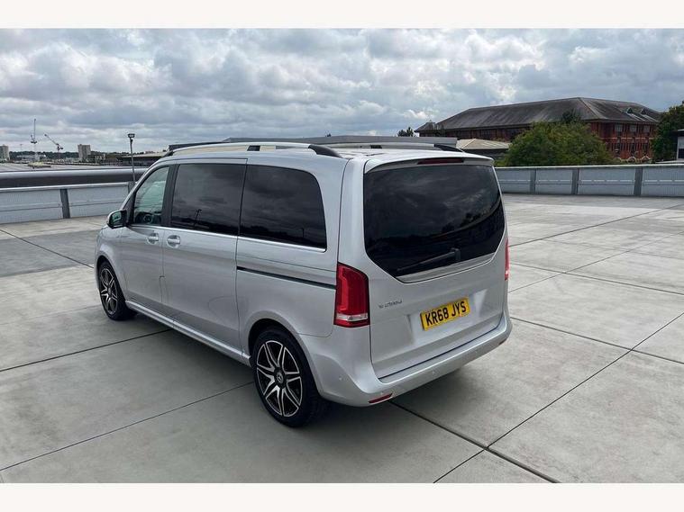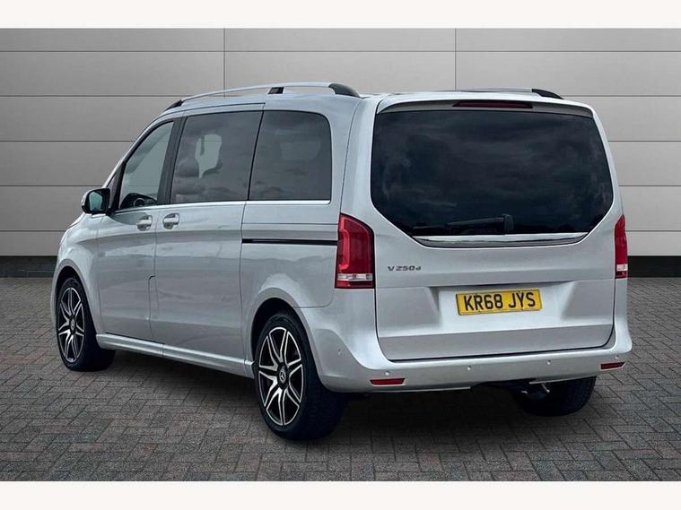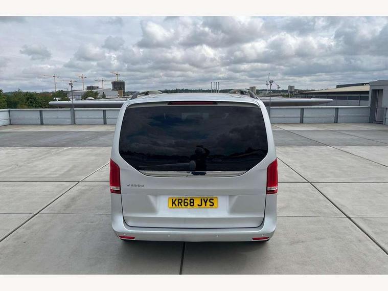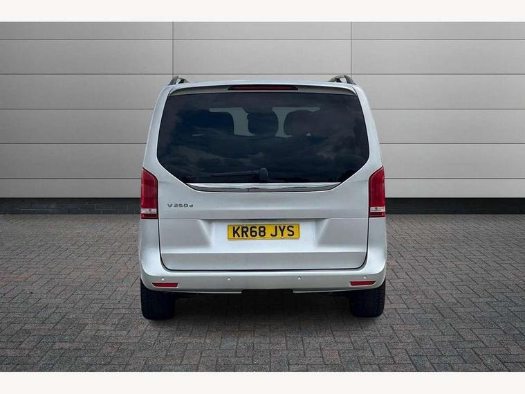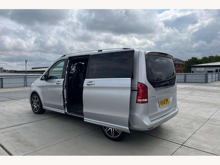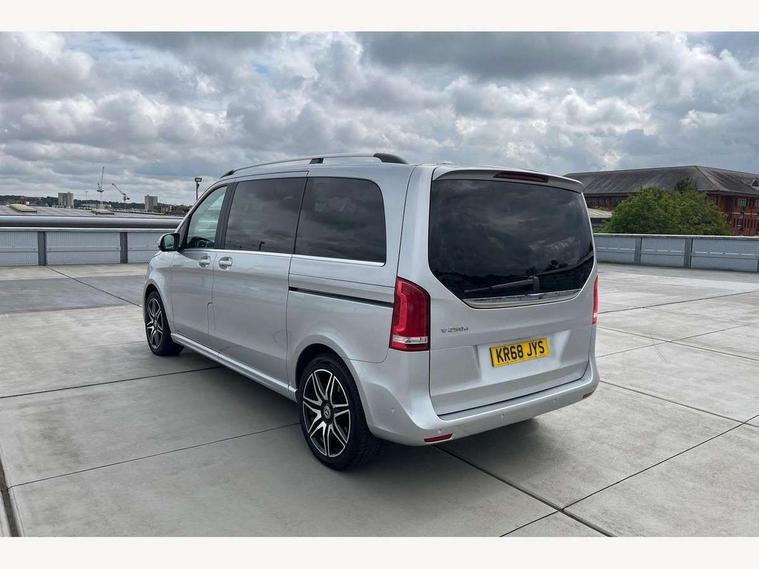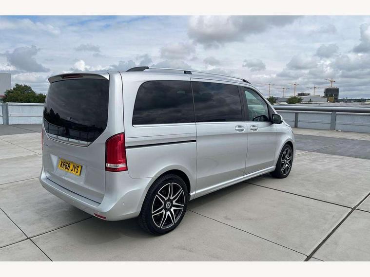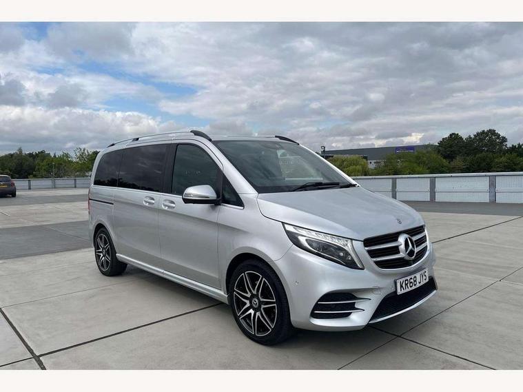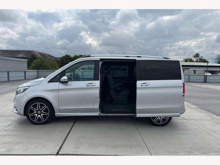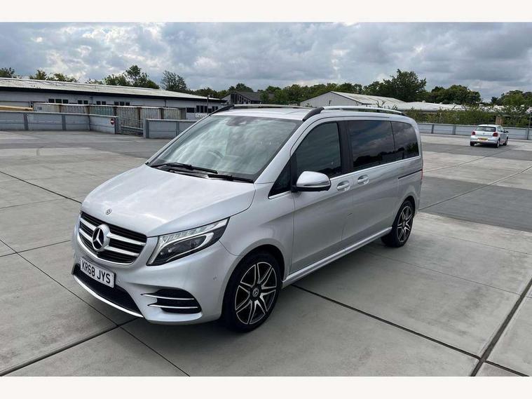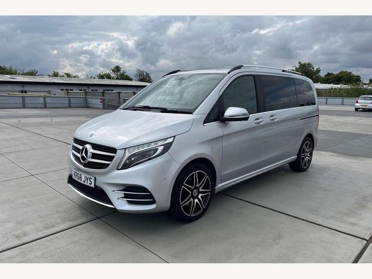 Active parking assist and reversing camera, Agility select with a choice of driving modes (Comfort, ECO, Sport, Individual), Attention assist, Brake wear warning display, Collision prevention assist, Easy-pack tailgate - Powered opening/closing automatically, ECO start/stop function, High resolution 7 inch multimedia colour display, Instrument cluster with 5.5 inch colour display trip computer, Mercedes me connect including emergency call system, accident recovery, breakdown and maintenance management, Outside temperature gauge, Service indicator (ASSYST), Side wind assist system, Speed sensitive steering, Status display for rear seat belts in instrument cluster, 25 litres large AdBlue tank, Agility control comfort suspension, Diesel particulate filter, Audio 20 CD with touch pad + media interface for iPod/iPhone + Bluetooth interface with handsfree function, DAB Digital radio, Integrated radio aerial, Two USB ports and one SD Card slot in centre console, Adaptive brake lights, AMG bodystyling front apron and rear spoiler, AMG bodystyling side skirts, Anodised roof rails, Automatic headlamp activation, Black tinted rear windows, Body colour bumpers, Body colour door mirrors, Chrome boot sill trim strip, Electric folding door mirrors + auto dimming rear view + drivers exterior door mirror, Electric front windows, one touch / obstruction sensor, Electric sliding door in both side, Heated door mirrors, Heated windscreen washers, Illuminated front door sill panels with Mercedes-Benz lettering, LED intelligent light system including integral LED daytime running lamps, LED tail lamps/brake lamps and indicators, Metallic paint, Privacy glass, Radiator grille with integral star and two louvres in matt iridium silver, Rain sensitive windscreen wipers, Rear spoiler, Split tailgate in opening rear window with chrome handle, Tailgate wash/wipe, 12V Accessory socket in centre console, 12V socket in boot/load compartment and rear passenger compartment, 2 Isofix seat anchors, 2nd/3rd row height adjustable head restraints, 3 colours ambient lighting, 3 spoke nappa leather steering wheel, Adjustable front seat head restraints, AMG sport pedals, Brushed stainless steel sports pedals with rubber studs, Carpet floor covering in passenger compartment, Driver + front passenger lumbar support, Driver/front passenger seat height adjustment, Electric air heater system - 1.2 kW output, Footwell lighting with reading light and illuminated handle in rear compartment, Front centre armrest, Height/reach adjustable steering column, Illuminated rear door handles, Load compartment divider with two folding boxes, Lockable glovebox, Luxury centre console with retractable cover + two cup holder + 12V socket + multimedia box, Multifunction steering wheel with audio controls and onboard settings, Nappa leather upholstery, Seat occupancy sensor for front passenger seat, Stowage nets behind individual seats, Sunvisors with illuminated vanity mirrors, Thermatic 3 zone automatic climate control, Three stage heated front seats, 7 Seat pack - V Class, Anti theft protection pack - V Class, 3 point seatbelts on all seats, Adaptive brake system with HOLD function and brake drying in the wet, Airbags - sidebag for driver and front passenger with combined thorax/pelvis bag, Airbags - windowbag for driver and front passenger, Anti-lock braking system (ABS), Child proof door locks, Electronic parking brake, Electronic Stability Programme, Hill start assist, Perforated front brake discs and brake calipers with Mercedes-Benz lettering, Rear seatbelt warning indicator, Tyre pressure monitoring system, Warning triangle and first aid kit, Central locking with interior switch, Chrome surround electric key, Carbon trim, Chrome air vent surrounds, Dashboard upper section in artico man-made leather, 19" AMG 7 twin spoke alloy wheels,