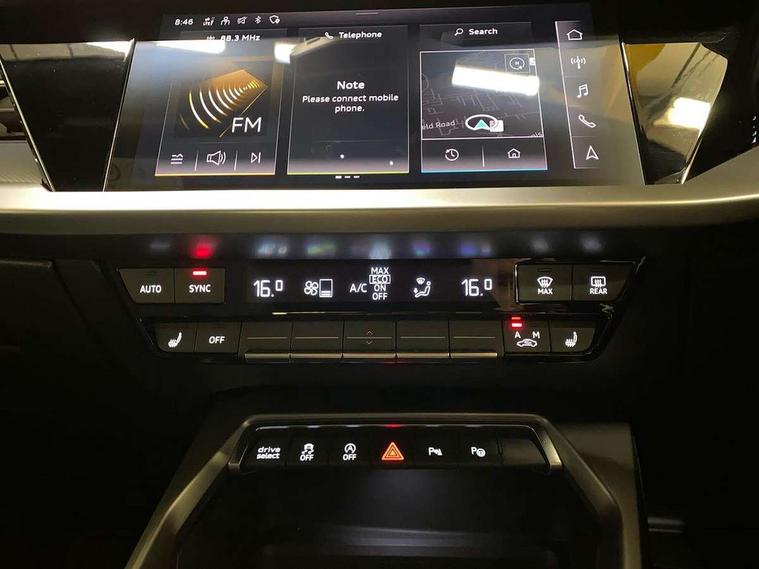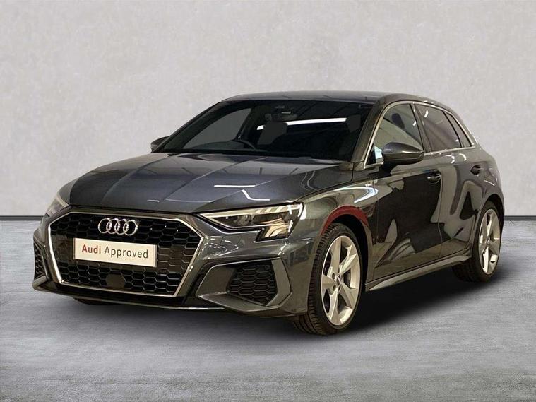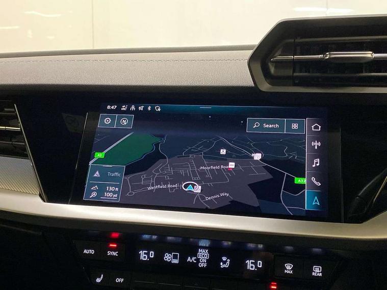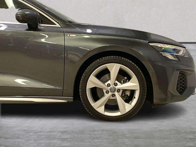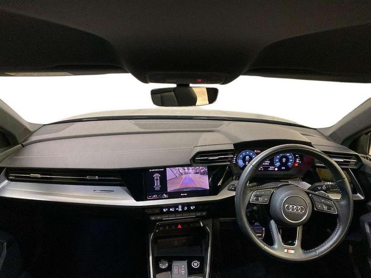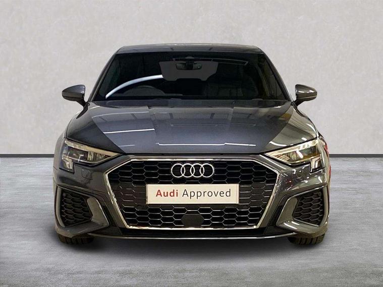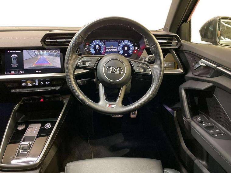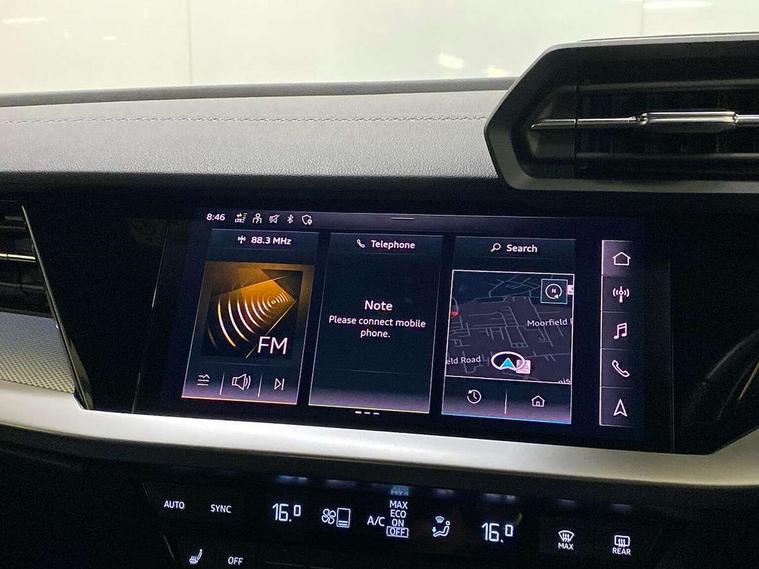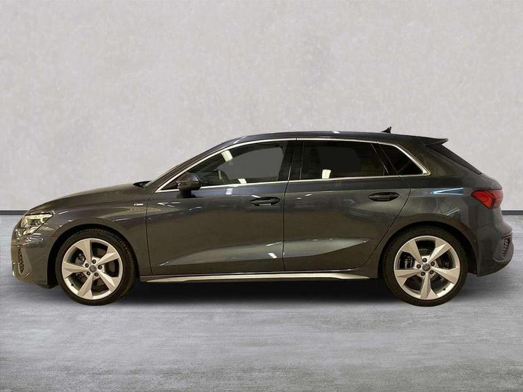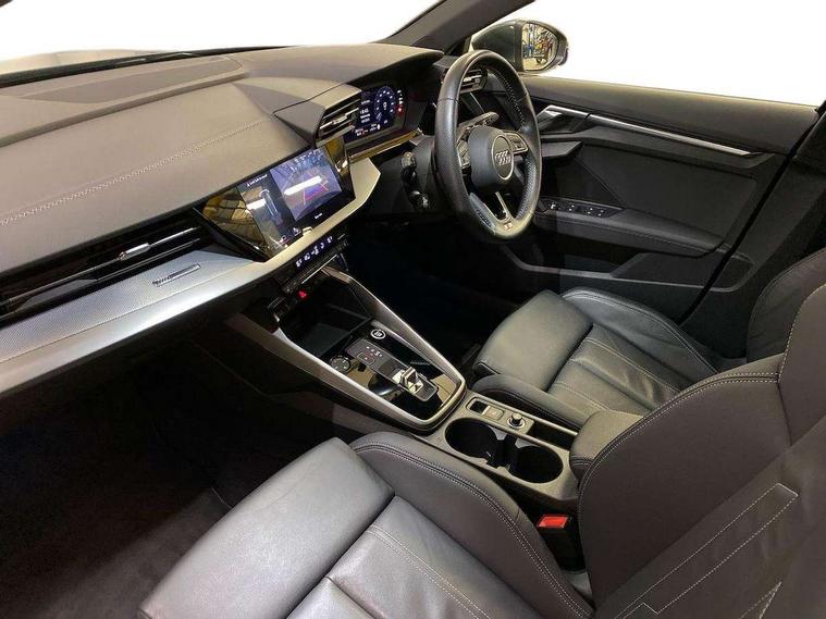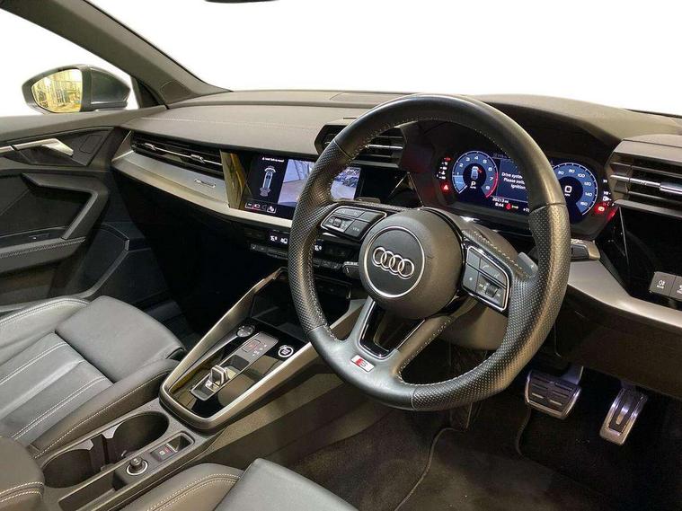 Audi connect emergency call and service, Audi drive select (Auto, Comfort, Dynamic, Efficiency and Individual), Audi smartphone interface, Audi Virtual Cockpit - 10.25" digital and colour instrument cluster, Automatic start/stop system with recuperation, Bluetooth interface, Collision avoidance assistant, Electromechanical power speed sensitive steering, Lane departure warning system, MMI Navigation Plus with high resolution 10.1" colour touch screen display, Service indicator, Trip computer, Voice control system with natural language interaction, 1xUSB-A and 1xUSB-C connection, 6 passive loudspeakers, DAB Digital radio, Acoustic glass windscreen, Aluminium window trim, Auto dimming frameless rear view mirror, Body colour exterior mirrors, Electrically adjustable/heated/folding/dimming door mirrors with kerb view includes integrated LED indications + kerb view function for passenger side, Front electric windows, Illuminated aluminium inserts front door sills with S logo, LED daytime running lights, Light and rain sensors, Privacy glass - dark tinted rear window, rear door and side windows, Rear electric windows, Rear side air outlets in grained matt black, Rear wiper, S line bumpers, S roof spoiler, 12V socket and storage compartment in front centre console, 40/20/40 split folding rear seat bench with cupholder, Black cloth headlining, Dual zone electronic climate control, Front and rear centre armrest in leather, Front and rear headrests, Front/rear floor mats, Height and reach adjustable steering wheel, Interior lighting - glove compartment light and right hand side, Luggage compartment floor covering, Manual boot compartment lid, Manually adjustable front seats, Seat side bolsters, Stainless steel pedals and front footrest, Twin leather upholstery with front sports seats S embossed logo, Aluminium interior elements pack - A3 Sportback, S line styling pack - A3 Sportback, 3x3 point rear seat belts, Driver and front passenger airbag with passenger airbag deactivation, Electronic Stabilisation Control (ESC) including ABS, ASR and EDL, First aid kit with warning triangle and 2 safety vests, Hill hold assist, Pre-sense front with pedestrian and cyclist detection, Seatbelt monitoring, Tyre pressure loss indicator, Anti theft alarm, Anti-theft wheel bolts, Electronically operated child lock, Immobiliser, Remote control central locking, Accent surfaces in the dashboard and centre console in platinum grey silk effect paint finish, Dark spectrum aluminium inlays,
