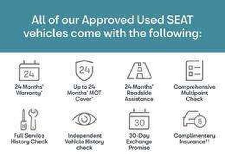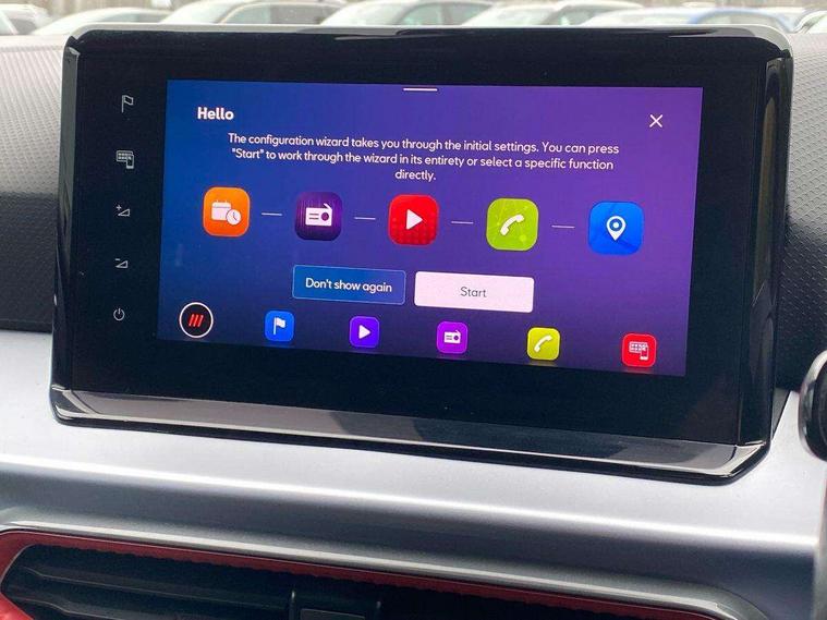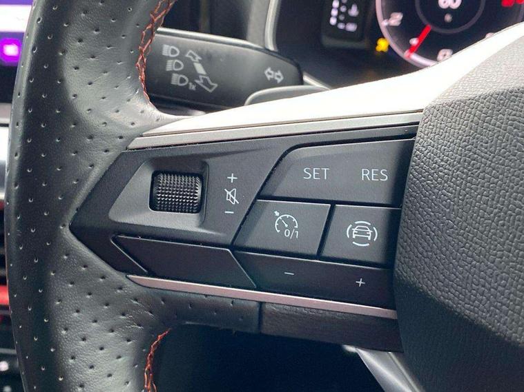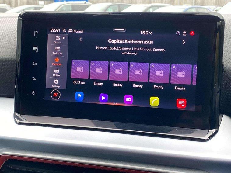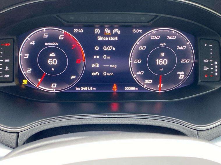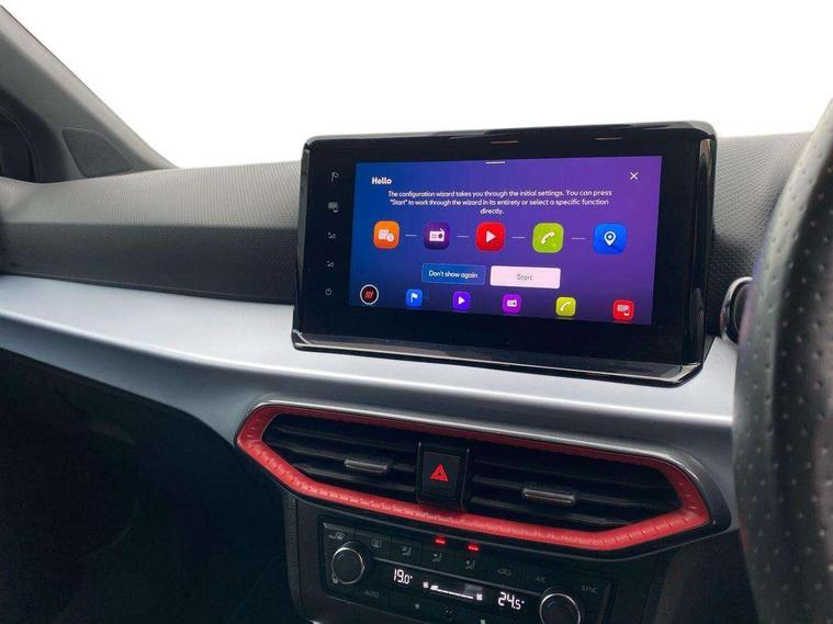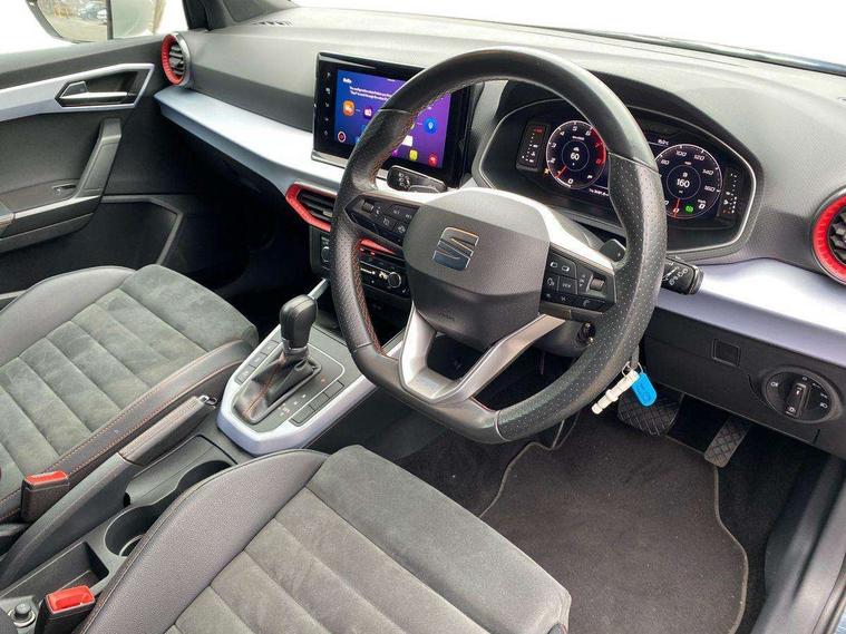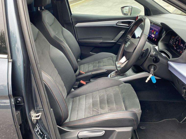 Digital cockpit, E-call, Electric speed sensitive power steering, Full Link Smartphone Integration with Mirror Link, Apple Car Play, Google Android Auto with USB Type C cable for Apple and Android compatibility, Lane keeping system, Rear parking sensor, Seat connect with safety, service, remote and online, SEAT Drive profile - Four different models normal-sport-eco-individual, steering response, throttle response and gear shifts mode, Bluetooth interface for hands free and audio streaming, DAB digital radio and AM/FM radio, Steering wheel mounted audio controls, Anti theft roof antenna, Auto dimming interior rear view mirror, Automatic activation of hazard warning lights, Body coloured bumpers, Body coloured door handle inserts, Chrome roof rails and window surrounds, Chrome window trim, Dark tinted rear windows, Electric front/rear windows, Electrically adjustable, heated and folding door mirrors, FULL LED automatic headlights with dynamic headlight range control, coming and leaving home, LED daytime running lights, LED rear tail lights and licence plate lights, Protective side mouldings, Rain sensing wipers, Rear side wing doors, Rear spoiler, Rear window wash/wipe, Roof colour door mirrors, Third brake light, Twin exhaust pipe styling hidden exhaust pipe, Visible VIN plate, Windshield wiper with intermittent control and potentiometer, 2 cupholders, 3 seat bench in 2nd row, 60/40 split folding rear seat, Aircare filter, Black interior roof, Double boot floor, Driver sunvisor with covered mirror + card holder, Dual zone climate control, Front courtesy light with 2x front and 2x rear reading lights, Front seat back storage pockets, Front sport seats, Heated front seats, Height adjustable front seats, Height/reach adjustable steering column, Illuminated boot, Interior ambient lighting, Interior light in footwell, central console and door panel, ISOFIX points in outer rear seats with top tether anchorage points, Microsuede cloth upholstery, Passenger sunvisor with vanity mirror, Perforated flat bottomed leather steering wheel/gear knob/handbrake with red stitching and FR logo, Single front passenger seat, Steering wheel mounted gearshift paddles, Two front and three rear height adjustable headrests, Connectivity pack plus - Arona, Interior chrome pack - Arona, 3 point seatbelts on all rear seats, ABS, Active front headrests, Child locks on rear doors, Driver and front passenger airbags with front passenger airbag de activation, front side and curtain airbags, Electronic stability control, Emergency Brake Assist (EBA) and front assist, Front and rear seatbelt reminder, Hill hold control, Multi-Collision braking, Tiredness recognition system, Traction control, Tyre pressure monitoring system, Alarm with back-up horn, Electronic engine immobiliser, Locking wheel bolts, Remote central locking + deadlocks, Tow away protection, Titan black dashboard, 18" Performance Cosmo grey matt alloy wheels,