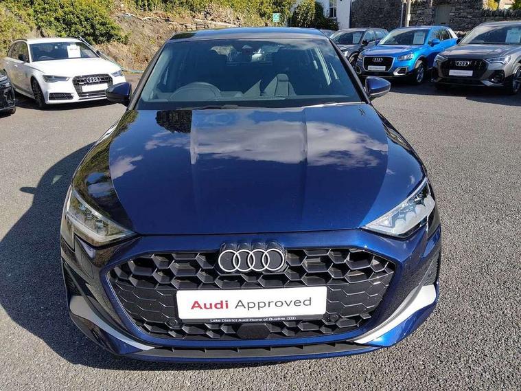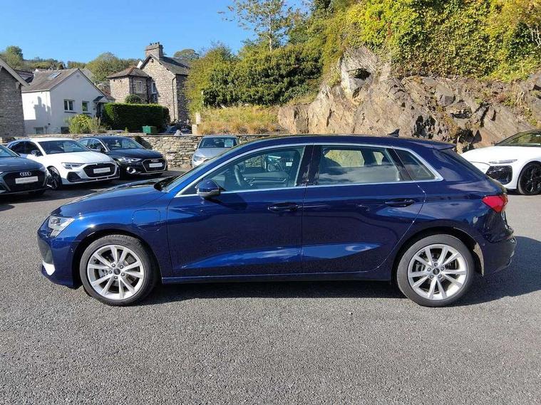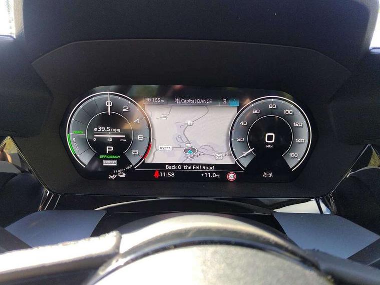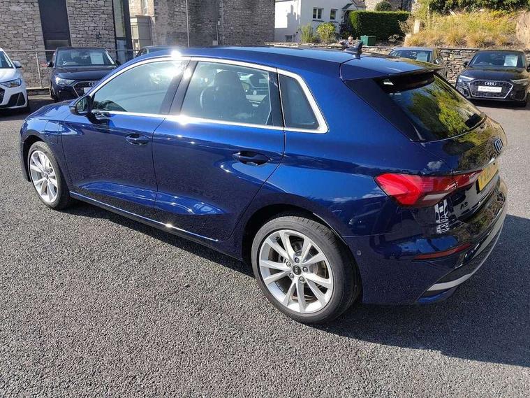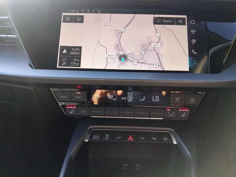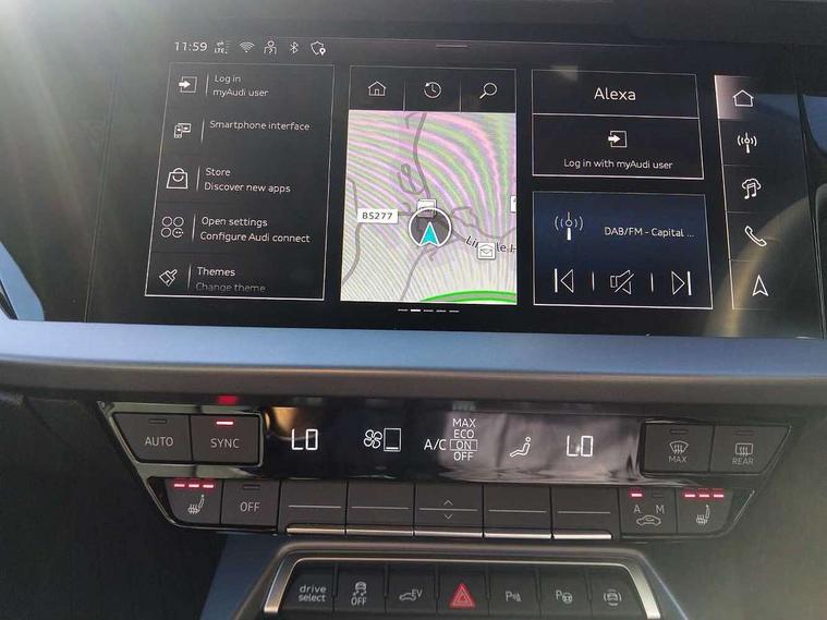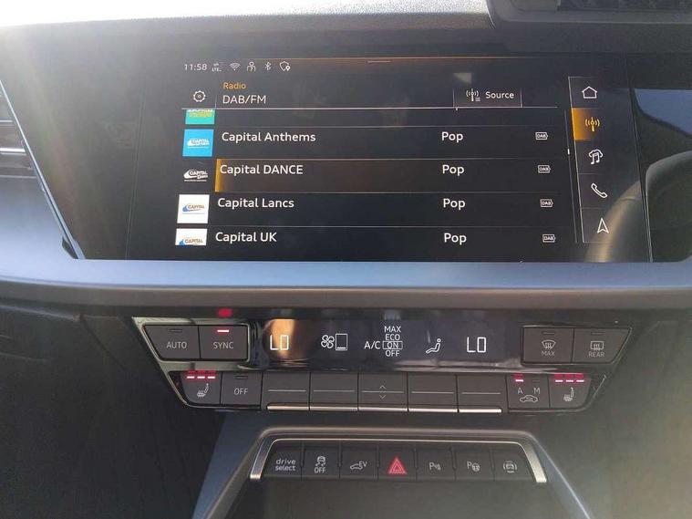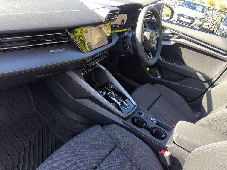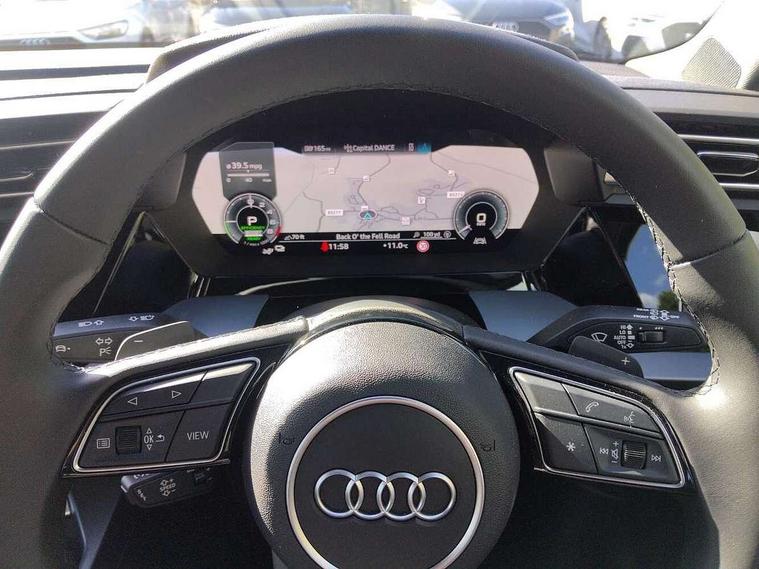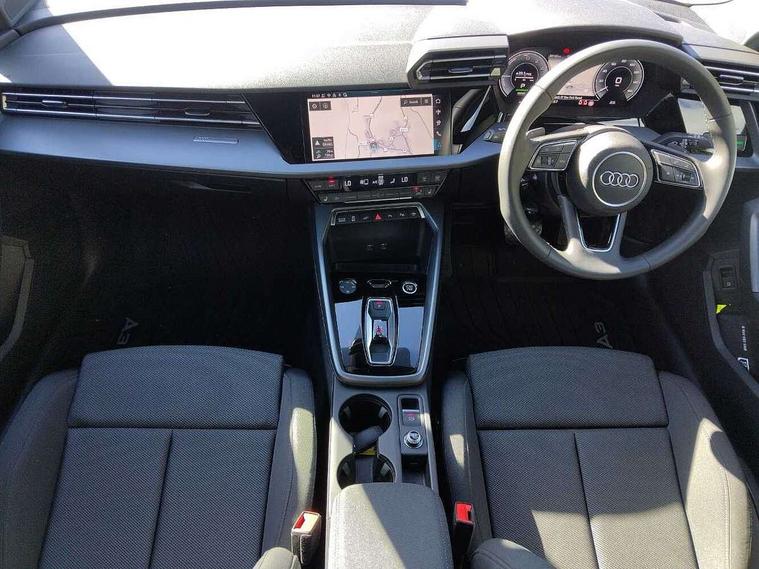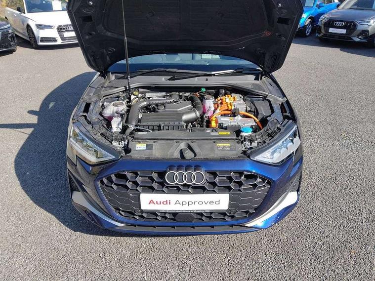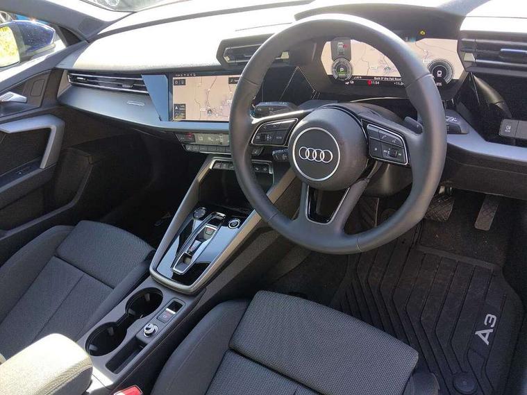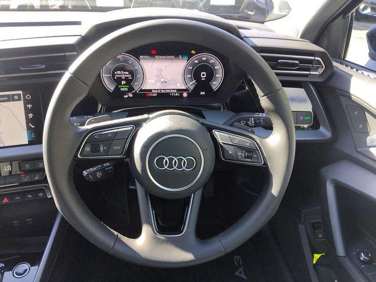 Adjustable speed limiter, Audi drive select, Audi smartphone interface with app store includes wireless Apple carplay, Android auto and Amazon alexa integration, Audi virtual cockpit plus - 12.3" full HD resolution dynamic digital instrument cluster, Automatic start/stop system with recuperation, Bluetooth interface, Camera based traffic sign recognition, Collision avoidance assistant, Cruise control, Distraction and Fatigue warning, e-Call (emergency call), Electromechanical power speed sensitive steering, Emergency assist, Lane departure warning system, MMI Navigation Plus with high resolution 10.1" colour touch screen display, Park Assist with parking system Plus, Service indicator, Trip computer, Voice control system with natural language interaction, 3 pin 10 amp domestic charging cable, CCS socket for DC charging, Charging cable for public charging, mode 3 (type 2), 32 A, Compact charging system, Industrial connector CEE 32 A, 230 V, length 1.6 m, Standard suspension, Type 2 socket for AC charging, Audi Phonebox light with wireless charging, Audi sound system - 10 loudspeakers including centre loudspeaker and subwoofer, DAB Digital radio, USB ports with charging function in the rear, 3rd brake light, Acoustic glass windscreen, Aluminium window trim, Auto dimming frameless rear view mirror, Body colour exterior mirrors, Body colour roof spoiler, Dipped beam, main beam, position light and turning light, Electrically adjustable/heated/folding/auto dimming door mirrors with integrated LED indications + kerb view function for passenger side, Exterior model badging, Front electric windows, Front radiator grill in high gloss dark chrome, Front side air inlets in grained matt black with silver frame, Heat insulating glass windscreen, LED daytime running lights, LED headlights and halogen rear lights, Light and rain sensors, Rear diffuser and grill in grained matt black with silver frame, Rear electric windows, Rear side wing doors, Rear window, rear door windows and rear side windows in clear glass, Rear wiper, 12V socket and storage compartment in front centre console, 3 seat bench in 2nd row, 3 spoke leather multifunction steering wheel with gear shift paddles, 3-zone deluxe automatic air conditioning, 4 way electrically adjustable lumbar support for driver and front passenger, 60/40 split folding rear seat bench, Black front and rear floor mats, Convenience auxiliary air conditioning, Front and rear headrests, Front centre armrest, Front door sill trims with aluminium inlay, Heated front seats, Height and reach adjustable steering wheel, Manual boot compartment lid, Manually adjustable front seats, Routine cloth upholstery with front sports seats, Seat side bolsters, Single front passenger seat, Steel grey cloth headlining, Aluminium interior elements pack - A3, LED interior lighting pack -A3, 3x3 point rear seat belts, Acoustic vehicle alerting system, Driver and front passenger airbag with passenger airbag deactivation, Electronic Stabilisation Control (ESC) including ABS, ASR and EDL, First aid kit with warning triangle and 2 safety vests, Front side airbags with head airbags and interaction airbag, Hill hold assist, Pre-sense front with pedestrian and cyclist detection, Seatbelt monitoring, Tyre pressure loss indicator, Anti theft alarm, Anti-theft wheel bolts, Electronically operated child locks, Immobiliser, Remote central locking with safelock, Black dashboard, Inlays in volcano grey fine paint finish, Tyre repair kit,