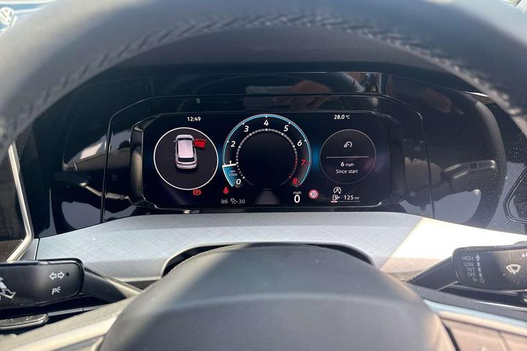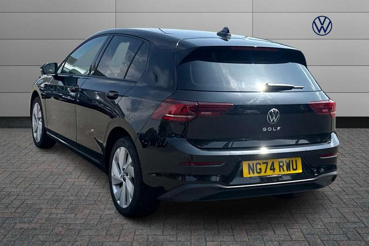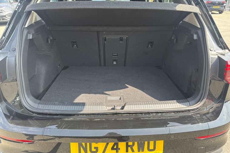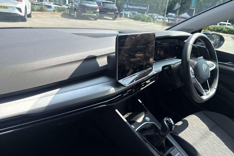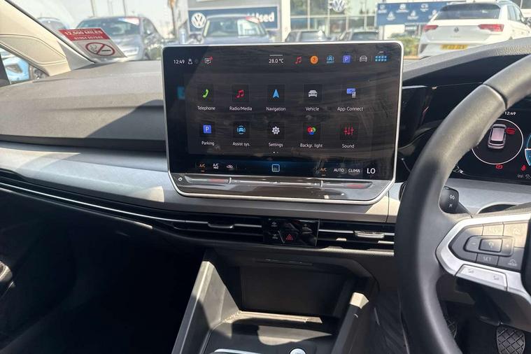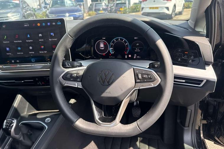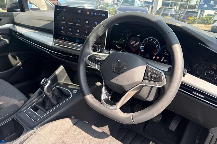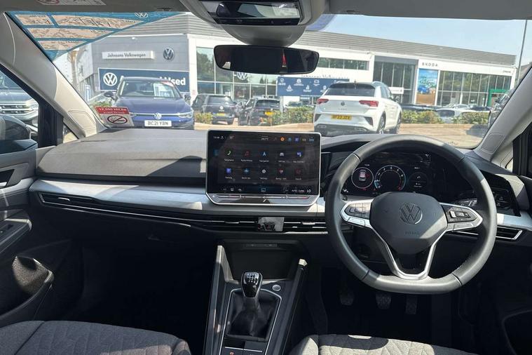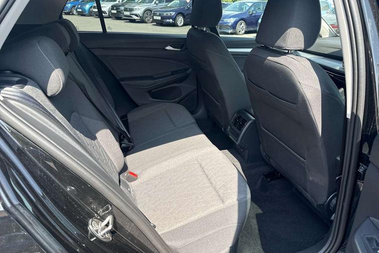 Activated carbon canister, Adaptive cruise control (ACC), Advanced driver attention and drowsiness monitor, Dynamic road sign display, E-Sim card for online connectivity, eCall emergency call system, Multi-color Digital cockpit pro, selection of different info profile possible, Multifunction front facing camera for distance control, Navigation system, Oncoming vehicle braking when turning including swerve support, Preparation for light assist system, Speed limiter, Speedo, rev counter, electronic odometer, trip, service interval display, exterior temperature and fuel gauge, Voice enhancer and voice control, Warning signal and warning light for front and rear seatbelts not fastened, We connect plus preparation, We connect preparation, Wireless app connect, Petrol Particulate Filter, Start-stop system with battery regeneration (recuperation - energy recovery during braking), XDS electronic differential lock for improved traction and handling, 2 USB C ports in front, 2 USB charging sockets on the centre console in the rear charging capacity upto 45W, Comfort telephony + wireless charging, without wireless aerial connection, Digital radio reception (DAB), Diversity antenna for FM reception, Gaming platform via car app, Infotainment system with 12.9" display, Mobile phone interface with inductive charging feature, 3rd brake light, Auto dimming rear view mirror, Auto headlights, Automatic headlamp activation with Coming home and Leaving home feature, Body colour door handles, Body colour door mirrors, Exterior ambient lighting with illuminated door handles, Exterior mirrors convex on the left and aspherical on the right, Front and rear electric windows, Heat insulating windshield made of laminated glass, LED daytime running lights, Rain sensor, Rear exhaust tailpipe, Rear fog light on one side and reversing lights on both sides, Rear side wing doors, Rear tinted glass 65% light absorbing from B pillar backwards, Rear windscreen washer and wiper with interval delay, Remote electrically foldable door mirrors, puddle lights and reverse activated passenger's door mirror, Standard bumpers, Welcome light with surround lighting, 12V socket in front centre console, 12V socket in luggage compartment, 3 rear head restraints, 3 seat bench in 2nd row, Chrome plated radiator grille inserts, air vent surrounds and light switch surrounds, Front centre armrest, Front head restraints, ISOFIX anchors for child seats on outer rear bench seats and on front passanger seat compatible for i-Size, Leather gearshift handle, Luggage compartment lighting, Rear cupholder and loadthough, Single front passenger seat, Soul black instrument panel, Split folding backrest with centre armrest and unsplit rear seat bench, Standard pedal cluster, Storm grey roof lining, Sun visors with illuminated vanity mirrors, Parking and comfort pack - Golf Estate/Hatchback, 3 point height adj front seatbelts + pretensioners, 3 rear three point seatbelts, ABS, Autonomous emergency braking front assist with pedestrian and cyclist monitoring, Child locks on rear doors, Driver and front passenger airbag with front passenger airbag deactivation, Electronic parking brake with auto hold, ESC (Electronic Stability Control), Extended pedestrian protection measures, Rear disc brakes, Two tone horn, Tyre pressure loss indicator, Volkswagen roadside assistance, Alarm with interior protection, Anti theft wheel bolts, Keyless start with SAFE lock, Preparation for alcohol interlock, Nature cross brushed decorative inserts for dashboard and front door panels,