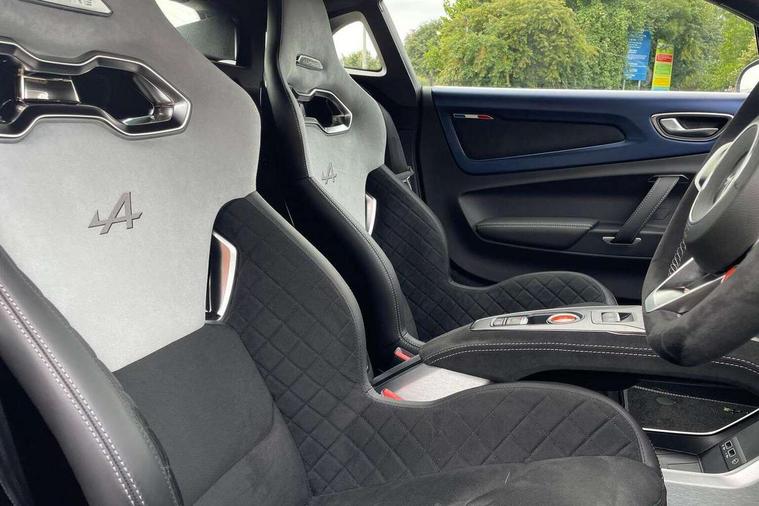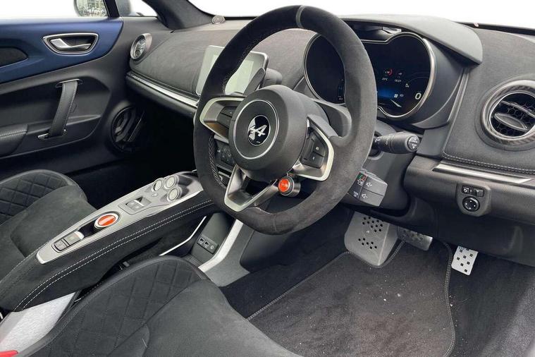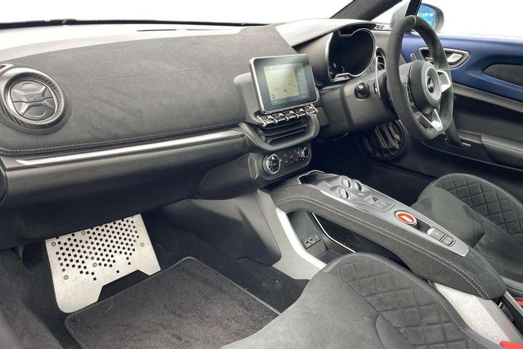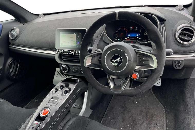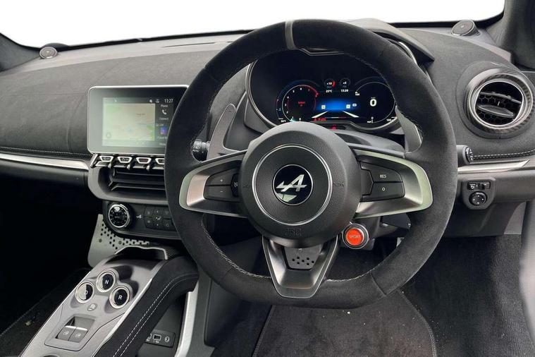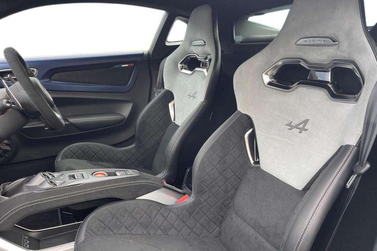 Alpine multimedia system with touchscreen: navigation, Android auto/apple carplay, bluetooth compatibility, connected services, USB and jack plugs, Alpine telemetrics, Bespoke engine calibration with driving mode selector (Normal, Sport and Track), Cruise control + speed limiter, Emergency call service, Gear change indicator, PAS, Service indicator, 100l rear trunk, 7 speed dual-clutch automatic transmission, 96l front trunk, Front and rear double wishbone suspension system, Sport chassis with reinforced anti-roll bar, specific shock and ESC settings, Two USB ports, 4 LED front headlamps, Active sports exhaust, Aquablade windscreen wipers, Automatic headlights, Automatic windscreen wipers, Black Alpine logo on the front wings, Black Alpine monogram on front and rear bumpers, Black front headlights surround, Daytime running lights, Defroster rear window, Electric windows with one touch control, Exterior mirrors electrically foldable, Flat underbody, Follow me home headlights, French flags on C-Pillar, French flags on door panels, Interior rearview mirror with automatic anti-glare function, Rear boot, Rear diffuser, Third brake light, Aluminium drivers footrest, Aluminium paddle shifters on steering column, Aluminium Passenger footrest, Aluminium sport pedals, Automatic climate control, Driver seat adjustment, Front headrests, Gear selector on centre console, Matte carbon insert, Rake/reach adjustable steering wheel, Single front passenger seat, Stainless steel door sills, 4 piston fixed front calipers, single piston fixed rear calipers, Anti-lock braking system (ABS), Compact aluminium brake calipers with integrated parking brake, Deactivatable stability control system, Driver and passenger airbags, Emergency brake assist, Front and rear brembo high performance braking system, Hill start assist, Manual airbag disactivation, Seatbelt reminder for driver and passenger with presence detection, Tyre pressure sensors, Anti theft alarm pre-equipment, Keyless Start, Compressor and Cartridge inflation repair kit,
