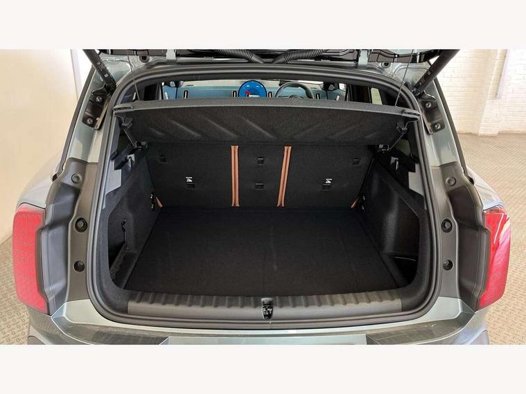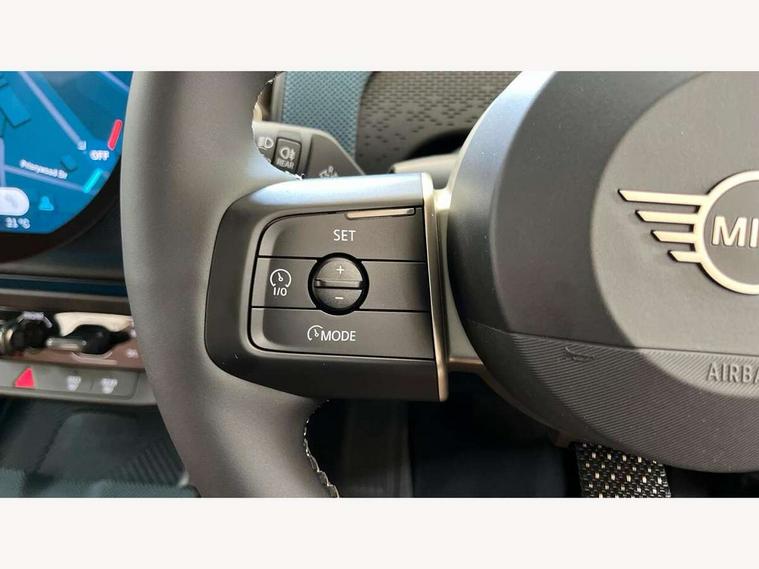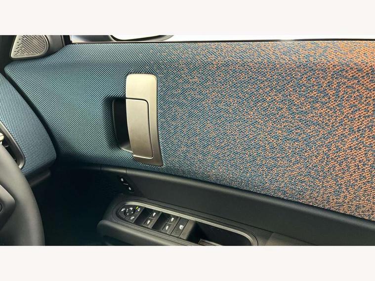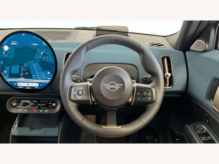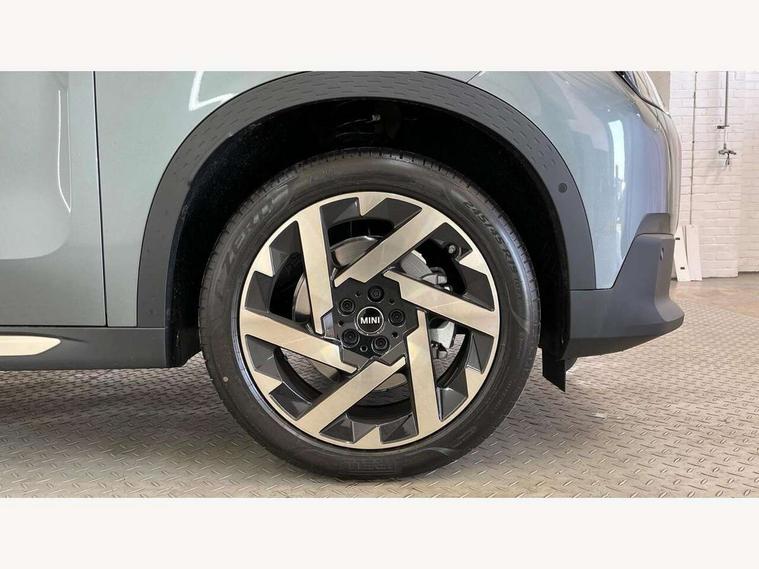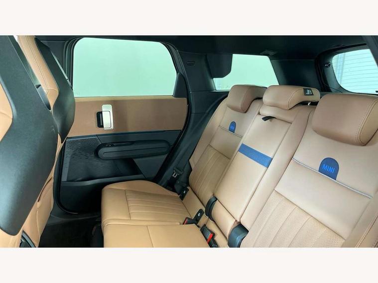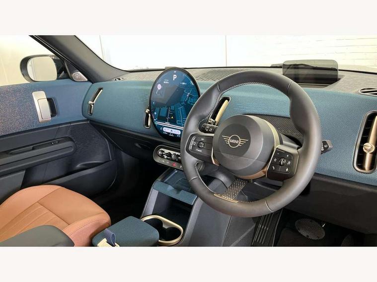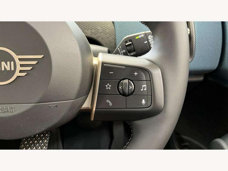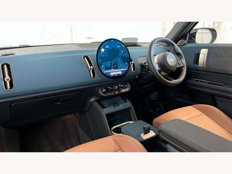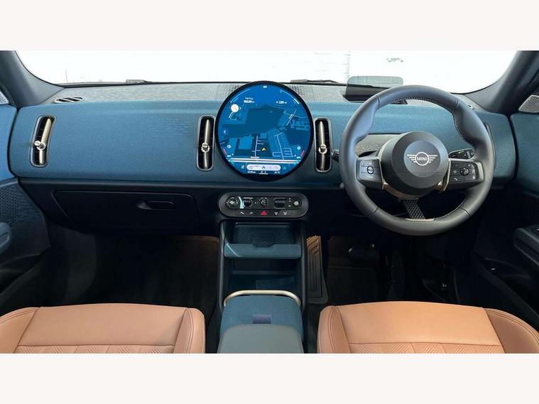 Bluetooth connection, Circular OLED Screen, Compatible mobile phone bluetooth with audio streaming, Cruise Control (DCC), Digital dashboard display, Driving assistant, E-call, Electro-mechanical speed dependant steering assistance, MINI Experience Modes, Mini navigation system, MINI TeleServices, Parking assistant in camera and ultrasound based assistance system, rear view camera, parking aid and distance control, Auto transmission with Paddles, Larger capacity fuel tank, 6 speakers, DAB Digital radio, Personal eSim, Auto tailgate, Electric adjustable heated door mirrors, Front and rear electric windows, Heated rear window, LED daytime running lights, LED Headlights, LED rear lights, LED third brake light, Logos in Vibrant Silver, Rain sensor with auto headlights, Rear side wing doors, Rear window wiper, Roof rails, Vibrant Silver Grill Surround, 3 seat bench in 2nd row, 60/40 split rear bench seat, Anthracite headliner, Auto air conditioning, Floor mats, Front armrest, Front headrests, Front sport seats, Heated steering wheel, Height and length steering column adjustment, Lidded storage box in Petrol knit, Rear headrests, Single front passenger seat, Sport Vescin Steering Wheel, Sunvisors with vanity mirrors, Vescin synthetic leather upholstery, Vibrant Silver sill inlay, 3x3 point rear seat belts, 6 Airbags - front, side, head and seat belt tensioners, ABS, DSC - Dynamic Stability Control, Electronic handbrake, Electronic Stability Programme (ESP), Front ISOFIX (iSize), Hill hold assist, Hill start assist, Manual rear child locks, Traction control, Tyre pressure monitoring system, Warning triangle, Alarm system with tilt sensor, monitoring doors, bonnet interior and tailgate, Auto drive away locking, Deadlocking function, Electronic vehicle immobiliser, Locking wheel bolts, Remote control locking, Start/stop toggle with keyless go, Petrol/Brown dashboard knit, MINI Mobility Kit,