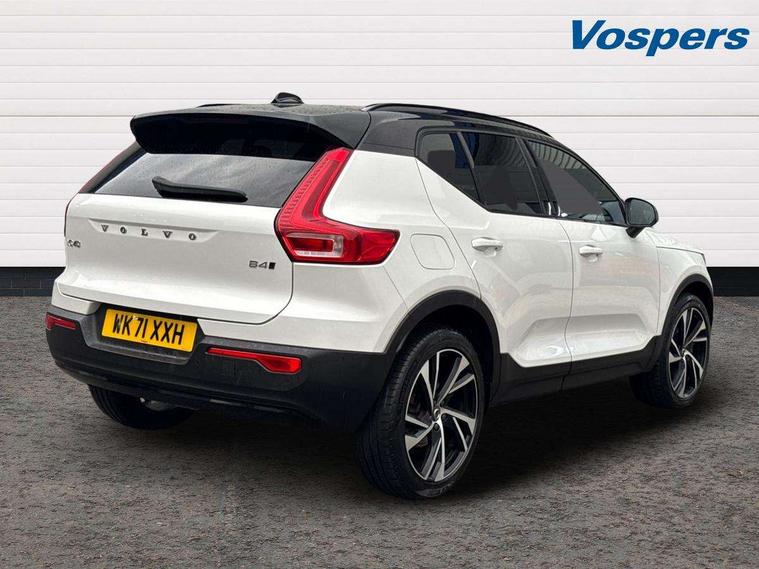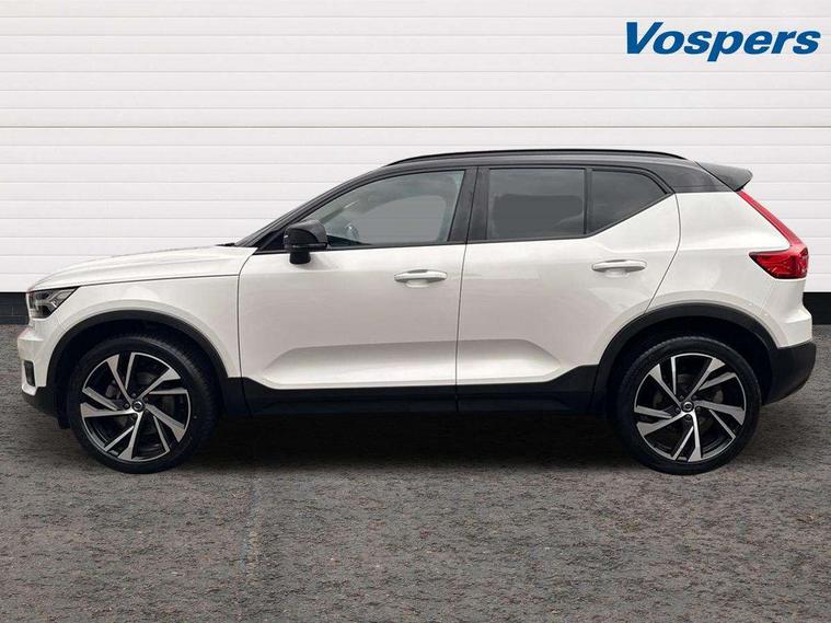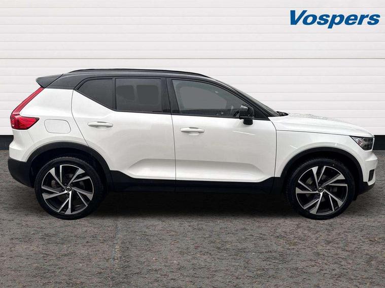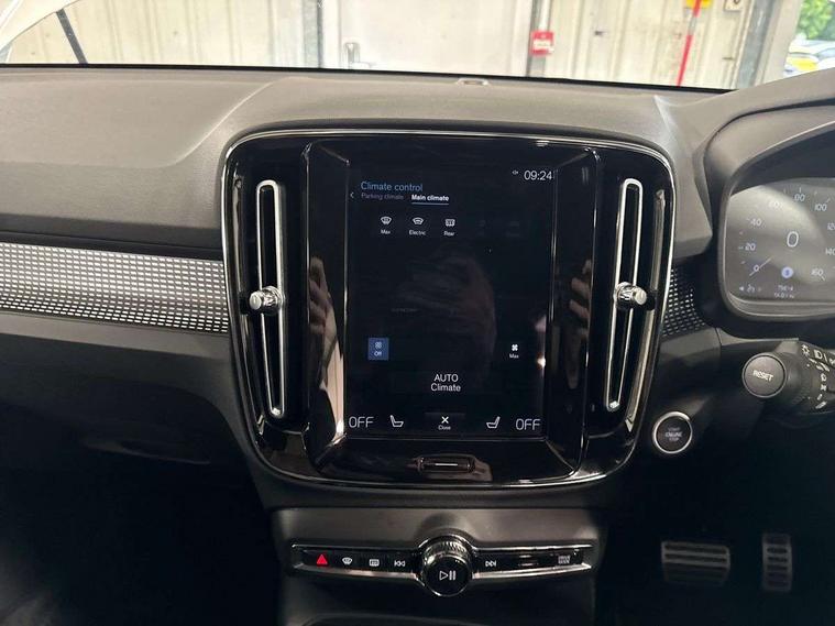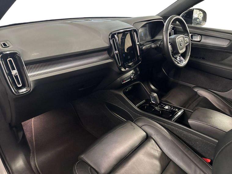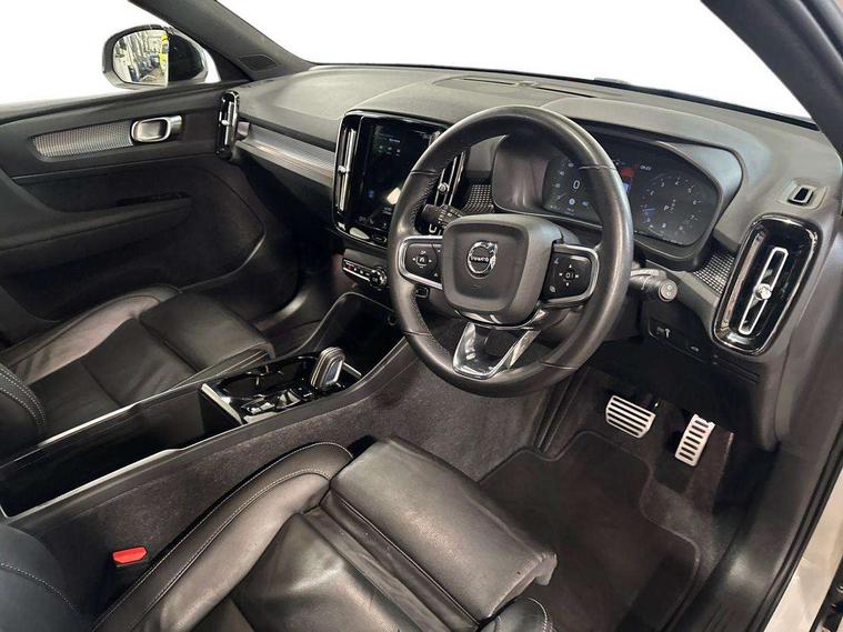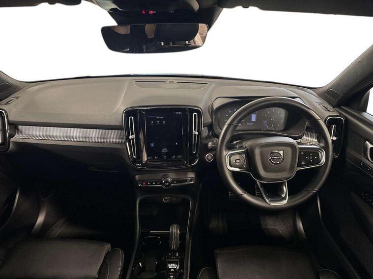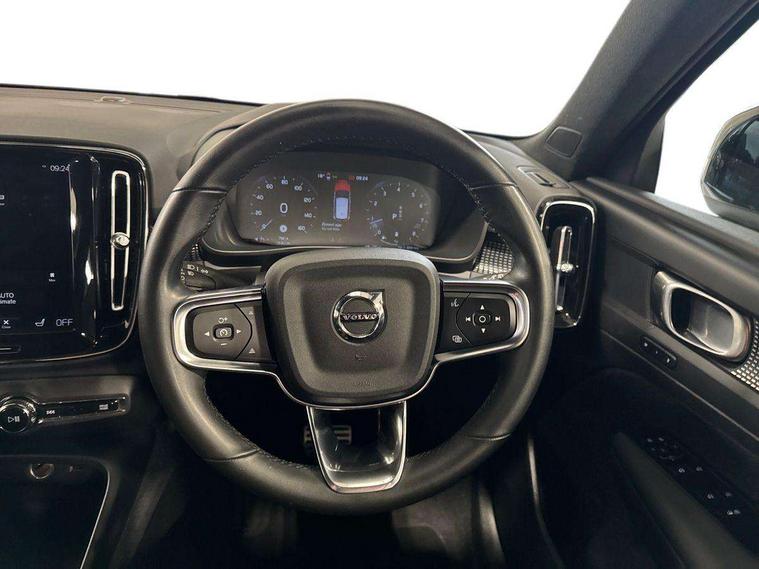 12.3" Active TFT crystal driver's instrument display, 9" centre console portrait touch screen, Adjustable steering wheel force, Bluetooth hands free telephone kit, Drive mode selector, E-call, Lane keep assist with driver alert control, Oncoming Lane Mitigation, Power operated tailgate, Sensus navigation with European mapping and traffic information, Speed limiter, Speed sensitive steering, Voice activated control for key functions, Volvo on call, Sports chassis, DAB Digital radio, Steering wheel mounted remote controls, Adaptive brake lights with high level LED brake lights, Auto dimming interior mirror, Automatic headlamp levelling, Dark tinted windows for rear door side windows and cargo compartment, Dual integrated exhaust pipes with high gloss black surround, Electric adjustable/heated/auto folding door mirrors, Front aluminium tread plates, Front and rear electric windows, Heated front windscreen, High gloss black front and rear skid plate, High gloss black lower front bumper, High gloss black mesh front grille with high gloss black surround, High gloss black sensus surround deco, High gloss black window trim, Home safe and approach lighting, Integrated roof rails in high gloss black, LED Headlights + Active high beam incorporating daytime running lights, Rain sensor with automatic windscreen wiper activation, Rear side wing doors, Rear wiper, Roof antenna, Roof spoiler, Visible VIN plate, 12V socket in front tunnel console and luggage compartment, 2 zone electronic climate control and rear air vent, 3 seat bench in 2nd row, 60/40 versatile split folding rear seat, A-pillar parking ticket holder, Bright metal luggage threshold, Centre console cupholders and storage, Charcoal headlining, Front footwell illumination, Front headrests, Front reading light and theatre lighting, Front seat cushion extensions, Front tunnel net pocket and integrated waste bin, Glovebox bag hook, Heated front seats, Height/reach adjustable steering column, Height/tilt adjustable driver's seat, High gloss centre tunnel deco, Illuminated glovebox, Illuminated luggage compartment, Illuminated vanity mirrors, Isofix attachments on outer rear seats, Leather gearknob, Load protection net, Multi directional lumbar support, Power driver seat with memory + exterior mirrors memory, Rear armrest / integral cup holders / storage tray, Rear coat hook, Single front passenger seat, Sports floor mats, Sports pedals, Sports tailored steering wheel, Underfloor cargo storage, Vanity mirror with ticket holder, Lighting pack - XC40, 3x3 point rear seatbelts, City safety includes pedestrian, cyclist and large animal detection and front collision warning with full auto brake, Drivers knee airbag, Dual stage driver/passenger airbags, Electronic parking brake with auto hold, First aid kit, Front and outer rear seatbelt reminder and pretensioners, Front seats SIPS airbags, Hill descent control, Hill start assist, Inflatable curtain, Passenger airbag cut-off device, Road sign information display, Run off Road Mitigation, Run off Road Protection, SIPS (Side Impact Protection System), Slippery road and hazard light alert, Stability and Traction Control with Spin control, Engine Drag Control and Corner Traction Control, Tyre pressure monitoring system, Vehicle deceleration control with Anti-lock Brake System, Electronic Brake Distribution and Emergency Brake Assist, Warning triangle, WHIPS whiplash protection system - front, Anti-theft alarm including immobiliser/volume sensor + level sensor, Care key with user defined top speed, Key integrated remote control central locking + fuel flap with deadlocking system and auto open/close power windows, Locking wheel nuts, Private locking for tailgate, Cutting edge aluminium inlay, Lower dashboard, tunnel console and door panel in charcoal,