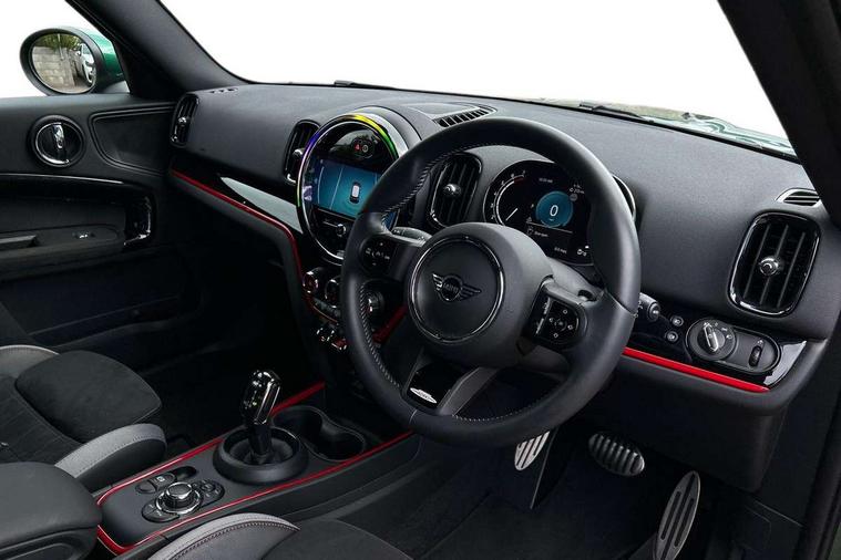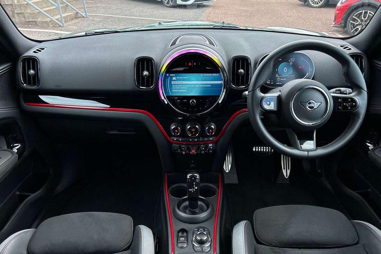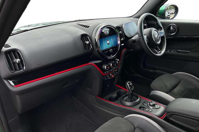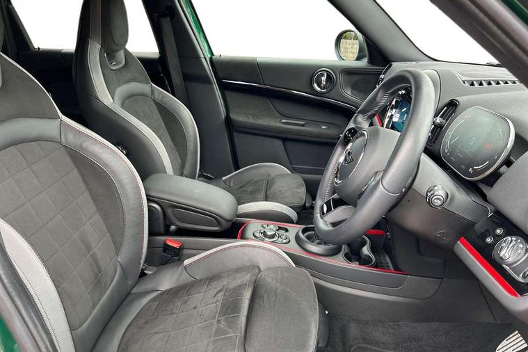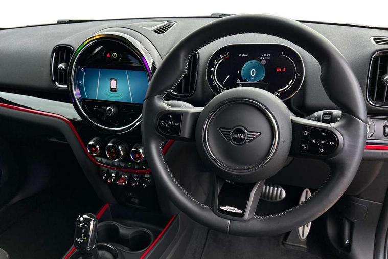 Active Guard incl speed limiting and lane departure functions with auto steering, and front collision warning with brake intervention, Automatic start/stop function with brake energy recuperation, Compatible mobile phone bluetooth with audio streaming, Cruise control with brake assist, Electro-mechanical speed dependant steering assistance, Instrument cluster, MINI Driving Modes - centre toggle switch to control driving setting (sport, mid and green), Mini E-call, On board computer, Double Vanos system, Fully variable valve control, High precision injection, Performance Control, Steptronic transmission with double clutch, FM tuner and DAB digital radio, 3rd brake light, Body colour fuel filler cap, Day time driving lights, Door sill strips, Dynamic brake lights, Electric windows, Heated rear window, Heated windscreen washer jets, John Cooper Works - aerodynamic kit (front and rear apron, spoiler), front and rear sport bumpers and part-painted side sills with door sill finishers, John Cooper Works Logo, LED fog lights, Model logo, Model logo on Tailgate, Rain sensor with auto headlights, Rear fog lights, Rear side wing doors, Rear window wiper, Side scuttle panel with integrated indicator, Split rear doors, Sun/heat protection glass, White indicator lenses, 12V socket in centre console, 3 seat bench in 2nd row, 360L luggage compartment capacity, 4 lashing eyes in luggage compartment, 40:20:40 split folding rear seats, Anthracite headlining with grab handles and clothes hooks, Chrome interior highlights, Colour line - Carbon black, Cupholders, English handbook, Front headrests, Glove compartment, Height and length steering column adjustment, Interior lighting with 12 basic colours selectable via toggle switch in roof, Isofix rear child seat preparation, LED reading lights, vanity mirror lights, front foot well light and spotlight on front seats, Mini John Cooper Works leather gearshift lever and handbrake gaiters, Multifunction steering wheel, Nappa leather steering wheel with MINI Yours logo, Rear headrests, Single front passenger seat, Stainless steel pedals and foot rest, Storage compartments in doors, Sunvisors with vanity mirrors, Excitement pack - Countryman, Navigation pack - Countryman, Piano black exterior pack - Countryman, 2 tone horn, 3 point seatbelts on all seats, 6 Airbags - front, side, head and seat belt tensioners, Anti-lock braking system (ABS), DSC - Dynamic Stability Control, Electronic handbrake, Front and rear disc brakes, Hill start assist, Manual rear child locks, Tyre pressure monitoring system, Alarm system with tilt sensor, monitoring doors, bonnet interior and tailgate, Auto drive away locking, Deadlocking function, Electronic vehicle immobiliser, Locking wheel bolts, Start/stop toggle with keyless go, Piano black JCW interior trim, Tool kit,