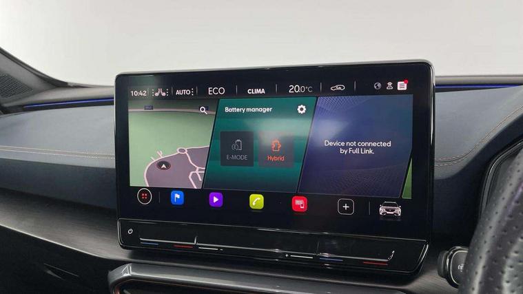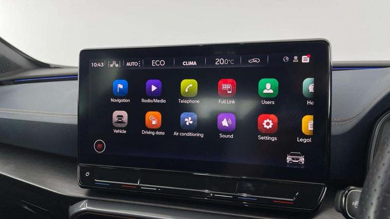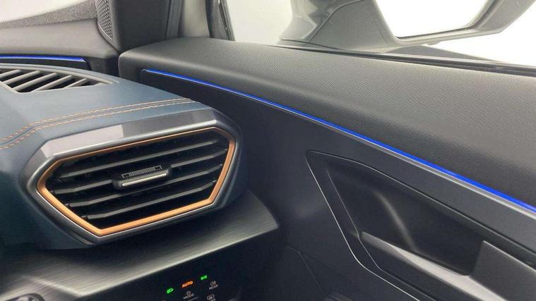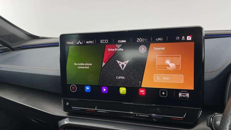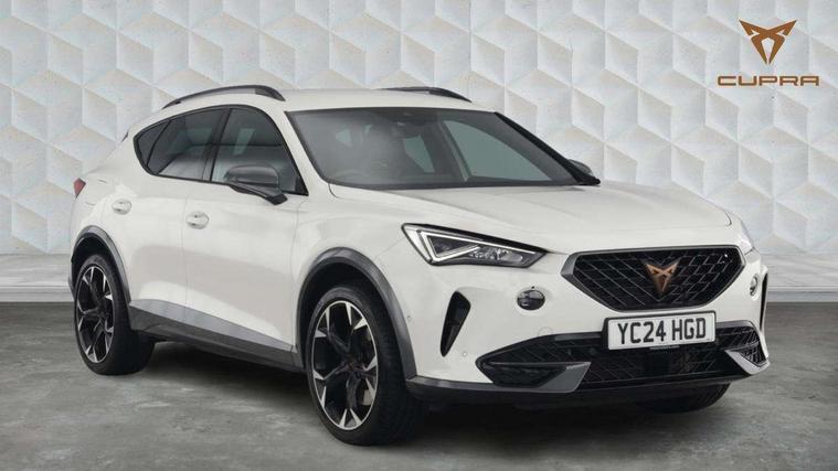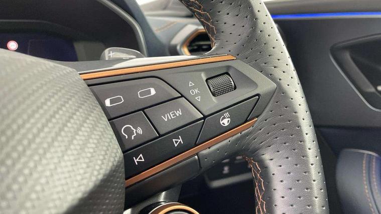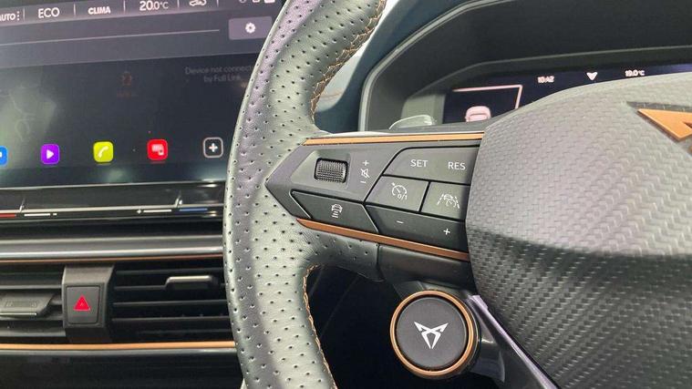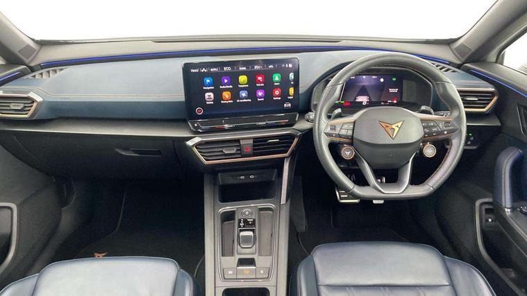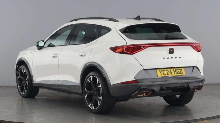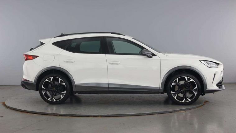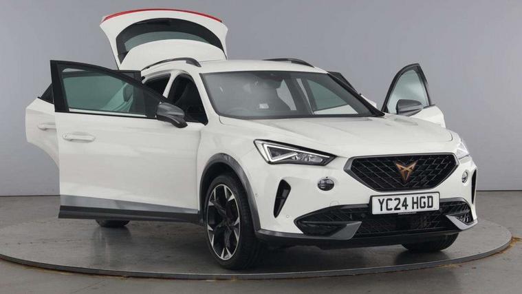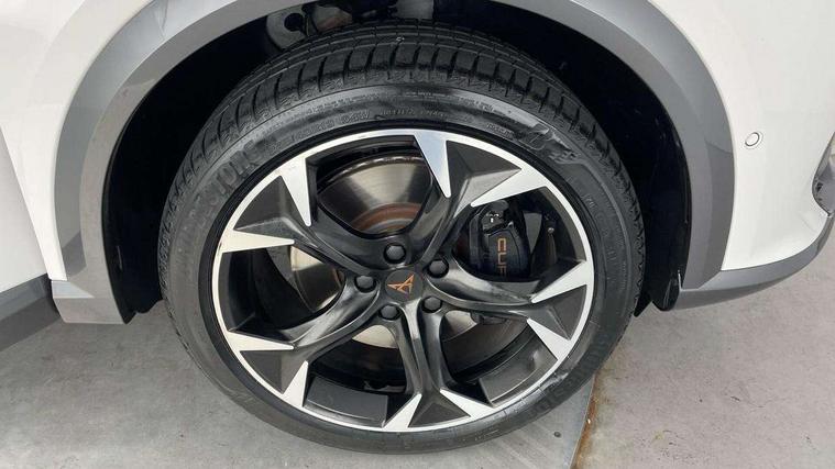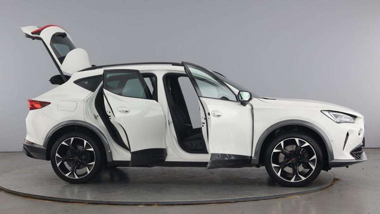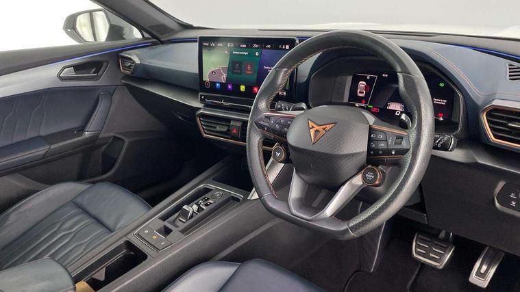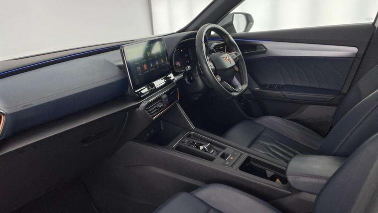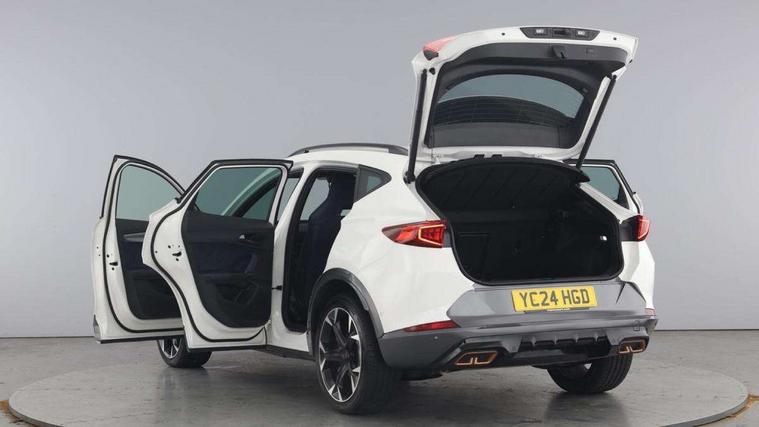 Digital cockpit and configurable dashboard, Driver alert system, Dynamic chassis control with driving profile selection (Comfort, Sport, CUPRA, Individual), Forward collision warning with automatic braking, Lane assist, Navigation system with 12'' Touchscreen Display, Park assist (inc front/rear parking sensors), Predictive adaptive cruise control with speed limiter, RPM, trip computer, outside temp gauge, instrument light brightness, low fuel warning light, lights on reminder, gearshift indicator, Service interval indicator, Speed sensitive power steering, Start/stop system with regenerative braking, Virtual pedal and electric tailgate, Voice control system, Wired Android Auto, Wireless apple carplay, Wireless phone charger, 10 amp mode 2 charging cable, 16 amp mode 3 charging cable, 3.6 kw On-board charger, Electronic locking differential and dynamic traction support, Sports suspension with front shock absoption, 2 front and 2 rear USB type C sockets, Auxiliary input socket, DAB radio, Auto dimming rear view mirror, Body colour door handles, Body coloured bumpers, Dark grey wing mirror, Daytime running light with automatic headlight control and coming home feature, Dynamic headlight range control, Electric front/rear windows, Electrically adjustable heated and folding door mirrors with memory function, Front fog lamps with cornering function, Gloss black roof rails and window surrounds, LED Headlights, LED Taillights with dynamic indicator, Rain sensing wipers, Rear diffuser with twin exhaust pipe on each side with simulated exhausts, Rear side wing doors, Rear wash/wipe, Sports bumpers, Third brake light, Tinted rear windows, Welcome lights, 12v power supply in centre console, 12V socket, 12v socket in loadspace, 2 front and 2 rear reading lights, 230V socket, 3 seat bench in 2nd row, 60/40 split rear bench seat with armrest and mechanical seat release, Black headlining, Cupra sports pedals, Dust/pollen filter, Front and rear head restraints, Front centre armrest, Height/reach adjust steering wheel, Illuminated interior front door sills, Illuminated sunvisor with mirror, Isofix, Leather heated multi-function sports steering wheel with start stop, CUPRA mode button and gear shift paddles, Luggage tie-down hooks, Single front passenger seat, Three zone climate control with control panel in rear, Wraparound lighting, Genuine Nappa leather Pack - Cupra, Safety and driving pack (XL) - Formentor, 3 point seatbelts on all rear seats, ABS, Brake control system - ESC and brake booster, Child proof door locks, Driver and front passenger airbags with front passenger airbag de-activation, Electronic parking brake, Front and rear disc brakes, Front side curtain airbags, Hill hold control, Public e-call, Seat belt reminder for front and rear seats, Tyre pressure monitoring system, Anti theft alarm system, Keyless entry and start system (KESSY), Locking wheel bolts, Copper and aluminium interior detailing, 19" 'Exclusive' machined sport matte black and silver alloy wheels, Tyre repair kit,