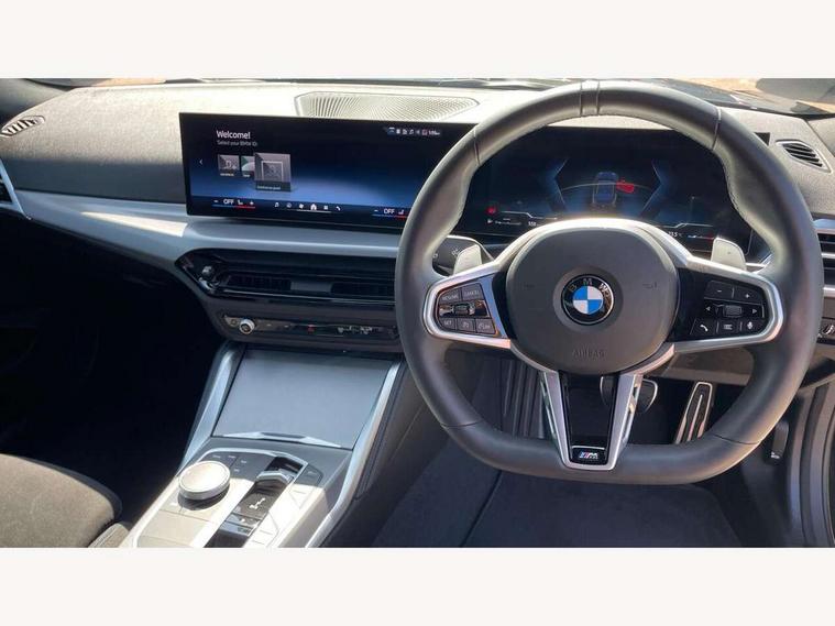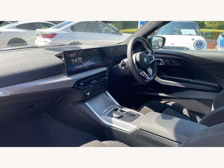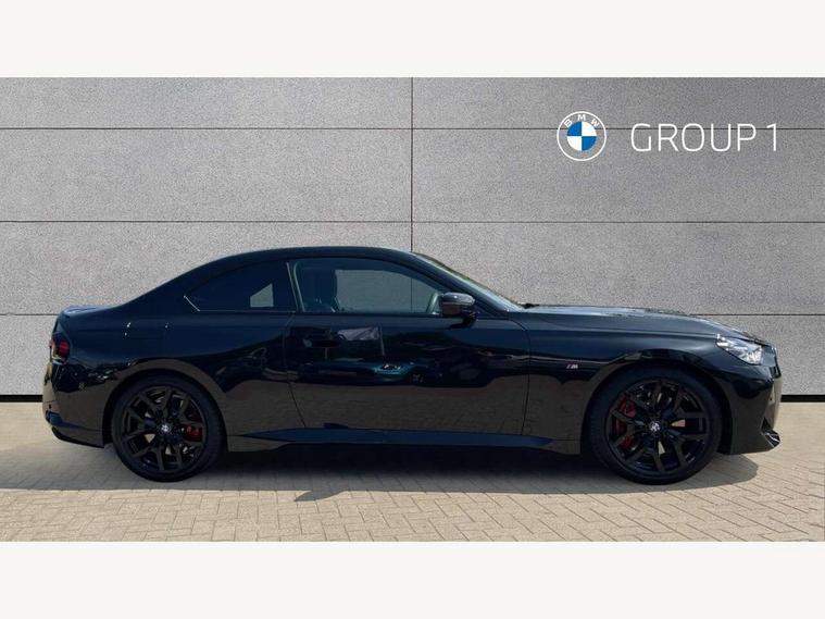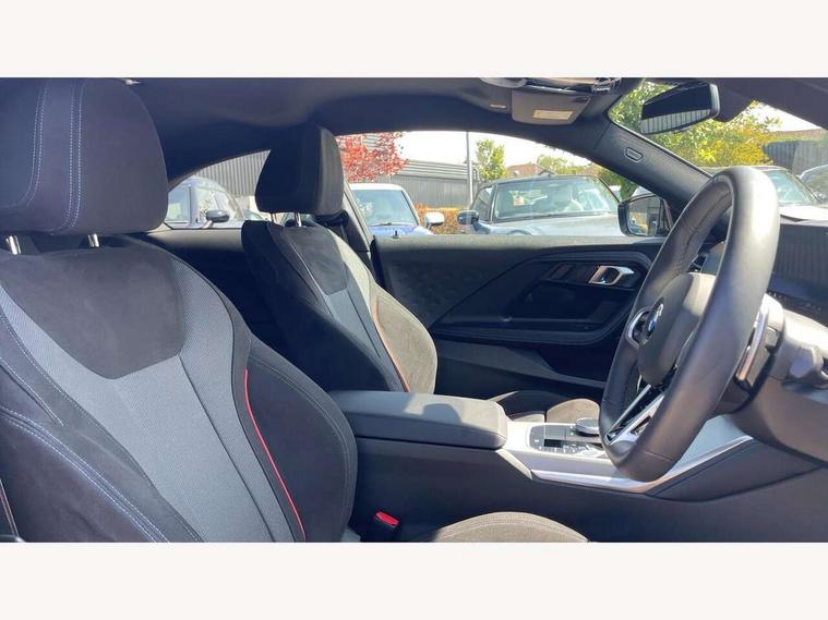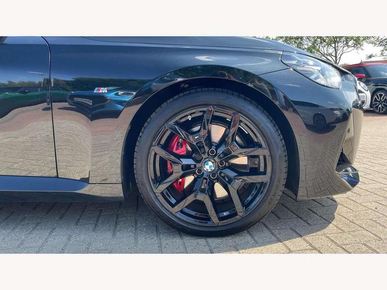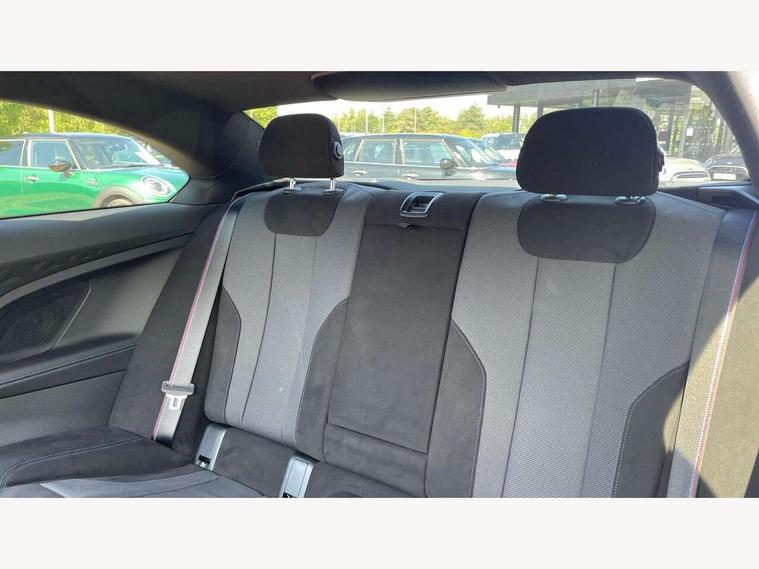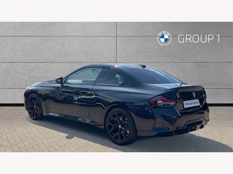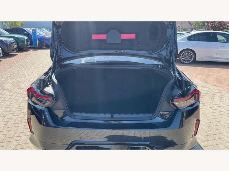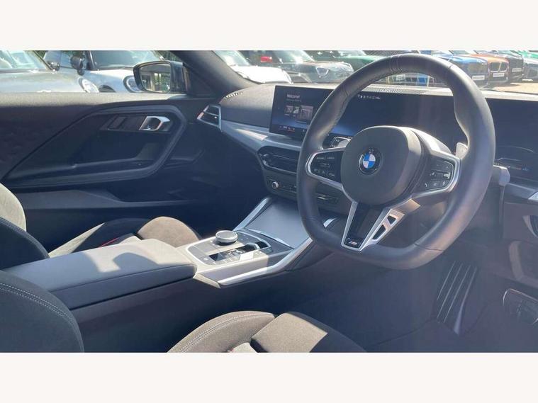2 USB connections for charging and transferring data, Active guard plus, Attentiveness assist, Bluetooth with USB, BMW ConnectedDrive online services, BMW Intelligent Personal Assistant, BMW Live cockpit plus, BMW operating system 8 with variable, configurable widgets display information in real time, BMW Teleservices, Check Control warning system for monitoring of lights and door/luggage compartment open warning, Control Infotainment, Direct selection buttons, Drive off assistant, Eco pro mode, Electric power steering, eSim with 5G connectivity, Front and rear parking sensors, iDrive controller with turn and press function, Integrated owners handbook, Intelligent functions, Oil sensor for level and grade, Optimum shift indicator, Personal Profile, Smartphone integration, Touch operation on control display, Variable sport steering, Widescreen multi-media display, WiFi interface for wireless connection of mobile terminal devices, Aluminium lightweight construction, Balancer shaft, BMW TwinPower Turbo four-cylinder petrol engine, Double VANOS, Drive performance control with ECO PRO comfort + sport mode, Electronic differential lock, High precision injection, M sport suspension, Petrol Particulate Filter, Steptronic transmission with gearshift paddles, Twin scroll turbocharger with Valvetronic, DAB tuner, Acoustic windscreen wipers for reduced driving noise, Automatic windscreen wipers and automatic headlight, Body colour door handles flush with door surface, Body colour door mirrors, Body colour front and rear bumpers, Daytime running lights, Electric windows - front and rear, with open/close fingertip control and trap release, Exhaust tailpipes x2 - 90mm in left and right, Fading support, Front and rear bumper system with replaceable deformation elements, Front door sill finishers in black plastic with BMW designation, Front windscreen wipers with integrated washer jets, Green tinted heat protection glazing, High beam assistant, High gloss black sill, bumper trim sides and diffuser insert, High level third brake light, Indicators integrated int mirror housing, Interior rear-view mirror with automatic anti-dazzle function, LED registration plate light, LED technology rear tail lights, brake lights and turn indicators, Lightweight engineering, M high gloss shadowline, One piece kidney grille with hight gloss chrome surround, Rear boot, Rear fog lights, Reversing light in rear light cluster, Shark fin antenna, Single part LED rear lights with smoked glass components, Trailer stabilisation logic, Visible VIN plate, 12V power socket in front centre console with blanking plug, 2 cupholders in front centre console, 2 zone automatic air conditioning, Ambient lighting, Compartment in front of cupholder, Conditioned based service, English handbook, Folding rear seat head rests, Front and rear side armrests integrated into door trim, Front armrest, Front door pockets, Front head restraints, Heated front seats, Illuminated glove compartment with separate small compartment, M headliner Anthracite, M sport leather steering wheel, Manually adjustment steering wheel column, Rear seat backrest with manual 40:20:40 split folding, Rear seat centre foldable armrest with integrated cup holder, Single front passenger seat, Storage compartment between rear seats, Storage tray and compartment with cover in centre console, Sun visors with vanity mirrors and insert tab, Through loading system with 40/20/40 split folding 2 rear seat in 2nd row, Velour floor mats, Additional storage compartment pack without USB - 2 Series Coupe, Connected pack professional - 2 Series Coupe, 2 tone horn, Anti lock braking system (ABS) with cornering brake control, Automatic Stability Control (ASC), BMW emergency call, Brake drying, Child seat ISOFIX attachment for the two outer rear seats, Crash sensor activating of airbags, Unlocking doors, hazard warning lights, fuel cut off, interior lighting+activation of safety battery terminal clamp, Deactivation of fuel pump in the event of a crash, Driver and front passenger airbags, Driver and front passenger side airbags, integrated in the door side seat backrest bolsters for all seat variants, Dynamic brake control, Dynamic stability control + (DSC+), Dynamic Traction Control - DTC, Electrically operated hand brake including automatic hold function and automatic release when driving off, Front and rear disc brakes, Front centre airbag between driver and front passenger seats, Front passenger airbag deactivation, Head airbags for all 4 outer seats, PC iBrake (Post crash approach control warning with light braking function), Seat belt security check for driver and front passenger, Seatbelt warning, Side impact protection, Three point seat belts on 4 seats including front belt stopper, pyrotechnic belt tensioners and belt force limiters, Tyre pressure monitoring system, Warning triangle and first aid kit, Alarm system (Thatcham 1) with remote control and electronic engine immobiliser, Central locking switch for all doors, fuel filler cap and luggage compartment, Deadlocking function system to all doors, Drive away locking system on all doors and luggage compartment, Locking wheel bolts, Start/Stop button (illuminated) in centre console with keyless engine start and Auto Start-Stop deactivation button, Two remote control key with integrated key - one button for open and close doors/fuel flap/tailgate and separate button for unlock luggage compartment, Electrically powered 12V compressor, Reduced rolling resistance tyres, Tyre repair kit,