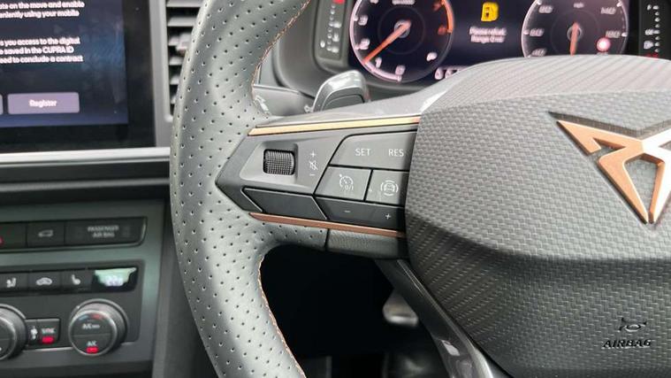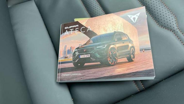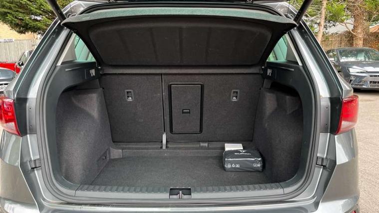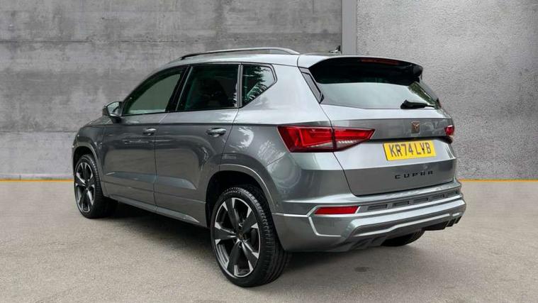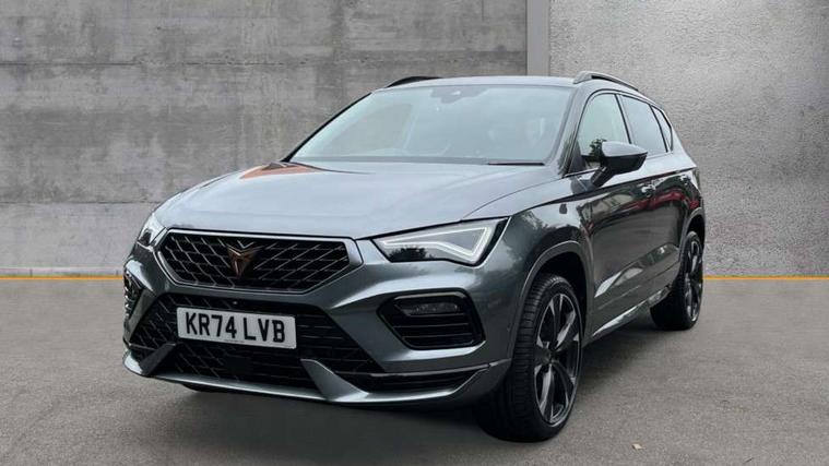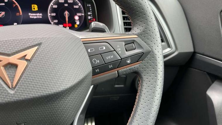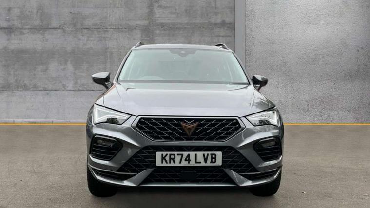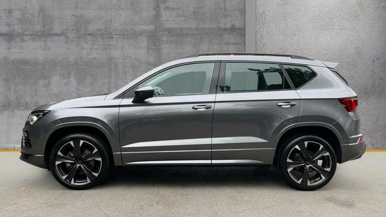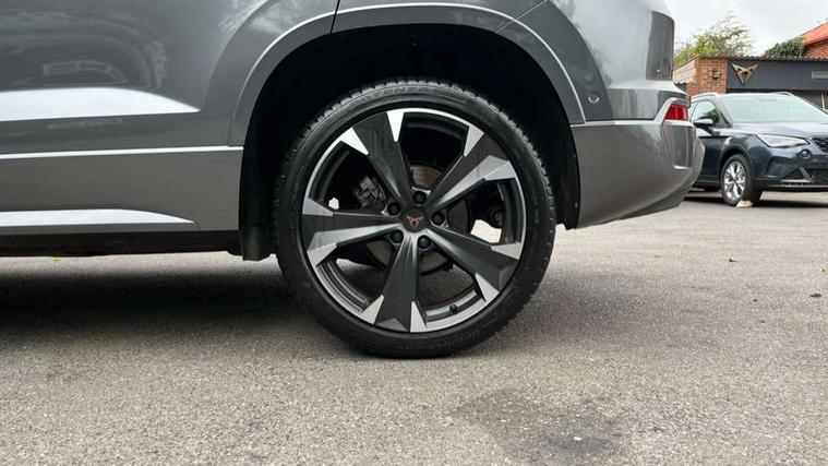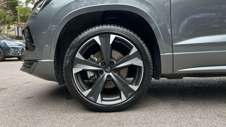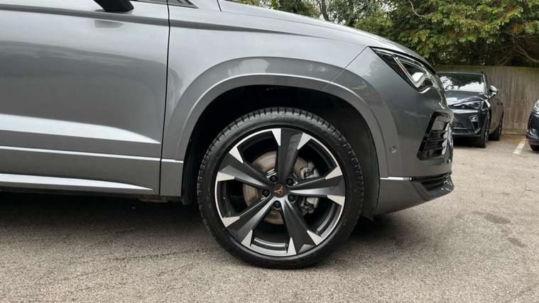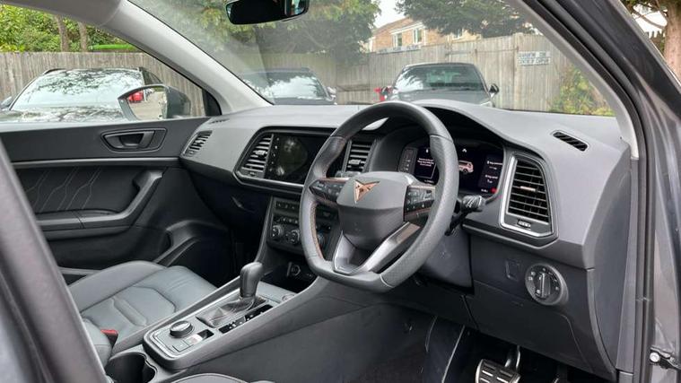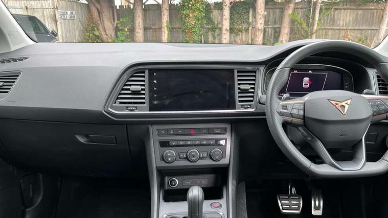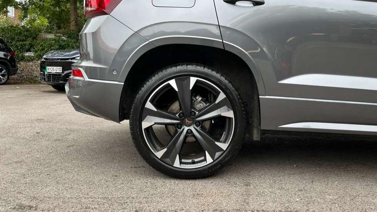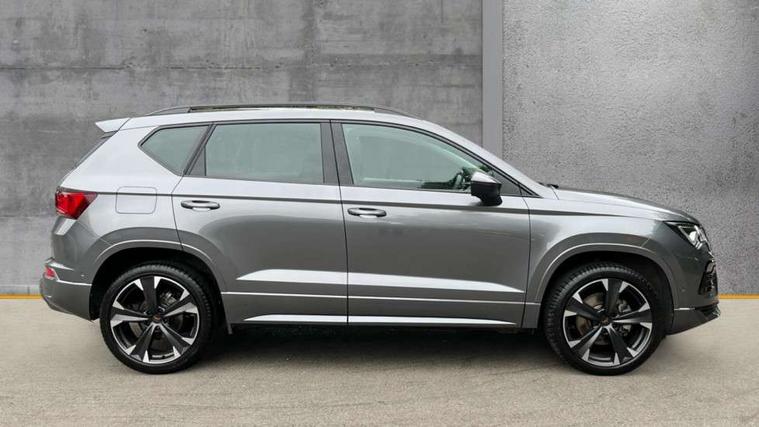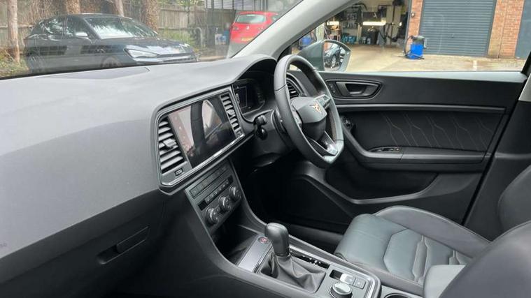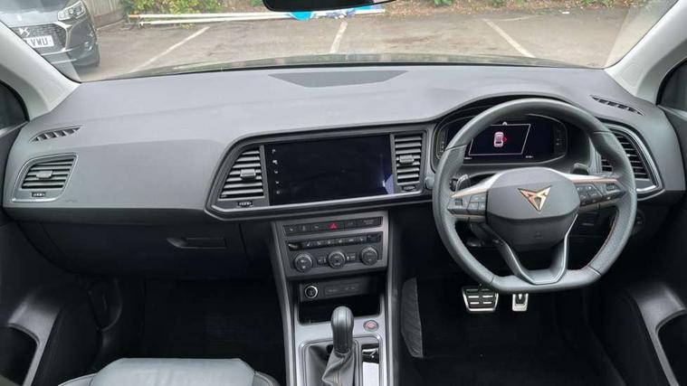 Cruise control system with speed limiter, Digital cockpit, Driving profile selection and conventional shock absorber, E-call, Electric tailgate with virtual pedal, Outside temperature gauge, Progressive power assisted steering, Rear view camera, Self parking functionality (includes front and rear parking sensors), Trip computer, wired and wireless full link smartphone integration, Wireless phone charger, Front and rear shock absorption, chassis with increased ride height, Steering wheel mounted audio/phone controls, Body colour bumpers with dark aluminium diffusor, Body coloured wheel arch surrounds, Dark tinted rear windows, Daytime running lights, Door mirrors with welcome CUPRA light silhouette, Dynamic headlight range control with self adjusting whilst driving, Electric adjustable/heated/folding door mirrors, Front and rear electric windows, Front grille frame in chrome, Full LED headlamps with lens and LED front fog lamps with cornering function, Gloss black door mirrors, Gloss black roof rails, Gloss black side mouldings, Gloss black side window trim, Illuminated aluminium front door sill, LED rear tail lights with dynamic indicators, Rear fog lights, Rear side wing doors, Rear spoiler, Rear wash/wipe, Specific CUPRA design front bumper, Standard rear exhaust tailpipes, Third brake light, 12v socket in front, 3 seat bench in 2nd row, 60/40 split folding rear seat, Aluminium pedals, Cupra steering wheel emblem, Dual zone climate control, Electric driver seat with memory function, Front and rear head restraints, Front centre armrest, Front seat back storage pockets, Grey roof lining, Heated front seats, Heated steering wheel, Height adjustable driver and passenger seat with lumbar adjustment, ISOFIX points in outer rear seats with top tether anchorage points, Leather sport bucket seats, Leather steering wheel and gear knob, Multicoloured ambient lighting with LED interior illumination, Pedal cluster, Rear armrest and easy back seat release mechanism from boot, Single front passenger seat, Sports steering wheel, Steering wheel mounted gearshift paddles, Storage compartment in roof console for sunglass, Storage compartment under driver's seat, Convenience pack - Ateca, Interior lighting pack - Ateca, Navigation system plus pack with DAB - Ateca, Safety and driving pack - Ateca, 3x3 point rear seatbelts, ABS, Traction control system (TCS), Electronic stability control (ESC) and Electronic differential lock system (XDS), Airbags - Driver and front passenger airbag with deactivation, front side, two curtain and driver's knee airbags, Black brake callipers with CUPRA logo, Electric parking brake with auto hold function, Front and rear seatbelt reminder, Front assist with autonomous emergency braking, Hill hold control, Manual rear child locks, Single tone horn, Tiredness recognition system, Tyre pressure monitoring system, Alarm, Keyless entry, Locking wheel bolts, 19" Sport machined alloy wheels 36/3 in black/silver,