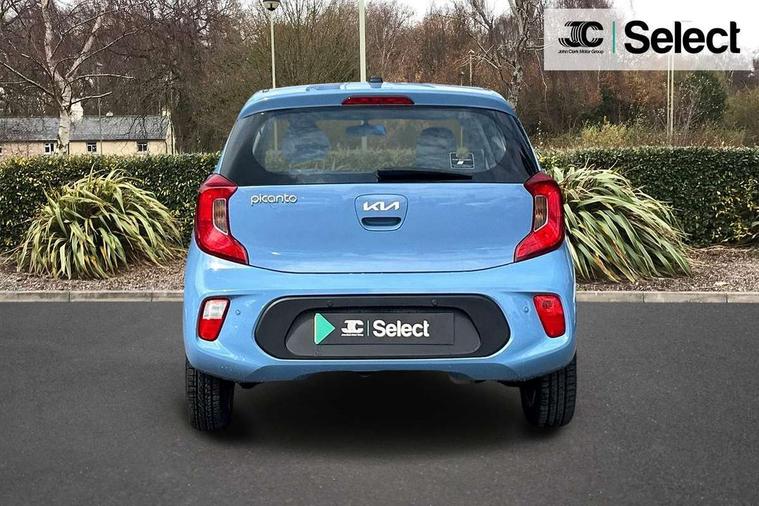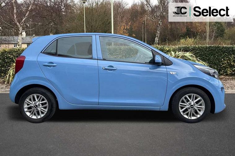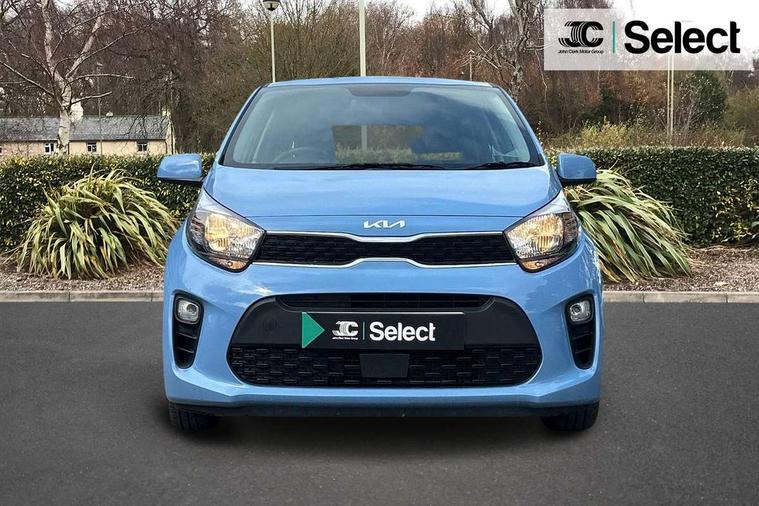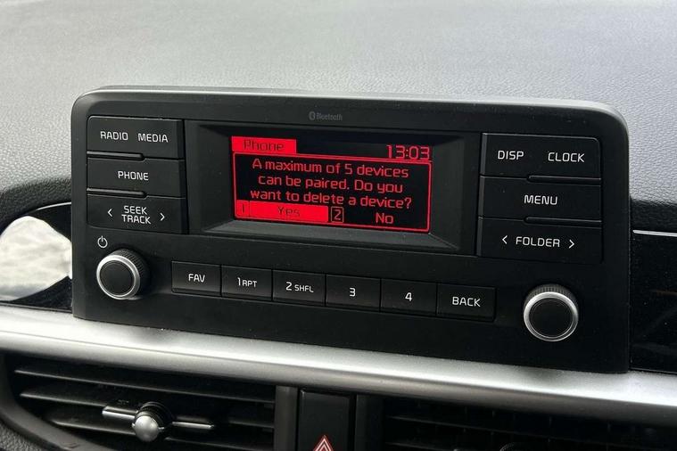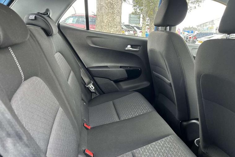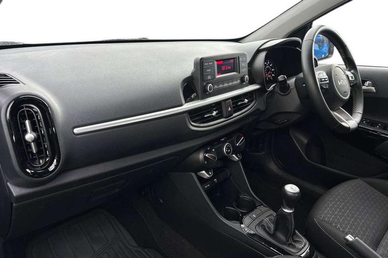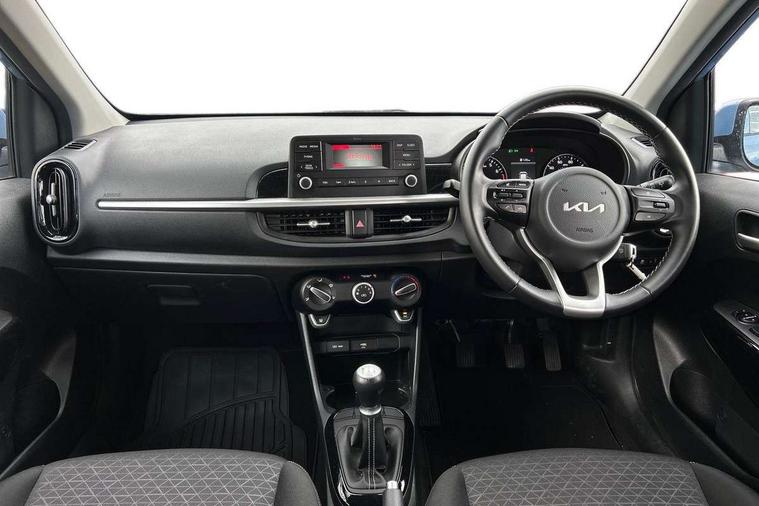 3.8" monochrome audio display with RDS and DAB, Emergency call service, Emergency stop signalling system, External temperature gauge, Motor driven power steering, Tachometer, Tailgate, Trip computer, 4 speaker audio system, Bluetooth with music streaming, Steering wheel mounted controls, USB ports for connection of a media device, Automatic headlight control system, Black radiator grille with chrome surround, Body colour bumpers, Body colour mirrors and door handles, Day/night rear view mirror, Daytime running lights, Electric adjustable heated door mirrors, Front and rear electric windows with drivers's auto up/down function, Headlamp levelling, Heated rear window, High mount brake light, MFR Multi - Focus Reflector headlights with black bezel, Rain sensor, Rear boot, Rear fog lights, Rear side wing doors, Rear wash/wipe, Speed variable front wipers, Tinted glass, Visible VIN plate, Welcome and follow-me home light functionality, 1 x rear coat hook, 12V power point front, 2 seat bench in 2nd row, 3 x passenger assist grips, 60/40 split/folding 2nd row of seats, All round height adjustable headrests, Cupholders in centre console, Driver and front passenger sunvisor with vanity mirror, Driver seat height adjust, Front cabin lights, Glovebox, High gloss lower centre fascia trim, door armrest and air vents, ISOFIX Child seat top tethers and anchor fixings, Leather trimmed steering wheel and gearshift, Luggage area light, Luggage area parcel shelf, Manual air conditioning, Passenger front seatback pockets, Premium cloth upholstery, Silver paint finished interior door handles, Single front passenger seat, Slide/reclining front seats, Tilt adjustable steering wheel, Advanced Driver Assistance Pack - Picanto, 2 x 3-point rear seatbelts, ABS/EBD, Automatic unlocking of doors in case of impact, Dual front airbags, ESC + BAS + VSM + HAC, Front passenger airbag cut-off switch, Front seatbelt height adjusters, Front seatbelt pretensioners + load limiters, Hill hold control, Knee airbags, Rear child proof door locks, Seatbelt warning, Side impact protection, Torque vectoring brake based and straight line stability (SLS), Traction control, Twin curtain airbags, Twin front side airbags, Tyre pressure monitoring system, Anti theft alarm, Engine immobiliser, Folding key, Locking wheel nuts, Remote central door locking, 14" alloy wheels, Tyre mobility kit,