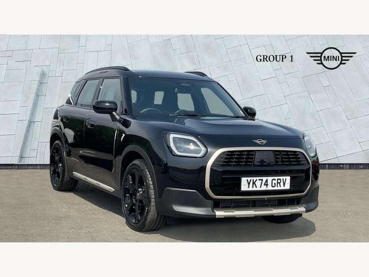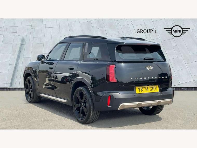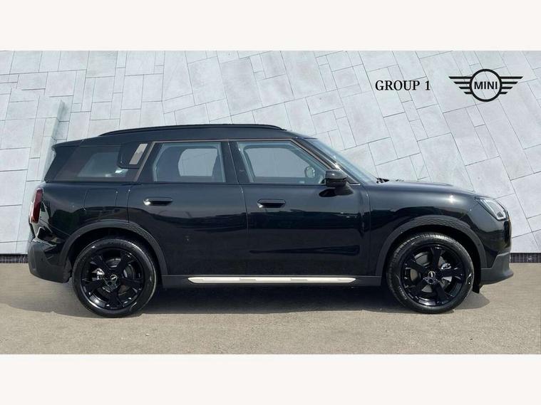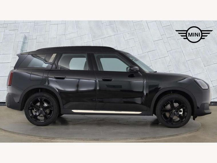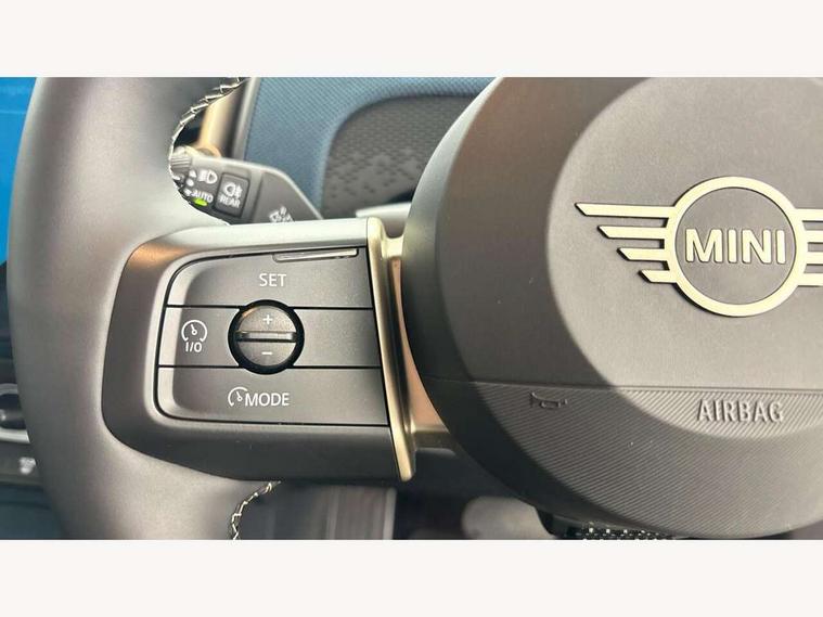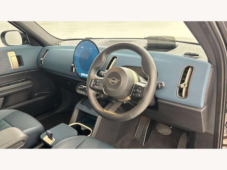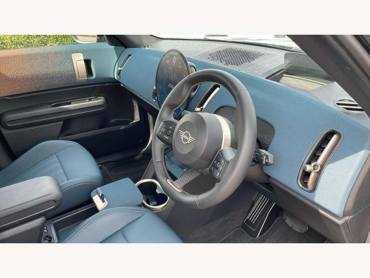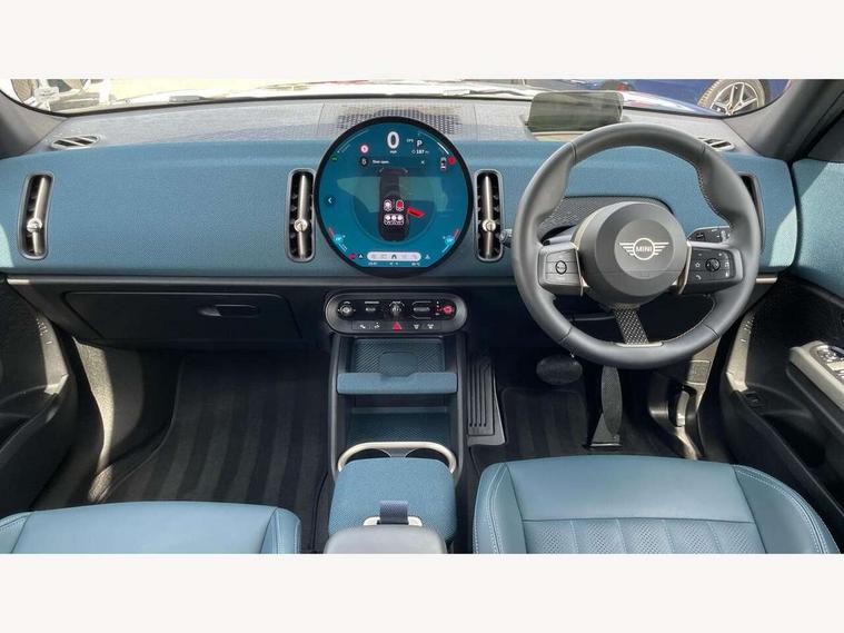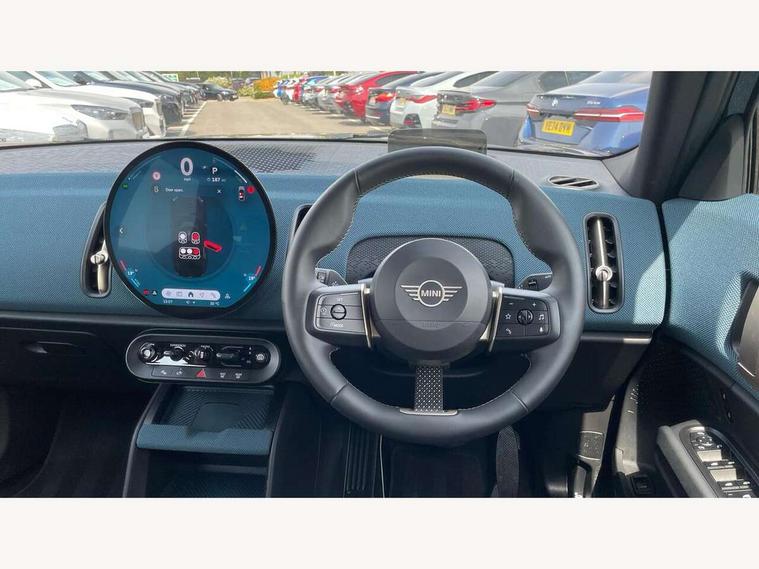 Bluetooth connection, Circular OLED Screen, Compatible mobile phone bluetooth with audio streaming, Cruise Control (DCC), Digital dashboard display, Driving assistant, E-call, Electro-mechanical speed dependant steering assistance, MINI Experience Modes, Mini navigation system, MINI TeleServices, Parking assistant in camera and ultrasound based assistance system, rear view camera, parking aid and distance control, Auto transmission with Paddles, Larger capacity fuel tank, 6 speakers, DAB Digital radio, Personal eSim, Auto tailgate, Electric adjustable heated door mirrors, Front and rear electric windows, Heated rear window, LED daytime running lights, LED Headlights, LED rear lights, LED third brake light, Logos in Vibrant Silver, Rain sensor with auto headlights, Rear side wing doors, Rear window wiper, Roof rails, Vibrant Silver Grill Surround, 3 seat bench in 2nd row, 60/40 split rear bench seat, Anthracite headliner, Auto air conditioning, Floor mats, Front armrest, Front headrests, Front sport seats, Heated steering wheel, Height and length steering column adjustment, Lidded storage box in Petrol knit, Rear headrests, Single front passenger seat, Sport Vescin Steering Wheel, Sunvisors with vanity mirrors, Vescin synthetic leather upholstery, Vibrant Silver sill inlay, 3x3 point rear seat belts, 6 Airbags - front, side, head and seat belt tensioners, ABS, DSC - Dynamic Stability Control, Electronic handbrake, Electronic Stability Programme (ESP), Front ISOFIX (iSize), Hill hold assist, Hill start assist, Manual rear child locks, Traction control, Tyre pressure monitoring system, Warning triangle, Alarm system with tilt sensor, monitoring doors, bonnet interior and tailgate, Auto drive away locking, Deadlocking function, Electronic vehicle immobiliser, Locking wheel bolts, Remote control locking, Start/stop toggle with keyless go, Petrol/Brown dashboard knit, MINI Mobility Kit,
