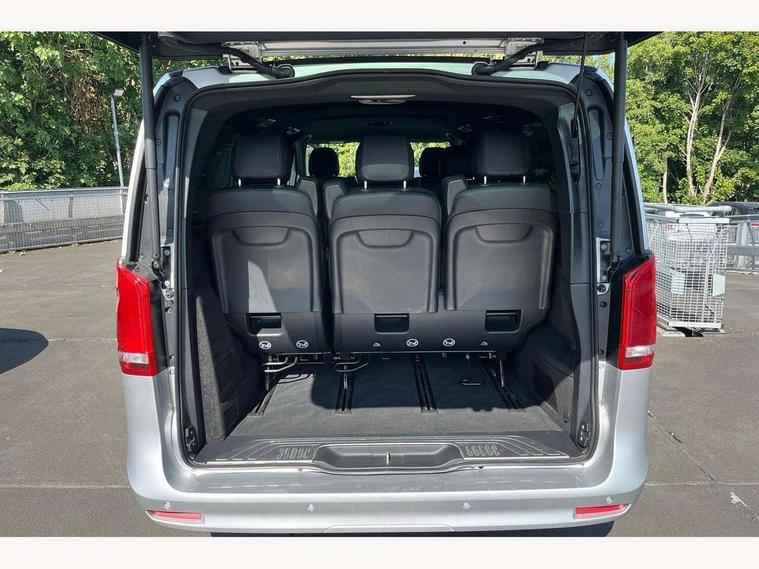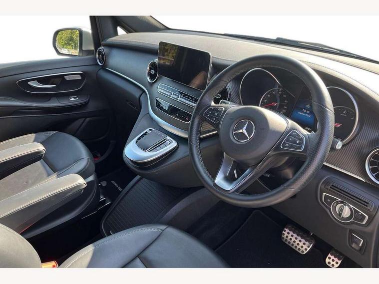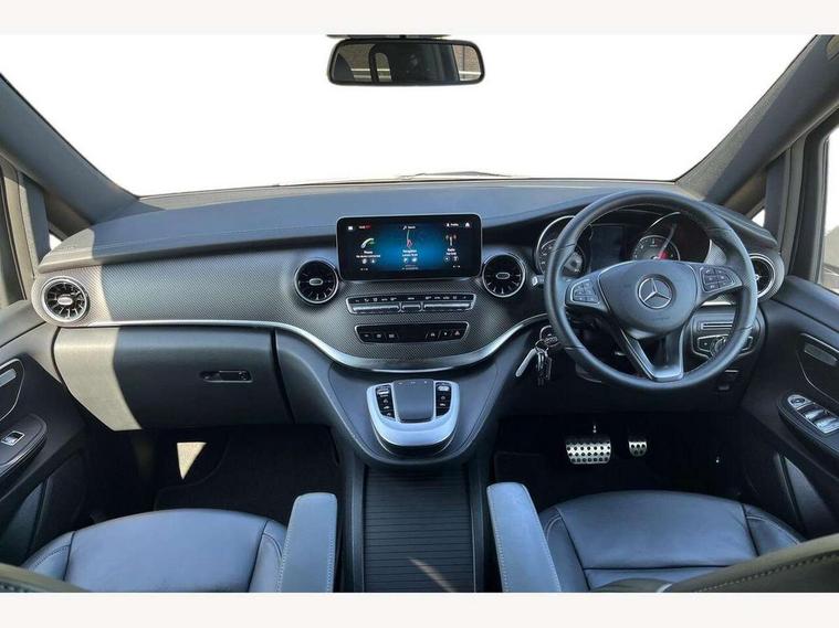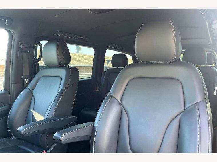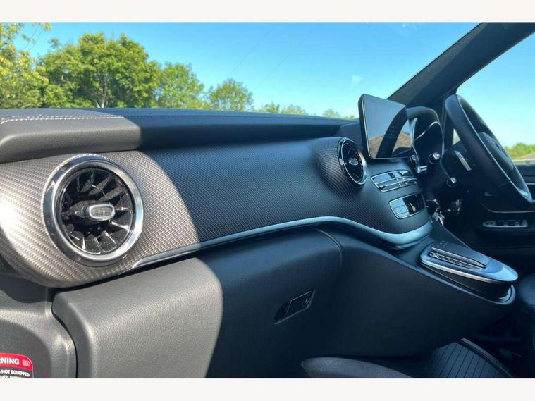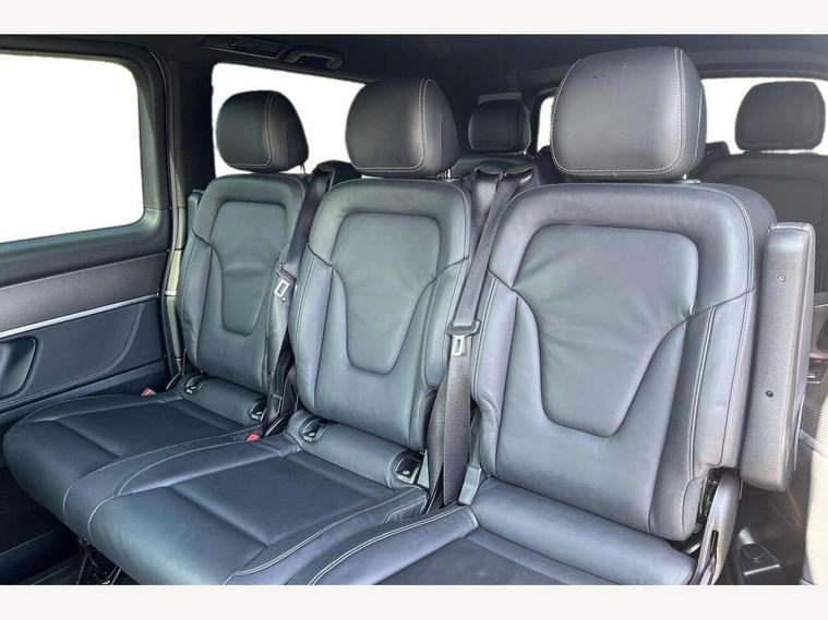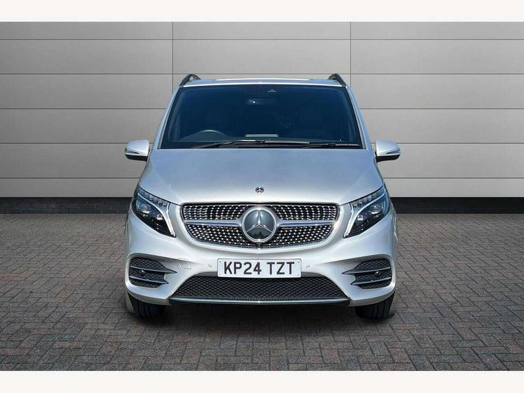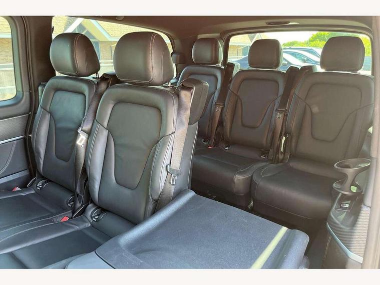 Active parking assist, Agility select with a choice of driving modes (Comfort, ECO, Sport, Individual), Attention assist, Brake wear warning display, Cruise control with speedtronic variable speed limiter, Direct steer speed sensitive steering, Easy-pack tailgate - Powered opening/closing automatically, ECO start/stop function, Instrument cluster with 5.5 inch colour display trip computer, MBUX multimedia nav with 10.25" touchscreen, Hey Mercedes intelligent voice control, 2 USB-C ports and mobile connectivity for up to 15 devices, MBUX personalised vehicle profiles, MBUX touchpad, Mercedes me connect including emergency call system, accident recovery, breakdown and maintenance management, Outside temperature display, Service indicator (ASSYST), Side wind assist system, Status display for rear seat belts in instrument cluster, 25 litres large AdBlue tank, 9G TRONIC 9 speed automatic transmission, Agility control comfort suspension, Diesel particulate filter, Audio 20 CD with integrated media interface, DAB Digital radio, Integrated radio aerial, iPod/iPhone + Bluetooth interface with handsfree function, Two USB ports and one SD Card slot in centre console, Adaptive brake lights, AMG bodystyling front apron and rear roof spoiler, AMG bodystyling front apron and rear spoiler, AMG bodystyling rear apron, AMG bodystyling side skirts, Anodised roof rails, Automated headlamp assist, Automatically dimming exterior driver's mirror, Black tinted rear windows, Body colour bumpers, Body colour door mirrors, Chrome pins diamond radiator grille with integrated stars, Chrome trim to front bumper, Electric folding door mirrors + auto dimming rear view mirror, Electric front windows, one touch / obstruction sensor, Electric sliding door in both side, Electric ventilation windows in passenger compartment, Heated windscreen washers, Illuminated front door sill panels with Mercedes-Benz lettering, LED intelligent light system including integral LED daytime running lamps, LED tail lamps/brake lamps and indicators, Logo projection, Metallic paint, Privacy glass, Rain sensing windscreen wipers, Rear wiper, Split tailgate in opening rear window with chrome handle, 12V socket in boot/load compartment and rear passenger compartment, 3 colours ambient lighting, 3 seat bench in 2nd row, 3 seat bench in 3rd row, 3 spoke nappa leather steering wheel, Adjustable front seat head restraints, ARTICO leather upper dashboard with contrast stitching, Carpet floor covering in passenger compartment, Comfort driver and front passenger seats including armrest, Driver + front passenger lumbar support, Electric air heater system - 1.2 kW output, Extended seat rails, Footwell lighting with reading light and illuminated handle in rear compartment, Height/reach adjustable steering column, Lockable glove compartment, Luxury centre console with retractable cover + two cup holder + 12V socket + multimedia box, Multifunction steering wheel with audio controls and onboard settings, Nappa leather upholstery, Rear head restraints, Seat occupancy sensor for front passenger seat, Single front passenger seat, Sports pedals in brushed stainless steel with rubber studs, Stowage nets behind individual seats, Sunvisors with illuminated vanity mirrors, Thermatic 3 zone automatic climate control, Three stage heated front seats, Seat comfort pack - V Class, Towing pack - V Class, Urban Guard protection pack - V Class, 3 point seatbelts on all seats, Active brake assist, Adaptive brake system with HOLD function and brake drying in the wet, Airbags - sidebag for driver and front passenger with combined thorax/pelvis bag, Airbags - windowbag for driver and front passenger, Anti-lock braking system (ABS), Electric parking brake, Electronic Stability Programme, Hill start assist, Perforated front brake discs and brake calipers with Mercedes-Benz lettering, Rear child proof door locks, Tyre pressure monitoring system, Warning triangle and first aid kit, Central locking with interior switch, Chrome surround electric key, Carbon look trim, Chrome air vent surrounds, 19" AMG 7 twin spoke alloy wheels, Space saver spare wheel with jack, Summer tyres,