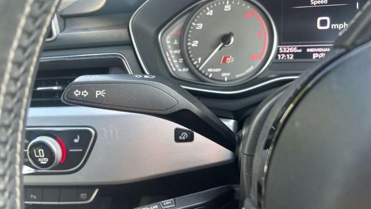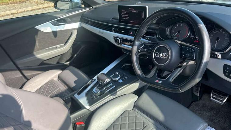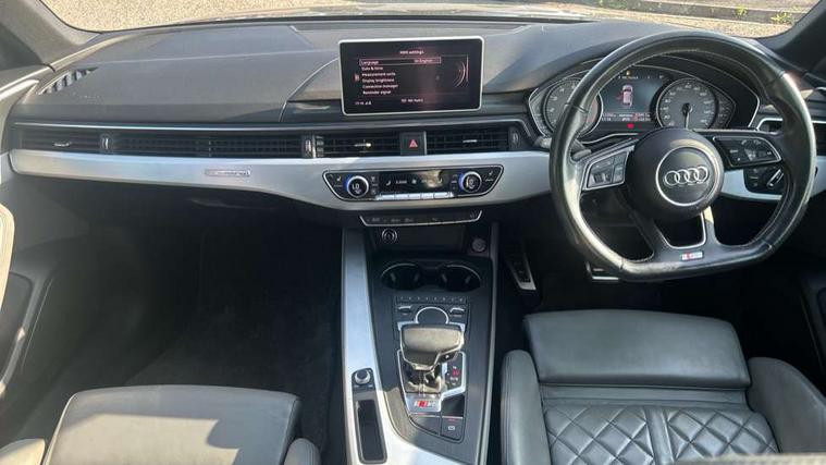 Audi connect, Audi drive select, Audi Pre sense collision avoidance, Audi smartphone interface, Electro-mechanical PAS, MMI navigation plus with HDD and jukebox storage + 2 SD card readers + single CD/DVD player, Mobile telephone preparation - bluetooth interface, Power boot opening and closing, Service interval indicator, Stop/start button, Voice control system, 2 USB ports, Aux input, DAB digital radio module, Acoustic windscreen, Air inlets in titan black with chrome inlays, Aluminium window trim, Auto dimming rear view mirror, Automatic headlights + automatic windscreen wipers, Body colour bumpers, Chrome door handles, Chrome rolled exhaust, Electric adjustable heated door mirrors, Electric front windows, Electric rear windows, Headlight range control, Headlight washer jets, High beam assistant, High gloss black triangular aperture at rear door, Honeycomb radiator grille - black, LED daytime running lights, LED indicators in door mirrors, Rain and light sensors, Rear diffuser in Twilight grey matt, Rear spoiler, Rear wiper, Twin oval exhaust tailpipes with chrome finish, 3 zone climate control, 4 way electric lumbar support for driver and front passenger, Black cloth headlining, Electric adjustable front seats, Fine Nappa leather upholstery, Front centre armrest with 12v socket, Front headrests, Front/rear floor mats, Gearshift paddles, Heated front seats, Illuminated door sill finishers, Isofix child seat preparation for front passenger/outer rear seats inc passenger airbag deactivation, Jack and tool kit, Luggage compartment carpet, Lumbar support with massage function, Massage function for front and rear seats, Perforated leather gearknob, Reach + rake adjustable steering column, Rear headrests, Retractable load area cover, S Super sports front seats, Split folding rear seats, Sunvisors with vanity mirrors, Top tether anchor plate for isofix child seat, Extended Interior Upholstery Pack - A4/S4, Non Smokers pack, 3 point seatbelts on all rear seats, ABS/EBD, Active bonnet, Adaptive driver and front passenger airbags, Electromechanical parking brake, ESP, First aid kit, Front head airbags, Front seatbelt pretensioners + load limiters, Front side airbags, Multi-Collision braking, Seatbelt warning, Traction control, Tyre pressure monitoring system, Warning triangle, Anti theft alarm, Keyless Start, Locking wheel bolts, Remote central locking, Thatcham category 1 alarm + immobiliser, Space saver spare wheel,