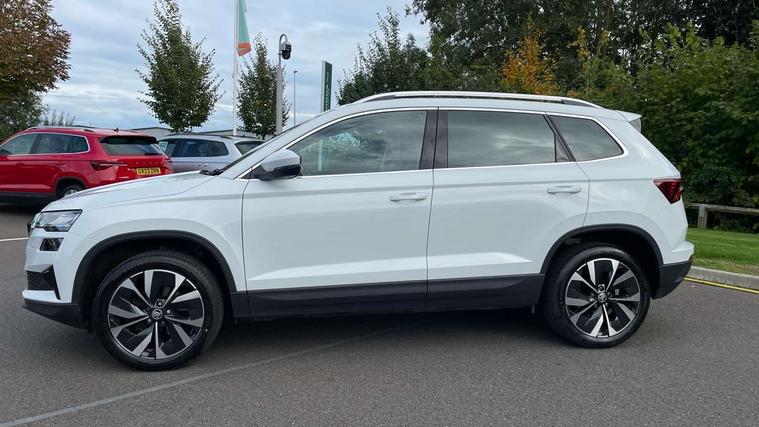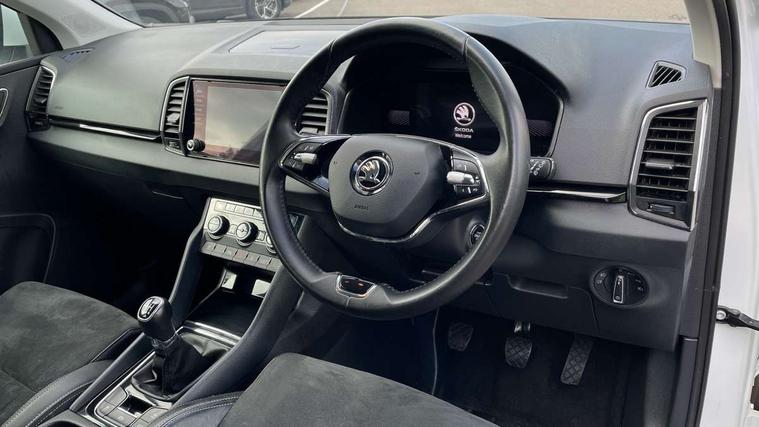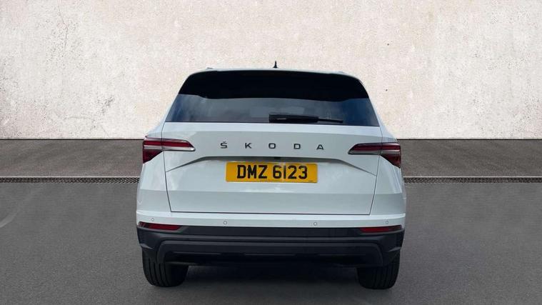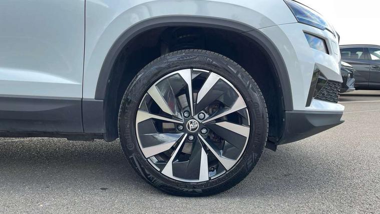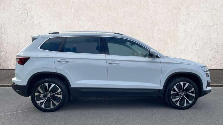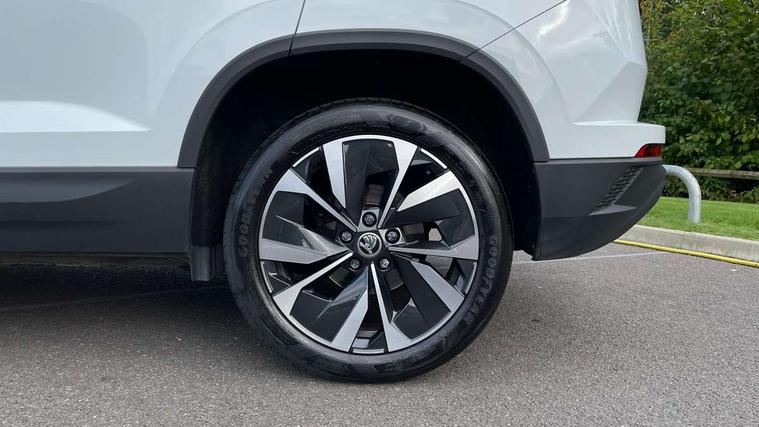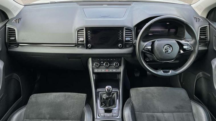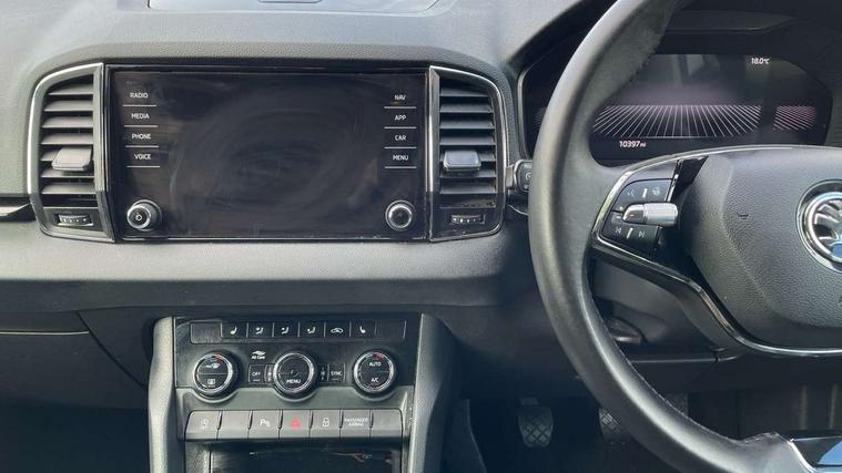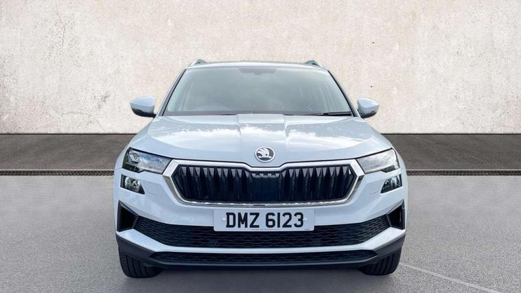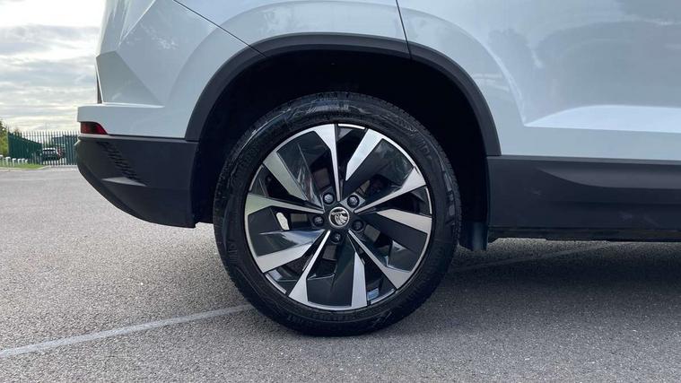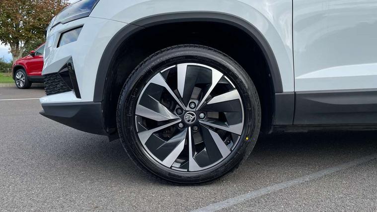 8" Digital display, Care connect, Drive mode selector, Driver fatigue sensor, Electro-mechanical PAS, Emergency services call system, Outside temperature gauge, Service interval indicator, SmartLink wireless for Apple and wired for Android, Start/stop system with regenerative braking, USB C Port x 2 in front centre console, 8 Speakers, DAB radio with Bluetooth, USB connection, Acoustic glass, Aero front windscreen wipers with intermittent function, Auto dimming rear view mirror with light and rain sensors, Black electric window control buttons, Body colour door mirrors and handles, Dynamic headlight range control with cornering light function, Electric front and rear windows with child proof lock, Heated rear windscreen, LED daytime running lights, LED rear lights with high functionality welcome effect and dynamic indicators, Light assistant (coming/leaving home/tunnel light), Plastic scuff plates, Privacy glass, Rear side wing doors, Rear spoiler, Rear window wiper with washer system and intermittent control, Safety reflectors on front doors, Third brake light, 1.5 litre bottle holders in driver and front passenger door panels, 12V socket in boot, 12v socket in front centre armrest with storage compartment and rear air vents, 2 spoke leather heated multifunction steering wheel, 2 x Tablet holder, 3 rear height adjustable headrests, 3 seat bench in 2nd row, 4 foldable roof handles with rear coat hooks, Black floor carpet, Chrome inner door handles, Double sided boot floor, Foldable hooks in the boot, Front head restraints, Height adjustable front three point seats belts with tensioners, Height/reach adjust steering wheel, Ice scraper, Illuminated glovebox, Illuminated luggage compartment, Isofix child seat preparation for front passenger seat, Isofix child seat preparation outer rear, Manual lumbar support for front seats, Pen holder, Pollen filter, Rear boot cover, Rear reading lights, Rubbish bin door, Safety vest holder, Single front passenger seat, Storage box in upper central dashboard closed, Sunvisors with illuminated vanity mirrors, Textile floor mats, Ticket holder, VarioFlex seats with standard rear seat release, Boot pack - Karoq, Design Pack - Karoq, Parking pack - Karoq, Automatic door unlocking in case of crash, Automatic fuel cut off in case of crash, Child locks on rear doors, Driver airbag, Electronic parking brake with auto hold function, Emergency rear braking signal, ESC including ABS, MSR, ASR, EDS, HBA, DSR, RBS, MKB and traction control, Front side airbags, Hill hold control, Knee airbags, Passenger airbag with switch-off function, Pedestrian monitor, Seatbelt reminder signalisation and pretensioner for all seats, Three point seatbelts rear, Two tone horn, Tyre pressure display, Tyre pressure monitor, Alarm with interior monitoring, back up horn and tilt sensor with safe function, Electronic engine immobiliser, Keyless entry and start/stop, Remote central locking with 2 remote folding keys, Chrome framed air vents, 18" Miran alloy wheels in black, Anti-theft wheel bolts protection, Tool kit,