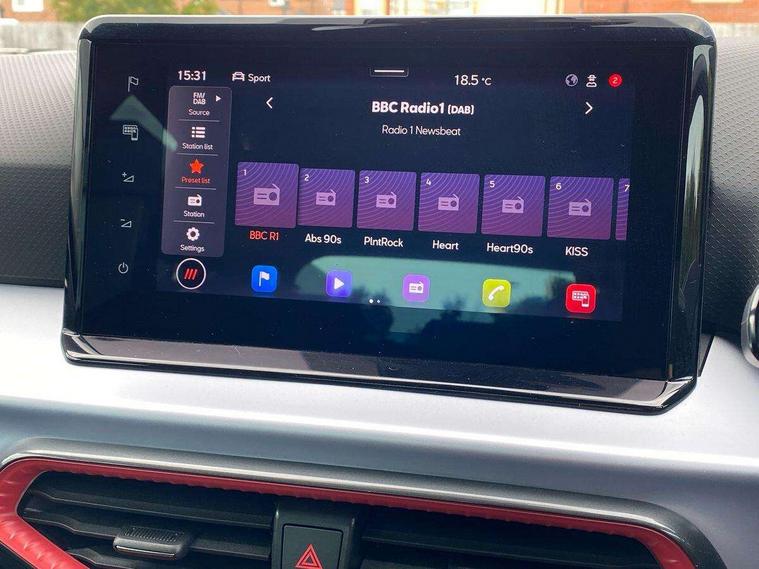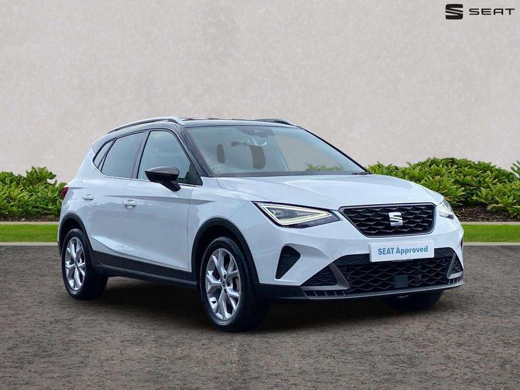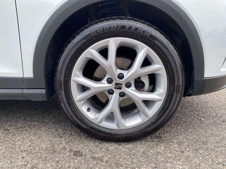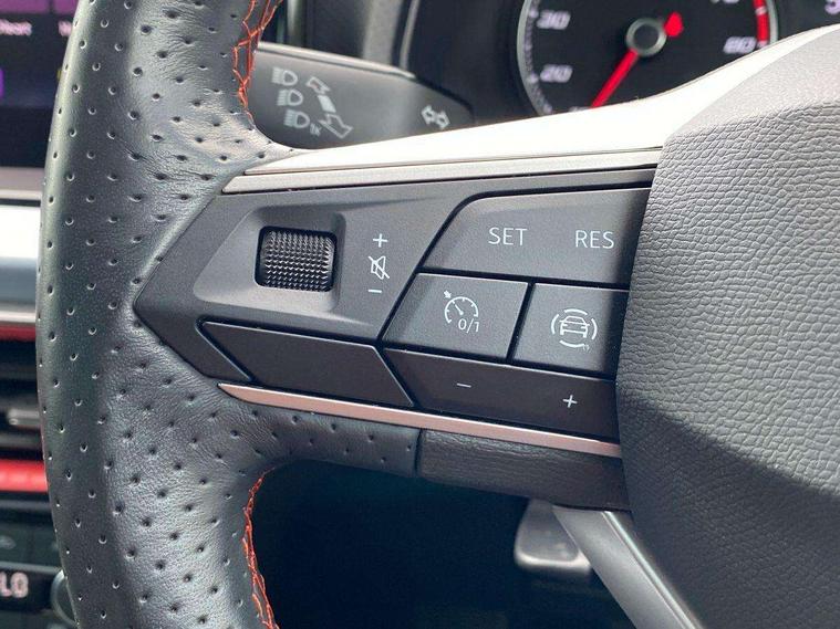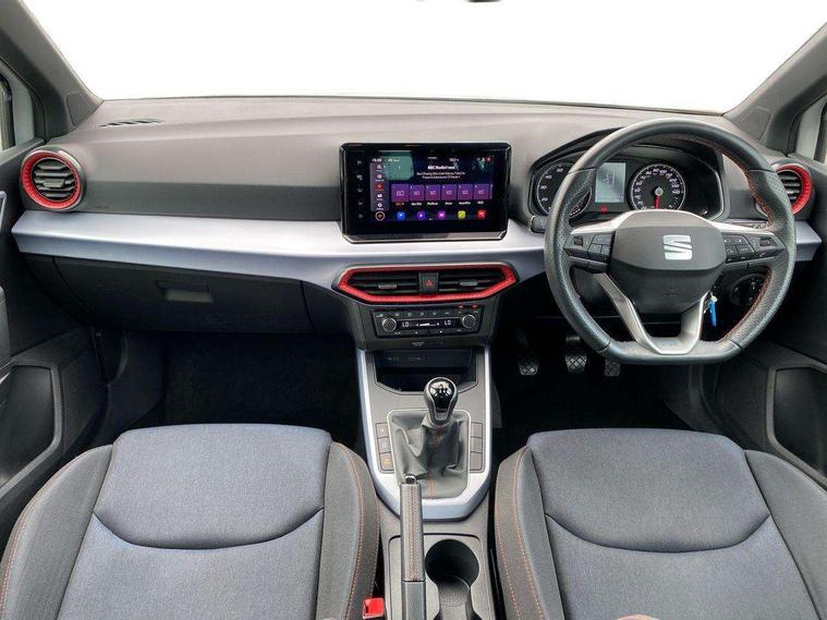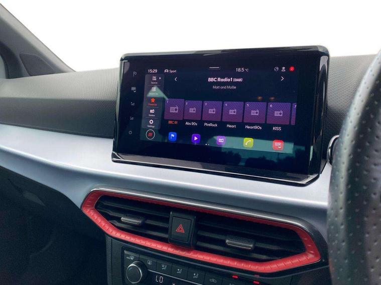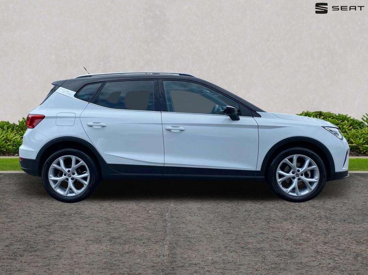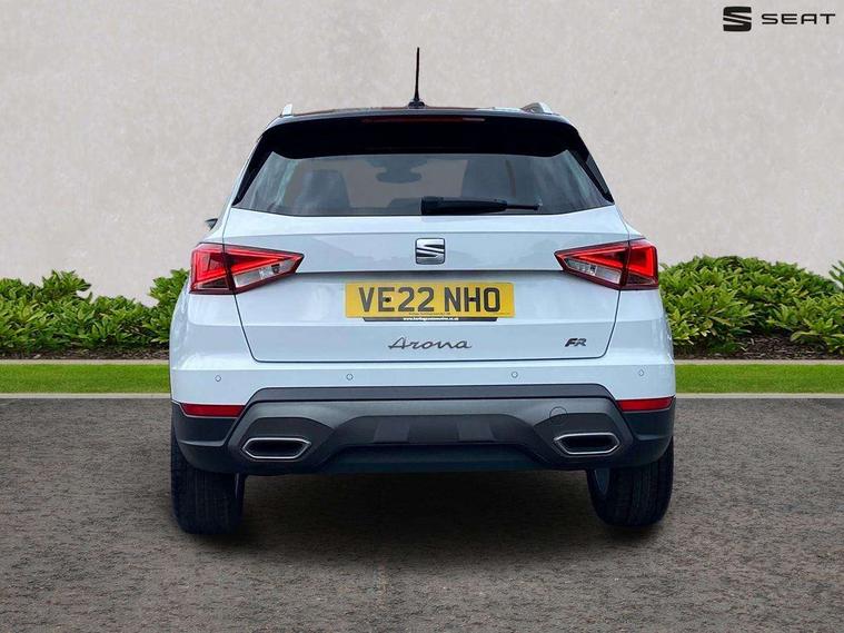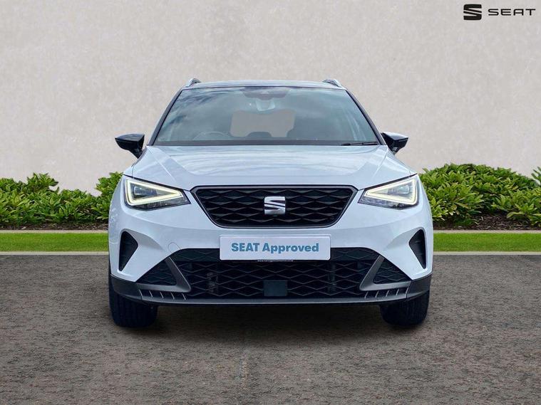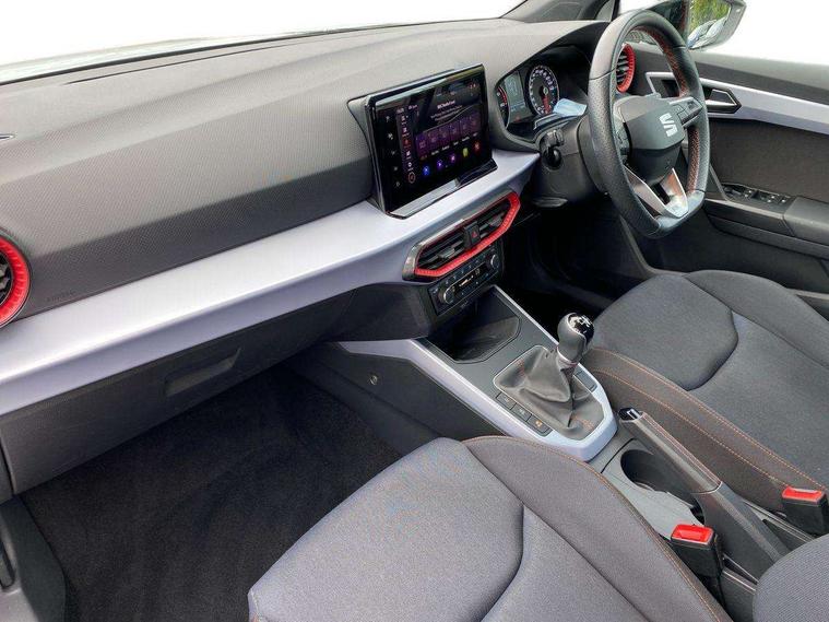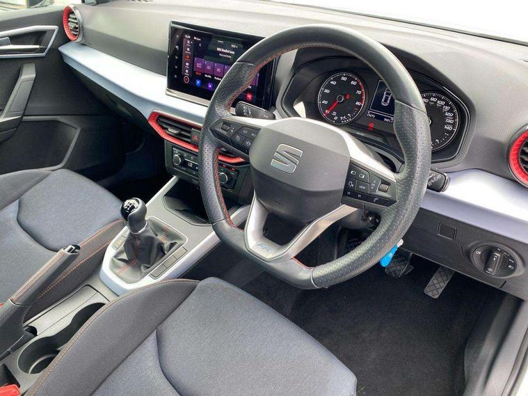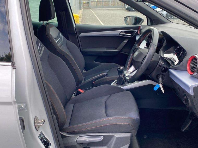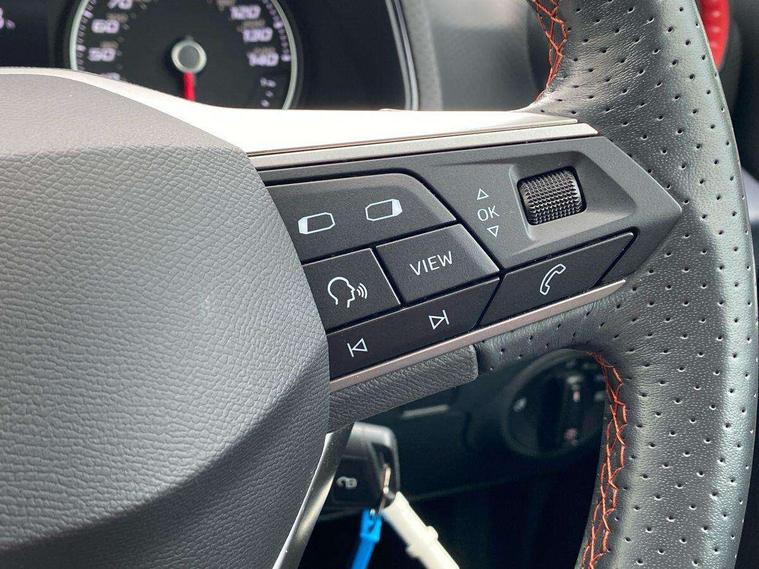 'Lights On' Reminder warning buzzer, 8" Digital cockpit, Digital clock, E-call, Electric speed sensitive power steering, Full Link Smartphone Integration with Mirror Link, Apple Car Play, Google Android Auto with USB Type C cable for Apple and Android compatibility, Lane keeping system, Low fuel warning light, Outside temperature display, Rear parking sensor, RPM counter, Seat connect with safety, service, remote and online, SEAT Drive profile - Four different models normal-sport-eco-individual, steering response, throttle response, Trip computer, Bluetooth interface for hands free and audio streaming, DAB digital radio and AM/FM radio, Steering wheel mounted audio controls, Anti theft roof antenna, Auto dimming interior rear view mirror, Automatic activation of hazard warning lights, Body coloured bumpers, Body coloured door handle inserts, Chrome roof rails and window surrounds, Dark tinted rear windows, Electric front/rear windows, Electrically adjustable, heated and folding door mirrors, Front fog lights with cornering function and rear fog light, FULL LED automatic headlights with dynamic headlight range control, coming and leaving home, LED daytime running lights, LED rear tail lights and licence plate lights, Protective side mouldings, Rain sensing wipers, Rear side wing doors, Rear spoiler, Rear window wash/wipe, Roof colour door mirrors, Third brake light, Twin exhaust pipe styling hidden exhaust pipe, Visible VIN plate, Windshield wiper with intermittent control and potentiometer, 2 cupholders, 3 seat bench in 2nd row, 60/40 split folding rear seat, Aircare filter, Black interior roof, Cloth upholstery, Double boot floor, Driver sunvisor with covered mirror + card holder, Dual zone climate control, Front courtesy light with 2x front and 2x rear reading lights, Front sport seats, Gear shift indicator, Height adjustable front seats, Height/reach adjustable steering column, Illuminated boot, Instrument lighting with brightness control, Interior ambient lighting, Interior light in footwell, central console and door panel, ISOFIX points in outer rear seats with top tether anchorage points, Passenger sunvisor with vanity mirror, Perforated flat bottomed leather steering wheel/gear knob/handbrake with red stitching and FR logo, Single front passenger seat, Two front and three rear height adjustable headrests, Connectivity pack plus - Arona, Interior chrome pack - Arona, 3 point seatbelts on all rear seats, ABS, Active front headrests, Child locks on rear doors, Driver and front passenger airbags with front passenger airbag de activation, front side and curtain airbags, Electronic stability control, Emergency Brake Assist (EBA) and front assist, Front and rear seatbelt reminder, Hill hold control, Multi-Collision braking, Tiredness recognition system, Traction control, Tyre pressure monitoring system, Alarm with back-up horn, Electronic engine immobiliser, Locking wheel bolts, Remote central locking + deadlocks, Tow away protection, Titan black dashboard, 17" Dynamic alloy wheels,