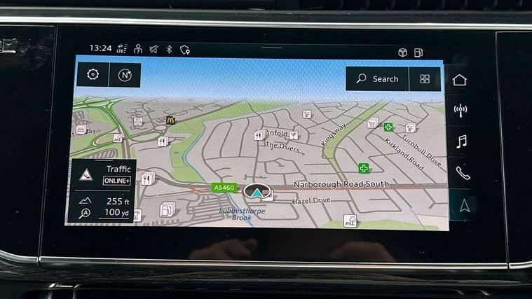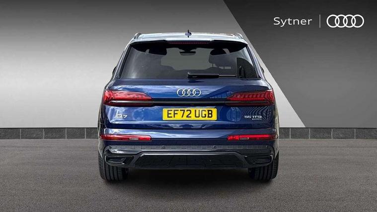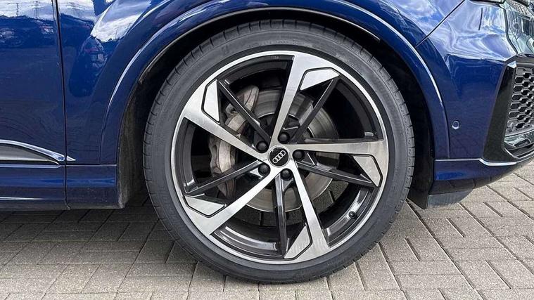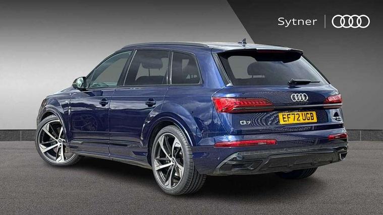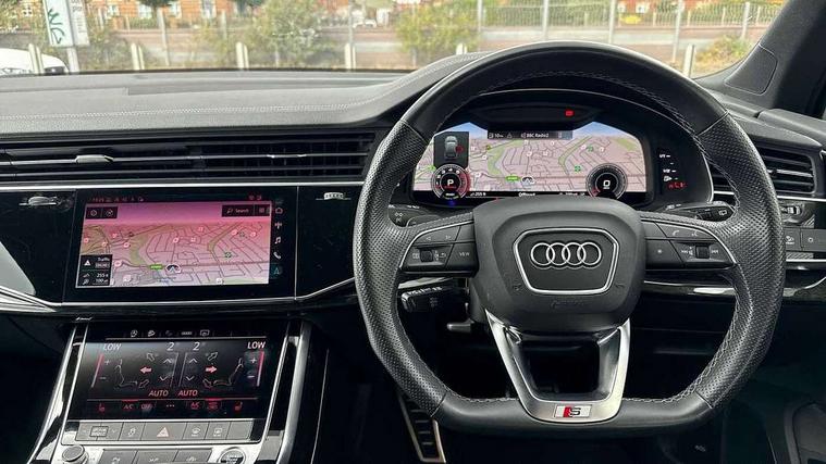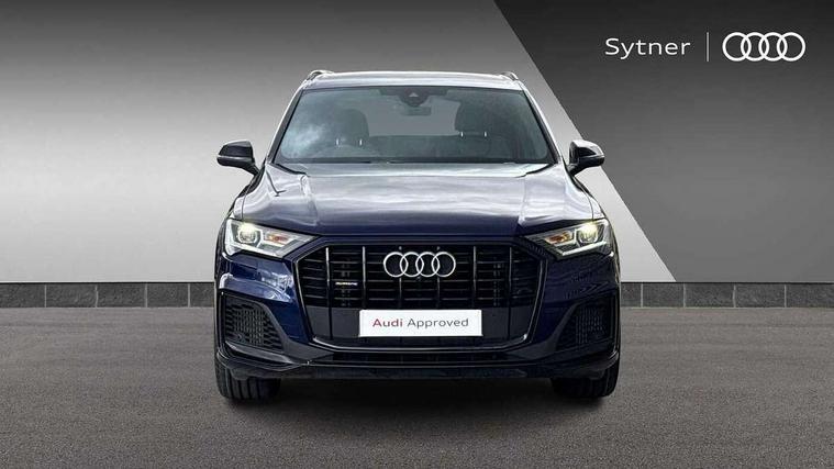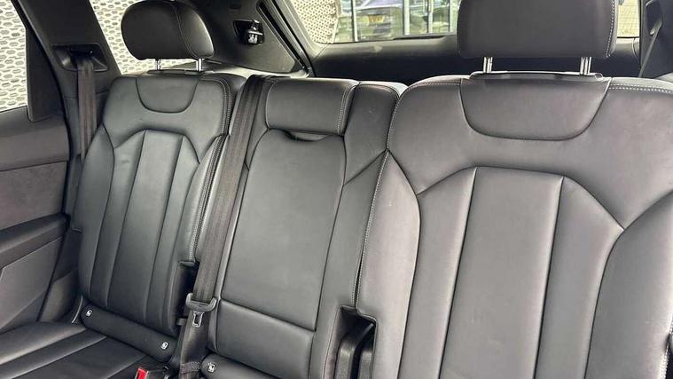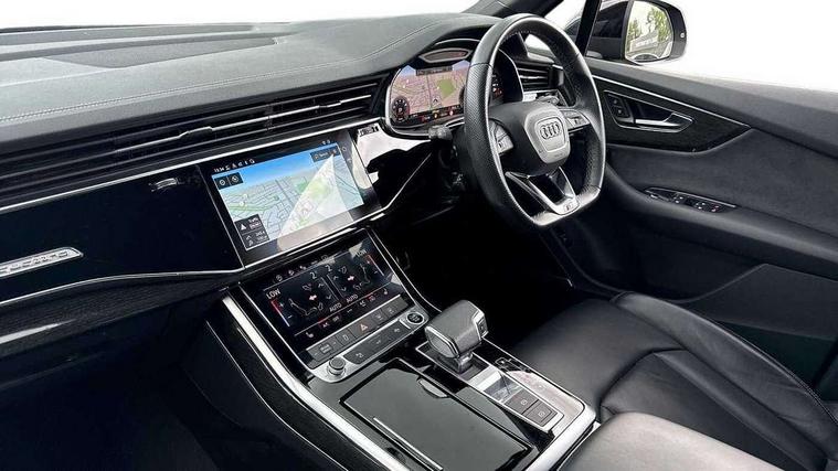 Audi connect safety and service (e-call), Audi connect with Amazon Alexa Integration, Audi drive select (Auto, Comfort, Dynamic, Efficiency, Individual, Off-road and All road), Bluetooth interface, Camera based traffic sign recognition, Electromechanical steering, MMI navigation plus with MMI touch screens includes 10.1" and 8.6" screens with haptic feedback, Natural voice recognition, Parking system plus with 360 degree display (front, rear and side sensors) - acoustic and visual park assist system, Power operated tailgate, Rear view camera, Smartphone interface includes wireless Apple carplay/Android Auto, Start/stop system, 48V Mild hybrid technology, 85 litre fuel tank, Adaptive air sports suspension, Quattro all wheel drive with self locking centre differential, Audi music interface - front 2 USB-C ports with charger and data functions, Audi sound system with 6 channel amplifier, 180 watt amplifying capacity and 10 loudspeakers including subwoofer, DAB digital radio module, 3rd brake light, Audi matrix LED headlights with dynamic front and rear indicators, Auto dimming frameless rear view mirror, Black roof rails, Bumpers in contrast paint scandium grey finish includes door trim and wheel arch trim strips, inlays in door strip contain quattro embossing, Electrically adj heated/folding + automatically dimming exterior mirrors with memory + automatic kerb side function for passenger side exterior mirror, Heat insulating glass in windshield, Integrated LED indications in door mirrors, LED daytime running lights, LED rear tail lights, Privacy glass - dark tinted rear and rear side windows from B-pillar backwards, Rear side wing doors, Rear wiper, 2 seat bench in 3rd row, 3 seat bench in 2nd row, 4 zone deluxe automatic climate control, 7 seat layout with ISOFIX points for the front passenger seat and rear passenger seat, Black cloth headlining, Comfort front centre armrest, Electric adjustable front seat with 4 way lumbar support, driver memory functionality, Folding rear seats, Front head restraints, Front/rear floor mats, Heated front seats, Illuminated door sill trims with S logo, LED interior ambient lighting, Luggage compartment cover, Luggage compartment sill protection in stainless steel, Rear head restraints, Single front passenger seat, Stainless steel pedals, Sunvisors with illuminated vanity mirrors, Titanium black styling pack - Q7/SQ7, 3 point seatbelts on all rear seats, Audi pre sense front, Child locks on rear doors, Driver and front passenger, front side and curtain airbags, Electromechanical parking brake, Electronic Stabilisation Control (ESC) including ABS, ASR and EDL, Extended pedestrian protection measures, Hill hold assist, Seatbelt monitoring, Tyre pressure loss indicator, Warning triangle and first aid kit, Anti theft alarm, Anti-theft wheel bolts and wheel loosening detection, Keyless Go, Remote central locking, Polished oak trim with grey finish inlay, Tool kit, Tyre repair kit,
