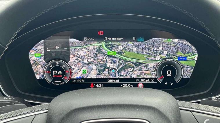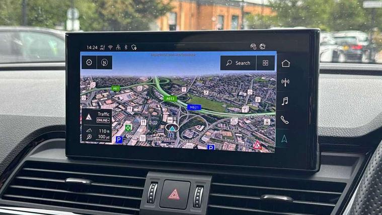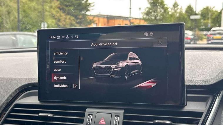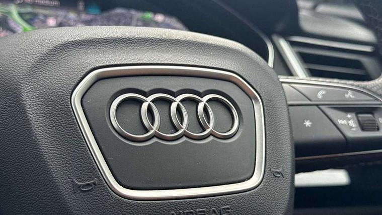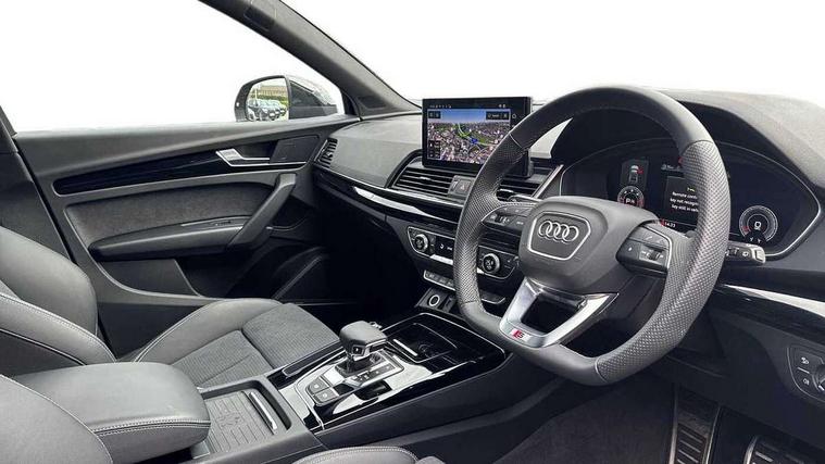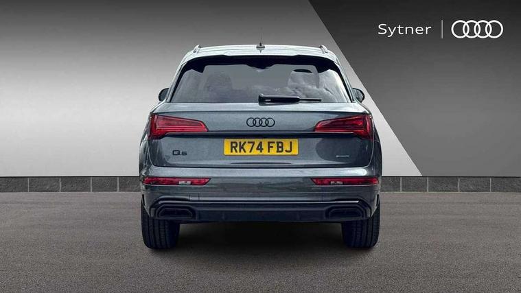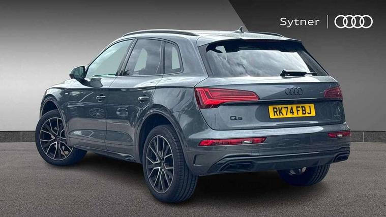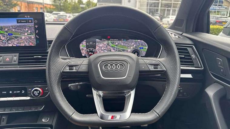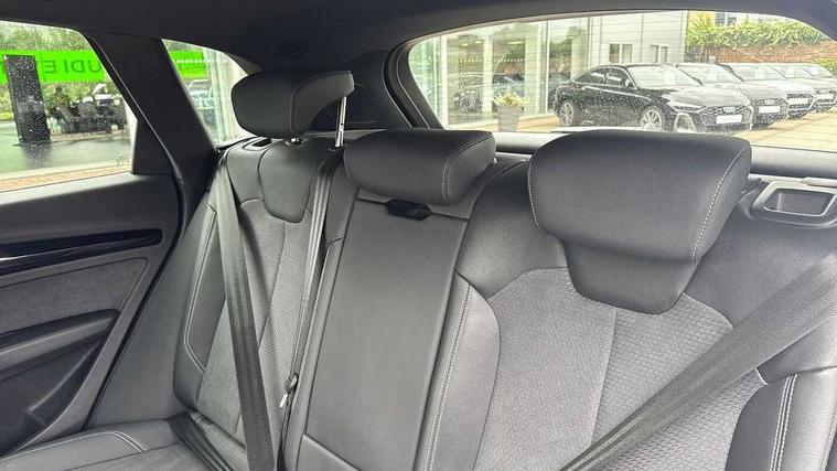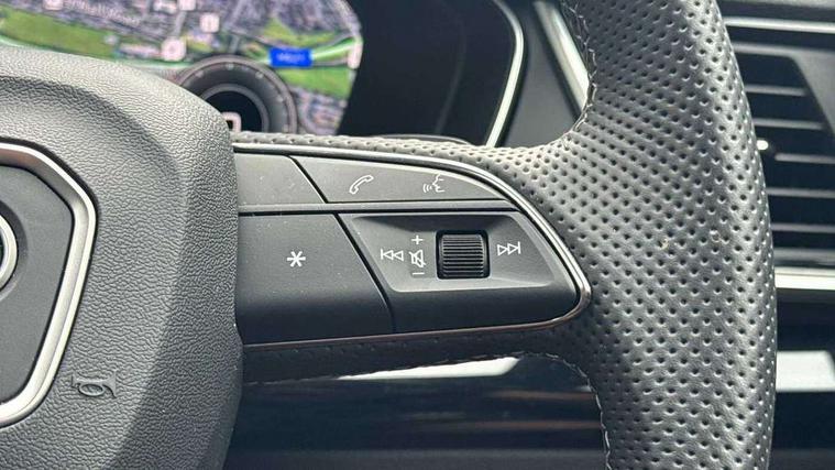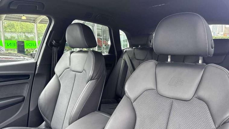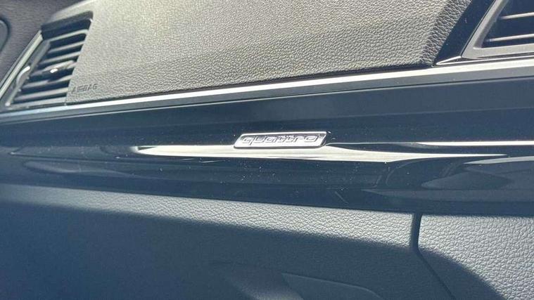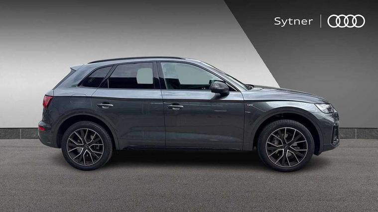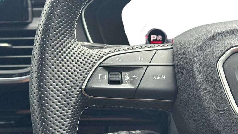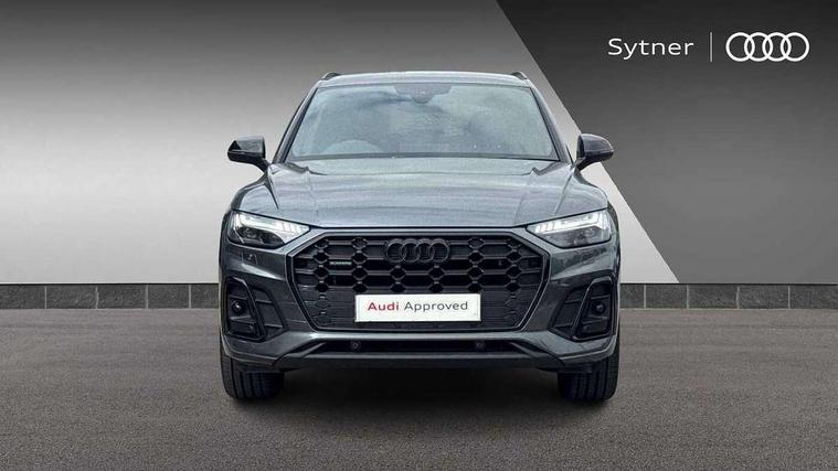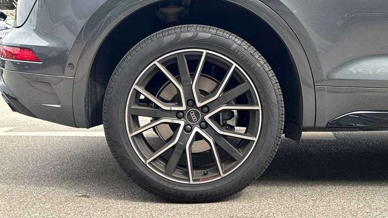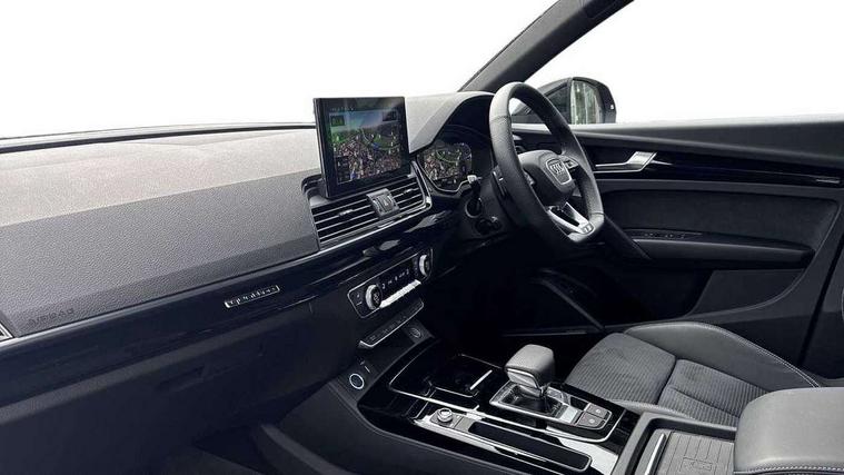 Acoustic front and rear parking sensor, Audi connect safety and service (e-call), Audi drive select, Audi virtual cockpit plus with 12.3" screen and three different layout designs, Audi wireless smartphone interface, Automatic start-stop system with coasting functionality and efficiency programme, Bluetooth interface, Camera based traffic sign recognition, Electro - mechanical power assisted steering, Lane departure warning, MMI navigation plus with 10.1" touch screen, Power tailgate, Reversing camera, Service interval indicator, Voice control system with Audi hotword activation "Hey Audi", Diesel particulate filter, Quattro on demand, S line sports suspension, 2 x USB charging port with aux input socket, 8 loudspeakers, DAB Digital radio, Acoustic windscreen, Auto dimming door mirrors, Auto dimming frameless rear view mirror, Automatic headlight adjustment, Automatic headlights and windscreen wipers, Black roof rails, Black styling with black rings, Body colour bumpers, Body colour rear diffuser with matt aluminium silver surrounds, Body colour underbody protection, Chrome plated exhaust trims, Daytime running lights, Door sills in Selenite silver, Electric adjustable/heated/folding door mirrors, Front air inlet surrounds in aluminium, Front and rear electric windows, Front radiator grille in honeycomb design, LED 3rd brake light, LED headlights and LED tail lights, Loading edge protection in stainless steel, Lower bumpers painted in contrast Manhattan grey, Rear chrome trim strip below lights, Rear privacy glass and rear side windows, Rear side wing doors, Rear wiper, Roof bars, S Line badges on the front wing panels, S Line front and rear bumpers, S Line rear spoiler, S Line side skirts, 3 rear headrests, Black cloth headlining, Comfort front centre armrest, Contrast stitching on seats, steering wheel and gear lever gaiter, Deluxe 3 zone electronic climate control, Front head restraints, Front sport seats with S embossed logo, Front/rear floor mats, Gear lever in black leather, Heated front seats, Height/reach adjustable steering column, Illuminated door sill trims with S logo, Luggage compartment cover, Manual seat adjustment with 4-way electric lumbar support, Single front passenger seat, Stainless steel pedals, Sunvisors with vanity mirrors, Top surface of the rear centre armrest in artificial leather, High gloss pack - Q5, LED interior light pack - Q5, 3 point seatbelts on all seats, 6 airbags - Driver, front passenger, curtain and side airbags, Attention and drowsiness assist, Electrically operated child locks on rear doors, Electromechanical parking brake, Electronic stabilisation control including ABS, ASR and EDL, First aid kit with warning triangle and vests, Front passenger airbag deactivation, Hill descent control, Hill hold assist, ISOFIX child seat mounting for front passenger seat and ISOFIX child seat mounting with Top Tether for outer rear seats, Multi collision brake assist, Pop-up bonnet for pedestrian protection, Pre sense city, Seatbelt monitoring, Tyre pressure warning, Anti theft alarm, Anti-theft wheel bolts, Remote central locking, Remote control key with SAFELOCK and keyless go, Air vents inserts and centre console in gloss black, Tool kit, Tyre repair kit,