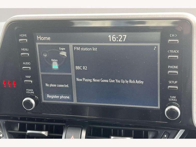 4.2" coloured TFT screen for multi-information display, Adaptive cruise control, Apple car play and Android auto, Bluetooth connectivity, E-call, Electric power steering, Hybrid system indicator, Lane departure alert with steering control, Lane trace assist, Push button start, Push button tailgate release, Remote boot door release in cabin, Remote boot door release in key, Reversing camera, Road sign assist - RSA, Smart voice assist, Trip computer, Voice recognition, Vehicle Stability Control (VSC), 6 speakers, AM/FM radio, DAB Radio (Digital Audio Broadcasting), Toyota touch 2 multimedia system with 8" display, USB connector, Wi-fi connectivity, Anti-jam protection on power windows, Auto high beam, Auto up and down function on all power windows, Automatic headlights, Automatic headlights cut-off, Black and body coloured rear bumper, Black lower front grille, Black upper front grille, Body colour door handles, Body colour door mirrors, Body colour front spoiler lip, Body coloured front bumper, Boot door release with push button, Electric heated door mirrors, Follow me home headlights, Front and rear power windows, Front fog lights, Headlight cut off reminder, Honeycomb lower front grille, LED daytime running lights, LED High mounted stop light, LED rear brake lights, LED rear combination lights, Manual headlight levelling, Manually retractable door mirrors, Noise reduction layer on front windows and windscreen, Power adjustable door mirrors, Rear side wing doors, Rear spoiler, Rear tailgate, Rear window defogger, Rear window wiper, Reflective LED headlights, Shark fin antenna, UV-filter on driver and passenger windows, UV-filter on rear windows, Variable front intermittent wipers, 12v power outlet - front, 3 rear headrests, 3 seat bench in 2nd row, 3 spoke leather steering wheel, 60/40 split folding 2nd row rear seats, Adjustable rear headrests, Adjustable speed limiter switch on steering wheel, Assist grips front and centre pillar, Audio and telephone switches on steering wheel, Black front door assist grips, Boot light, Chrome interior door handles, Cloth upholstery, Driver and front passenger personal light, Driver and front passenger Whiplash Injury Lessening seats, Dual zone automatic air conditioning, Floor mats, Front cupholders, Front head restraints, Front sports seats, Glovebox with internal light, Hard tonneau cover, Hooks for luggage holding net, Humidifying Nanoe air purifier, Illuminated entry system, Isofix attachments on outer rear seats, Leather gearshift, Light on driver sun visor, Light on passenger sun visor, Manual telescopic steering wheel, Manual tilt steering wheel, Manually adjustable lumbar support on driver seat, Manually height adjustable driver seat, Manually height adjustable front passenger seat, Manually reclining driver seat, Manually reclining front passenger seat, Manually sliding driver seat, Manually sliding front passenger seat, Microphone on front personal light, Mirror on driver sun visor, Mirror on passenger sun visor, Multimedia switches on steering wheel, Pollen filter, Shopping bag hooks, Single front passenger seat, Slow opening on lower glovebox, Voice recognition switch on steering wheel, 16 Disk front wheel brake, 3x3 point rear seatbelts, ABS+EBD+Brake assist, Electronic parking brake, Front and rear seatbelt reminder, Front passenger airbag on/off switch, Hill start assist control (HAC), Pre collision system with pedestrian detection, Pre-tensioners and force limiters, Rear door child safety locks, SRS Airbags - Driver + Front passenger, front side, front and rear curtain and driver's knee airbags, Toyota safety sense, Tyre pressure monitoring system, Tyre pressure warning system, Acoustic vehicle alert system (AVAS), Glass-breaking alarm sensors, Immobiliser, Intrusion alarm, Intrusion sensor, Motion sensor alarm, Power door locks, Power passenger window lock, Remote central locking, Black lower dashboard, Black upper dashboard, Grey deco line on upper dashboard, Matte black centre console, Tyre repair kit,