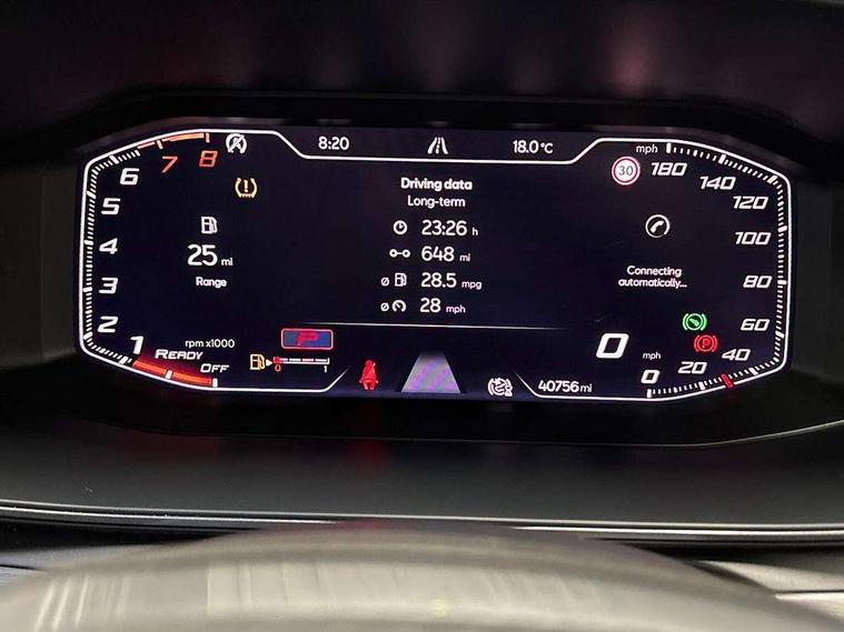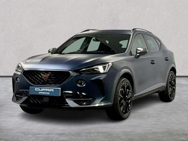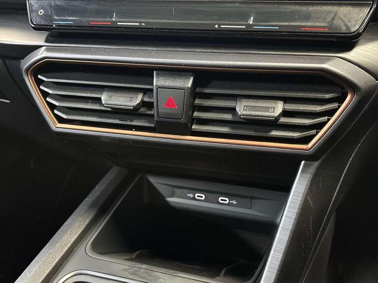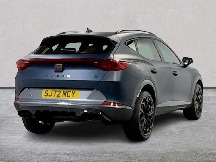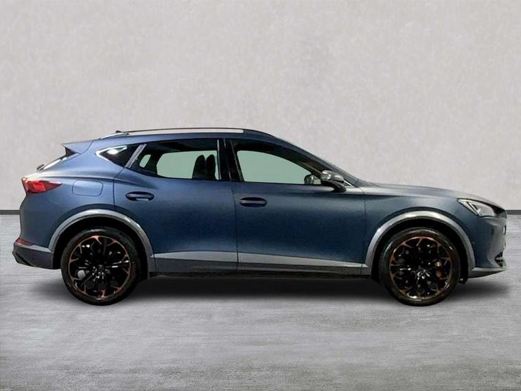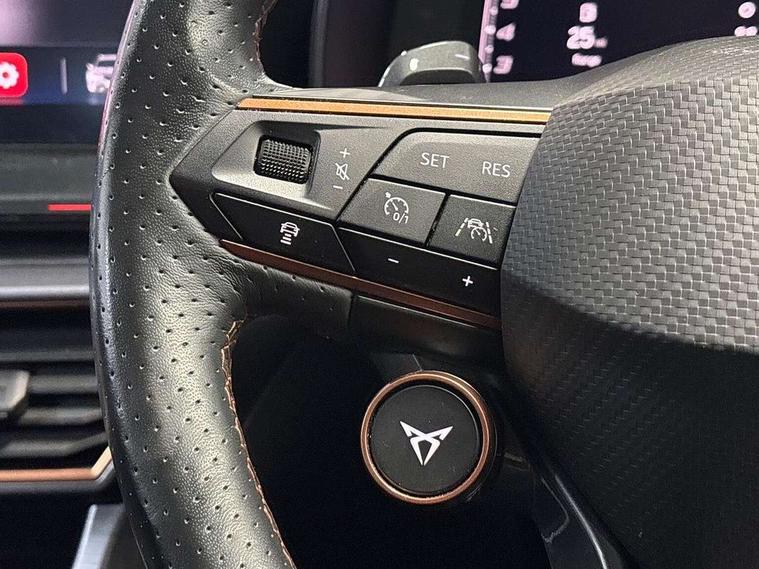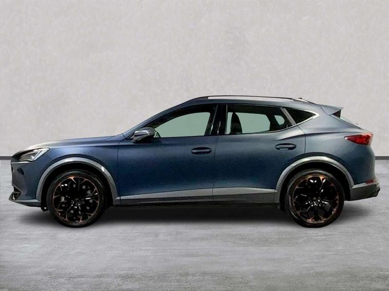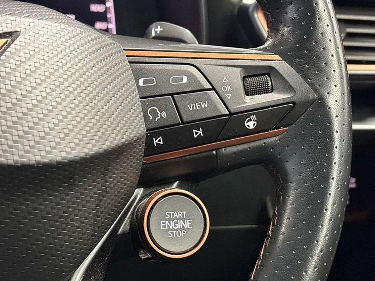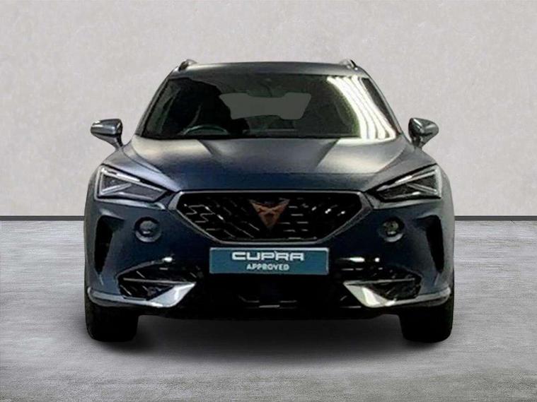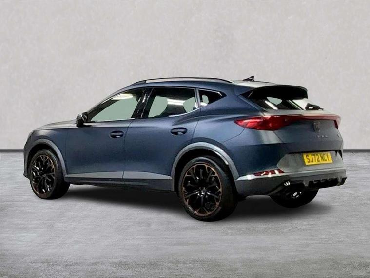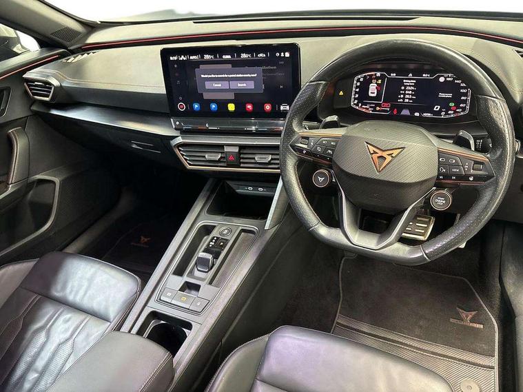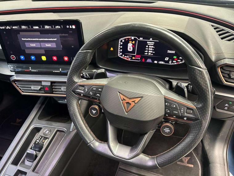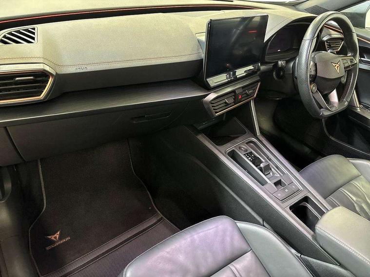 Digital cockpit and configurable dashboard, Driver alert system, Dynamic chassis control with driving profile selection (Comfort, Sport, CUPRA, Individual), E-call, Forward collision warning with automatic braking, Lane assist, Navigation system with 12'' Touchscreen Display, Park assist (inc front/rear parking sensors), Predictive adaptive cruise control with speed limiter, Rear view camera, RPM, trip computer, outside temp gauge, instrument light brightness, low fuel warning light, lights on reminder, gearshift indicator, Service interval indicator, Speed sensitive power steering, Start/stop system with regenerative braking, Virtual pedal and electric tailgate, Voice control system, Wireless apple carplay, Wireless phone charger, Electronic locking differential and dynamic traction support, Sports suspension with front shock absoption, 2 front and 2 rear USB type C sockets, Auxiliary input socket, DAB radio, Auto dimming rear view mirror, Body colour door handles, Body coloured bumpers, Dark grey wing mirror, Daytime running light with automatic headlight control and coming home feature, Dynamic headlight range control, Electric front/rear windows, Electrically adjustable heated and folding door mirrors with memory function, Front fog lamps with cornering function, Gloss black roof rails and window surrounds, LED Taillights with dynamic indicator, Matrix LED headlights, Rain sensing wipers, Rear diffuser with twin exhaust pipe on each side, Rear side wing doors, Rear wash/wipe, Sports bumpers, Third brake light, Tinted rear windows, VZ logo rear badging, Welcome lights, 12v power supply in centre console, 12V socket, 12v socket in loadspace, 2 front and 2 rear reading lights, 230V socket, 3 seat bench in 2nd row, 60/40 split rear bench seat with armrest and mechanical seat release, Black headlining, Cupra sports pedals, Dust/pollen filter, Front and rear head restraints, Front centre armrest, Height/reach adjust steering wheel, Illuminated interior front door sills, Illuminated sunvisor with mirror, Isofix, Leather heated multi-function sports steering wheel with start stop, CUPRA mode button and gear shift paddles, Luggage tie-down hooks, Single front passenger seat, Three zone climate control with control panel in rear, Variable luggage/load compartment floor, Wraparound lighting, Genuine Nappa leather Pack - Cupra, Safety and driving pack (XL) - Formentor, 3 point seatbelts on all rear seats, ABS, Brake control system - ESC and brake booster, Brembo brakes, Child proof door locks, Driver and front passenger airbags with front passenger airbag de-activation, Electronic parking brake, Front and rear disc brakes, Front side curtain airbags, Hill hold control, Seat belt reminder for front and rear seats, Tyre pressure monitoring system, Anti theft alarm system, Keyless entry and start system (KESSY), Locking wheel bolts, Copper and aluminium interior detailing, 19" 'Exclusive' copper and black alloy wheels, Tyre repair kit,