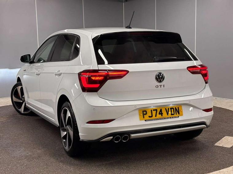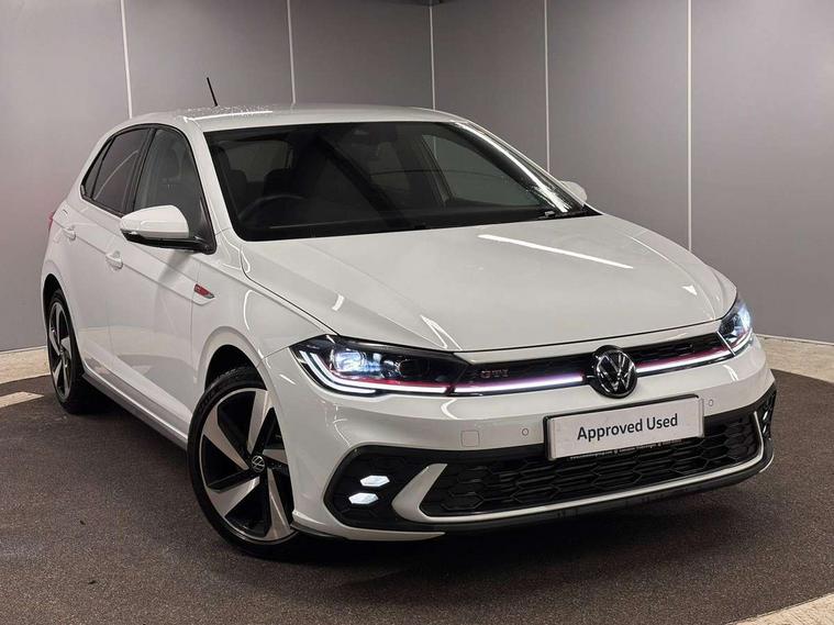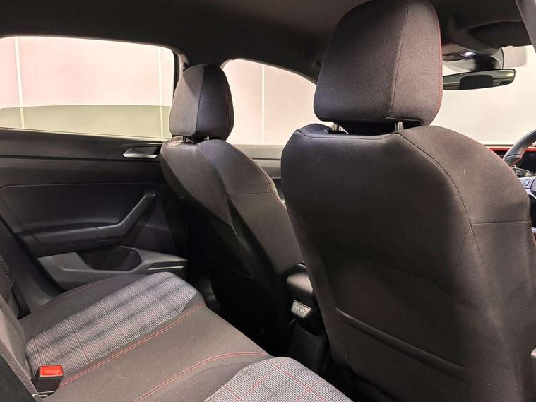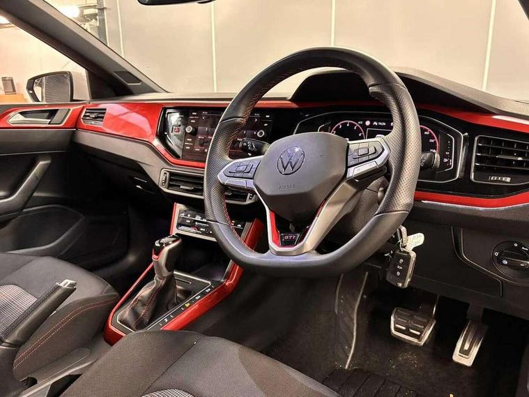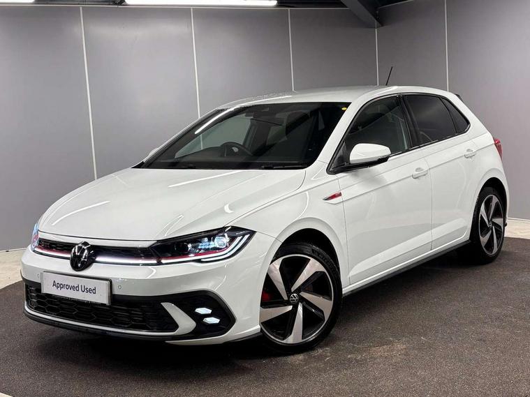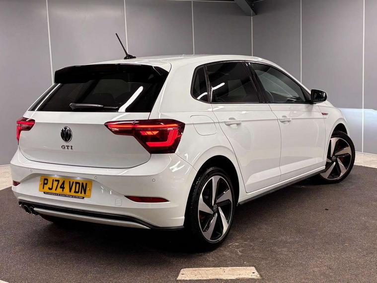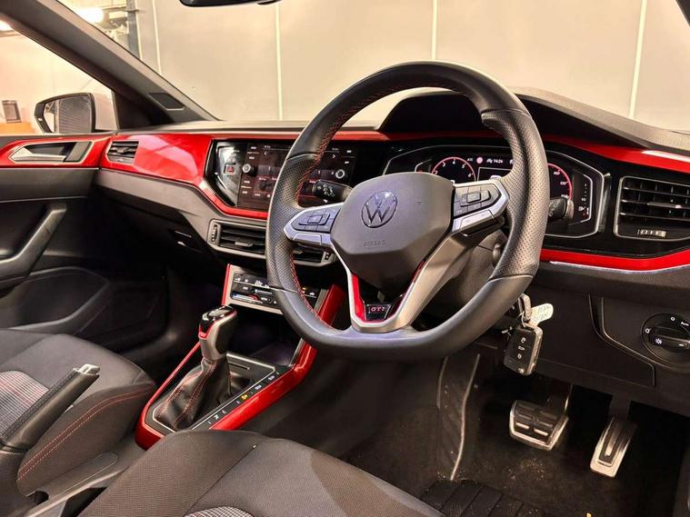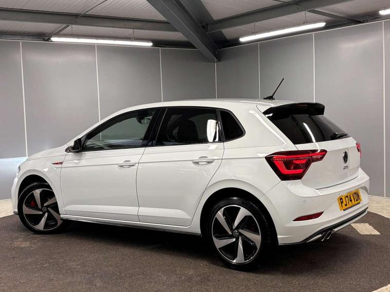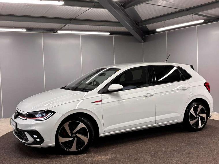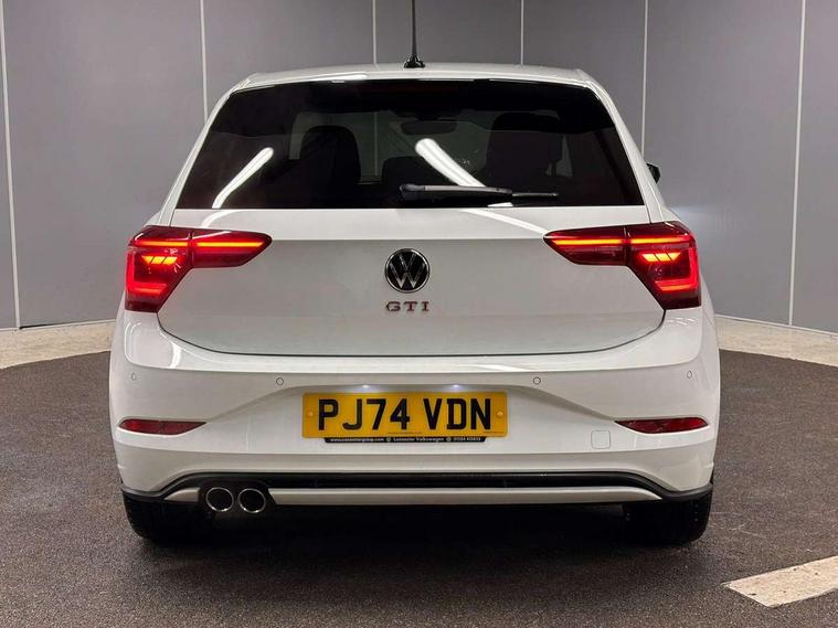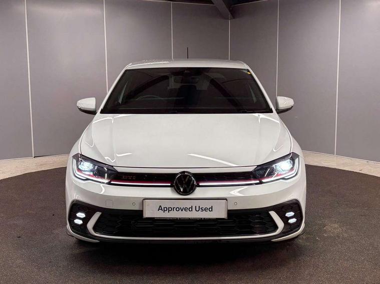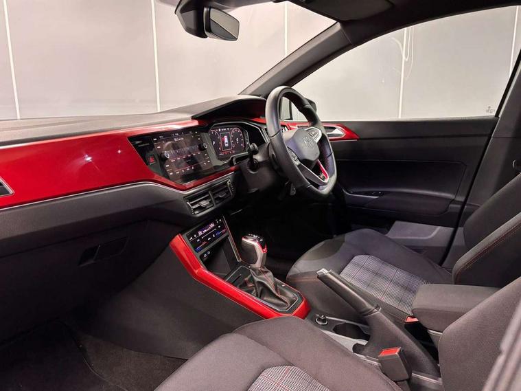 Adaptive cruise control with follow-to-stop and speed limiter, Advanced driver attention and drowsiness monitor, Bluetooth mobile phone interface, Digital Cockpit Pro with 10.25" Display, Dynamic road sign display, Eco mode, Emergency call service, Multifunction camera, Power assisted speed sensitive steering, Preparation for We connect and We connect plus, Speedo and rev counter, electronic odometer, trip, service interval display and fuel gauge, Travel Assist - Lane keeping system and traffic jam assist, Travel assist including emergency assist, Trip computer, Warning signal and warning light for front and rear seatbelts not fastened, Washer fluid level indicator, Wireless app connect, Adaptive chassis control, Front wheel drive, Heavy duty rear axle, Rear shock absorpion sports version, Sports select suspension lowered by 15mm, Start-stop system with battery regeneration (recuperation - energy recovery during braking), DAB Digital radio, Diversity antenna for FM reception, Front and rear 6 speakers, Body colour bumpers, Body colour door handles, Electric front windows, Front scuff plates in aluminium with GTI logo, Heat insulating glass windscreen, Power folding adjustable/heated exterior mirrors and front passenger exterior mirror lowering function, Rain sensor, Rear electric windows, Rear fog light, Rear side wing doors, Rear windscreen washer and wiper with interval delay, Sport bumpers with air intakes with honeycomb structure, Third brake light, Twin chrome exhaust tailpipes, 12V power socket in centre console, 2 USB-C ports in the front, 2 USB-C charging sockets on the center console in the rear, 3 rear head restraints, 60/40 split folding rear seat and rear seat bench not split, Air care climatronic air conditoning system with active combination filter and 2-zone temperature control, Black roof lining, Carpet mats, front and rear, Chrome plated radiator grille inserts, air vent surrounds and light switch surrounds, Door and side trim panel, Driver and front passenger seat height adjustment, Driver/passenger sunvisors with illuminated vanity mirrors, Front centre armrest, Front footwell illumination, Front seat backrest storage pockets, GTI sports gearshift knob in aluminium leather, Handbrake lever handle in leather, Headliner in recycled material, Isofix child seat preparation easy-fit (for two outer rear seats, and front passenger seat) compatible with I-size, LED interior light with switch off delay and dimmer, 2 reading lights front and rear, Luggage compartment cover, Luggage compartment floor, Luggage compartment lighting, Lumbar adjustment for front seats, Single front passenger seat, Stainless steel pedals, Standard pedal cluster, Three spoke leather wrapped multifunction sports steering wheel with shifting paddles, IQ LED matrix headlights pack - Polo, Light and sight pack - Polo GTI, 3 point height adj front seatbelts + pretensioners, 3x3 point rear seatbelts, ABS, Driver and front passenger airbag with front passenger airbag deactivation, Drivers and front passengers safety optimised head restraints, ESC (Electronic stability control) + EDL (Electronic Differntial lock) and ASR (Traction control), Extended and predictive pedestrian/ cyclist protection, Front and rear disc brakes with red brake calipers, Front curtain and side airbags with center airbag, Hill hold control, Manual child lock in rear doors, Two tone horn, Tyre pressure loss indicator, Alarm with interior protection, Anti-theft alarm system with interior monitoring, backup horn, and towing protection, Anti-theft wheel bolts, Electronic engine immobiliser, Chrome applications on rotary light, mirror adjustment, window regulator switches, outlet with frame in black, Low rolling resistance tyres,