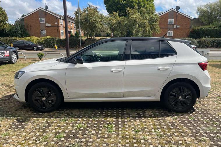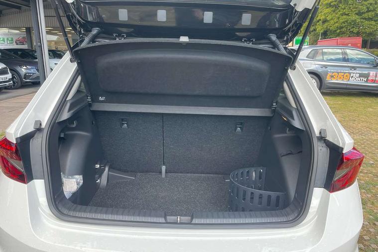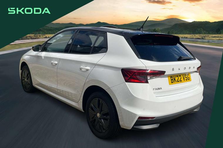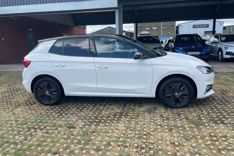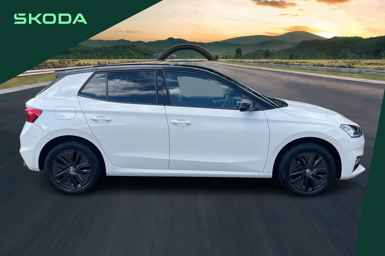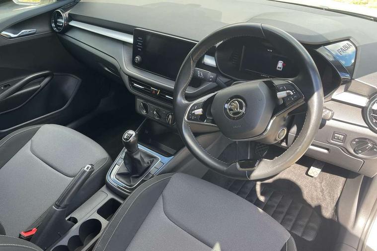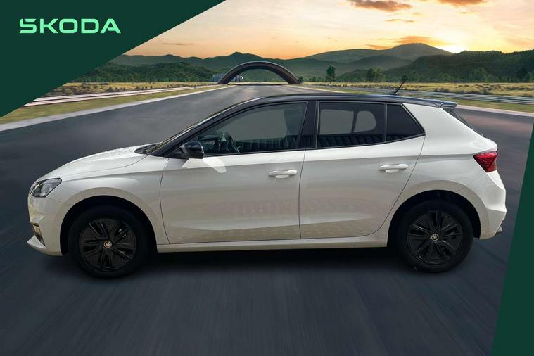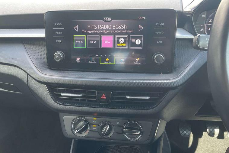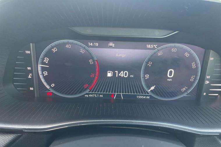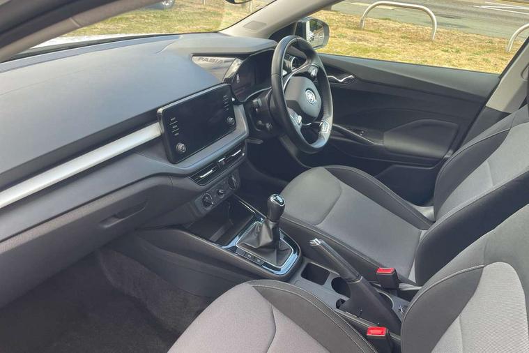 Bluetooth connection, Driver alert system - DAS, Electromechanical power steering, Exterior temperature gauge, Lane assist including road edge detection, Service interval indicator, Virtual cockpit with 10.25" colour display, 2x USB-C in the front (for data transmission and charging), 6 Speakers (4 in front and 2 in rear), Auxiliary socket for external MP3 player, Bolero radio with 8" colour display, DAB digital radio reception, Basic rear lights, Body coloured bumpers, Dimming rear view mirror with black frame, Door mirror integrated indicators, Electrically adjustable and heated door mirrors, Electrically adjustable front windows with function auto up/down, Front window wiper intermittent control, Headlight range control - Automatic, Ice scraper in fuel cap, LED daytime running lights with coming and leaving home feature, Mechanical adjustable rear windows, Privacy glass, Rear LED fog light, Rear side wing doors, Rear window wiper with washing nozzles, Roof mounted spoiler, SKODA tailgate lettering in chrome, Third brake light, 3 rear headrests, Backrest split and folding, Central console with fixed cup holder and storage box, Chrome handbrake release button, Fabric upholstery, Gearshift knob/handle in leather, Grain satin black interior door handles, Hand brake lever handle in leather, Height adjustable front headrests, Height adjustable steering wheel, ISOFIX and TopTether anchorage points to the outer rear seats, ISOFIX and TopTether on the front passenger seat, Luggage compartment lighting, Pollen filter, Rear seat bench unsplit, Single front passenger seat, Storm grey headlining, Sun visors with mirror and airbag label on passenger side, Ticket holder, Umbrella in drivers door, 3-point height adjustable front seats belts with pretensioner and force limiter, Automatic warning lights in case of crash, Driver and passengers airbag with switch off function, e-Call+, ESC including ABS, MSR, ASR, EDS, HBA and XDS, Front and rear seat belt warning, FRONT ASSIST (AEB City and AEB Inter Urban), Front side airbags, Head airbags, One tone horn, Pedestrian protection, Three rear 3-points safety seat belts with pretensioner and force limiter including stop function for outer rear seat belts, Tyre pressure monitoring system, Anti-theft alarm system including immobiliser, interior monitoring, backup horn, and towing protection, Anodized cross line upper decorative trim, Colour Edition air vents, Grain satin black central console cover, Grain satin black lower decorative trim, Satin black door and side trim panel in front, Anti-theft wheel bolts protection, Super-low rolling resistance tyres,