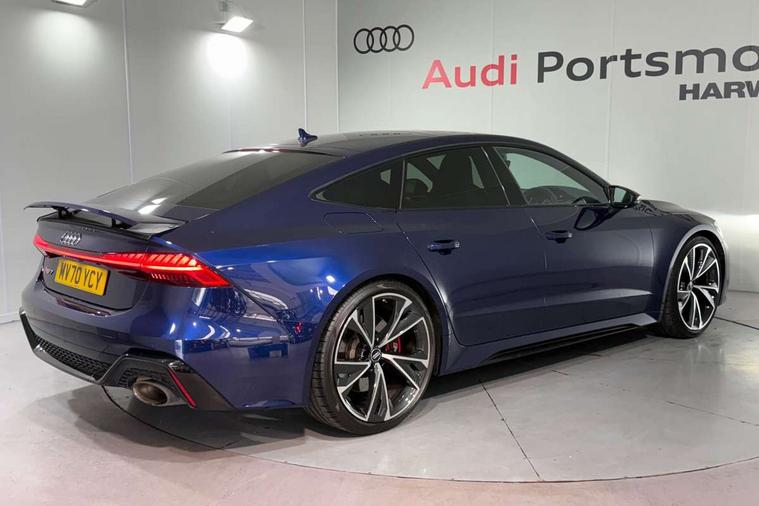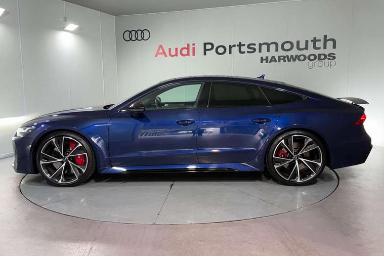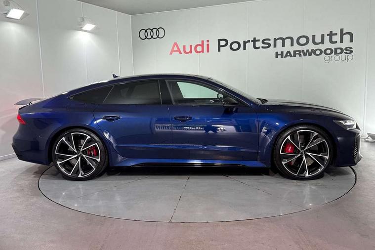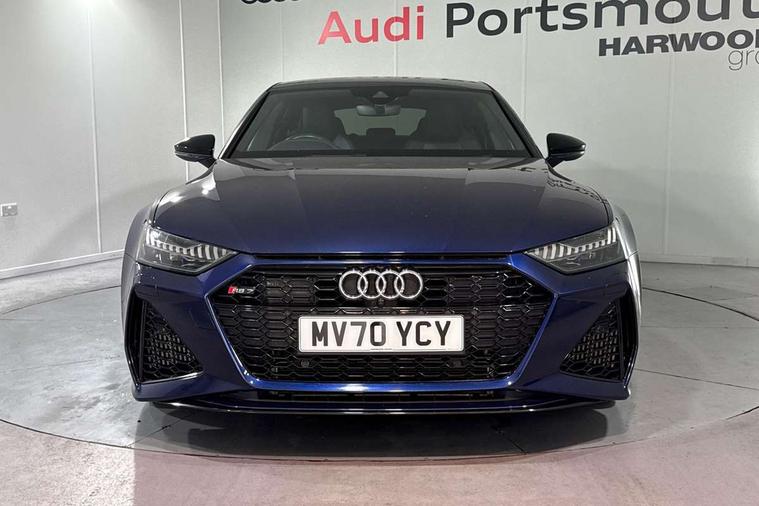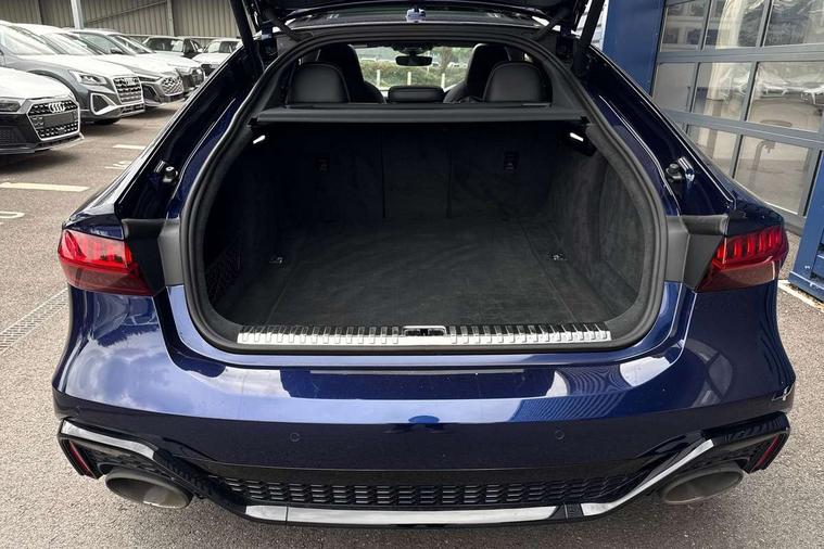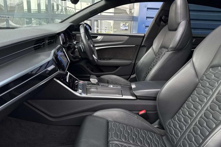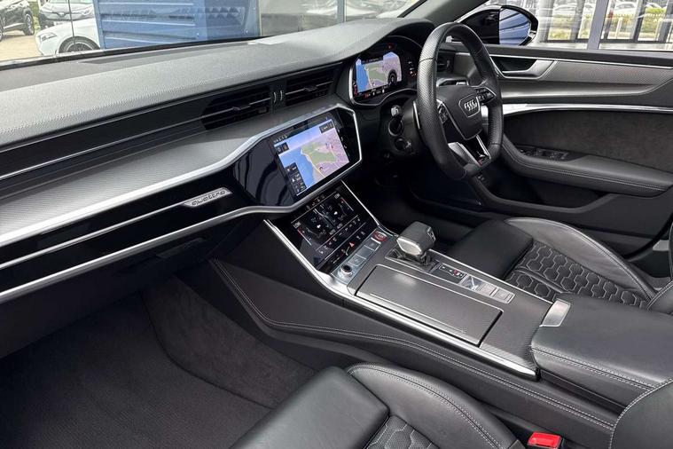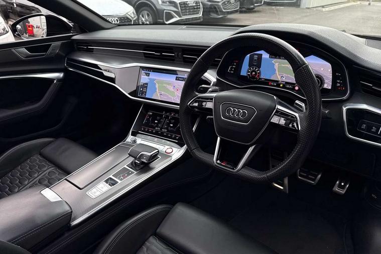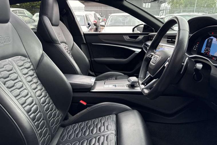 Audi connect safety and service (e-call), Audi drive select with efficiency, Audi parking system plus with front and rear sensors, Audi phone box with wireless charging, Audi smartphone interface, Audi Virtual Cockpit with RS specific design and 12.3" display, Automatic start/stop system, Bluetooth interface, Dynamic all wheel steering, Electro-mechanical PAS, Fatigue detection system, Lane departure warning system, MMI navigation with MMI touch + twin touch screens 10.1" and 8.6" with haptic and acoustic feedback, Operating buttons in black, glass look with haptic feedback including extended aluminium look, Power operated tailgate, Rear view camera, Service indicator, Voice control system, 73 litre fuel tank, Quattro sports differential, Audi music interface, Audi sound system, Auxiliary input socket, DAB digital radio module, USB/iPod connection, Aluminium exterior mirror housings, Electrically folding, adjustable and heated door mirrors with integrated LED side indicators and kerb view function for passenger side, Frameless auto dimming interior rear view mirror, Front and rear electric windows, Front and rear wheel arch extensions, Front spoiler, front side flaps and rear diffuser in Matt aluminium, HD Matrix LED headlights with Audi laser light with dynamic light design and dynamic turn signal, Headlight washers, Illuminated door sill trims with RS lettering, LED rear combination lamps with dynamic light design and dynamic turn signal, Matt aluminium window trims, Privacy glass with rear/side windows and acoustic glazing side windows, Radiator grille in honeycomb structure, large front air inlets and rear diffuser in gloss black, Rain and light sensors, Rear spoiler (Electrically extendable depending on speed), RS front bumper with air inlets on both side, Towbar preparation, 12V power points in front + rear centre consoles, 3 Spoke flat bottom with contrast stitching, multi-function leather steering wheels with shift paddles, RS mode button and RS emblem, 4 zone deluxe automatic climate control, 4-way electric lumbar support, Aluminium gear shift paddles, Audi Sport logo projection (Audi Beam) in front and rear, Black cloth headlining, Electric adjustable steering column, Electrically adjustable front seats - driver seat with memory, Front and rear head restraints, Front centre armrest, Front seat ventilation, Front/rear floor mats, Heated front seats, ISOFIX child seat mounting and Top Tether with front passenger airbag deactivation, Jack and tool kit, RS sports seats, Stainless steel footrest and pedals, Valcona leather upholstery with perforated honeycomb and RS lettering, Air quality package - RS7, Extended LED Interior multi coloured light pack - RS7, Matte aluminium exterior styling pack - RS7, Storage pack - RS7, 3 point seatbelts on all rear seats, ABS, Airbags - Front side, front and rear including head, ASR traction control, Audi pre-sense front, Direct tyre pressure monitoring system, EDL, Electromechanical parking brake, Electronic stability control, ESP, Extended pedestrian protection measures, High performance braking system, Hill hold assist, Warning triangle and first aid kit, Anti theft alarm with tow away protection, Keyless Go, Tyre mobility system,