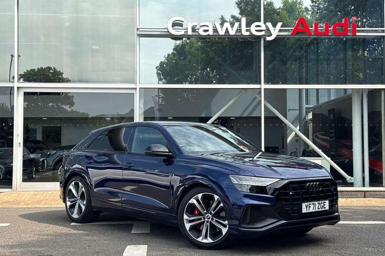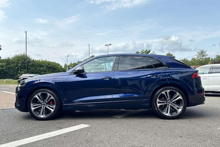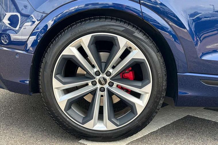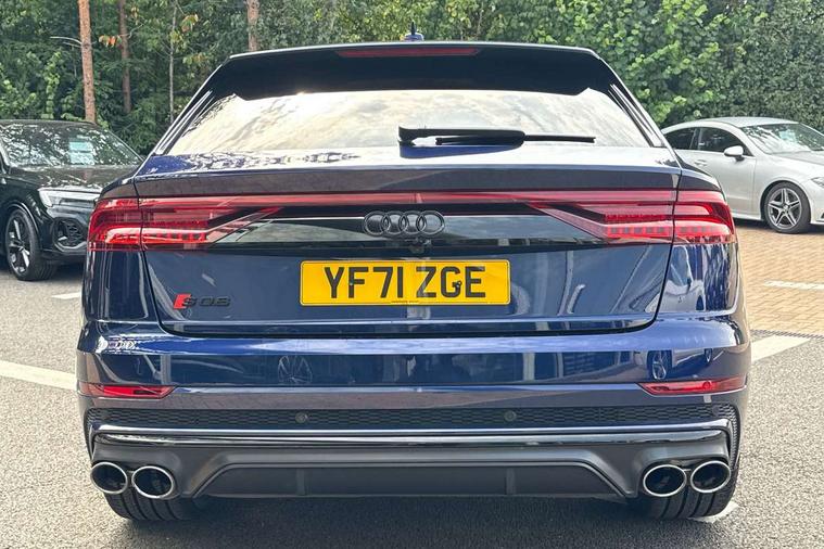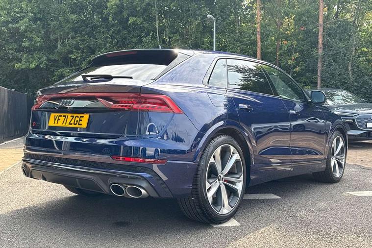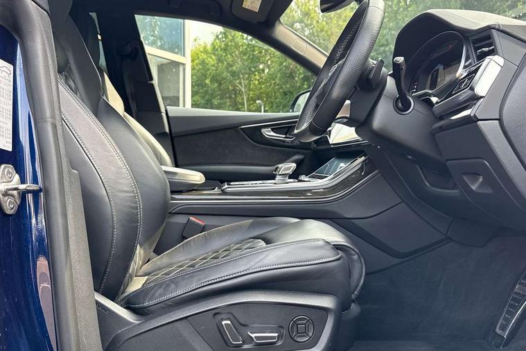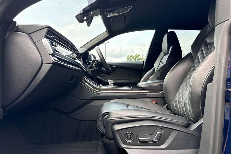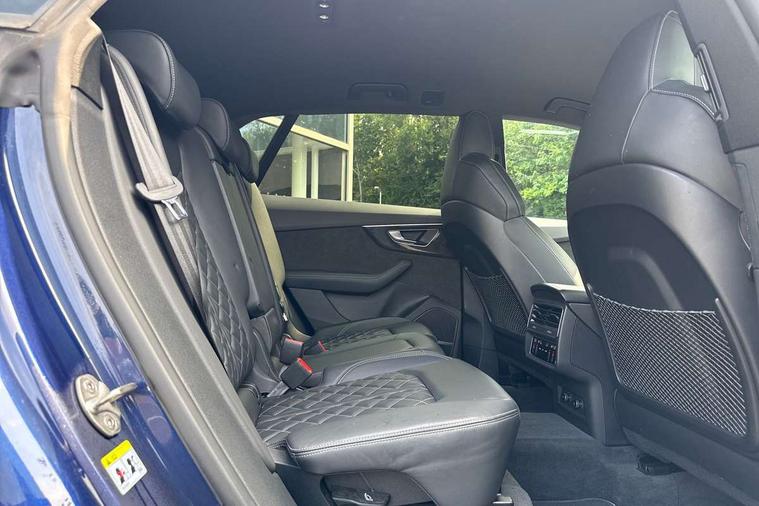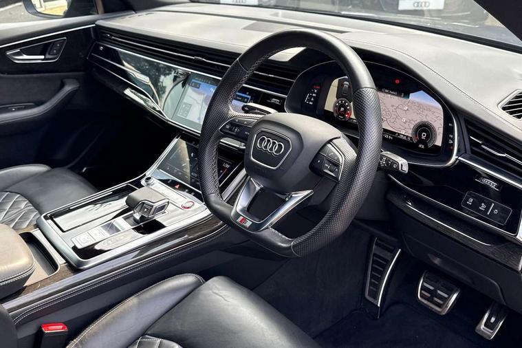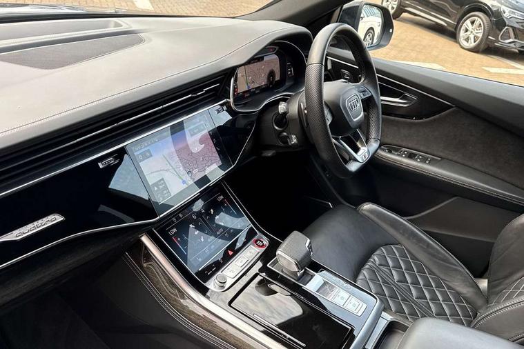 10.1" and 8.6" Dual colour touchscreens, All wheel steering, Audi connect safety and service (e-call), Audi connect with Amazon Alexa Integration, Audi drive select, Audi parking system plus includes 360 degree display with front and rear sensors, Audi virtual cockpit - 12.3" high resolution LCD display with fully customisable instrument cluster, Automatic start/stop system, Electro-mechanical PAS, Low washer fluid indicator, MMI - Multi Media Interface control system, MMI navigation plus with MMI touch, Natural voice recognition, On board computer, Operating buttons in black, glass look with haptic feedback, Power operated tailgate, Rear view camera, Service interval indicator, Smartphone interface includes wireless Apple carplay/Android Auto, 48V Mild hybrid technology, 85 litre fuel tank, Quattro all wheel drive with self locking centre differential, S specific Adaptive air suspension, Audi music interface with 2 USB ports with charge and data functions, Audi sound system with 6 channel amplifier, 180 watt amplifying capacity and 10 loudspeakers including subwoofer, Aux-in socket, DAB Digital radio, 3rd brake light, Acoustic windscreen, Audi Beam uses LEDs to project the Audi logo, Audi HD Matrix LED headlights with dynamic front and rear indicators, Auto dimming frameless rear view mirror, Body coloured bumpers, Coming/leaving home lighting function, Electric front+rear windows, Electrically folding auto dimming/adjustable/heated door mirrors with memory function, LED side indicators and kerb view function for passenger side, Gloss black finish for exterior Audi rings and SQ8 logo, Headlight washers, Heat insulating glass in windshield, LED signature daytime running lights, Platinum grey front spoiler lip and diffuser insert, Privacy glass - dark tinted rear and rear side windows from B-pillar backwards, Rain and light sensors, Rear side wing doors, Rear wiper, S specific dual brach chrome tailpipes on both the left and right, S specific front and rear bumpers, S specific side skirts in matt selenite silver, Side air inlet grilles in matt titanium black, Trim and underbody protection in matt selenite silver, 4 zone deluxe automatic climate control, 4-way lumbar support for front seats, 40:20:40 split folding rear bench seat, Black cloth headlining, Comfort front centre armrest, Driver seat memory function, Electrically adjustable front seats, Front head restraints, Front/rear floor mats, Heated front seats, Illuminated door sill trims, ISOFIX child seat mounting for front passenger seat and 2 outer rear seats with top tether child seat mounting for all 3 rear seats, LED interior ambient lighting, Luggage compartment sill protection in stainless steel, Rear centre armrest with 2 cupholders, Rear headrests, Rear seat bench plus, Single front passenger seat, Stainless steel pedals, Sunvisors with illuminated vanity mirrors, Upper and lower interior elements in leather, leather door armrests, Titanium Black Styling Pack - Q8, 3 point seatbelts on all seats, Audi pre sense front, Child locks on rear doors, Driver and front passenger, front side and curtain airbags, Electromechanical parking brake, Electronic Stability Control (ESC) including ABS, ASR and EDL, Front passenger airbag deactivation, Hill descent control, Hill hold assist, Predictive pedestrian protection, Seatbelt monitoring, Traction control, Tyre pressure loss indicator, Warning triangle and first aid kit, Anti theft alarm with tow away protection, Anti-theft wheel bolts and wheel loosening detection, Immobiliser, Keyless go with remote central locking, Polished oak trim with grey finish inlay, Tool kit, Tyre repair kit,