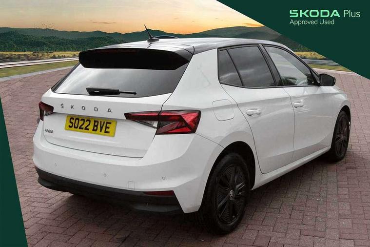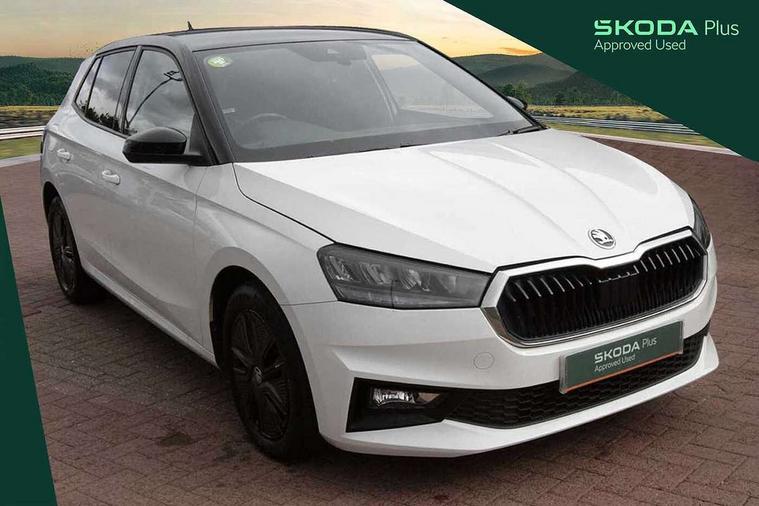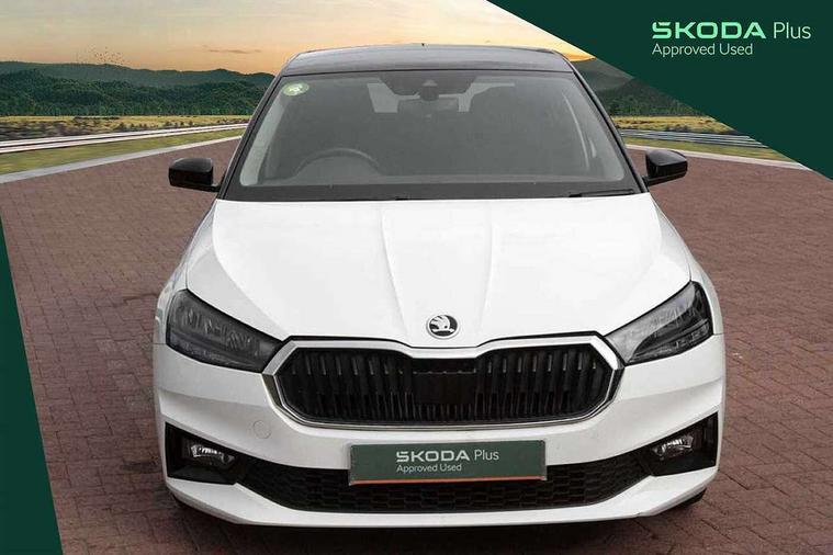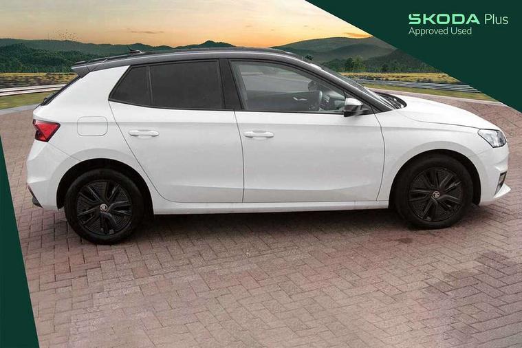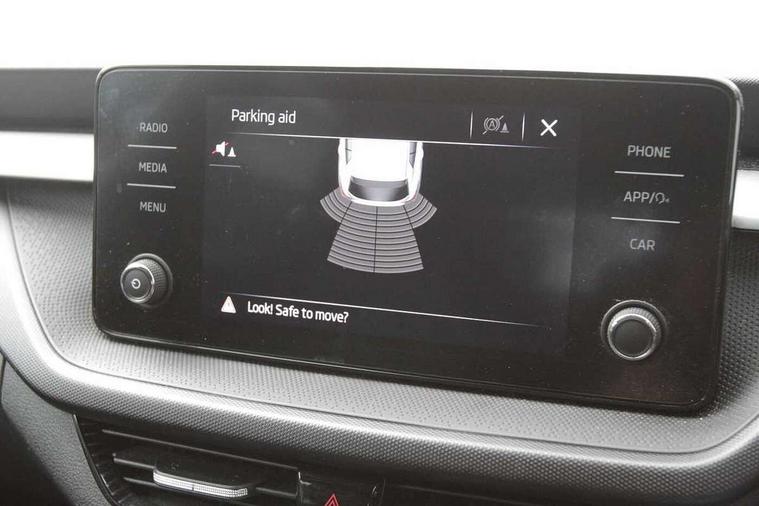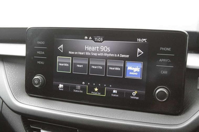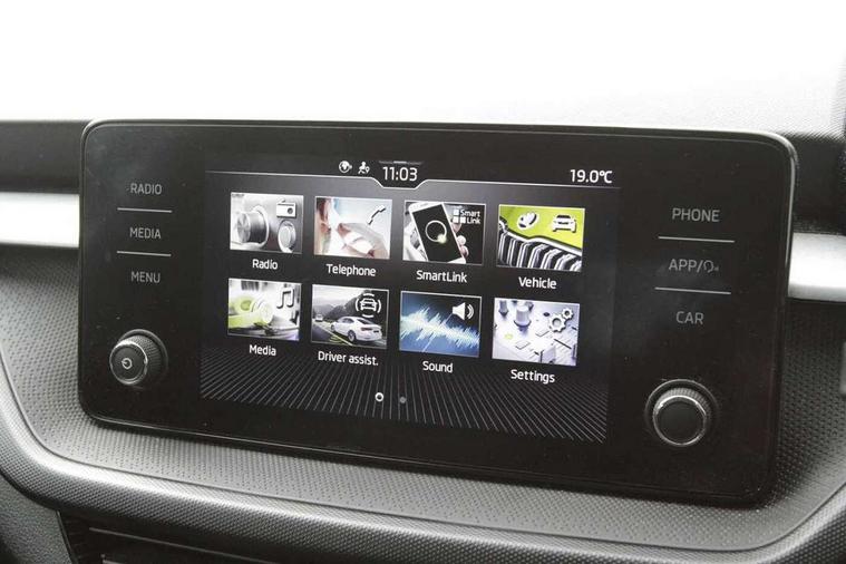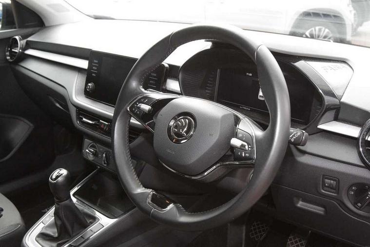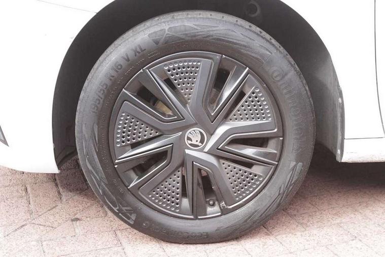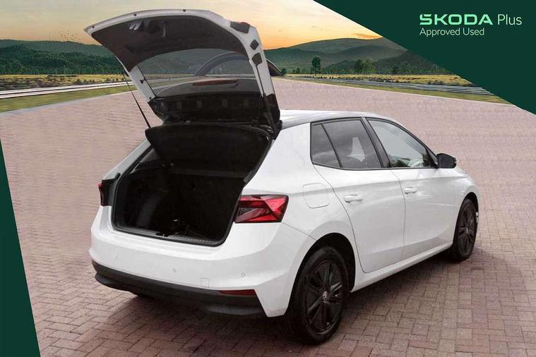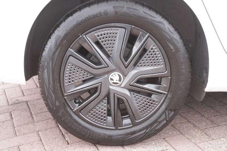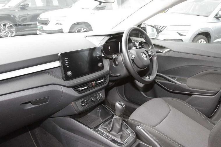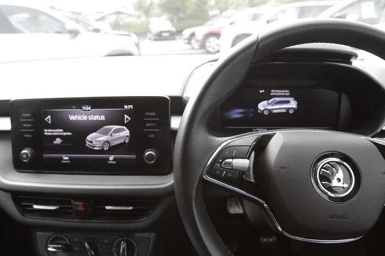 Bluetooth connection, Driver alert system - DAS, Electromechanical power steering, Exterior temperature gauge, Lane assist including road edge detection, Service interval indicator, Virtual cockpit with 10.25" colour display, 2x USB-C in the front (for data transmission and charging), 6 Speakers (4 in front and 2 in rear), Auxiliary socket for external MP3 player, Bolero radio with 8" colour display, DAB digital radio reception, Basic rear lights, Body coloured bumpers, Dimming rear view mirror with black frame, Door mirror integrated indicators, Electrically adjustable and heated door mirrors, Electrically adjustable front windows with function auto up/down, Front window wiper intermittent control, Headlight range control - Automatic, Ice scraper in fuel cap, LED daytime running lights with coming and leaving home feature, Mechanical adjustable rear windows, Privacy glass, Rear LED fog light, Rear side wing doors, Rear window wiper with washing nozzles, Roof mounted spoiler, SKODA tailgate lettering in chrome, Third brake light, 3 rear headrests, Backrest split and folding, Central console with fixed cup holder and storage box, Chrome handbrake release button, Fabric upholstery, Gearshift knob/handle in leather, Grain satin black interior door handles, Hand brake lever handle in leather, Height adjustable front headrests, Height adjustable steering wheel, ISOFIX and TopTether anchorage points to the outer rear seats, ISOFIX and TopTether on the front passenger seat, Luggage compartment lighting, Pollen filter, Rear seat bench unsplit, Single front passenger seat, Storm grey headlining, Sun visors with mirror and airbag label on passenger side, Ticket holder, Umbrella in drivers door, 3-point height adjustable front seats belts with pretensioner and force limiter, Automatic warning lights in case of crash, Driver and passengers airbag with switch off function, e-Call+, ESC including ABS, MSR, ASR, EDS, HBA and XDS, Front and rear seat belt warning, FRONT ASSIST (AEB City and AEB Inter Urban), Front side airbags, Head airbags, One tone horn, Pedestrian protection, Three rear 3-points safety seat belts with pretensioner and force limiter including stop function for outer rear seat belts, Tyre pressure monitoring system, Anti-theft alarm system including immobiliser, interior monitoring, backup horn, and towing protection, Anodized cross line upper decorative trim, Colour Edition air vents, Grain satin black central console cover, Grain satin black lower decorative trim, Satin black door and side trim panel in front, Anti-theft wheel bolts protection, Super-low rolling resistance tyres,