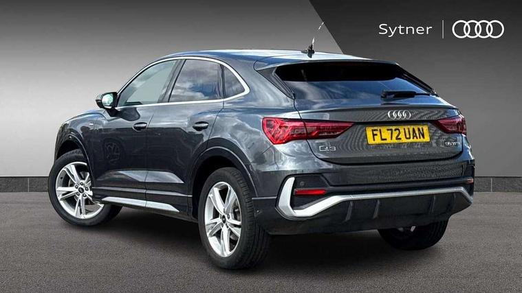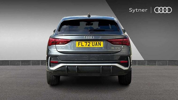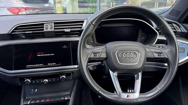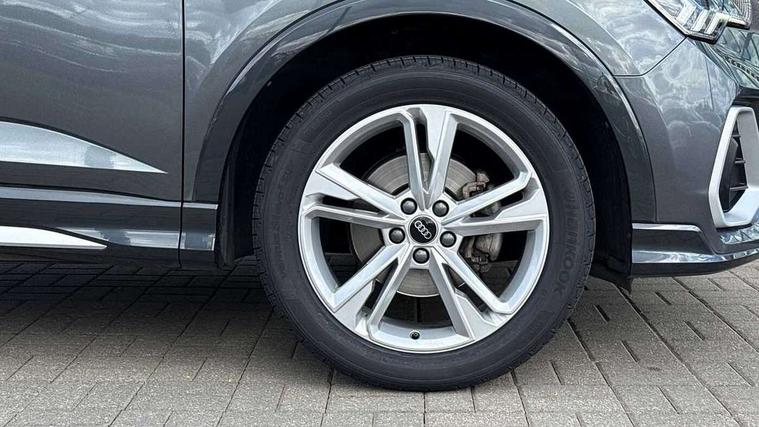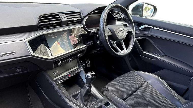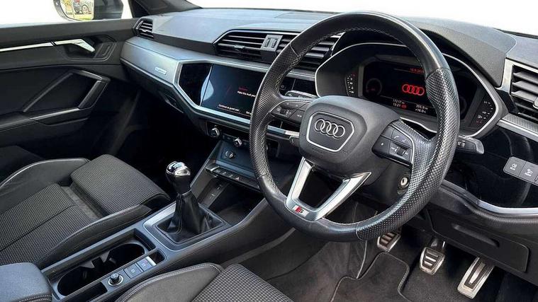 Audi drive select, Audi lane departure warning, Audi Virtual Cockpit - 10.25" display, Bluetooth interface, Camera based traffic sign recognition, Cruise control + speed limiter, Legal emergency call, MMI Navigation Plus with high resolution 10.1 inch touchscreen colour display, Power operated tailgate, Progressive steering, Rear parking sensors, Service interval indicator, Smartphone interface includes wireless Apple carplay/Android Auto, Start stop system with recuperation, Voice control system with natural language interaction, Sports suspension, 2 USB-C ports with charge and data functions, 6 passive loudspeakers, DAB digital radio module, Acoustic windscreen, Aluminium window trim, Auto dimming frameless rear view mirror, Diffuser grille in grained matt black, Diffuser trim in selenite silver, Electrically folding, adjustable and heated door mirrors with integrated LED side indicators and kerb view function for passenger side, Front and rear electric windows, Front fog lights, Front side air inlets in selenite silver, Front underbody protection in manhattan grey paint finish, Grille surround in aluminium silver matt, High gloss black finish B and C pillars, LED headlights with LED daytime running lights, LED rear lights, LED third brake light, Privacy glass dark tinted rear and rear-side windows (from B-pillar backwards), Radiator grille in titanium black with inlay in matt aluminium silver, Rain and light sensors, Rear side wing doors, Rear underbody protection in matt black, Rear wiper, S line badges on front wings, Side skirt insert in matt Platinium grey, Variable front intermittent wipers, 12V socket in rear centre console, 3 seat bench in 2nd row, 40:20:40 folding with manual adjustment for 60:40 forwards/backwards position and backrest angle, Adjustable rear seat bench/backrest with centre armrest and cupholder, Black cloth headlining, Dual zone electronic climate control, Front and rear black floor mats with contrast stitching, Front and rear headrests, Front and rear roof module including reading lights, Front centre armrest, Glove compartment lighting, Height and reach adjustable steering wheel, Illuminated door sill trims with S logo, ISOFIX child seat mounting for front passenger with airbag deactivation and outer rear seat including top tether attachment point for outer rear seats, Luggage compartment light right in white, Luggage compartment sill protection in stainless steel, Manual front seats with height adjustment, Perforated leather gearknob, Single front passenger seat, Stainless steel pedals, Non smoking pack - Q3, 3x3 point rear seatbelts, 6 airbags - Driver, front passenger, curtain and side windows, Audi pre-sense front with pedestrain and cyclist recognition, Electromechanical parking brake, Electronic stabilisation control including ABS, ASR and EDL, Front seatbelt reminder, Hill descent control, Hill hold assist, Manual child lock in rear doors, Pre sense basic, Seatbelt monitoring, Tyre pressure warning, Warning triangle and first aid kit, Anti theft alarm, Anti theft wheel bolts, Immobiliser, Remote central locking, Black dashboard, Dark matt brushed aluminium inlay, Detail dashboard around MMI touch colour display in glass look, black with surround in aluminium look, Leatherette door armrest,