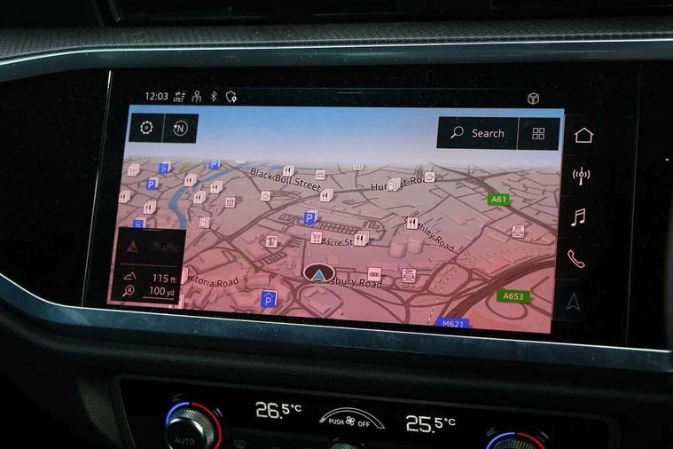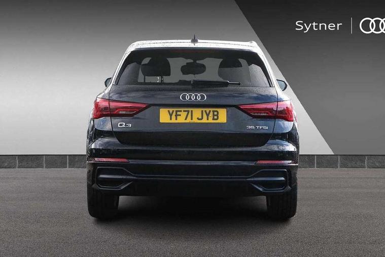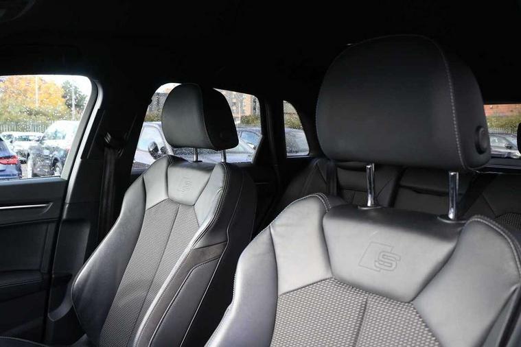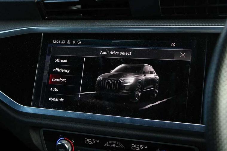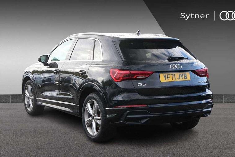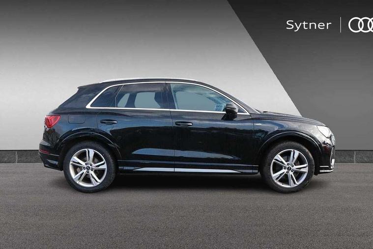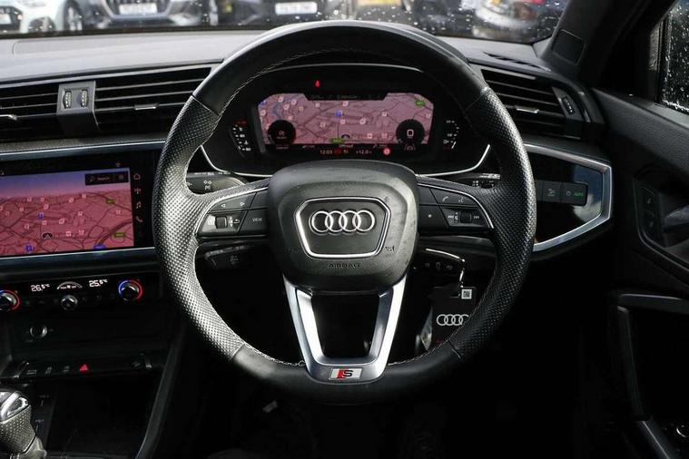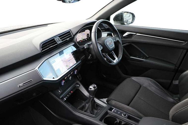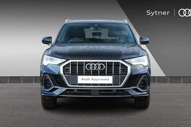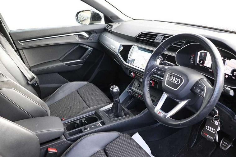 Amazon alexa Integration, Audi connect safety and service (e-call), Audi drive select, Audi lane departure warning, Audi Virtual Cockpit - 10.25" display, Bluetooth interface, Camera based traffic sign recognition, Cruise control + speed limiter, MMI Navigation Plus with high resolution 10.1 inch touchscreen colour display, Power operated tailgate, Progressive steering, Rear parking sensors, Service interval indicator, Smartphone interface includes wireless Apple carplay/Android Auto, Start stop system with recuperation, Voice control system with natural language interaction, Sports suspension, 2 USB-C ports with charge and data functions, 6 passive loudspeakers, DAB digital radio module, Acoustic windscreen, Aluminium roof rails, Aluminium window trim, Auto dimming frameless rear view mirror, Body coloured bumpers, Electrically folding, adjustable and heated door mirrors with integrated LED side indicators and kerb view function for passenger side, Front and rear electric windows, Front fog lights, Front side air inlets in matt platinum grey, Front spoiler blade in matt platinum grey, Grille vertical bars in aluminium silver/Matt, High gloss black finish B and C pillars, LED headlights with LED daytime running lights and dynamic rear indicator, LED rear lights, Privacy glass dark tinted rear and rear-side windows (from B-pillar backwards), Rain and light sensors, Rear diffuser strip in matt titanium black, Rear side wing doors, Rear wiper, S line badges on front wings, S Line front and rear bumpers, Side skirt insert in matt Platinium grey, Silver chrome grille surround, Third brake light, Tinted rear windows, Titanium black radiator grille, Variable front intermittent wipers, 12V socket in rear centre console, 3 seat bench in 2nd row, 40:20:40 folding with manual adjustment for 60:40 forwards/backwards position and backrest angle, Adjustable rear seat bench/backrest with centre armrest and cupholder, Black cloth headlining, Dual zone electronic climate control, Front and rear black floor mats with contrast stitching in rock grey, Front and rear headrests, Front and rear roof module including reading lights, Front centre armrest, Glove compartment lighting, Height and reach adjustable steering wheel, Illuminated door sill trims with S logo, ISOFIX child seat mounting for front passenger with airbag deactivation and outer rear seat including top tether attachment point for outer rear seats, Luggage compartment light, Manual front seats with height adjustment, Perforated leather gearknob, Single front passenger seat, Stainless steel luggage compartment sill finisher, Stainless steel pedals, Non smoking pack - Q3, 3x3 point rear seatbelts, 6 airbags - Driver, front passenger, curtain and side windows, Audi pre-sense front with pedestrain and cyclist recognition, Electrically operated child locks on rear doors, Electromechanical parking brake, Electronic stabilisation control including ABS, ASR and EDL, Front seatbelt reminder, Hill descent control, Hill hold assist, Pre sense basic, Seatbelt monitoring, Tyre pressure warning, Warning triangle and first aid kit, Anti theft alarm, Anti theft wheel bolts, Immobiliser, Remote central locking, Dark matt brushed aluminium inlay, Detail dashboard around MMI touch colour display in glass look, black with surround in aluminium look, Leatherette door armrest,