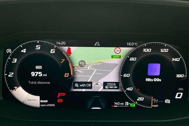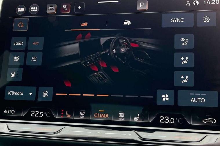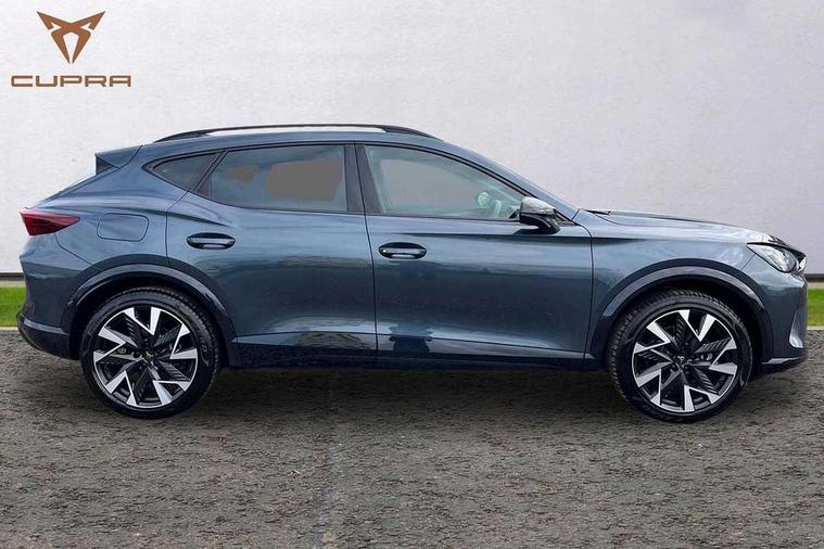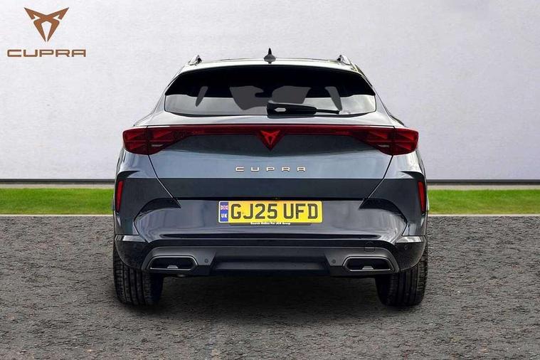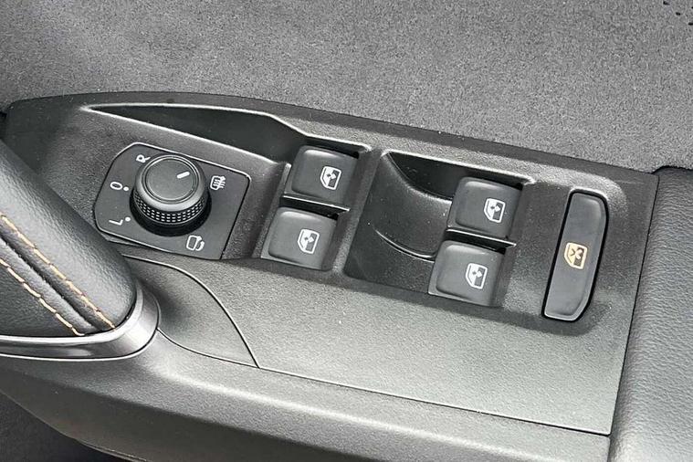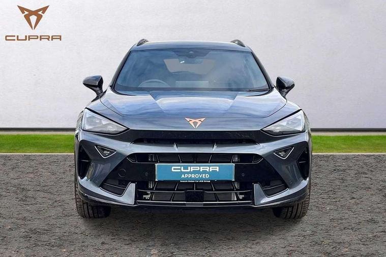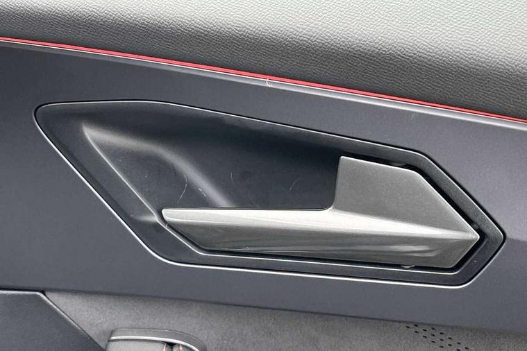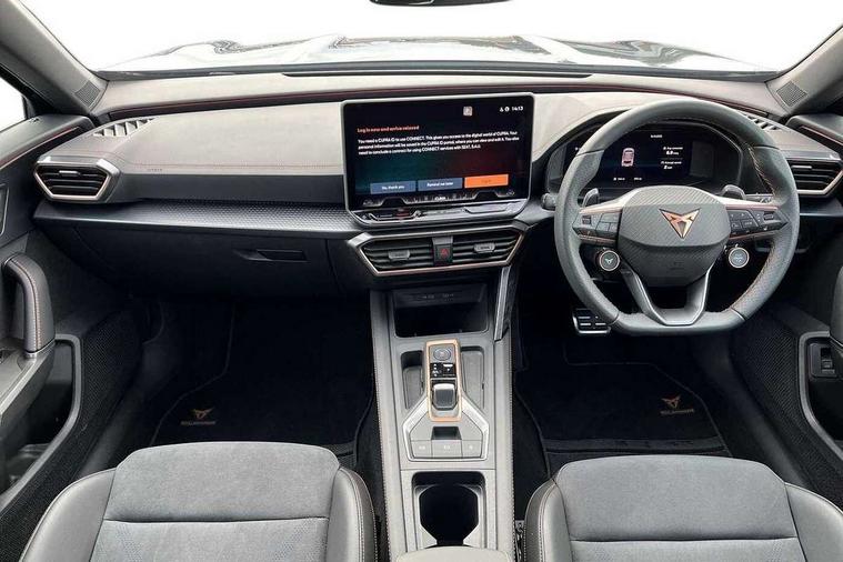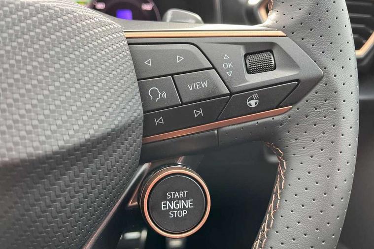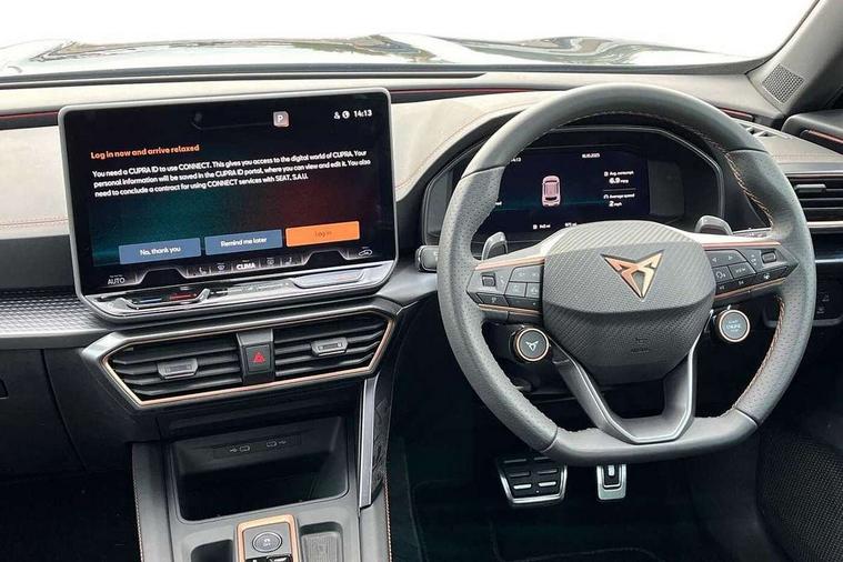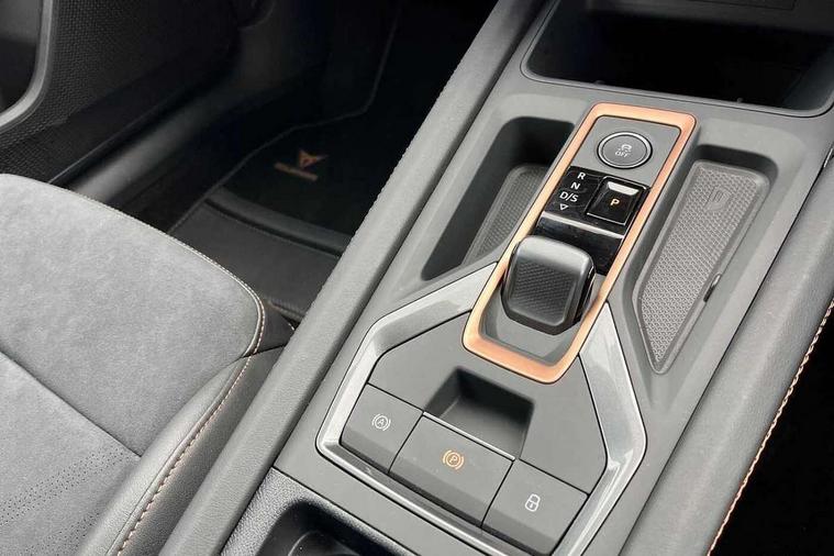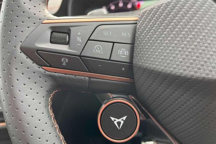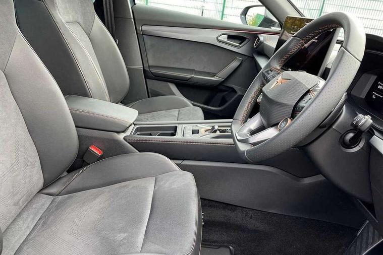 10.25" digital cockpit and configurable dashboard, Adaptive cruise control with follow-to-stop and speed limiter, Advanced driver alert system, Driving profile selection, Dynamic road sign display, Emergency steering support with turn assist, Forward collision warning with automatic braking, Front and rear parking sensors, Full link phone integration, Lane assist, Progressive steering, Rear view camera, RPM, trip computer, outside temp gauge, instrument light brightness, low fuel warning light, lights on reminder, gearshift indicator, Service interval indicator, Start/stop system with regenerative braking, Virtual pedal and electric tailgate, Voice control system, Wired Android Auto, Wireless apple carplay, Wireless phone charger, CUPRA sport suspension, Electronic locking differential and dynamic traction support, 2 front and 2 rear USB type C sockets, Media system with navigation, 12.9" touchscreen display, voice control, DAB, steering wheel mounted controls, Auto dimming rear view mirror, Body colour door handles, Body coloured bumpers, Dark grey wing mirror, Daytime running light with automatic headlight control and coming home feature, Door panel ambient lighting, Dynamic headlight range control, Electric front/rear windows, Electrically adjustable heated and folding door mirrors with memory function, Gloss black roof rails and window surrounds, High beam assist, LED 3rd brake light, LED front fog lamps with cornering function, LED Headlights, LED Taillights with dynamic indicator, Rain sensing wipers, Rear diffuser with black simulated exhaust pipes, Rear fog lights, Rear side wing doors, Rear wash/wipe, Tinted rear windows, Welcome lights (within exterior mirror housing), 12V socket, 2 front and 2 rear reading lights, 3 seat bench in 2nd row, 60/40 split rear bench seat with armrest and mechanical seat release, Black headlining, Black interior roof lining, Cupra sports pedals, Dust/pollen filter, Electrically adjustable front seats with lumbar support and memory function, Front and rear head restraints, Front centre armrest, Heated front seats, Heated supersports multifunction leather steering wheel with satellite buttons and gear shift paddles, Height/reach adjust steering wheel, Illuminated aluminium doorsteps, Illuminated interior front door sills, Illuminated sunvisor with mirror, Isofix, Leather dashboard, door insert and side trim panel, LED smart wraparound lighting, PVC/Dinamica microfiber upholstery + bucket seats, Satellite steering wheel, Single front passenger seat, Storage pockets on rear of front seats, Three zone climate control with control panel in rear, Variable luggage/load compartment floor, 3 point seatbelts on all rear seats, ABS, Brake control system - ESC and brake booster, Child proof door locks, Driver and front passenger airbags with front passenger airbag de-activation, Electronic parking brake, Front and rear disc brakes, Front side curtain airbags, Hill hold control, Public e-call, Seat belt reminder for front and rear seats, Tyre pressure monitoring system, Anti theft alarm system, KESSY Advanced - Keyless start, keyless entry with SAFELOCK, Locking wheel bolts, Copper and aluminium interior detailing, 19" Sandstorm machined sport black and silver alloy wheels,