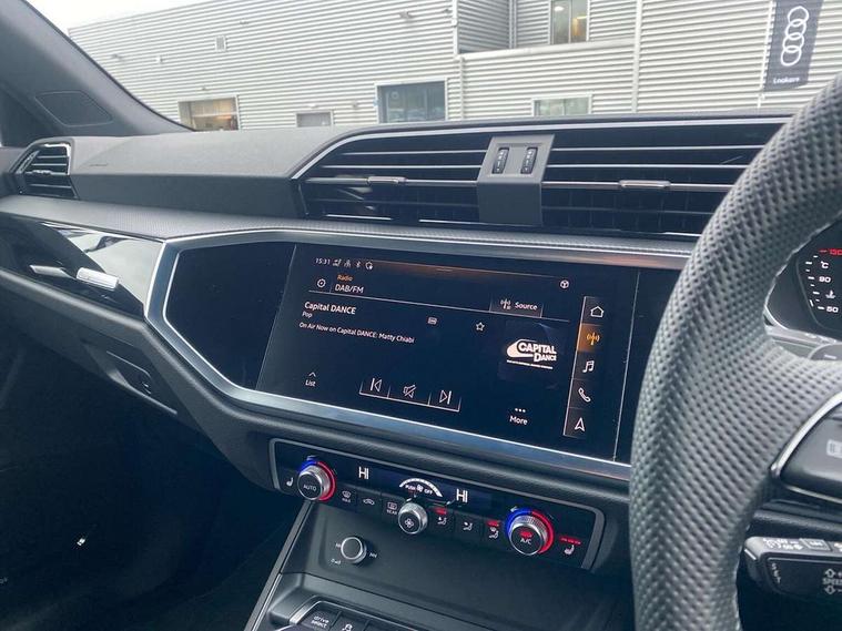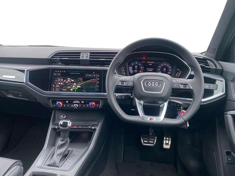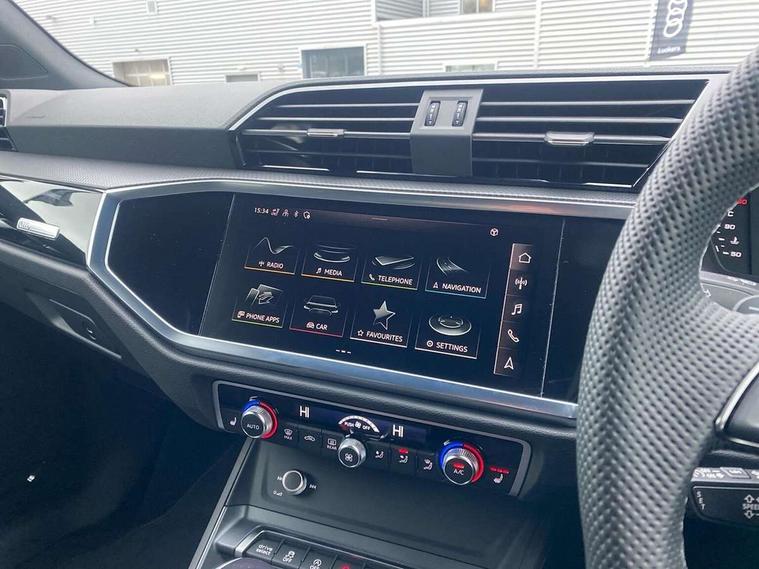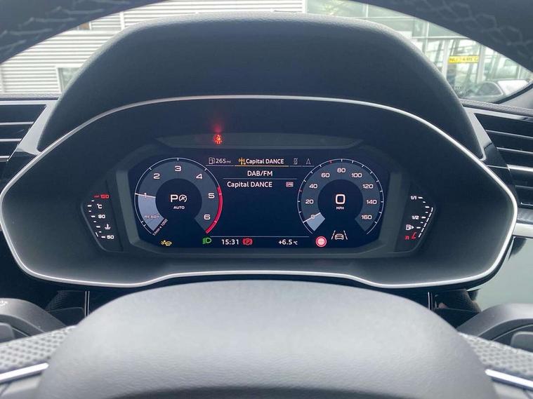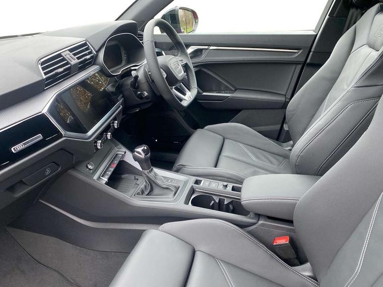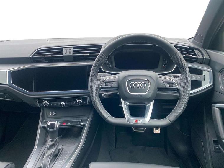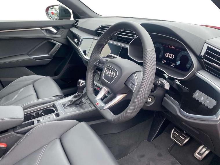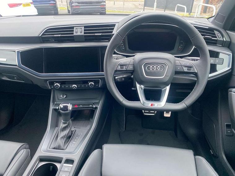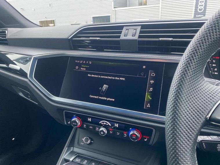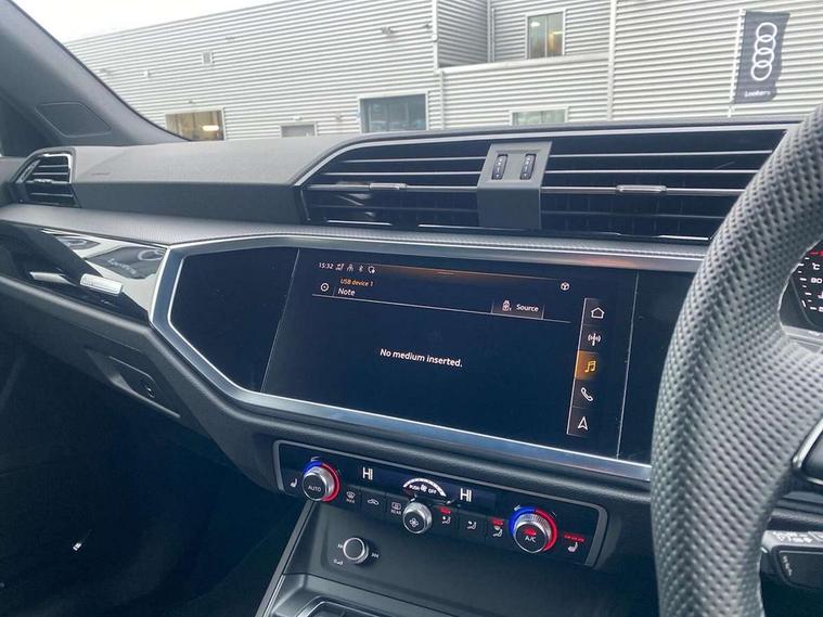 Amazon alexa Integration, Audi connect safety and service, Audi drive select, Audi lane departure warning, Audi Virtual Cockpit - 10.25" display, Bluetooth interface, Camera based traffic sign recognition, Distraction and Fatigue warning, Legal emergency call, MMI Navigation Plus with high resolution 10.1 inch touchscreen colour display, Power operated tailgate, Progressive steering, Service interval indicator, Smartphone interface includes wireless Apple carplay/Android Auto, Start stop system with recuperation, Voice control system with natural language interaction, Diesel particulate filter, Sports suspension, 2 USB-C ports with charge and data functions, 6 passive loudspeakers, DAB digital radio module, Acoustic windscreen, Audi Beam uses LEDs to project the Audi logo onto the ground as you exit your Q3, Auto dimming door mirrors, Auto dimming frameless rear view mirror, Black roof rails, Electrically folding, adjustable and heated door mirrors with integrated LED side indicators and kerb view function for passenger side, Front and rear electric windows, Front fog lights, Grille vertical bars in aluminium silver/Matt, High gloss black finish B and C pillars, LED Dynamic rear indicators, LED headlights with LED daytime running lights, LED rear lights, LED third brake light, Privacy glass dark tinted rear and rear-side windows (from B-pillar backwards), Rain and light sensors, Rear diffuser grille in grained matt black, Rear diffuser strip in matt anthracite black, Rear side wing doors, Rear wiper, S line bumpers in contrasting Manhattan grey, Variable front intermittent wipers, 12V socket in rear centre console, 3 seat bench in 2nd row, 40:20:40 folding with manual adjustment for 60:40 forwards/backwards position and backrest angle, Adjustable rear seat bench/backrest with centre armrest and cupholder, Black cloth headlining, Dual zone electronic climate control, Electric lumbar support, Front and rear black floor mats with contrast stitching in rock grey, Front and rear headrests, Front centre armrest, Height and reach adjustable steering wheel, Illuminated door sill trims with S logo, ISOFIX child seat mounting for front passenger with airbag deactivation and outer rear seat including top tether attachment point for outer rear seats, Manual front seats with height adjustment, Perforated leather gearknob, Single front passenger seat, Stainless steel luggage compartment sill finisher, Stainless steel pedals, Twin leather upholstery with front sport seats + S embossing, Black styling pack - Q3, Non smoking pack - Q3, 3x3 point rear seatbelts, 6 airbags - Driver, front passenger, curtain and side windows, Audi pre-sense front with pedestrain and cyclist recognition, Electrically operated child locks on rear doors, Electromechanical parking brake, Electronic stabilisation control including ABS, ASR and EDL, Front seatbelt reminder, Hill descent control, Hill hold assist, Pre sense basic, Seatbelt monitoring, Tyre pressure warning, Warning triangle and first aid kit, Anti theft alarm, Anti theft wheel bolts, Immobiliser, Remote central locking, Aluminium look interior elements, Detail dashboard around MMI touch colour display in glass look, black with surround in aluminium look, Leatherette door armrest, Piano black inlay,