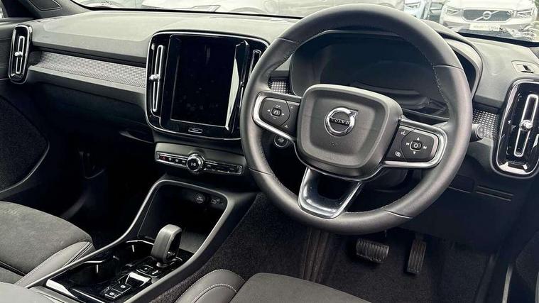 12.3" Progressive Driver Display, 9" centre console portrait touch screen, Adjustable steering wheel force, Android auto (Wired), Apple carplay (wired), Bluetooth handsfree system, Driver alert control, Driver assistance (pilot assist and adaptive cruise control), Driver awareness - Blind spot information system with steer assist, cross traffic alert with autobrake and rear collision warning and mitigation, E-call, Front park assist, Google automotive services - Enabled entertainment apps, navigation with google maps, voice recognition with google assistant, Hands free power tailgate, Intelligent speed assistance, Lane keeping aid, Oncoming Lane Mitigation, Rear park assist, Speed sensitive steering, Volvo cars services with app - Driving journal, emergency and breakdown call, engine remote start, remote door locking/unlocking and vehicle dashboard, Wireless/Inductive Mobile Phone Charging, Automatic transmission with start/stop and manual change functions, Dynamic chassis, DAB Digital radio, Steering wheel mounted remote controls, Adaptive brake lights with high level LED brake lights, Auto dimming feature for exterior door mirrors, Auto dimming interior mirror, Automatic headlamp levelling, Automatic LED Headlights + Active high beam incorporating daytime running lights, Front aluminium tread plates, Front and rear electric windows, High gloss black front and rear skid plate, High gloss black front bumper deco, High gloss black mesh front grille with high gloss black surround, High gloss black window trim, Home safe and approach lighting, Integrated roof rails in high gloss black, LED front fog lights, Puddle lights, Rain sensor with automatic windscreen wiper activation, Rear side wing doors, Rear wiper, Roof antenna, Roof spoiler, Visible VIN plate, 12V socket in front tunnel console and luggage compartment, 2-Zone electronic climate control with CleanZone air quality system and pollen filter, 3 seat bench in 2nd row, 3 Spoke tailored steering wheel with chrome trim, 60/40 versatile split folding rear seat, Centre console cupholders and storage, Charcoal headlining, Connect textile/microtech upholstery, Flexible load floor and grocery bag holder, Floor mats, Front cabin courtesy lights, Front door pocket, front cupholder, ambient front door, rear reading, rear courtesy, instrument panel and tailgate lighting, Front footwell illumination, Front headrests, Front reading lights, Front seat cushion extensions, Front side step illumination (under door), Glovebox bag hook, Heated front seats, Height adjustable passenger seat, Height/reach adjustable steering column, High gloss centre tunnel deco, Illuminated glovebox, Illuminated luggage compartment, Illuminated vanity mirrors + ticket holder, Integrated waste bin, Isofix attachments on outer rear seats, Load cover, Load protection net, Multi directional lumbar support for driver and passenger seat, Power driver seat with memory + exterior mirrors memory, Rear armrest with cupholders, Rear headrests, Single front passenger seat, Underfloor cargo storage, Climate pack without heated front seats - XC40, 3x3 point rear seatbelts, City safety with steering support with Pedestrian + cyclist + front collision warning with full auto brake and rear auto brake, Driver and passenger airbags, Drivers knee airbag, Electronic parking brake with auto hold, First aid kit, Front and outer rear seatbelt reminder and pretensioners, Front seats SIPS airbags, Hill descent control, Hill start assist, Inflatable curtain, Passenger airbag cut-off device, Power child locks on rear doors, Road sign information display, Run off Road Protection, SIPS (Side Impact Protection System), Slippery road and hazard light alert, Stability and Traction Control with Spin control, Engine Drag Control and Corner Traction Control, Tyre pressure monitoring system, Vehicle deceleration control with Anti-lock Brake System, Electronic Brake Distribution and Emergency Brake Assist, Warning triangle, WHIPS whiplash protection system - front, 2 x Key integrated remote control central locking including with deadlocking system and auto open/close windows, Anti-theft alarm including immobiliser/volume sensor + level sensor, Keyless drive includes keyless entry and keyless start, Locking wheel nuts,