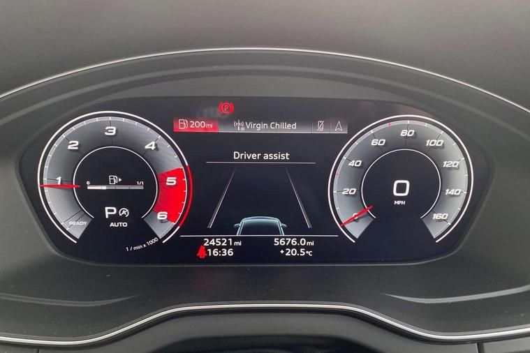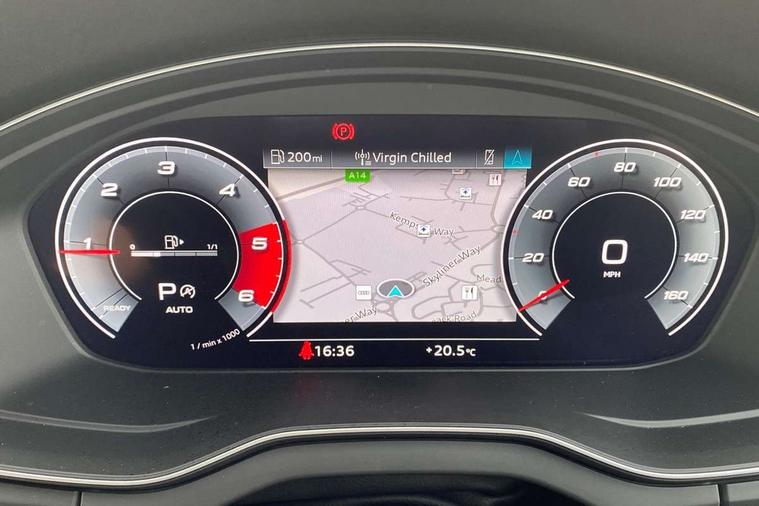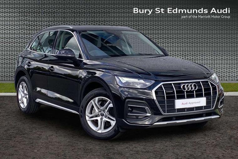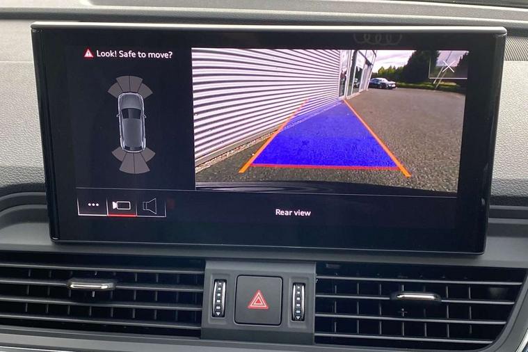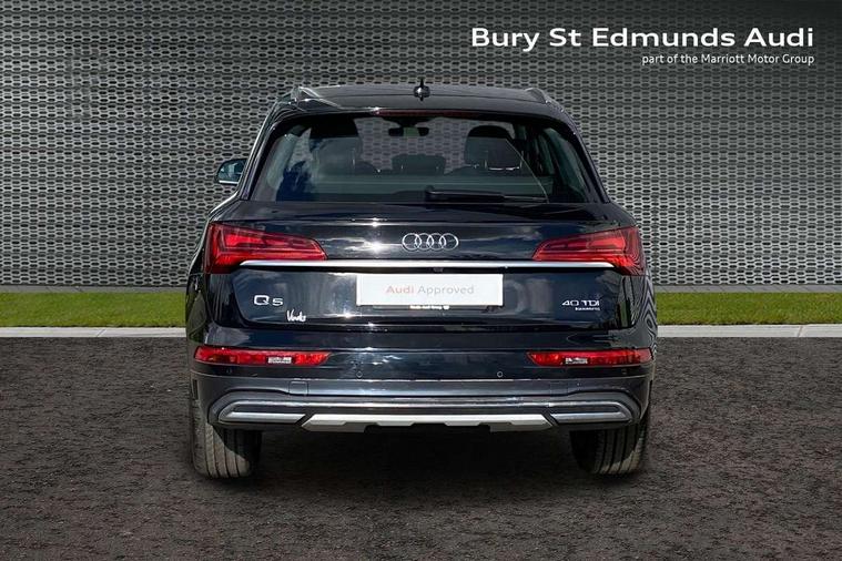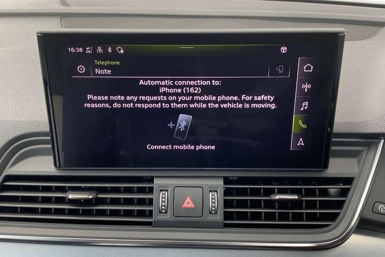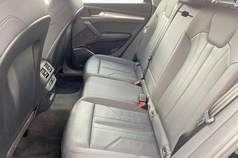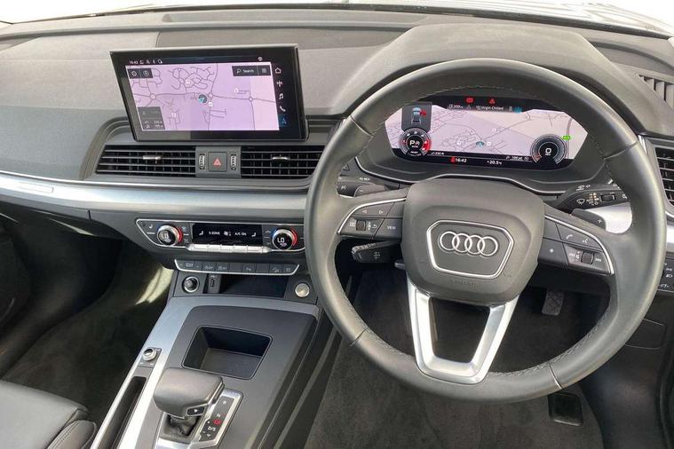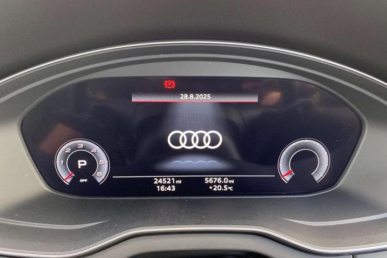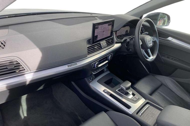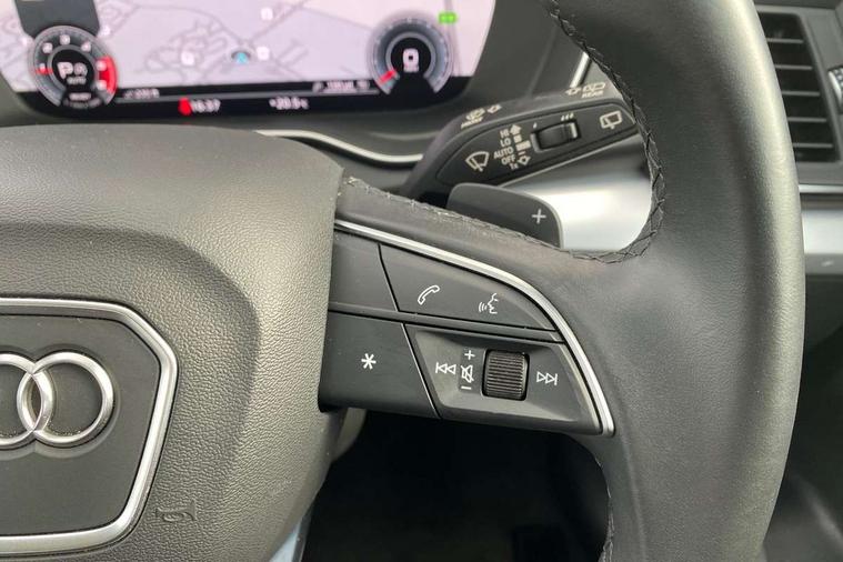 Audi connect safety and service (e-call), Audi connect with Amazon Alexa Integration, Audi drive select, Audi virtual cockpit plus with 12.3" screen and three different layout designs, Audi wireless smartphone interface, Automatic start-stop system with coasting functionality and efficiency programme, Bluetooth interface, Cruise control + speed limiter, Electro - mechanical power assisted steering, MMI navigation plus with 10.1" touch screen, Power tailgate, Reversing camera, Service interval indicator, Voice control system with Audi hotword activation "Hey Audi", Diesel particulate filter, Dynamic suspension, Quattro on demand, DAB Digital radio, Acoustic windscreen, Air inlets in matt titanium black with blades in matt aluminium silver, Aluminium roof rails, Auto dimming rear view mirror, Automatic headlights and windscreen wipers, Body colour bumpers, Body colour door mirrors, Chrome plated exhaust trims, Door sills in Selenite silver, Electric adjustable/heated/folding door mirrors, Front and rear electric windows, LED headlights and LED tail lights, Lower bumpers painted in contrast Manhattan grey, Matt selenite silver underbody protection, Matt twilight grey radiator grille with chrome vertical struts, Rear chrome trim strip below lights, Rear diffuser strip in selenite silver, Rear spoiler, Rear wiper, Roof bars, 2 x USB charging port with aux input socket, 3 rear headrests, 3 spoke multifunction leather steering wheel with shift paddles, 40:20:40 split folding rear seat with rear centre armrest, Comfort front centre armrest, Deluxe 3 zone electronic climate control, Door sills trims with aluminium inlays, Front/rear floor mats, Heated front seats, Height adjustable front head restraints, Height/reach adjustable steering column, ISOFIX child seat mounting and top tether, Luggage compartment cover, Manual seat adjustment with 4-way electric lumbar support, Removable luggage compartment floor, Silver cloth headlining, Sunvisors with vanity mirrors, Twin leather upholstery + front sports seats, High gloss pack - Q5, LED interior light pack - Q5, 3 point seatbelts on all seats, 6 airbags - Driver, front passenger, curtain and side airbags, Electrically operated child locks on rear doors, Electromechanical parking brake, Electronic stabilisation control including ABS, ASR and EDL, Front passenger airbag deactivation, Hill descent control, Hill hold assist, Multi collision brake assist, Pop-up bonnet for pedestrian protection, Pre sense city, Seat belt force limiter, Seatbelt monitoring, Tyre pressure warning, Warning triangle and first aid kit, Anti theft alarm, Anti-theft wheel bolts, Keyless Go access/ignition system, Aluminium rhombus inlay,