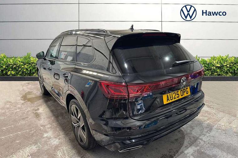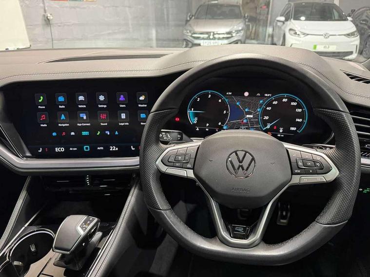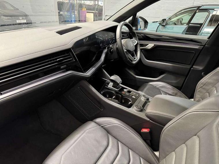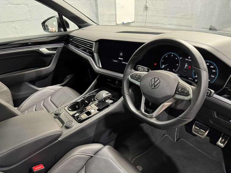 15" Screen Top infotainment system Premium (MIB3), Adaptive cruise control, Advanced driver attention and drowsiness monitor, Driver profile selection, Dynamic road sign display, E-Sim card for online connectivity, eCall emergency system, Innovision cockpit, Intelligent park assist, Mobile phone interface with inductive charging, Multi-colour Active Info display, Park Assist - Sensor controlled steering aid to assist parallel or bay parking, PAS, Warning signal and warning light for front and rear seatbelts not fastened, Wireless app connect, Adaptive chassis control, DAB Digital radio, Diversity antenna for AM/ FM reception, We Connect and We Connect Plus functionality, Automatic coming/leaving home lighting function, Automatic headlights, Black door mirrors, Black style comfort bumpers, Dynamic headlight range control with dynamic cornering light, Electric front tilt/slide panoramic sunroof and fixed rear sunroof, Electrically power adjustable, heated, folding, auto dimming, front passenger exterior door mirror lowering function, External USB type C socket and charging sockets, Gloss black roof rails, HD LED Matrix beam plus digital headlight projection with variable light distribution, Headlight washers, Highway light, LED 3rd brake light, LED daytime running lights, LED rear combination lamp with variable lighting functions and special styling, Poor weather light, Rain sensor, Rear exhaust tailpipe, Rear fog light with back up light on both sides, Rear light bar and illuminated logo, Rear side wing doors, Rear wiper, Stainless steel door sill protection, 12V socket in centre console, 3 rear headrests, 3 seat bench in 2nd row, 4 zone climate control, Airbag label on sun visor and B-pillar, Brushed stainless steel pedals, Double sun visors with illuminated vanity mirrors, Front + rear carpet mats, Front centre armrest, Leather wrapped multifunction sports steering wheel, heated, with touch control and shift paddles, Mechanical rear seat release, Power adjustable lumbar support in front, Power seats in front, right side with memory features and seat cushion depth adjustment, Rear seat backrest and split folding with center armrest, Single front passenger seat, Memory pack plus - Touareg, 3 point seatbelts, outer rear with ECE lable, ABS, Child locks on rear doors, Curtain airbags, Driver and front passenger safety-optimised head restraints, Driver/Front Passenger airbags, Extended pedestrian protection measures, Front assist, Front seat side impact airbags, Generative braking with start and stop system, Height adjustable 3 point front seatbelts with pre tensioners, Passenger airbag deactivate switch, Three 3 point rear seatbelts, Two tone horn, Tyre pressure loss indicator, Warning triangle and first aid kit, Alarm system with interior protection, Easy open and close sensor controlled luggage compartment opening and closing with remote unlocking, Keyless Access Keyless locking and starting system with SAFELOCK, Aluminium decorative inserts, Black decorative trims, Gloss black decorative inserts in centre console, Tool kit,