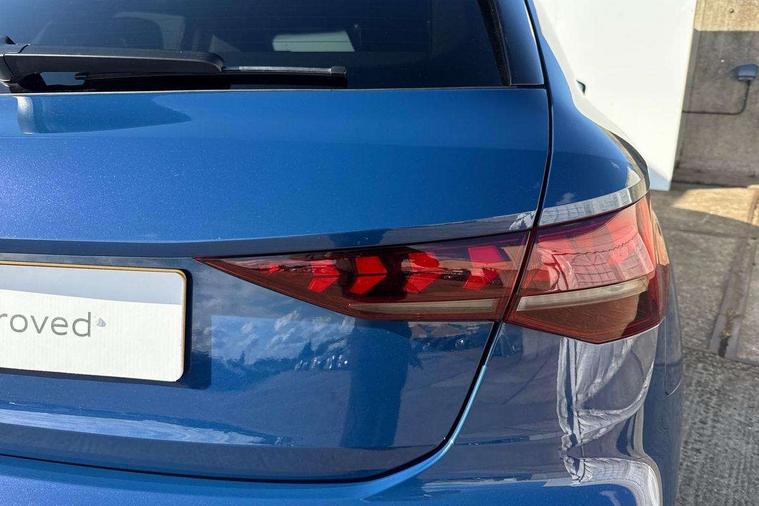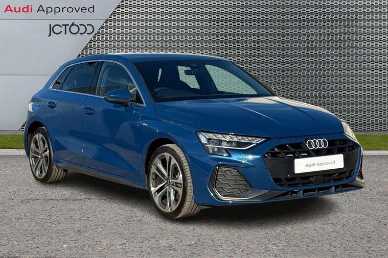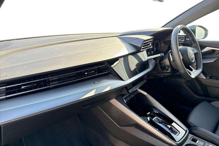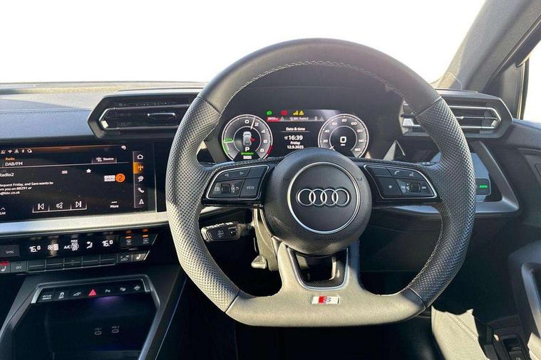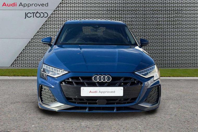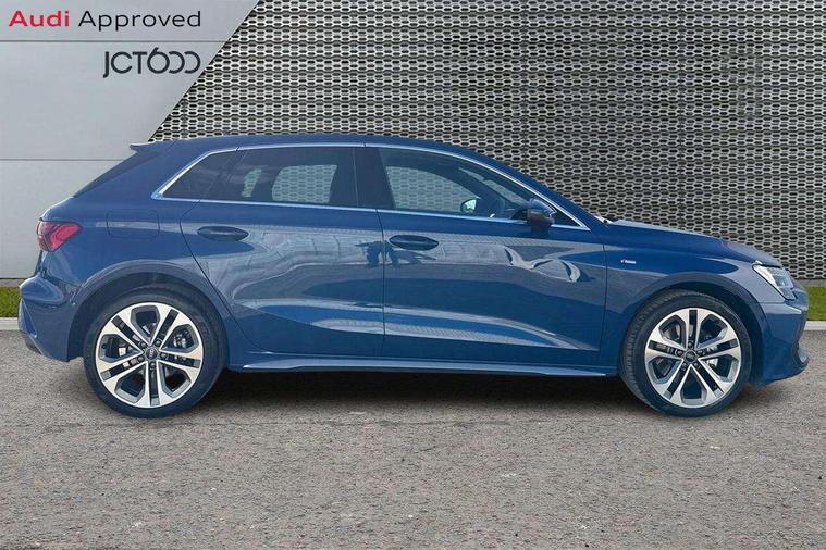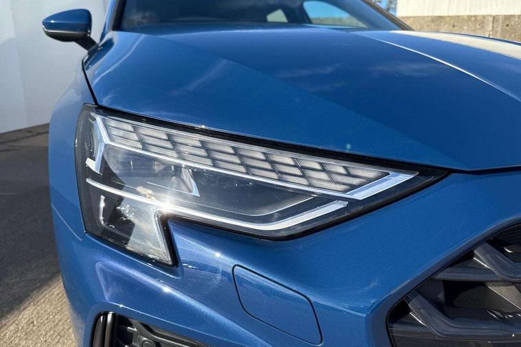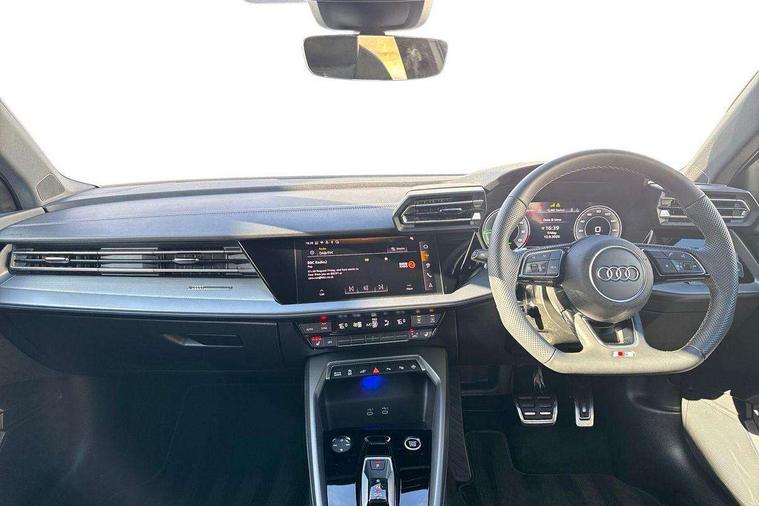 Adjustable speed limiter, Audi drive select, Audi smartphone interface with app store includes wireless Apple carplay, Android auto and Amazon alexa integration, Audi virtual cockpit plus - 12.3" full HD resolution dynamic digital instrument cluster, Automatic start/stop system with recuperation, Bluetooth interface, Camera based traffic sign recognition, Collision avoidance assistant, Cruise control, Distraction and Fatigue warning, e-Call (emergency call), Electromechanical power speed sensitive steering, Lane departure warning system, MMI Navigation Plus with high resolution 10.1" colour touch screen display, Park Assist with parking system Plus, Service indicator, Trip computer, Voice control system with natural language interaction, 3 pin 10 amp domestic charging cable, CCS socket for DC charging, Charging cable for public charging, mode 3 (type 2), up to 22 kW (AC), Compact charging system, Industrial connector CEE 32 A, 230 V, length 1.6 m, Standard suspension, Type 2 socket for AC charging, Audi Phonebox light with wireless charging, Audi sound system - 10 loudspeakers including centre loudspeaker and subwoofer, DAB Digital radio, USB ports with charging function in the rear, Acoustic glass windscreen, Aluminium window trim, Auto dimming frameless rear view mirror, Body colour exterior mirrors, Chrome exhaust tailpipes, Electrically adjustable/heated/folding/auto dimming door mirrors with integrated LED indications + kerb view function for passenger side, Exterior model badging, Front and rear side air inlets in grained matt black with dark liquid chrome frame, Front electric windows, Front radiator grill in high gloss dark chrome, Heat insulating glass windscreen, Illuminated door sills with aluminium inserts at the front with S logo, LED 3rd brake light, LED daytime running lights, LED headlights with LED rear lights and dynamic rear indicators, Light and rain sensors, Privacy glass - dark tinted rear window, rear door and side windows, Rear diffuser and grill in grained matt black with inlay in dark liquid chrome, Rear electric windows, Rear side wing doors, Rear wiper, S line bumpers, S roof spoiler, Side S line emblems on front wings, Side sill trim in dark liquid chrome, 12V socket and storage compartment in front centre console, 3 seat bench in 2nd row, 3 spoke flat bottomed leather multifunction sport steering wheel with gear shift paddles, 3-zone deluxe automatic air conditioning, 4 way electrically adjustable lumbar support for driver and front passenger, 40/20/40 split folding rear seat bench, Black cloth headlining, Convenience auxiliary air conditioning, Front and rear centre armrest in artificial leather, Front and rear centre armrest in artificial leather with contrasting stitching on armrests and instrument panel, Front and rear headrests, Front/rear floor mats, Heated front seats, Height and reach adjustable steering wheel, Manual boot compartment lid, Manually adjustable front seats, Rear cup holders, S badging on the steering wheel, Seat side bolsters, Single front passenger seat, Stainless steel pedals and front footrest in black, Twin leather upholstery with front sports seats S embossed logo, Aluminium interior elements pack - A3 Sportback, Multi-coloured LED interior lighting package - A3, 3x3 point rear seat belts, Acoustic vehicle alerting system, Driver and front passenger airbag with passenger airbag deactivation, Electronic Stabilisation Control (ESC) including ABS, ASR and EDL, First aid kit with warning triangle and 2 safety vests, Front side airbags with head airbags and interaction airbag, Hill hold assist, Pre-sense front with pedestrian and cyclist detection, Seatbelt monitoring, Tyre pressure loss indicator, Anti theft alarm, Anti-theft wheel bolts, Electronically operated child locks, Immobiliser, Remote central locking with safelock, Dash & door Inlay in dark aluminium Spectrum, Tyre repair kit,