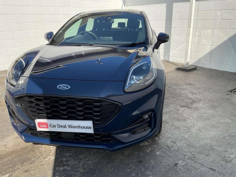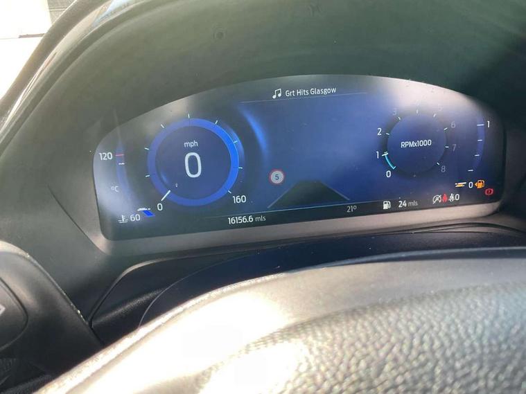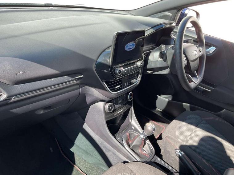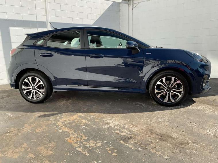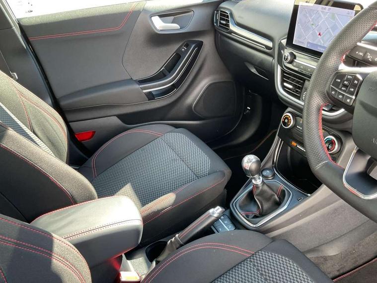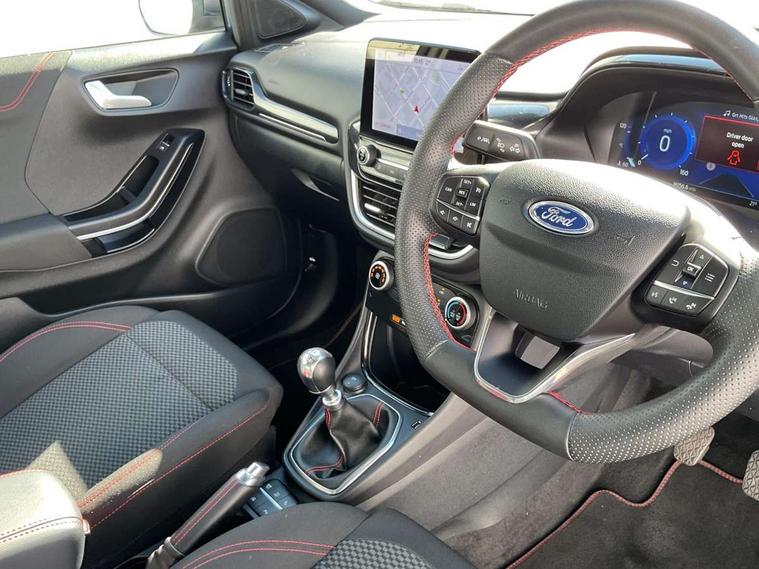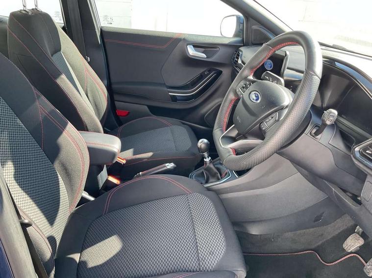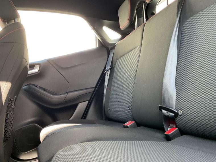 Driver impairment monitor, Emergency call service, Ford easy fuel, Full digital 12.3" instrument cluster, Lane keeping aid with lane departure warning, Power assist steering, Power start button, Rear parking sensor, Selectable drive modes(Normal, sport, Eco, trail, slippery), Speed sign recognition, Sport suspension, Automatic headlights with auto high beam, Automatic rain sensing wipers, LED rear lamps, Power foldable heated door mirrors with puddle lamps, Projector headlamps with LED day time running lights and front fog lamps, Quickclear heated windscreen, Rear side wing doors, Rear wiper, ST-Line body styling kit with unique grille, Third brake light, 3 seat bench in 2nd row, Centre console with armrest and stowage, Ford megabox extended bootspace, Front and rear head restraints, Front floor mats, Manual 2 way passenger seat adjustment, Manual 4 way driver seat adjust with lumbar adjustment, Single front passenger seat, ST- Line cloth trim with red stitching, ST-Line flat bottomed sensico leather steering wheel with leather handbrake and aluminium gear knob, Ford SYNC 3 navigation pack - Puma, 3 rear seatbelts, Child safety lock, Electronic stability control (ESC) and hill start assist, Pedestrian/cyclist detection & post-collision braking, Pre collision assist system, Tyre pressure monitoring system (TPMS), Thatcham alarm,