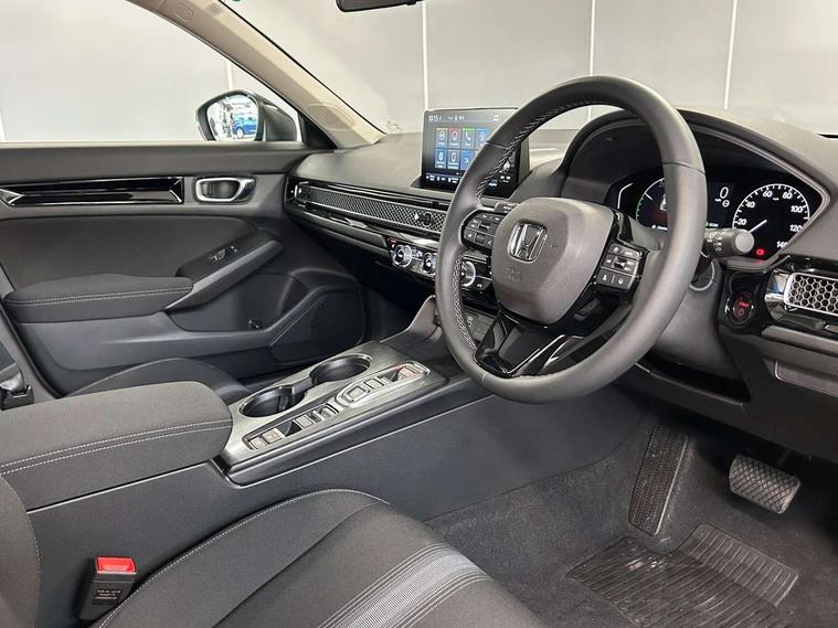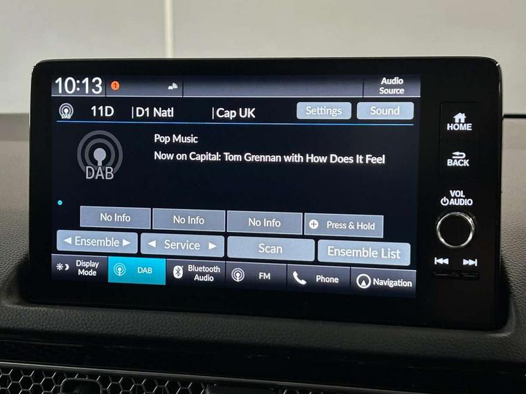 7" Multi information display screen, Adaptive cruise control, Adaptive motion for electric power steering, Adjustable speed limiter, Agile handling assist, BLIS (Blind Spot Information System) with Cross Traffic Monitor, Bluetooth hands free telephone connection, Driving modes, Economy mode, Electric power steering wheel with variable gear ratio steering, Emergency call service, Emergency stop signalling system, Forward collision warning, Front and rear parking sensors, Honda CONNECT with Navigation 9" touchscreen, AM/FM/DAB, Apple Carplay and Android Auto, live traffic info, Honda sensing, Idle stop, Intelligent speed limiter, Lane departure warning system, Lane keep assist, Low speed following, Power meter, Rear parking camera, Road departure mitigation, Tailgate, Traffic jam assist, Traffic sign recognition, Wireless apple carplay, Vehicle stability assist, 'Shark fin' mobile antenna, 2x USB Front socket (1 data & 1 charge), 8 Speakers, Digital Audio Broadcast (DAB) Tuner, Front tweeters, Steering wheel mounted audio controls, Aspherical driver door mirrors, Auto headlight adjuster, Auto headlights, Automatic coming/leaving home lighting function, Automatic rain sensing wipers, Body colour door handles, Chrome window garnish, Electric adjustable heated door mirrors, Electric front and rear windows, Electrically folding door mirrors, Headlight extension black, High beam assist, High level LED brake light, LED daytime running lights, LED front turn type, LED Headlights, LED rear lights, Material finish grille, Pop up hood, Privacy glass, Rear side wing doors, Rear wiper, Single hidden exhaust pipe, Variable front intermittent wipers, 3 seat bench in 2nd row, 60/40 split folding rear seat, Cargo accessory power socket, Cargo net hooks, Driver and front passenger seat armrests, Driver's electric lumbar adjustment, Driver's seat height adjustment, Dual climate control air conditioning system, Fabric upholstery, Front accessory power socket, Front map lights, Front/rear courtesy lights, Glovebox light, Heated front seats, Hybrid emblem, Isofix points/i size, Leather steering wheel, Meter Illumination white, Passenger seat back pocket, Platinum chrome interior door handles, Rear head restraints, Rear reading lights, Rear seat centre armrest, Single front passenger seat, Sunvisors with illuminated vanity mirrors, Tilt/telescopic adjustable steering wheel, Tonneau cover, Trunk light, USB Rear number 2 x charge, White ambient roof light, 3x3 point rear seatbelts, ABS+EBD+Brake assist, Airbags - driver and front passenger, Airbags - Knee (AS), Airbags - Knee (DR), Anti-whiplash front headrests, Brake hold function, Collision mitigation braking system, Collision mitigation throttle control, Deflation detection system, Driver SRS airbag (single stage inflation), Electronic parking brake with auto hold, Front and rear curtain airbags, Front and rear seat belts with emergency locking retractor (ELR), Front centre airbag, Front side airbags, Hill start assist, Low speed brake system, Manual child lock in rear doors, Passenger airbag deactivate switch, Rear airbags, Regenerative braking/deceleration paddle control, Immobiliser, Mirrors and windows key fob, Remote central locking with 2 jack knife keys, Security alarm, Selectable door unlock, Smart entry + Smart start, Superlocking, Tilt sensors, Ultrasonic security sensor, 17" 2 tone diamond cut alloy wheels, Tyre repair kit,
