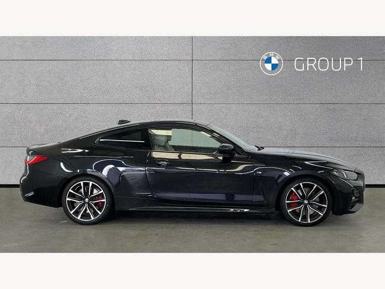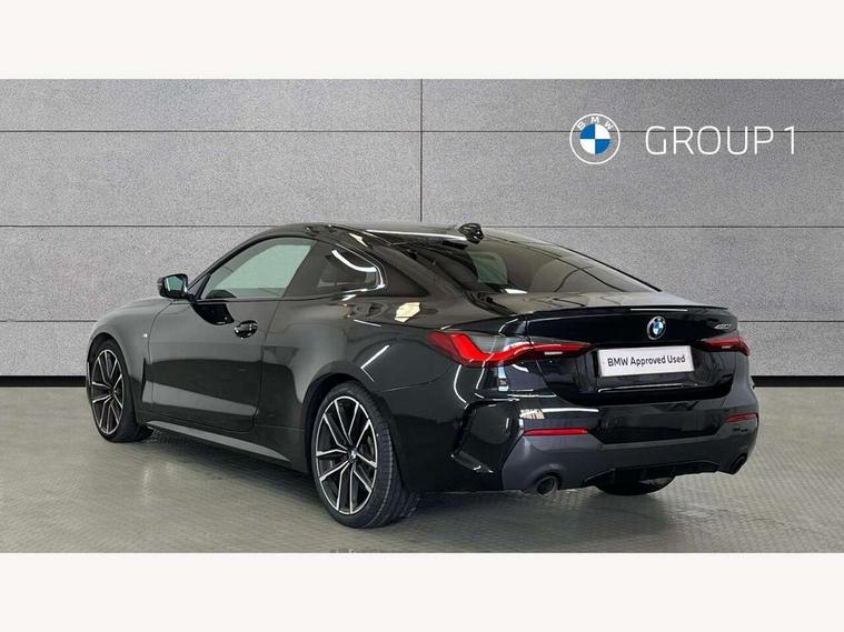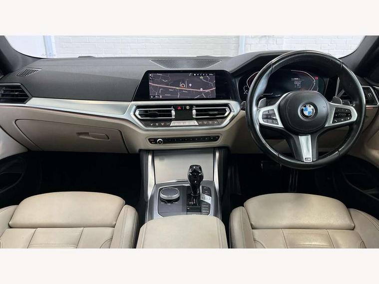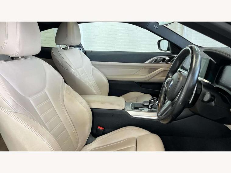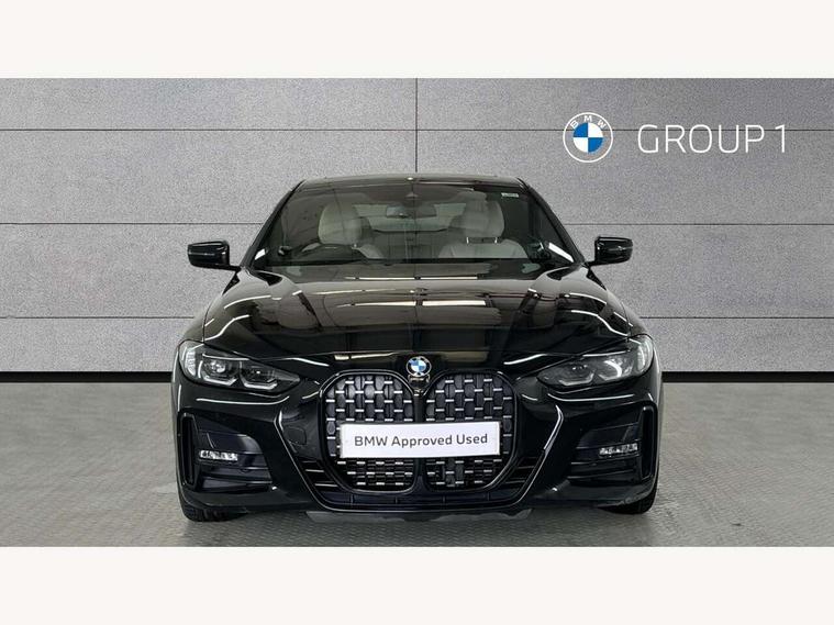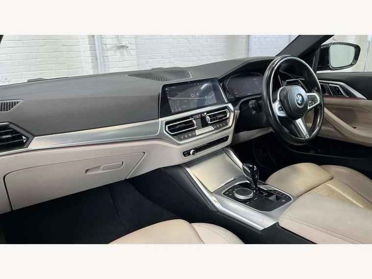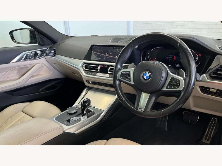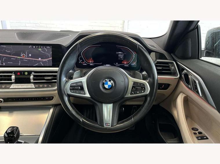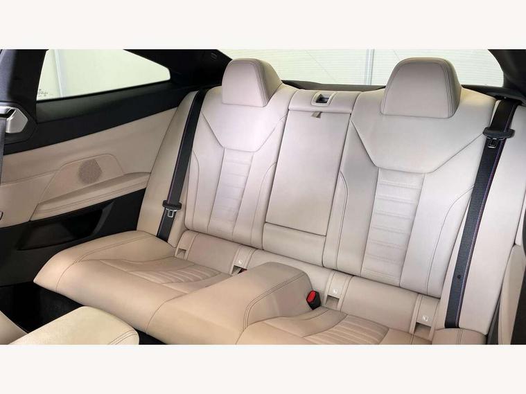 Active guard plus, Attentiveness assist, Auto start-stop, Bluetooth hands free facility with USB audio interface with audio streaming, BMW ConnectedDrive online services, BMW iDrive controller on centre console, BMW Live Cockpit Professional Nav with 12.3" instrument display + 10.25" display, Intelligent Voice Assist, BMW OS 7, HDD, 2USB, 4G LTE connect, BMW service history, BMW Teleservices, Brake pad wear indicator in front and rear, Check Control warning system for monitoring of lights and door/luggage compartment open warning, Condition based service, Cruise control with brake assist, Electric power steering with Servotronic steering optimised at all speed ranges, Gearshift time display in manual mode, Instrument cluster with speedometer with mph readout, tachometer, fuel gauge and oil temperature gauge, Integrated owners handbook, Oil sensor for level and grade, warning by check control system, On board computer - average speed, fuel consumption, outside temp display with acoustic warning, clock/date, service interval, odometer/trip meter, Optimum shift indicator, Variable sport steering, 8 speed automatic steptronic transmission with gearshift paddles, Balanced 50/50 weight distribution, Double VANOS, Drive performance control - ECO PRO, comfort and sport modes, High precision injection, Low centre of gravity, M sport suspension, Petrol Particulate Filter, Stroke dependent dampers, VALVETRONIC engine management, DAB tuner, Electronic service booklet, Acoustic glazing, Automatic headlight beam throw control with load dependent regulating reaction, dynamic compensation of braking dive and acceleration squat, Automatic windscreen wipers and automatic headlight, Automatically dimming electrochromatic rear view mirror, BMW emblem on engine compartment lid and tailgate, BMW kidney grille with mesh grille front side of the nuggets in matt aluminium and frame in chrome high gloss, Body colour fuel filler flap, Body colour M sport rear spoiler, Body colour roof fin, Brushed aluminium inserts in the front door sill finishers with BMW designation, Dynamic brake lights, Electric windows - front and rear, with open/close fingertip control, anti trap facility and comfort closing function all round, Exhaust tailpipe - split left and right, Exterior mirrors - electrically folding with anti-dazzle, Fading support, Front and rear bumper system, Front apron plastic in body colour, Green tinted heat protection glazing, High gloss shadow line exterior trim, Illuminated bow type door handles in body colour drivers side with door lock, Interior rear view electrochromatic mirror with automatic anti dazzle function, LED front fog lights, Licence plate panel integrated into front bumper and tailgate, Lightweight engineering, M designation on front side panels, left and right, M rear boot spoiler, Model designation on right side of tailgate, One piece front bumper cover including towing eye cover in body colour, Preparation for high beam assistant, Side frame decorative moulding black matt, Two part LED tailights in L-shape with components in smoked glass, brake light, LED turn indicator and rear fog light, Visible VIN plate, Welcome lights in interior and door handle area, Widened track and increased camber values for max transverse dynamics, agility and steering precision, Window recess cover black high gloss, Windscreen wipers with integrated washing jets, 12V power socket in front centre console, 2 front cupholder in centre console with clamping elements and matt black inlay, 2 Rear seat headrests, 3 spoke M sport leather multifunction steering wheel, 3 zone automatic air conditioning, 4 pieces lashing eyelets in luggage compartment, 40:20:40 split folding rear seat and rear centre armrest with two cupholders, Ambient lighting with welcome carpet light, Anthracite headlining, Armrest integrated in front and rear door trim + front centre console armrest, Four grab handles integrated in roof lining, Front and rear door exit lighting (left / right), Front and rear door pockets, Front and rear footwell lights, Front and rear reading lights, Front headrests, Front seat backrest width adjustment, Front sport seats, Heated driver and front passenger seats, Height adjustable mechanically and infinitely variable steering column, Illuminated armrest storage compartment, Illuminated glove compartment with separate small compartment, Luggage compartment light, Make-up mirror lights, Storage compartment in rear centre console, Sunvisors with vanity mirrors and ticket pocket, Toolkit located in luggage compartment, Velour front floor mats, Vernasca leather upholstery, Connected professional package - 4 Series, M sport exterior styling pack - 4 Series, Park assist pack - 4 Series, 2 x 3-point rear seatbelts, Battery safety cut-off, BMW emergency call, Brake energy regeneration, Braking pre-tensioning, Child proof locking system in rear door, Child seat ISOFIX attachment for the two outer rear seats, Coasting in idle in ECO PRO mode, Cornering brake control (CBC), Crash sensor activating of airbags, Unlocking doors, hazard warning lights, fuel cut off, interior lighting+activation of safety battery terminal clamp, Driver and front passenger side airbags, integrated in the door side seat backrest bolsters for all seat variants, Driver/Front Passenger airbags, Dry braking, Dynamic brake control, Dynamic stability control + (DSC+) - Anti-lock Braking System (ABS) with brake assist and cornering brake control + Automatic Stability Control (ASC), Dynamic Traction Control - DTC, Electric parking brake including automatic hold function and automatic release of the parking brake when driving off, Electronic differential lock control (EDLC), Front and rear ventilated brake disc, Front passenger manual airbag deactivation, Head airbags for all 4 outer seats, Hill start assistant, Seat belt security check for driver and front passenger, Seat belt with belt stopper, pyrotechnic belt tensioners and belt force limiters, Side impact p