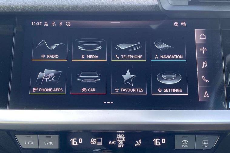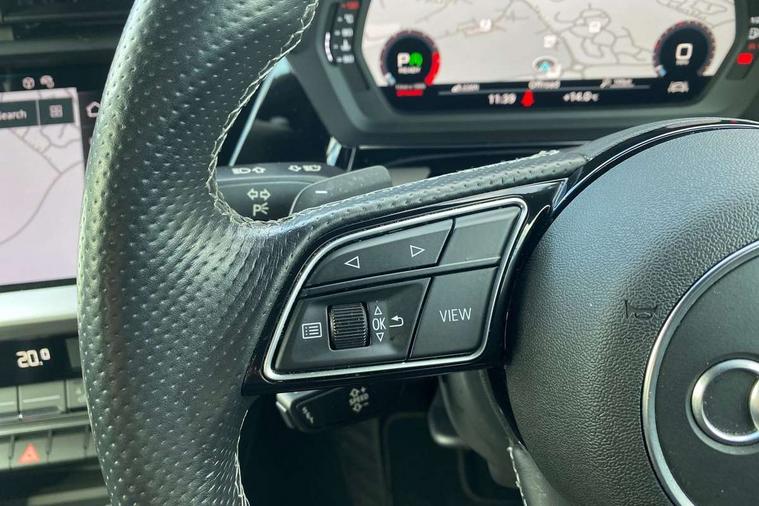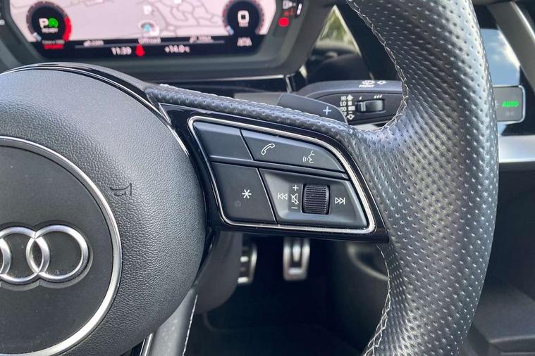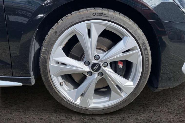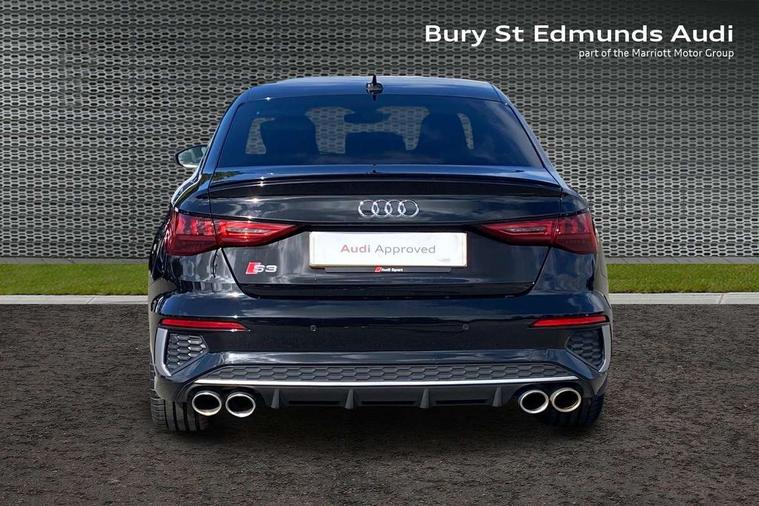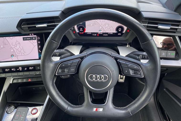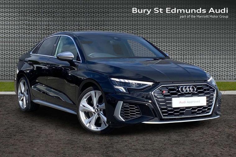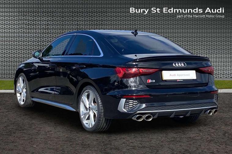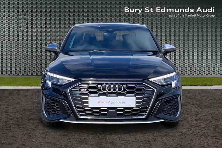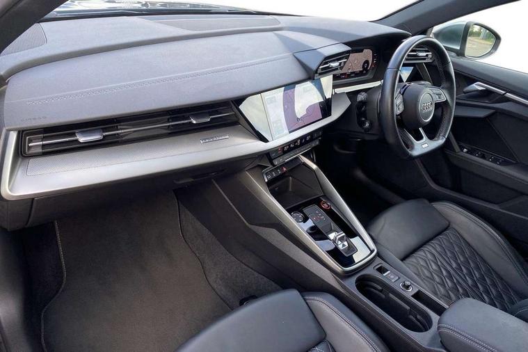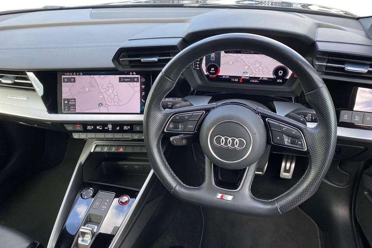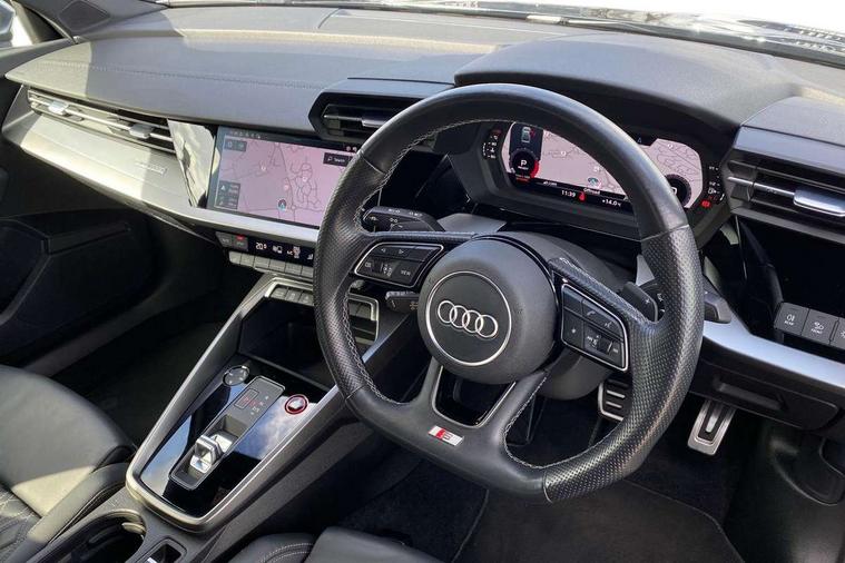 Audi connect emergency call and service, Audi drive select (Auto, Comfort, Dynamic, Efficiency and Individual), Audi smartphone interface, Audi Virtual Cockpit - 10.25" digital and colour instrument cluster, Automatic start/stop system with recuperation, Bluetooth interface, Collision avoidance assistant, Lane departure warning system, MMI Navigation Plus with high resolution 10.1" colour touch screen display, Progressive steering, Service indicator, Voice control system with natural language interaction, Quattro permanent all wheel drive, S sport suspension with spring damper adjustment and lowering by 15mm, 2x USB Type C ports (for charging and data transfer), 6 passive loudspeakers, CD player, DAB Digital radio, Acoustic glass windscreen, Audi Beam uses LEDs to project the Audi logo onto the ground as you exit your S3, Auto dimming frameless rear view mirror, Dual branch oval twin tailpipes in chrome plated finish, Electrically adjustable/heated/folding/auto dimming door mirrors with integrated LED indications + kerb view function for passenger side, Front electric windows, Headlight washers, Illuminated door sills with aluminium inserts at the front with S logo, LED daytime running lights, LED headlights with LED rear lights and dynamic rear indicators, Light and rain sensors, Model and engine designation badges at rear, Privacy glass - dark tinted rear window, rear door and side windows, Rear electric windows, 12V socket and storage compartment in front centre console, 40/20/40 split folding rear seat bench with cupholder, Black cloth headlining, Dual zone electronic climate control, Front and rear centre armrest in leather, Front and rear headrests, Front/rear floor mats, Heated front seats, Height and reach adjustable steering wheel, Interior lighting - glove compartment light and right hand side, Luggage compartment floor covering, Manual boot compartment lid, Seat side bolsters, Stainless steel pedals and front footrest, Body styling design pack - S3, Storage pack - A3/S3 Saloon, 3x3 point rear seat belts, Driver and front passenger airbag with passenger airbag deactivation, Electronic Stabilisation Control (ESC) including ABS, ASR and EDL, First aid kit with warning triangle and 2 safety vests, Front side airbags with head airbags and interaction airbag, Hill hold assist, Pre-sense front with pedestrian and cyclist detection, Seatbelt monitoring, Tyre pressure loss indicator, Anti theft alarm, Anti-theft wheel bolts, Electronically operated child lock, Immobiliser, Remote control central locking, Aluminium air vent surrounds, Aluminium trim elements, Dark spectrum aluminium inlays, accent surfaces in the dashboard and centre console in platinum grey silk effect paint finish,