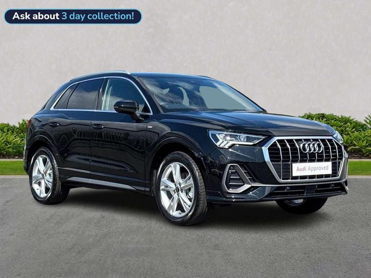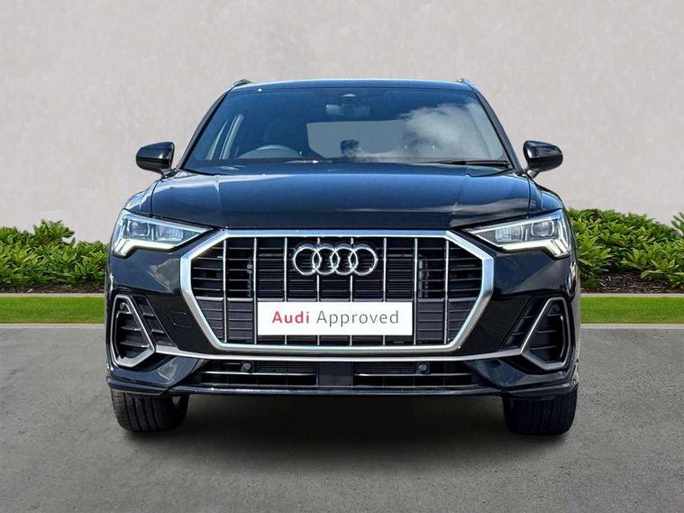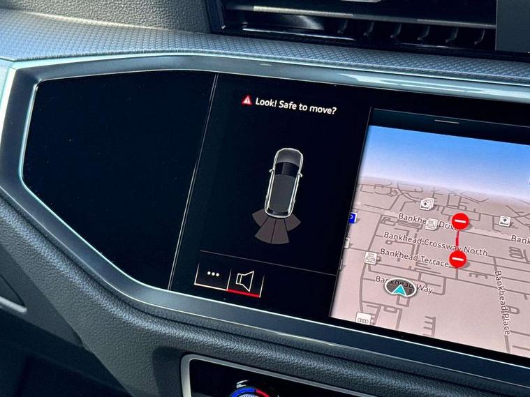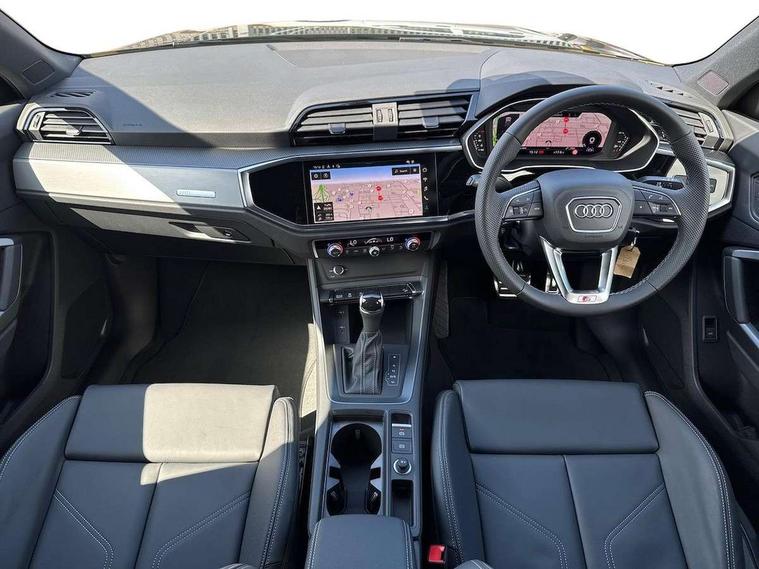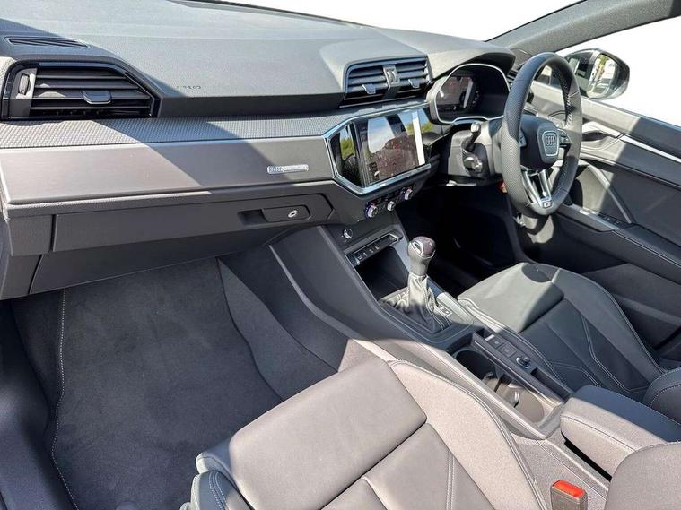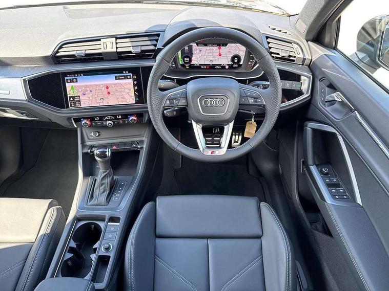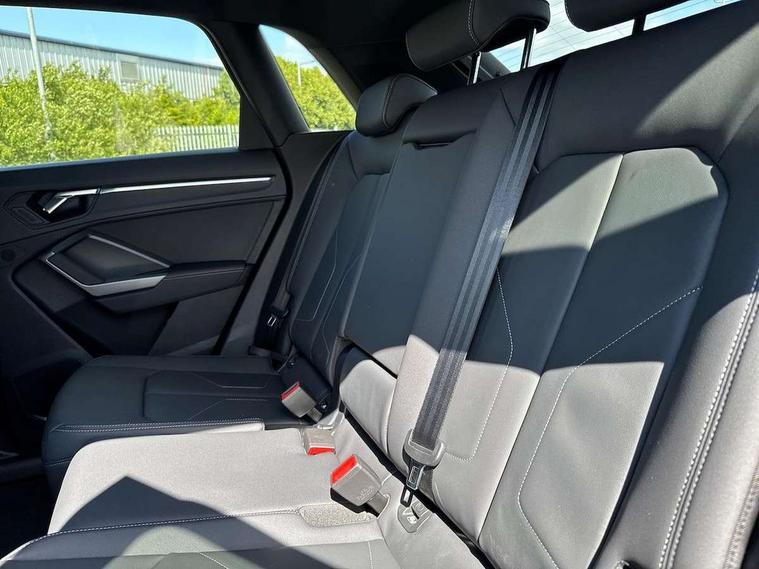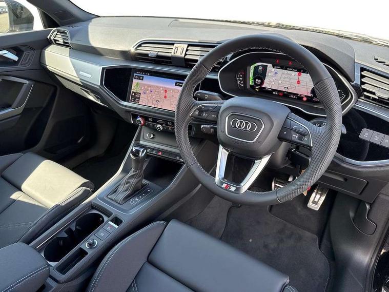 Amazon alexa Integration, Audi connect safety and service, Audi drive select, Audi lane departure warning, Audi Virtual Cockpit - 10.25" display, Bluetooth interface, Camera based traffic sign recognition, Distraction and Fatigue warning, Legal emergency call, MMI Navigation Plus with high resolution 10.1 inch touchscreen colour display, Power operated tailgate, Progressive steering, Service interval indicator, Smartphone interface includes wireless Apple carplay/Android Auto, Start stop system with recuperation, Voice control system with natural language interaction, Sports suspension, 2 USB-C ports with charge and data functions, 6 passive loudspeakers, DAB digital radio module, Acoustic windscreen, Aluminium roof rails, Aluminium window trim, Anthracite black radiator grille, Auto dimming door mirrors, Auto dimming frameless rear view mirror, Body colour front spoiler blade, Electrically folding, adjustable and heated door mirrors with integrated LED side indicators and kerb view function for passenger side, Front and rear electric windows, Front fog lights, Front side air inlets in matt platinum grey, Grille vertical bars in aluminium silver/Matt, High gloss black finish B and C pillars, LED Dynamic rear indicators, LED headlights with LED daytime running lights, LED rear lights, LED third brake light, Privacy glass dark tinted rear and rear-side windows (from B-pillar backwards), Rain and light sensors, Rear diffuser grille in grained matt black, Rear diffuser strip in matt anthracite black, Rear side wing doors, Rear wiper, S line badges on front wings, S Line front and rear bumpers and side skirts, Side skirt insert in matt Platinium grey, Variable front intermittent wipers, 12V socket in rear centre console, 3 seat bench in 2nd row, 3 spoke leather multifunction steering wheel features S badging and grips in perforated leather with contrast stitching, 40:20:40 folding with manual adjustment for 60:40 forwards/backwards position and backrest angle, Adjustable rear seat bench/backrest with centre armrest and cupholder, Black carpet mats, Black cloth headlining, Dual zone electronic climate control, Electric lumbar support, Front and rear black floor mats with contrast stitching in rock grey, Front and rear headrests, Front centre armrest, Height and reach adjustable steering wheel, Horizontal trim strip in matt platinum grey, Illuminated door sill trims with S logo, ISOFIX child seat mounting for front passenger with airbag deactivation and outer rear seat including top tether attachment point for outer rear seats, Luggage compartment sill protection in stainless steel, Manual front seats with height adjustment, Perforated leather gearknob, Single front passenger seat, Stainless steel pedals, Twin leather upholstery with front sport seats + S embossing, Non smoking pack - Q3, 3x3 point rear seatbelts, 6 airbags - Driver, front passenger, curtain and side windows, Audi pre-sense front with pedestrain and cyclist recognition, Electrically operated child locks on rear doors, Electromechanical parking brake, Electronic stabilisation control including ABS, ASR and EDL, Front seatbelt reminder, Hill descent control, Hill hold assist, Pre sense basic, Seatbelt monitoring, Tyre pressure warning, Warning triangle and first aid kit, Anti theft wheel bolts, Immobiliser, Remote central locking, Thatcham approved category 1 anti theft alarm, Aluminium look interior elements, Dark matt brushed aluminium inlay, Detail dashboard around MMI touch colour display in glass look, black with surround in aluminium look, Leatherette door armrest,
