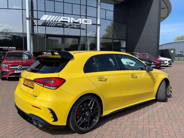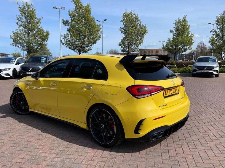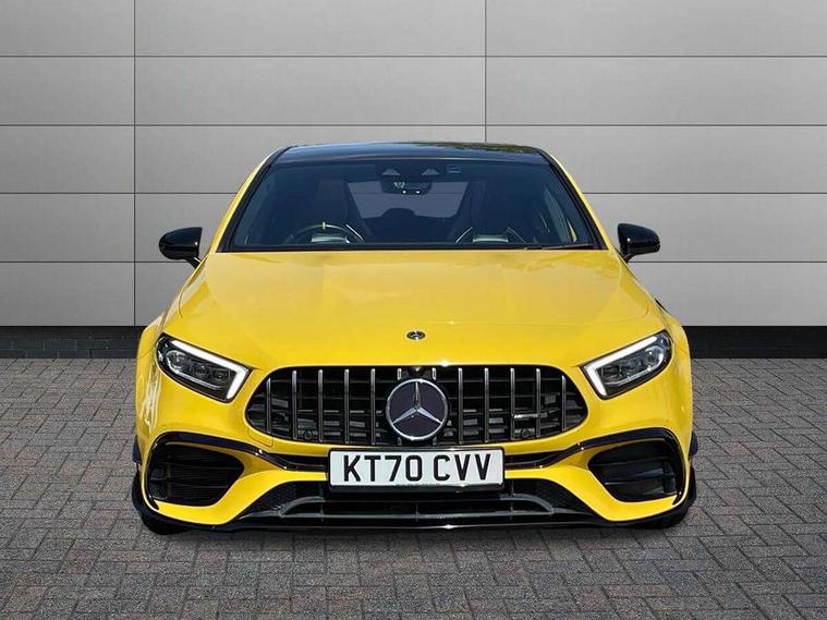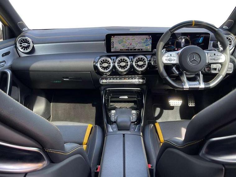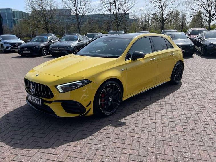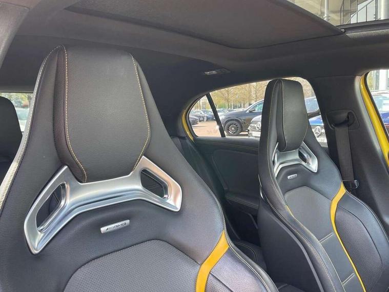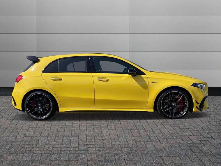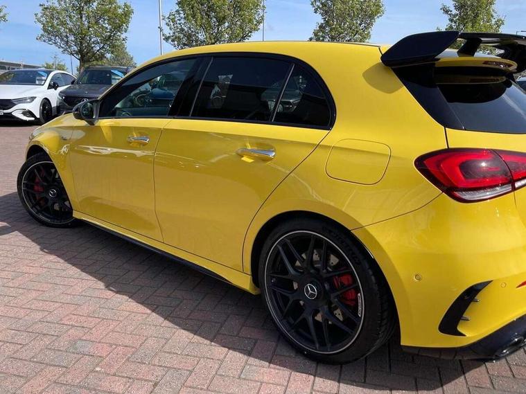 10.25 inch touchscreen central media display with AMG specific, AMG start up logo, visualisation of the AMG drive programs, vehicle and engine data, 10.25" Digital instrument cluster display screen, 180 degree rear view camera with parking guidelines, Active parking assist with visual and audible warning of detected obstacles, AMG DYNAMIC SELECT with driving programs (Slippery, Comfort, Sport, Sport+, Individual and Race) including drift mode via steering wheel shift paddles, AMG track pace, Attention assist, Brake pad wear indicator warning light, Car wash mode, Direct steering, Dual bluetooth interfaces, ECO start/stop function, Fluid level warning indicator for fuel, oil, coolant and washer fluid, Hard-disk navigation, Hey Mercedes Voice activation, Lamp failure indicator, MBUX augmented reality for navigation, Mercedes me connect including emergency call system, accident recovery, breakdown and maintenance management, Mercedes me remote services, Outside temperature gauge, Owners manual in English, Pre-installation for private car sharing, Preinstallation for Mercedes Benz link, Service indicator (ASSYST), Smartphone integration with Apple CarPlay and Android auto, Speed sensitive power steering, Traffic sign assist, Trip computer, Ultrasonic sensors positioned in the front and rear bumpers, Wireless charging, AMG performance 4MATIC+ with torque control, Rear axle multi-link, 2 USB ports (type C) in rear stowage compartment and one in front of center console, Burmester surround sound system - 590W, DAB Digital radio, MBUX multimedia system with DAB digital radio and touchpad including satellite navigation, 4 Electric Front and Rear windows, Adaptive brake lights, AMG A45 S bodystyling -rear apron, four vertical fins, side sill panels, roof spoiler lip, specific front apron, diffuser look and S label on boot lid, AMG bodystyling - Front apron with splitter in chrome, rear apron with chrome trim and chrome visible trim elements in tailpipe, AMG real performance exhaust sound system, AMG specific radiator grille in high gloss chrome with AMG lettering, Black weather strip, Body colour bumpers, Body colour door handles, Body colour side skirt, Electric adjustable and heated door mirrors with integrated LED side indicators, Headlamp assist automatic headlamp activation, Heated glass rear windscreen + timer control, High gloss black beltline, LED High level third brake light, LED tail lamp, Multibeam LED with adaptive highbeam assist plus, Panoramic sliding sunroof, Privacy glass, Radio aerial, Rain sensing windscreen wipers with two sensitivity settings, Rear fog lights, Rear wiper, Two round twin tailpipe trim elements each measuring 90 mm in diameter and AMG lettering plus ribbing on the inside of the pipe, Valve control dependent on drive program, Wider wheel arches for AMG wheels, 3 Spoke flattened lower section sporty design AMG Performance steering wheel in nappa leather/Dinamic microfibre, 40:20:40 split folding rear seats, AMG brushed stainless steel sports pedals with rubber studs, AMG centre console finished with trim in silver chrome, AMG floor mats, AMG performance seats, AMG sporty centre console with raised front section and integral control switched for manual transmission mode, AMG Steering wheel touch control buttons, Auto Mercedes-Benz child seat recognition sensor, Black air vents with surround in silver chrome, Black roof lining, Front centre armrest with storage compartment, Front seat cushion length adjustment, Front seat head restraints, Heated front seats, Height/reach adjustable steering column, Illuminated front door sills with changeable cover, Interior lighting - 64 colour Ambient lighting, Interior mirror with reading lamps in black and frameless, Rear armrest with 2 cupholders, Rear head restraints, Seat occupancy sensor for front passenger seat, Silver coloured aluminium gear shift paddles on steering wheel, Stowage compartment in centre console with retractable cover, Sunvisors with illuminated vanity mirrors, Touchpad on center console, Twin front cupholders, Two zone thermotronic luxury automatic climate control, Aerodynamic pack - A Class, AMG Driver's pack - A Class, AMG night pack - A Class, AMG performance high-end seat pack - A Class, Light and sight pack - A Class, Mirror package - A Class, Multi-contour seat pack - A Class, Seat comfort pack - A Class, 3 rear 3 point seatbelts, 3 stage electronic stability programme, ABS with Brake Assist, Active bonnet, Adaptive brake assist with hold function and hill start assist, AMG high performance brake system with red painted brake callipers and black AMG lettering at the front, ventilated and perforated brake discs, Black seatbelts, Bonnet with power domes, Childproof locks manually operated for rear doors and electrically operated for rear power windows, Crash responsive emergency lighting, Driver and passenger head and side airbags, Drivers knee airbag, Dual stage driver/passenger airbags, Electronic parking brake, ESP curve dynamic assist, ESP with ASR, Front and rear seatbelt reminder, ISOFIX and top tether child seat fixing points in two outer rear seats, Tyre pressure monitoring system, Warning triangle and first aid kit, Window airbags, Alarm system/interior protection/immobiliser, Keyless entry lock/unlock, Keyless Go, Remote central locking and crash sensor with emergency opening function, Urban guard vehicle protection system with immobiliser and interior protection, Light aluminium with longitudinal grain interior trim, 19" AMG forged cross spoke design alloy wheels, Summer tyres, Tirefit sealant kit, Wheel arches with flared AMG wings with TURBO 4MATIC+ lettering,