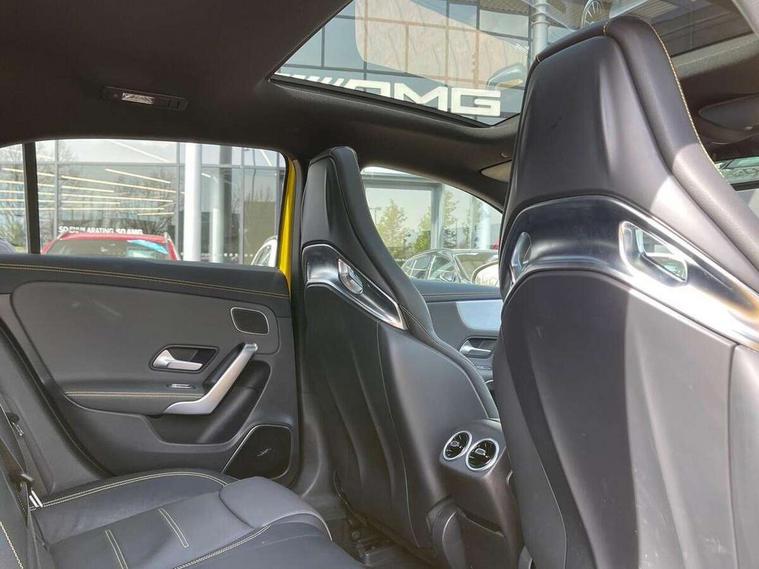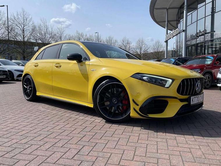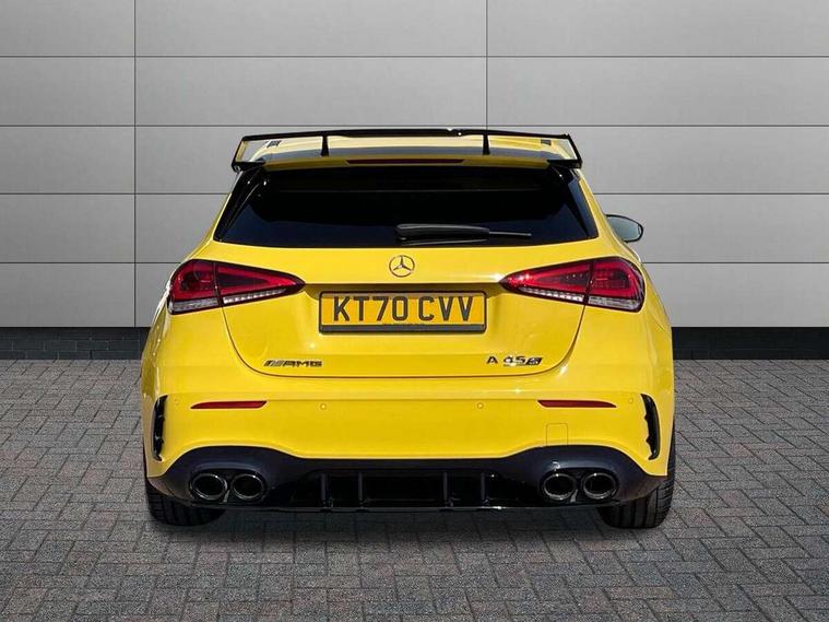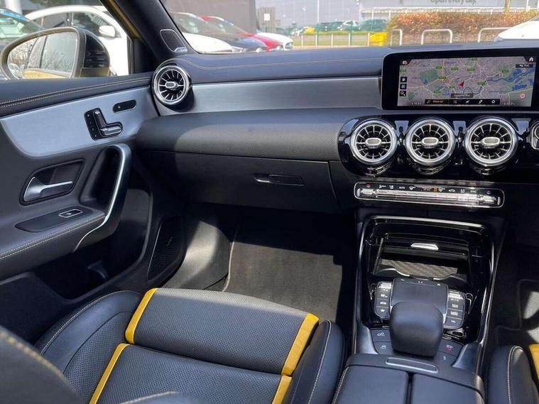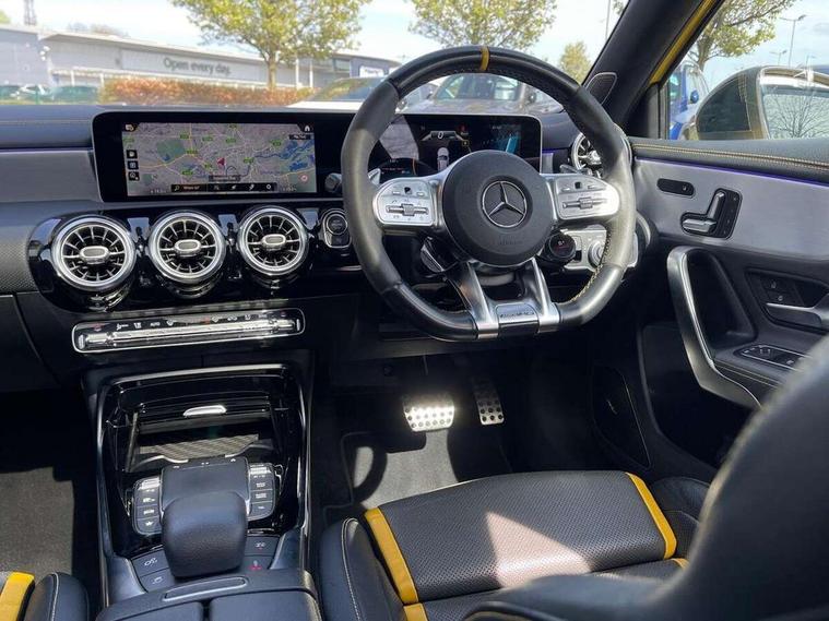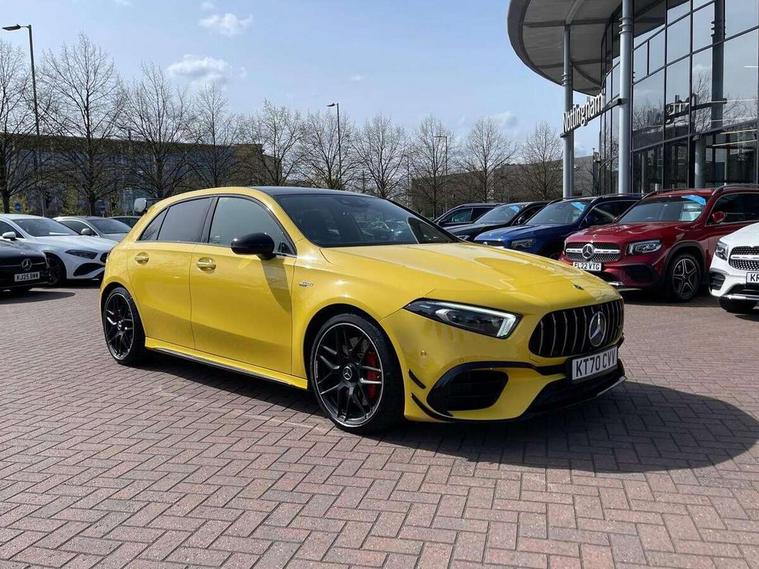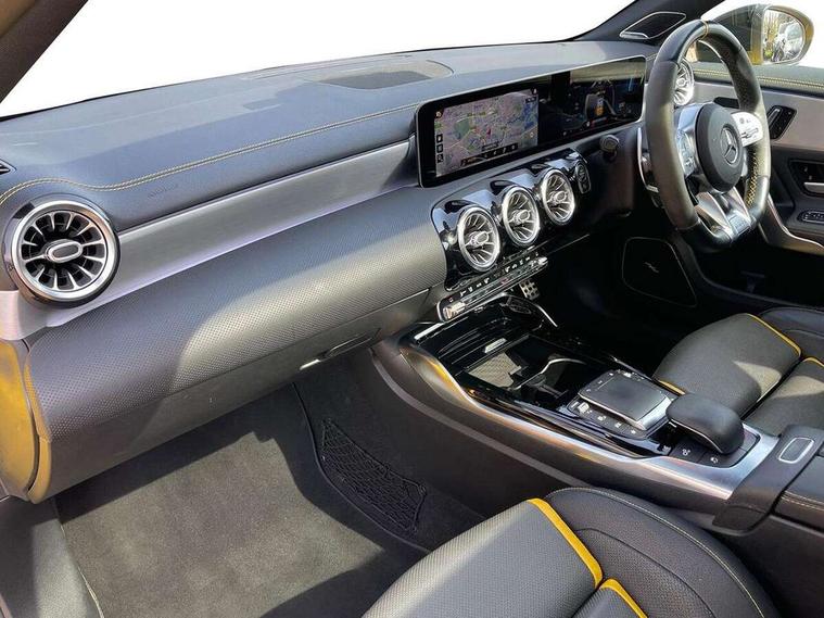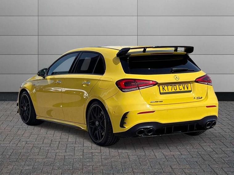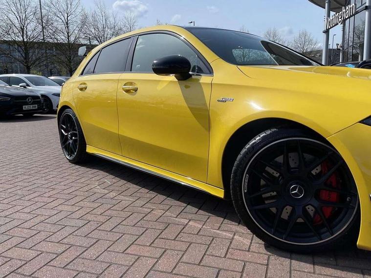 10.25 inch touchscreen central media display with AMG specific, AMG start up logo, visualisation of the AMG drive programs, vehicle and engine data, 10.25" Digital instrument cluster display screen, 180 degree rear view camera with parking guidelines, Active parking assist with visual and audible warning of detected obstacles, AMG DYNAMIC SELECT with driving programs (Slippery, Comfort, Sport, Sport+, Individual and Race) including drift mode via steering wheel shift paddles, AMG track pace, Attention assist, Brake pad wear indicator warning light, Car wash mode, Direct steering, Dual bluetooth interfaces, ECO start/stop function, Fluid level warning indicator for fuel, oil, coolant and washer fluid, Hard-disk navigation, Hey Mercedes Voice activation, Lamp failure indicator, MBUX augmented reality for navigation, Mercedes me connect including emergency call system, accident recovery, breakdown and maintenance management, Mercedes me remote services, Outside temperature gauge, Owners manual in English, Pre-installation for private car sharing, Preinstallation for Mercedes Benz link, Service indicator (ASSYST), Smartphone integration with Apple CarPlay and Android auto, Speed sensitive power steering, Traffic sign assist, Trip computer, Ultrasonic sensors positioned in the front and rear bumpers, Wireless charging, AMG performance 4MATIC+ with torque control, Rear axle multi-link, 2 USB ports (type C) in rear stowage compartment and one in front of center console, Burmester surround sound system - 590W, DAB Digital radio, MBUX multimedia system with DAB digital radio and touchpad including satellite navigation, 4 Electric Front and Rear windows, Adaptive brake lights, AMG A45 S bodystyling -rear apron, four vertical fins, side sill panels, roof spoiler lip, specific front apron, diffuser look and S label on boot lid, AMG bodystyling - Front apron with splitter in chrome, rear apron with chrome trim and chrome visible trim elements in tailpipe, AMG real performance exhaust sound system, AMG specific radiator grille in high gloss chrome with AMG lettering, Black weather strip, Body colour bumpers, Body colour door handles, Body colour side skirt, Electric adjustable and heated door mirrors with integrated LED side indicators, Headlamp assist automatic headlamp activation, Heated glass rear windscreen + timer control, High gloss black beltline, LED High level third brake light, LED tail lamp, Multibeam LED with adaptive highbeam assist plus, Panoramic sliding sunroof, Privacy glass, Radio aerial, Rain sensing windscreen wipers with two sensitivity settings, Rear fog lights, Rear wiper, Two round twin tailpipe trim elements each measuring 90 mm in diameter and AMG lettering plus ribbing on the inside of the pipe, Valve control dependent on drive program, Wider wheel arches for AMG wheels, 3 Spoke flattened lower section sporty design AMG Performance steering wheel in nappa leather/Dinamic microfibre, 40:20:40 split folding rear seats, AMG brushed stainless steel sports pedals with rubber studs, AMG centre console finished with trim in silver chrome, AMG floor mats, AMG performance seats, AMG sporty centre console with raised front section and integral control switched for manual transmission mode, AMG Steering wheel touch control buttons, Auto Mercedes-Benz child seat recognition sensor, Black air vents with surround in silver chrome, Black roof lining, Front centre armrest with storage compartment, Front seat cushion length adjustment, Front seat head restraints, Heated front seats, Height/reach adjustable steering column, Illuminated front door sills with changeable cover, Interior lighting - 64 colour Ambient lighting, Interior mirror with reading lamps in black and frameless, Rear armrest with 2 cupholders, Rear head restraints, Seat occupancy sensor for front passenger seat, Silver coloured aluminium gear shift paddles on steering wheel, Stowage compartment in centre console with retractable cover, Sunvisors with illuminated vanity mirrors, Touchpad on center console, Twin front cupholders, Two zone thermotronic luxury automatic climate control, Aerodynamic pack - A Class, AMG Driver's pack - A Class, AMG night pack - A Class, AMG performance high-end seat pack - A Class, Light and sight pack - A Class, Mirror package - A Class, Multi-contour seat pack - A Class, Seat comfort pack - A Class, 3 rear 3 point seatbelts, 3 stage electronic stability programme, ABS with Brake Assist, Active bonnet, Adaptive brake assist with hold function and hill start assist, AMG high performance brake system with red painted brake callipers and black AMG lettering at the front, ventilated and perforated brake discs, Black seatbelts, Bonnet with power domes, Childproof locks manually operated for rear doors and electrically operated for rear power windows, Crash responsive emergency lighting, Driver and passenger head and side airbags, Drivers knee airbag, Dual stage driver/passenger airbags, Electronic parking brake, ESP curve dynamic assist, ESP with ASR, Front and rear seatbelt reminder, ISOFIX and top tether child seat fixing points in two outer rear seats, Tyre pressure monitoring system, Warning triangle and first aid kit, Window airbags, Alarm system/interior protection/immobiliser, Keyless entry lock/unlock, Keyless Go, Remote central locking and crash sensor with emergency opening function, Urban guard vehicle protection system with immobiliser and interior protection, Light aluminium with longitudinal grain interior trim, 19" AMG forged cross spoke design alloy wheels, Summer tyres, Tirefit sealant kit, Wheel arches with flared AMG wings with TURBO 4MATIC+ lettering,
