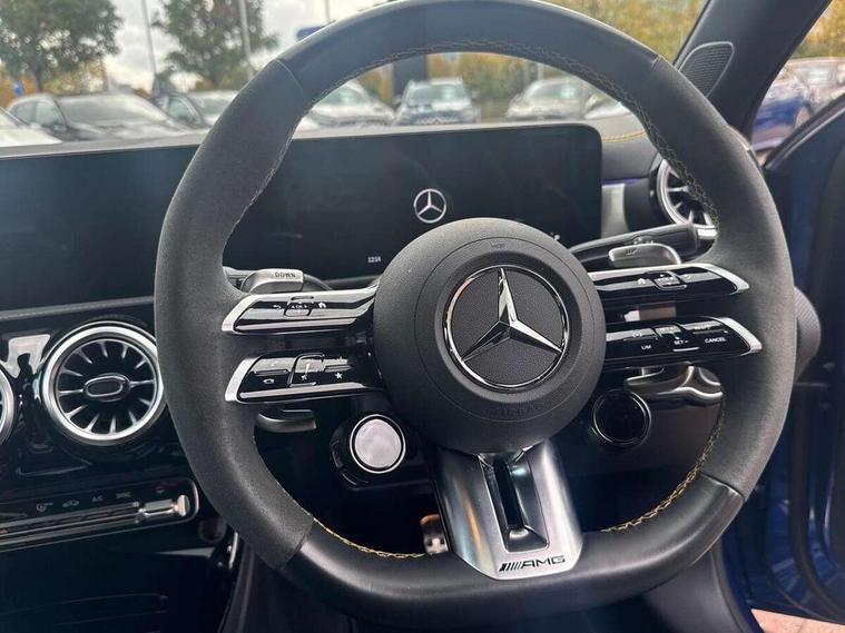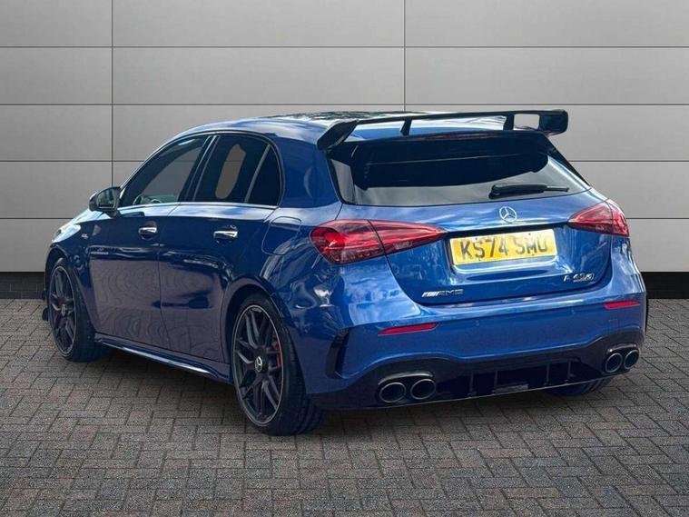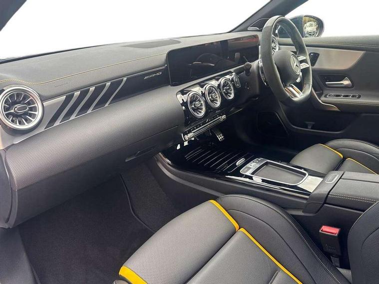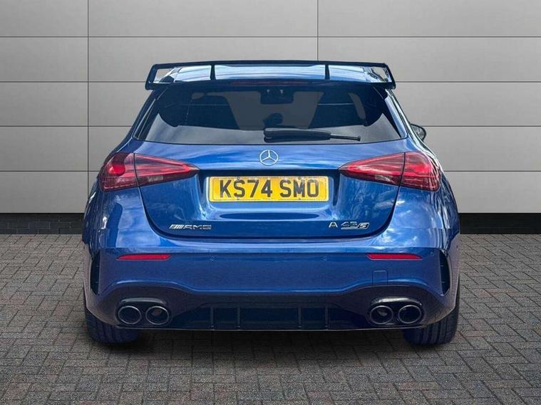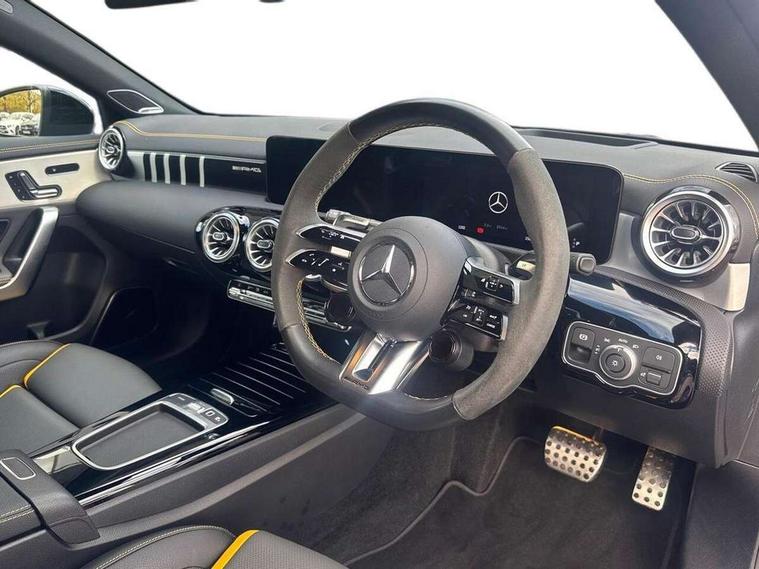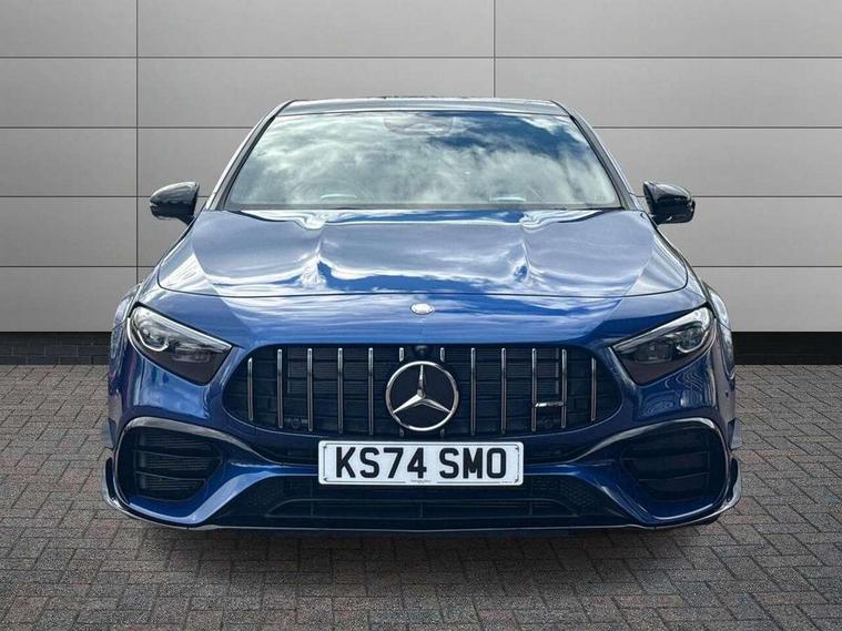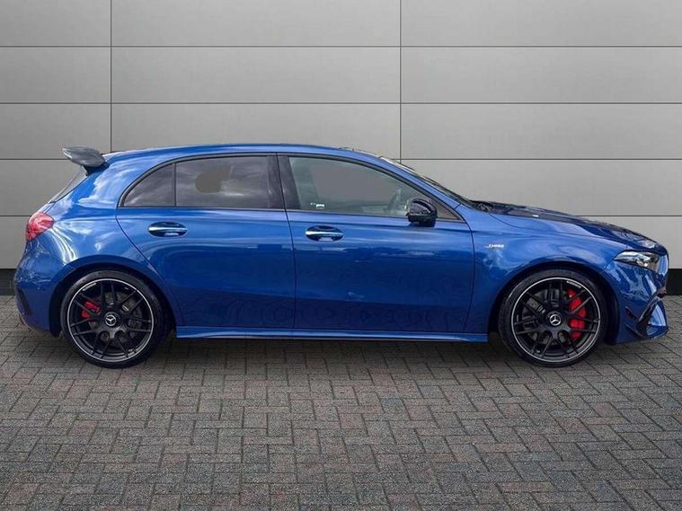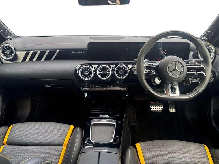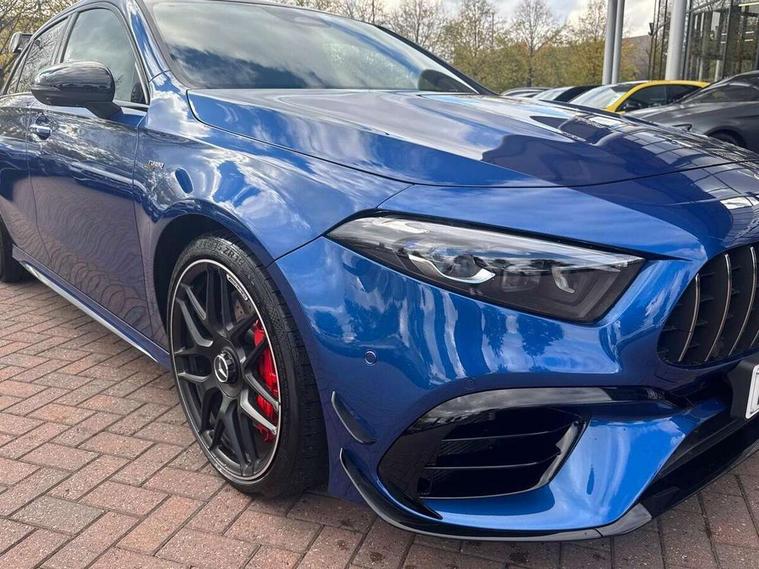 10.25 inch touchscreen central media display with AMG specific, AMG start up logo, visualisation of the AMG drive programs, vehicle and engine data, 10.25" Digital instrument cluster display screen, AMG DYNAMIC SELECT with drive modes(Slippery, Comfort, Sport, Sport+, Individual and Race) incl drift mode via steering wheel shift paddles+Race Start, AMG menu with sporty additional information - Gear indicator with yellow M symbol manual mode, Warm Up menu and Set Up menu, AMG speed sensitive steering with two sets of steering characteristics, Attention assist, Brake pad wear indicator warning light, Car wash mode, Direct steering, Dual bluetooth interfaces, ECO start/stop function, Engine start/stop button, Fingerprint scanner, Fluid level warning indicator for fuel, oil, coolant and washer fluid, Fluorescent jacket for driver, Hard-disk navigation, Head up Display, Hey Mercedes Voice activation, Lamp failure indicator, MBUX augmented reality for navigation, MBUX Interior assistant, Mercedes me connect including emergency call system, accident recovery, breakdown and maintenance management, Mercedes me remote services, Outside temperature gauge, Owners manual in English, Pre-installation of private car share, Preinstallation for Mercedes Benz link, Remote boot closing, Service indicator (ASSYST), Smartphone integration with Apple CarPlay and Android auto, Speed sensitive power steering, Tailgate, Traffic sign assist, Trip computer in multifunction display with current consumption indicator, Wireless charging, AMG performance 4MATIC+ with torque control, AMG suspension including AMG specific axles and sporty spring/damper setup, Suspension with adaptive damping system, Burmester surround sound system (590W) with Dolby atmos, speakers - 1 center+4 doors+2 in C pillars, tweeter, subwoofer, DSP amp, burmester lettering, DAB Digital radio, MBUX multimedia system, 4 Electric Front and Rear windows, Adaptive brake lights, AMG A45 S bodystyling -rear apron, four vertical fins, side sill panels, roof spoiler lip, specific front apron, diffuser look and S label on boot lid, AMG real performance exhaust sound system, AMG specific radiator grille in high gloss chrome with AMG lettering, Beltline strips in High gloss Black, Body colour bumpers, Body colour door handles with chrome inserts, Body colour side skirt, Electric adjustable and heated door mirrors with integrated LED side indicators, Headlamp assist automatic headlamp activation, Heat insulating dark tinted rear and rear side windows, Heated glass rear windscreen + timer control, LED daytime running lights, LED High level third brake light, LED tail lamp, Multibeam LED headlamps with adaptive highbeam assist and cornering function, Panoramic sliding sunroof, Privacy glass, Radio aerial, Rain sensing windscreen wipers with two sensitivity settings, Rear fog lights, Rear side wing doors, Rear windscreen wiper, Surround lighting with logo projection, Two round twin tailpipe trim elements each measuring 90 mm in diameter and AMG lettering plus ribbing on the inside of the pipe, Valve control dependent on drive program, Wider wheel arches for AMG wheels, Window line trim strip in black, 3 seat bench in 2nd row, 3 Spoke flattened lower section sporty design AMG Performance steering wheel in nappa leather/microcut microfibre, 40:20:40 split folding rear seats, Air conditioning - Two zone thermotronic luxury automatic climate control with display, AMG brushed stainless steel sports pedals with rubber studs, AMG centre console finished with trim in silver chrome, AMG floor mats, AMG performance seats, AMG sporty centre console with raised front section and integral control switched for manual transmission mode, AMG steering wheel buttons, Automatic child seat recognition sensor, Black air vents with surround in silver chrome, Black roof lining, Electrically adjustable front memory seats including lumbar support and backrest inclination, Front centre armrest with stowage, Front seat head restraints, Height/reach adjustable steering column, Illuminated AMG front door sills with changeable cover, Interior lighting - 64 colour Ambient lighting, Interior mirror with reading lamps in black and frameless, Rear armrest with 2 cupholders, Rear head restraints, Seat occupancy sensor for front passenger seat, Silver coloured aluminium gear shift paddles on steering wheel, Single front passenger seat, Stowage compartment in centre console with retractable cover, Sunvisors with illuminated vanity mirrors, Twin front cupholders, Aerodynamic pack - A Class, AMG Driver's pack - A Class, AMG night pack - A Class, AMG performance high-end seat pack - A Class, Light and sight package - A Class, Mirror package - A Class, Multi-contour seat pack - A Class, Parking pack with 360 degree camera - A Class, Seat comfort pack - A Class, USB pack plus - A Class, Winter pack - A Class, 3 rear 3 point seatbelts, 3 stage electronic stability programme, ABS with Brake Assist, Active bonnet, Adaptive brake assist with hold function and hill start assist, AMG high performance brake system with red painted brake callipers and black AMG lettering at the front, ventilated and perforated brake discs, Black seatbelts, Bonnet with power domes, Childproof locks manually operated for rear doors and electrically operated for rear power windows, Crash responsive emergency lighting, Driver and passenger head and side airbags, Drivers knee airbag, Dual stage driver/passenger airbags, Electronic parking brake, ESP curve dynamic assist, ESP with ASR, Exit warning, Front and rear seatbelt reminder, ISOFIX and top tether child seat fixing points in two outer rear seats, Tyre pressure monitoring system, Warning triangle and first aid kit, Window airbags, Alarm system/interior protection/immobiliser, Guard 360 degree vehicle protection, Keyless entry lock/unlock, Keyless Go, Remote central locking and crash sensor with emergency opening function, Aluminium AMG design black/silver interior trim, 19" AMG