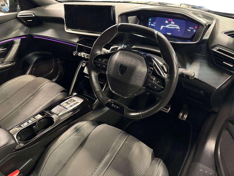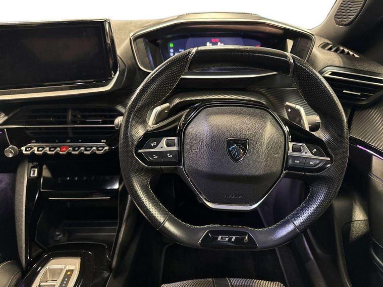 Bluetooth telephone facility, Driver attention warning, E-call, Exterior temperature indicator with ice warning, Multi function trip computer, PEUGEOT i-Cockpit with compact steering wheel, PEUGEOT i-Cockpit with configurable 3D headup instrument panel, PEUGEOT SOS and assistance, Smartphone charging plate, Speed limit recognition and recommendation, Wireless mirror screen with mirror link, apple carplay and android auto, Petrol Particulate Filter, 1x USB-C socket in rear and 1x USB-A socket in rear, 2 USB-C ports in the front, 6 speakers radio with mp3 compatible, DAB Radio (Digital Audio Broadcasting), Voice recognition for radio, navigation and telephony features, 2 X Rear number plate lights, Aluminium door sill scuff plates with peugeot lettering, Automatic hazard light activation upon heavy brake application, Black diamond roof, Black front wing trim with gloss black detail and GT badging, Body coloured exterior door handles, Dark tinted rear side and tailgate windows, Diamond black mirror shells, Diamond black rear roof spoiler, Electric, heated, and power folding door mirrors, Frameless electrochrome interior rear view mirror, Front bumper - Meteor grey lower trim, Full LED headlights with smartbeam assist with auto height adjustment, Gloss black finish on B pillar, Gloss black rear cluster connecting strip, Gloss black roof bars, Gloss black window surround, GT model designation badging on tailgate, Headlights left on audible warning, LED daytime running lights with distinctive 3 claw signature, LED side indicator lights integrated into door mirrors, LED third brake light, Model designation badges front and rear, One touch electric front/rear windows with pinch protection, Radiator grille - body coloured vertical chequered grille, Radiator grille - gloss black top edge trim, Rear full LED 3D peugeot signature claw effect lights with daylight function, Rear reversing lights, Rear side wing doors, Rear windscreen wiper triggered automatically in reverse gear, Tailgate with heated rear windscreen and wiper blade, Twin chromed exhaust pipes, Wheel arch extensions, 1/3 to 2/3 split folding rear seats, 12V socket, 3 seat bench in 2nd row, 8 Colour personalisable ambient lighting, Automatic air conditioning with pollen and active carbon filter, Central front armrest with storage compartment, Driver and front passenger sport seats, Electric power steering with reach and rake adjustable steering column, Front and rear carpet mats in black, Front LED interior light with 2 reading spotlights and rear interior light with timer, Front passenger seat manual adjustment - height, longitudinal and back rest angle, High centre console, ISOFIX child seat mounting points on passenger seat, Mistral full-grain perforated leather steering wheel with Lime Green stitch detail and satin chrome 'GT' emblem, Multifunction steering wheel, Piano keys: Gloss black and chrome toggle switches to access main functions of the vehicle and touchscreen functions, Roof lining - Mistral black, Seatbelt unfastened on the move audible and visual alert for front and rear seats, Single front passenger seat, Two position modular boot floor, Visibility pack - 2008, 2x 2nd row ISOFIX child seat mountings, ABS (Anti-lock Braking System) with EBD (Electronic Brakeforce Distribution) and EBA (Emergency Braking Assistance), Active safety brake with night function/cyclists/pedestrians, Adaptive driver and front passenger airbags with passenger airbag deactivation function, Child locking functionality on rear doors, Driver/front passenger side airbags, Electric parking brake, ESP (Electronic Stability Program) + Hill Start Assist, Front and rear curtain airbags, Front and rear disc brakes, Front and rear three-point retractable seatbelts, with force limiters, Front optimised safety headrests and rear retractable headrests (x3), height adjustable, Tyre pressure sensor, Automatic door locking when moving off, Deadlocks, Electronic code immobiliser, Peugeot Open and Go (keyless entry and push button start), Thatcham category 1 alarm, Carbon effect Dashboard, front and rear door panel finish,