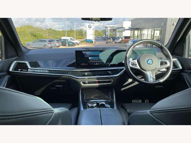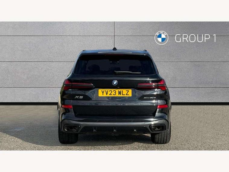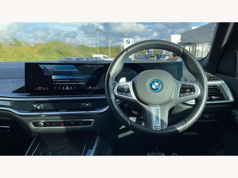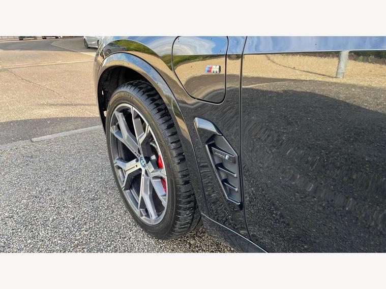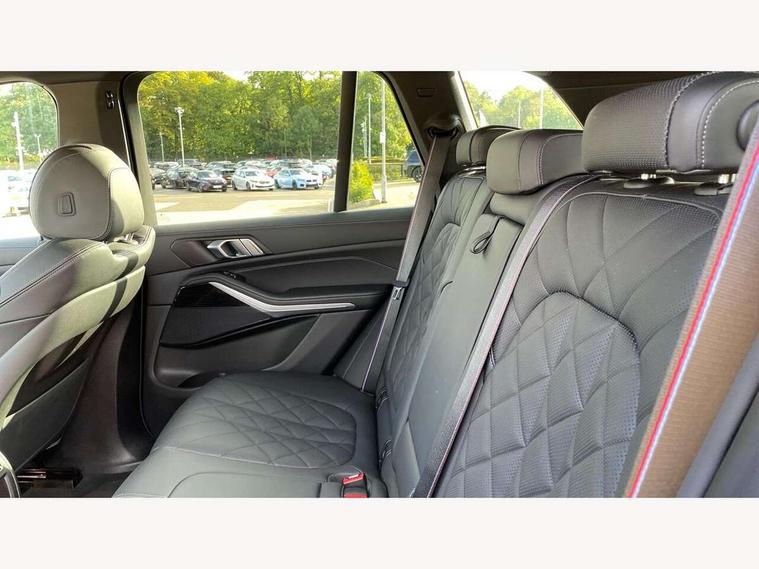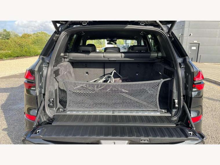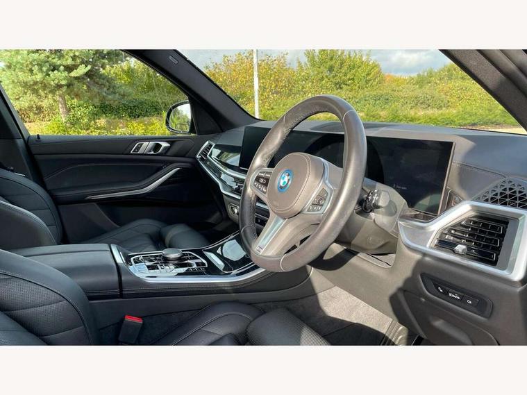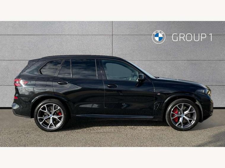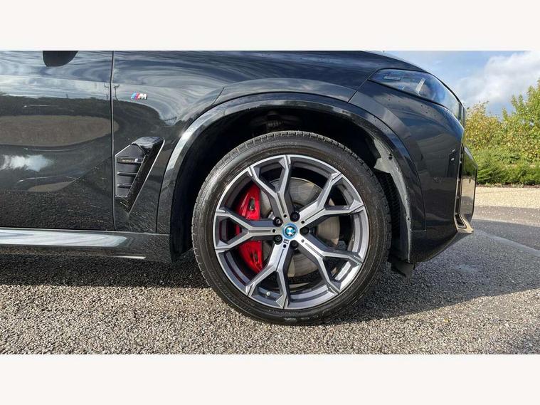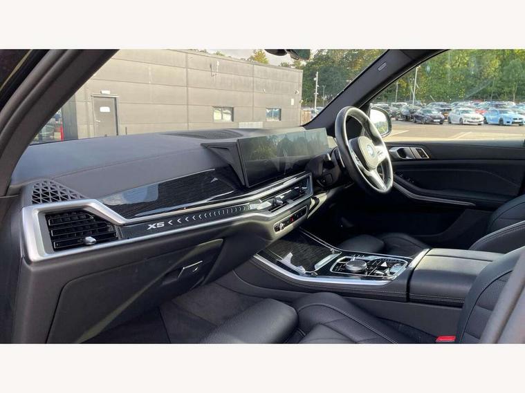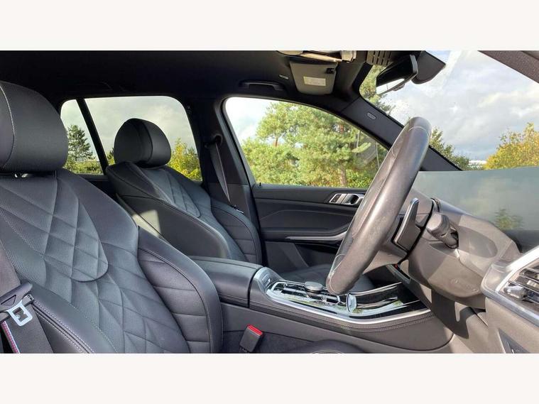 Attentiveness assist, Automatic tailgate operation, BMW ConnectedDrive online services, BMW live cockpit + with curved 12.3 instrument cluster/14.9 central display, nav/Tuner with diversity reception, RDS/4GLTE/remote software upgrade, BMW Teleservices, Condition based service, Cruise control with brake assist, eCall emergency call system, Enhanced bluetooth with wireless charging, Integrated owner's handbook, PAS, Speed limiter, Wi-Fi hotspot, Adaptive 2-axle Front and rear air suspension, Drive performance control with ECO PRO comfort + sport mode, Eight speed steptronic sport automatic transmission and gearshift paddles on the steering wheel, Flexible charger (Mode 2), Hi-Fi loudspeaker system, Adaptive LED Headlights, Front and rear electric windows, High beam assistant, High gloss black shadow line roof rails, LED daytime running lights, Rear side wing doors, Third brake light in rear spoiler, Variable intermittent rear wash/wipe, 12V - Power sockets with 2x centre console and 1x luggage compartment, 3 seat bench in 2nd row, Foldable rear centre armrest with 2 cupholders and storage compartment, Front and rear side armrest integrated into door trim, Headrests for all seats, Luggage compartment separating net, Single front passenger seat, Three spoke sport M leather steering wheel, Velour floormats, Ambient light interior pack - X5, Driving assistant pack with radar based driver assistance system - X5, Expanded exterior mirror pack - X5/X5 M, M aerodynamics pack - X5, 3 rear seatbelts, Acoustic protection for pedestrians, Active protection, Airbags - driver/front passenger, rear and side, first and second row seats head airbags, front passenger seat airbag deactivation + knee airbag, Anti-lock braking system (ABS), Automatic Stability Control (ASC), Brake energy regeneration, Cornering brake control (CBC), Crash sensor activating central locking release, hazard warning lights, fuel cut off, interior lighting + activation of safety battery terminal clamp, DSC - Dynamic Stability Control, Dynamic Traction Control - DTC, Electromechanical parking brake with automatic drive away release and auto hold function, Electronic brake force distribution, Hill start assistant, M Sport blue painted brake calipers with 'M' designation, Mechanical child proof lock on rear doors, Tyre pressure monitoring system, Tyre pressure sensors, Ventilated front and rear disc brakes, Warning triangle and first aid kit, Closing system with central locking, Comfort access system, Locking wheel bolts, Sensatec instrument panel,