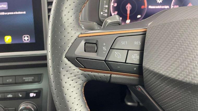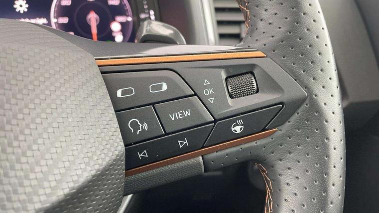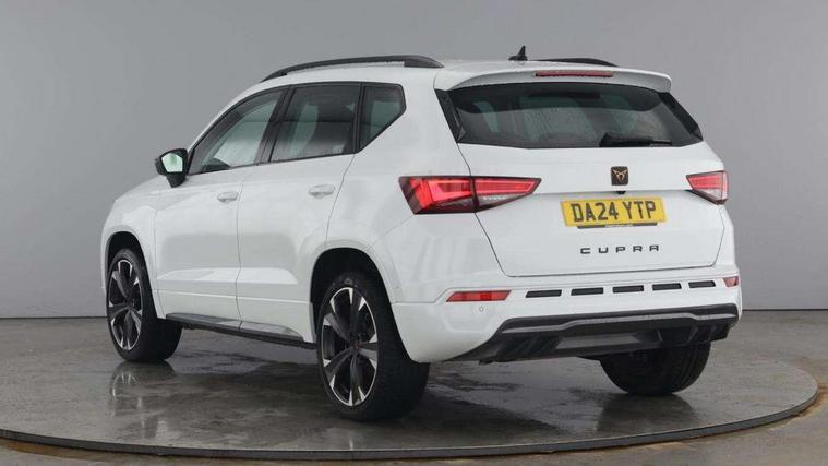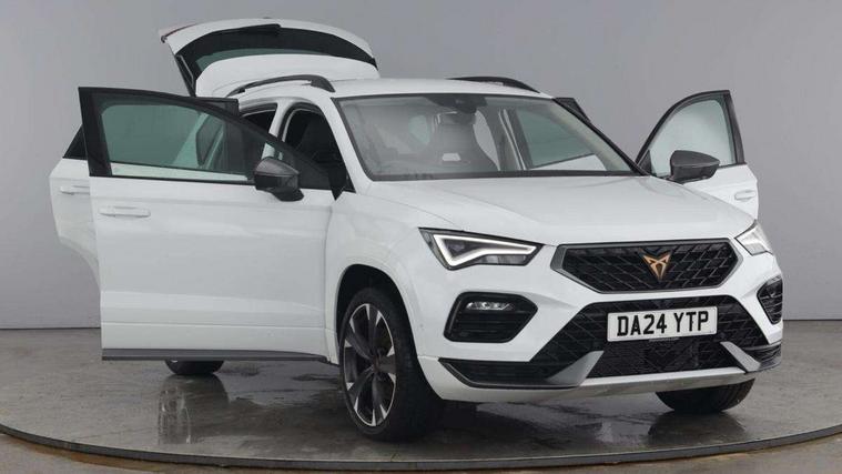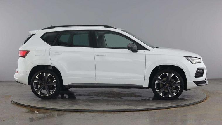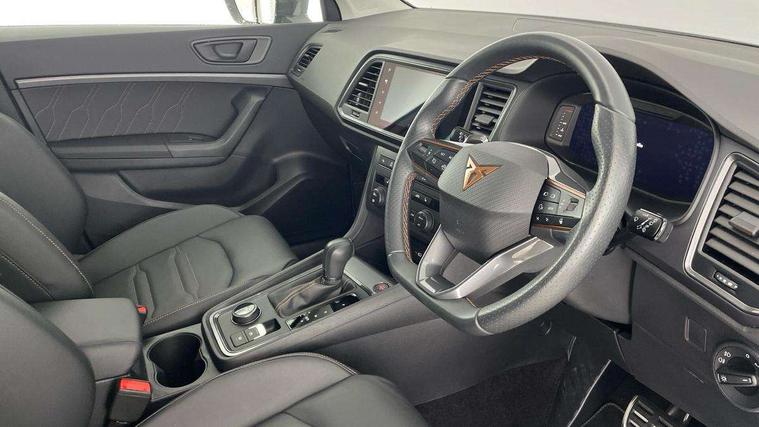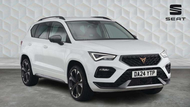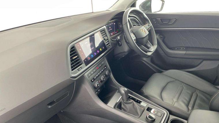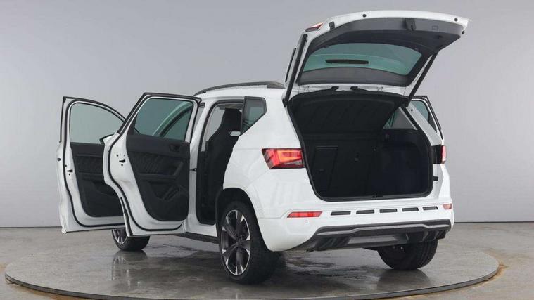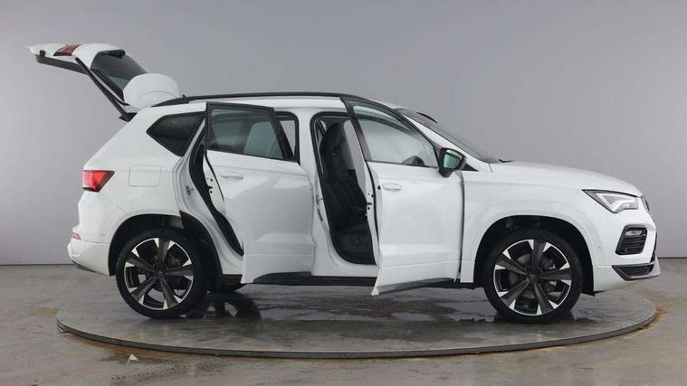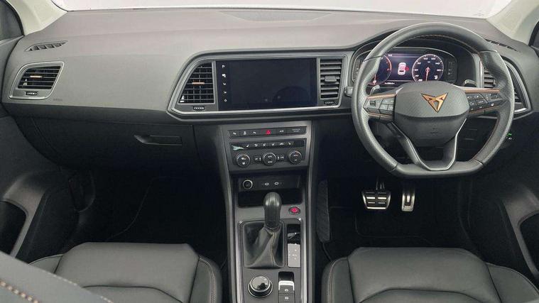 Cruise control system with speed limiter, Digital cockpit, Driving profile selection and conventional shock absorber, E-call, Electric tailgate with virtual pedal, Outside temperature gauge, Progressive power assisted steering, Rear view camera, Self parking functionality (includes front and rear parking sensors), Trip computer, Wireless full link smartphone integration, Wireless phone charger, Front and rear shock absorption, chassis with increased ride height, Steering wheel mounted audio/phone controls, Body colour bumpers with dark aluminium diffusor, Body coloured wheel arch surrounds, Dark tinted rear windows, Daytime running lights, Door mirrors with welcome CUPRA light silhouette, Dynamic headlight range control with self adjusting whilst driving, Electric adjustable/heated/folding door mirrors, Front and rear electric windows, Front grille frame in chrome, Full LED headlamps with lens and LED front fog lamps with cornering function, Gloss black door mirrors, Gloss black roof rails, Gloss black side mouldings, Gloss black side window trim, Illuminated aluminium front door sill, LED rear tail lights with dynamic indicators, Rear fog lights, Rear side wing doors, Rear spoiler, Rear wash/wipe, Specific CUPRA design front bumper, Standard rear exhaust tailpipes, Third brake light, 12v socket in front, 3 seat bench in 2nd row, 60/40 split folding rear seat, Aluminium pedals, Cupra steering wheel emblem, Dual zone climate control, Electric driver seat with memory function, Front and rear head restraints, Front centre armrest, Front seat back storage pockets, Grey roof lining, Heated front seats, Heated steering wheel, Height adjustable driver and passenger seat with lumbar adjustment, ISOFIX points in outer rear seats with top tether anchorage points, Leather sport bucket seats, Leather steering wheel and gear knob, Multicoloured ambient lighting with LED interior illumination, Pedal cluster, Rear armrest and easy back seat release mechanism from boot, Single front passenger seat, Sports steering wheel, Steering wheel mounted gearshift paddles, Storage compartment in roof console for sunglass, Storage compartment under driver's seat, Convenience pack - Ateca, Interior lighting pack - Ateca, Navigation system plus pack with DAB - Ateca, Safety and driving pack - Ateca, 3x3 point rear seatbelts, ABS, Traction control system (TCS), Electronic stability control (ESC) and Electronic differential lock system (XDS), Airbags - Driver and front passenger airbag with deactivation, front side, two curtain and driver's knee airbags, Black brake callipers with CUPRA logo, Electric parking brake with auto hold function, Front and rear seatbelt reminder, Front assist with autonomous emergency braking, Hill hold control, Manual rear child locks, Single tone horn, Tiredness recognition system, Tyre pressure monitoring system, Alarm, Keyless entry, Locking wheel bolts, 19" Sport machined alloy wheels 36/3 in black/silver,