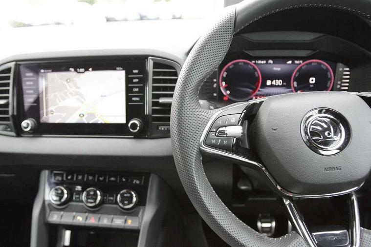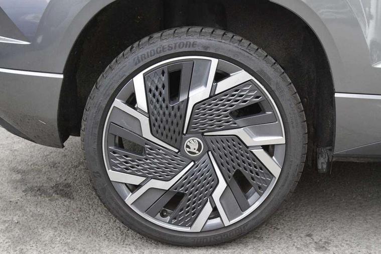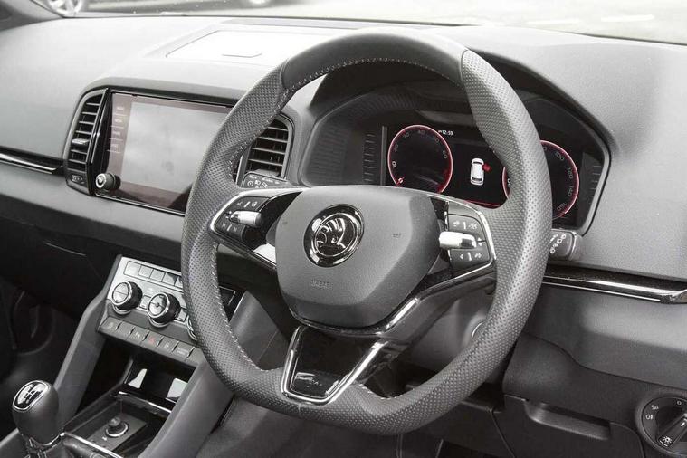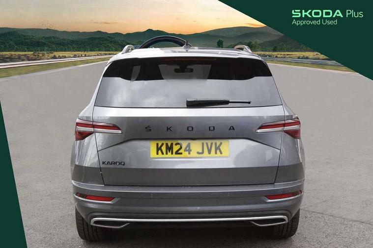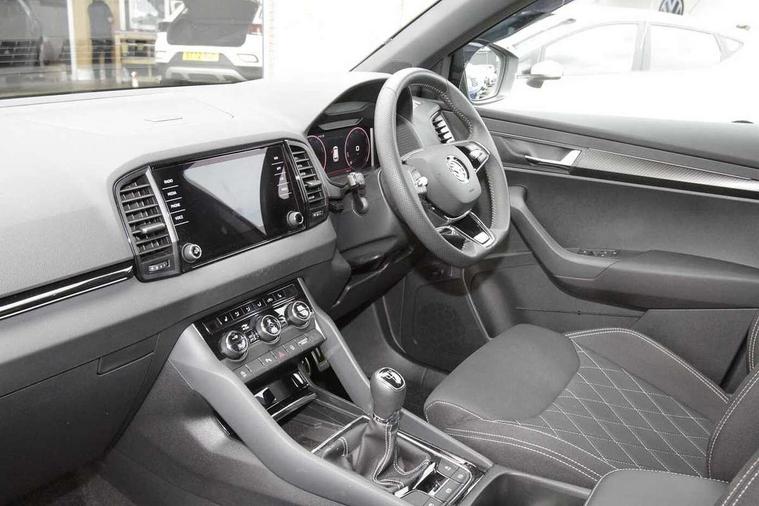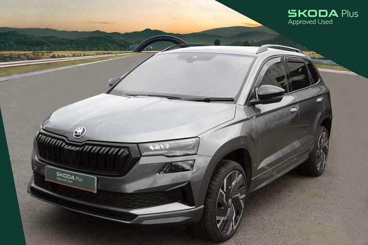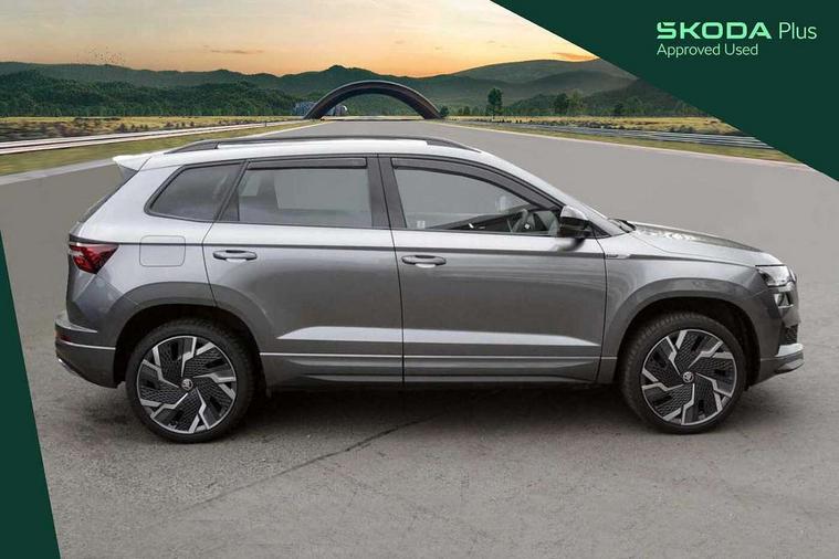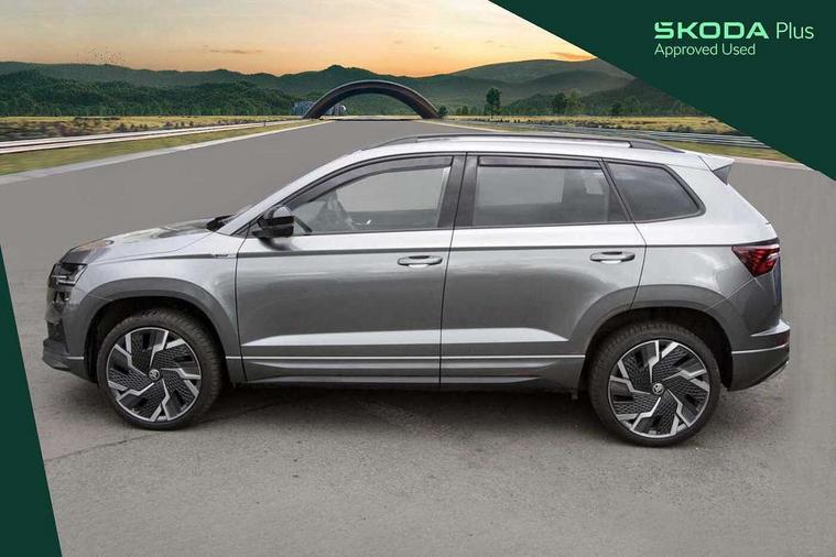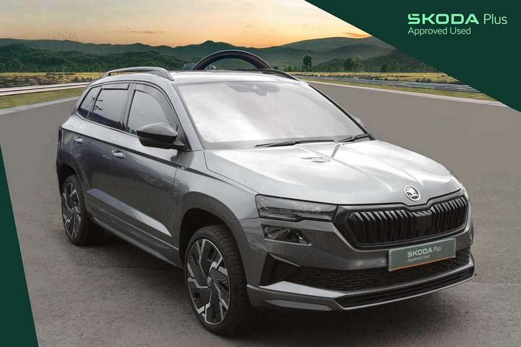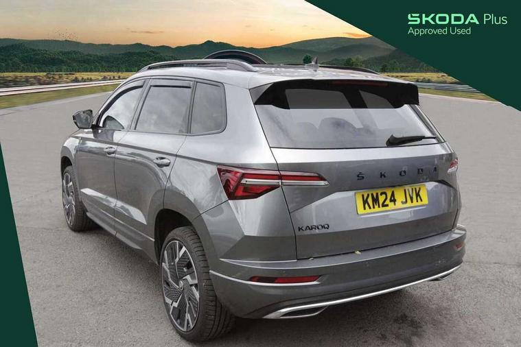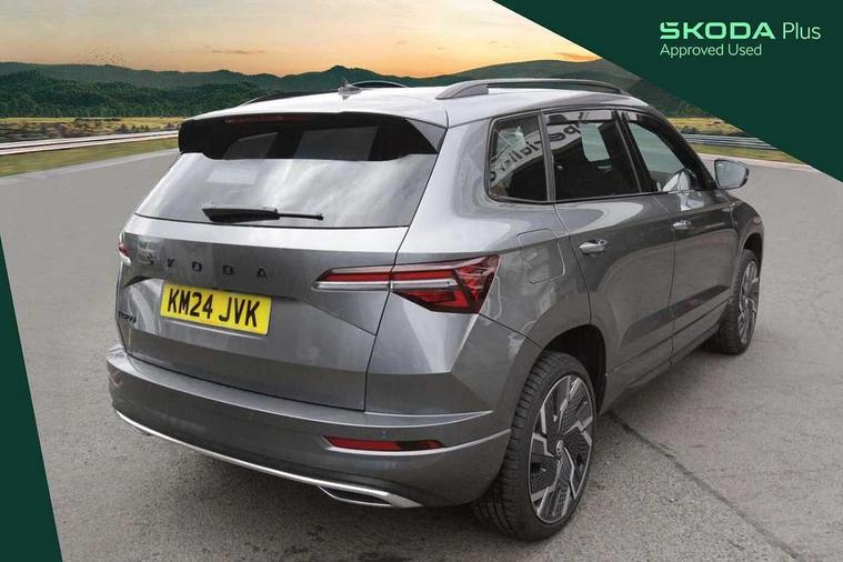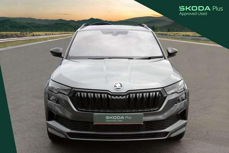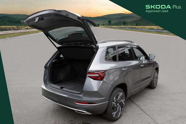 8" Digital display, Advanced driver attention and drowsiness monitor, Emergency services call system, Outside temperature gauge, Sensor for driver assistance systems, Service interval indicator, SmartLink wireless for Apple and wired for Android, Start/stop system with regenerative braking, USB C Port x 2 in front centre console, Virtual Cockpit - 10.25" digital display, Virtual pedal with electrically operated boot door, Wireless smartphone charging, Canton sound system, DAB radio with Bluetooth, USB connection, Acoustic glass, Aero front windscreen wipers with intermittent function, Auto dimming rear view mirror with light and rain sensors, Black door mirrors, Black electric window control buttons, Black radiator grille, Black roof rails, Body colour door handles, Electric front and rear windows with child proof lock, Front door steps with SportLine logo, Heated rear windscreen, LED 3rd brake light, LED daytime running lights, LED rear lights with high functionality welcome effect and dynamic indicators, Light assistant (coming/leaving home/tunnel light), Panoramic sliding sunroof, Plastic scuff plates in door apertures, Privacy glass, Protective door side sills in body colour, Rear diffuser, Rear side wing doors, Rear spoiler, Rear window wiper with washer system and intermittent control, Safety reflectors on front doors, Skoda lettering on tailgate in black, Sportline badge on front fender, Sportline decorative inserts with badging, Sports front and rear bumpers, 1.5 litre bottle holders in driver and front passenger door panels, 12V socket in boot, 12v socket in front centre armrest with storage compartment and rear air vents, 2 x Tablet holder, 3 rear height adjustable headrests, 3 seat bench in 2nd row, 3 spoke leather sports multifunction steering wheel and silver stitching, 4 foldable roof handles with rear coat hooks, Black floor carpet, Chrome inner door handles, Double sided boot floor, Foldable hooks in the boot, Front head restraints, Height adjustable front three point seats belts with tensioners, Height/reach adjust steering wheel, Ice scraper, Illuminated glovebox, Illuminated luggage compartment, Isofix child seat preparation for front passenger seat, Isofix child seat preparation outer rear, Manual lumbar support for front seats, Pen holder, Pollen filter, Rear boot cover, Rear reading lights, Rear seats fixed folding and divided 60:40, Rubbish bin door, Safety vest holder, Single front passenger seat, Storage box in upper central dashboard closed, Sunvisors with illuminated vanity mirrors, Textile floor mats, Ticket holder, Titan black interior ceiling, Umbrella under passenger seat, Under passenger seat storage compartment, Welcome animation with sportline logo, Light Pack - Karoq, Non Smokers pack, Automatic door unlocking in case of crash, Automatic fuel cut off in case of crash, Driver airbag, Electronic parking brake with auto hold function, Emergency rear braking signal, ESC including ABS, MSR, ASR, EDS, HBA, DSR, RBS, MKB and traction control, Front side airbags, Head airbags, Hill hold control, Knee airbags, Passenger airbag with switch-off function, Pedestrian monitor, Seatbelt reminder signalisation and pretensioner for all seats, Three point seatbelts rear, Two tone horn, Tyre pressure monitor, Alarm with interior monitoring, back up horn and tilt sensor with safe function, Electronic engine immobiliser, Keyless entry and start/stop, Remote central locking with 2 remote folding keys, Black air vent surround, Black centre console, carbon door decor, Satin black dashboard, Satin black door trim, 19" Sagittarius anthracite alloy wheels, Anti-theft wheel bolts protection, Breakdown and tool kit,