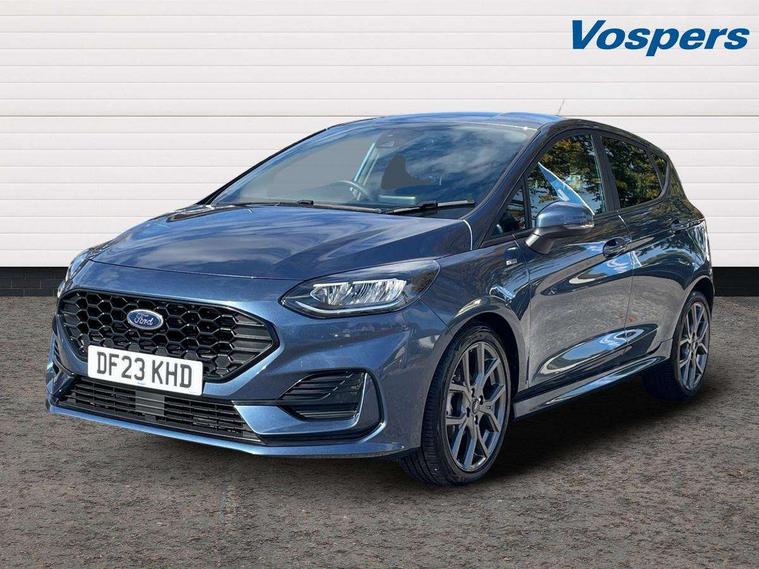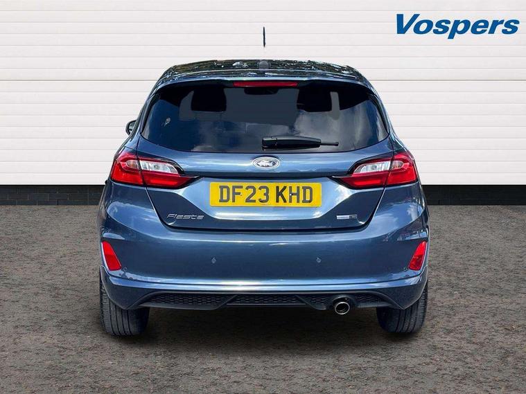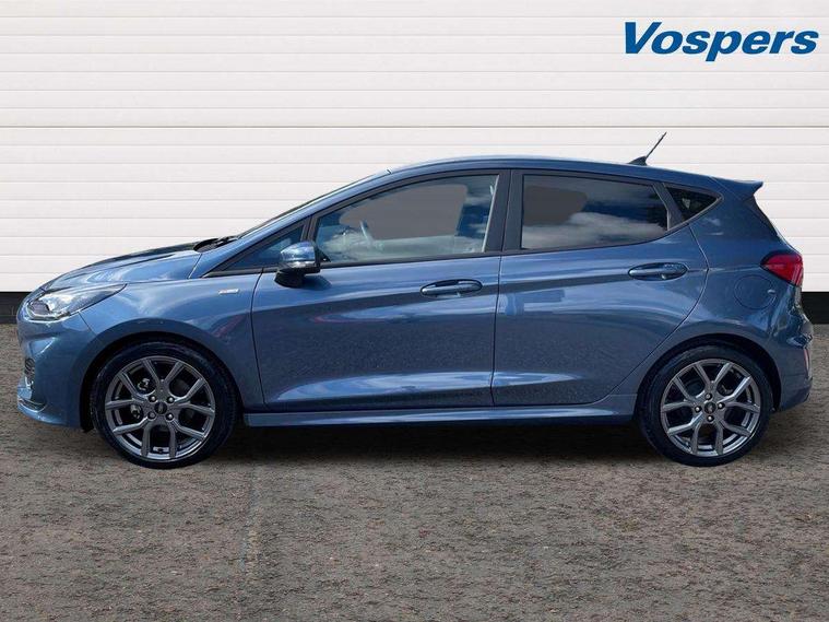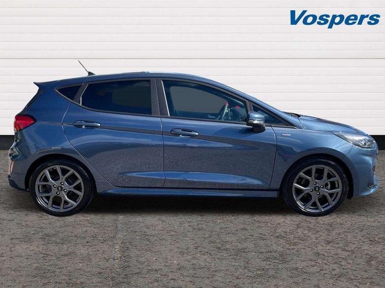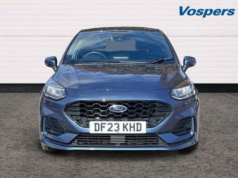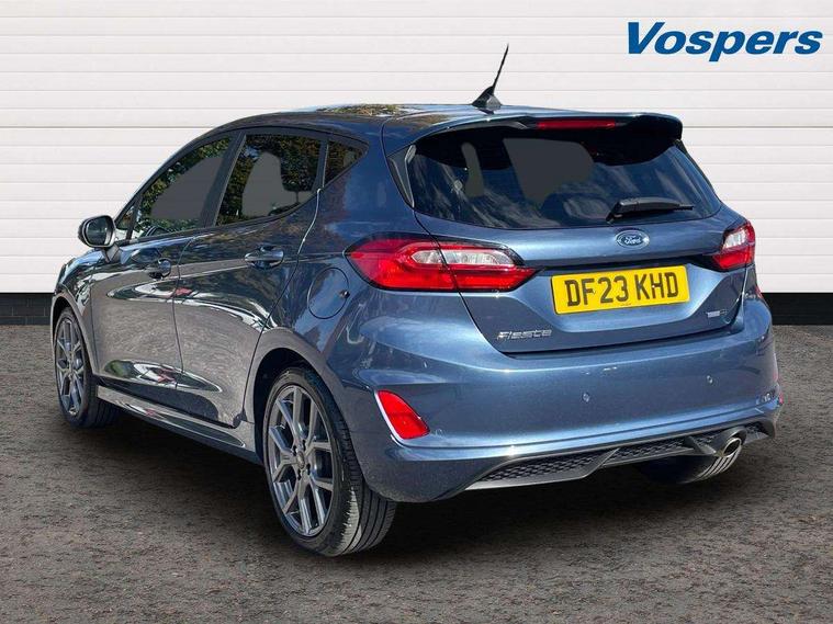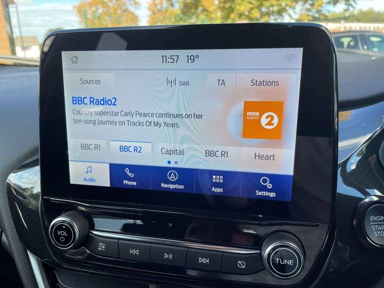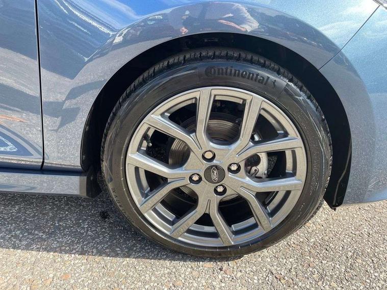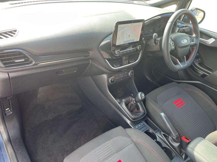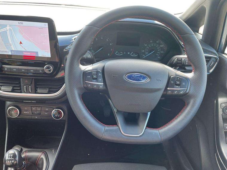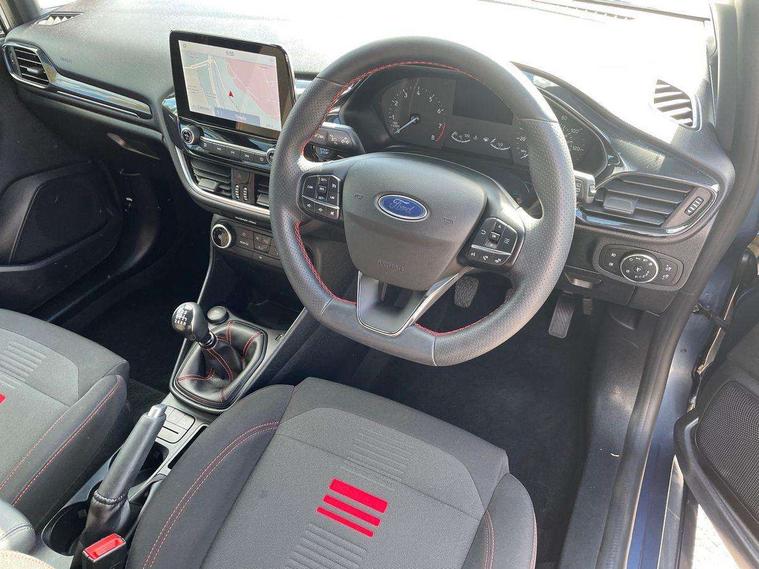 Bluetooth system, Electric power steering, Ford easy fuel, Ford SYNC 3 Navigation system incl 8" touchscreen, 7 speakers, FordPass connect, Apple carplay, android auto, voice control and emergency assistance, Rear parking distance sensors, Selectable drive modes (Normal, Sport, Track), Trip computer, Sports suspension, 2 USB ports, Auxiliary input socket, DAB Digital radio, Steering wheel mounted controls, Body colour bumpers, Body colour door handles, Body colour large rear spoiler, Body coloured electrically operated and heated door mirrors with side indicators, Cornering front fog lights, Electric front windows/one touch facility, Electric rear windows, LED Night signature to rear lights, Quickclear heated windscreen, Rain sensing wipers and auto dimming rear view mirror, Rear privacy glass, Rear wiper, Unique ST-Line upper grille & full bodystyling kit with ST-Line wing badges, 3 spoke flat bottomed leather steering wheel, 60/40 split folding rear seat, Adjustable head restraints, Black headlining, Boot carpet, Centre console with opening armrest, 2x cupholders, 12v and USB, Chrome inner door handles, Cloth upholstery, Footwell illumination, Front floor mats in velour, Front map reading lights, Front seat and rear pockets, Illuminated glovebox, Leather gaiter, Load area light, Manual 2 way passenger seat adjust, Manual 4-way driver seat adjust, Manual air conditioning, Overhead console with sunglasses holder, Pollen filter, Rake/reach adjustable steering wheel, Sensico wrapped steering wheel, Sports front seats, NCAP Pack - Fiesta, 3 point seatbelts on all rear seats, ABS+EBA, Curtain airbags, Driver and passenger airbags, Drivers knee airbag, Electronic stability control with hill start assist, Front passenger airbag deactivation, Front side airbags, Seatbelt warning, Two tone horn, Tyre pressure monitoring system, Keyless start with 'Ford Power' starter button, MyKey system, Remote central locking & engine immobiliser, Thatcham Cat.1 alarm, 17" 5 spoke alloy wheels with rock metallic finish,